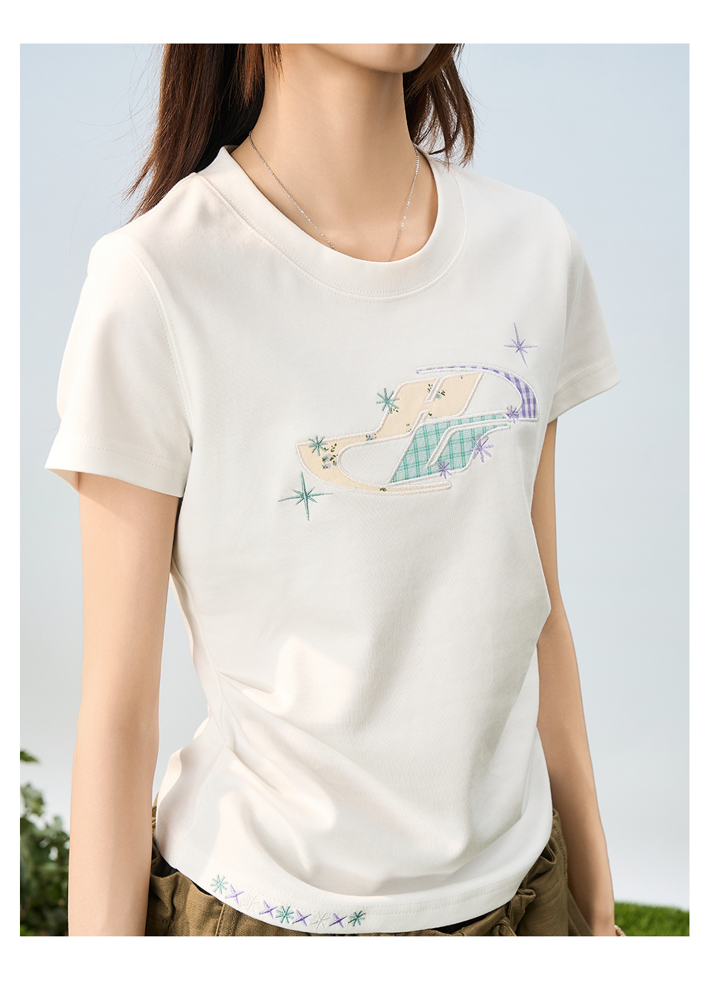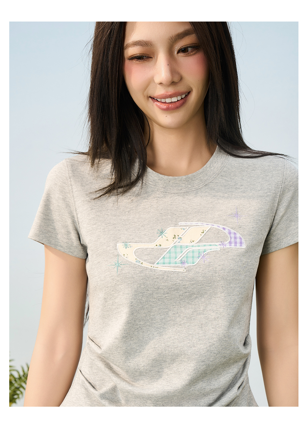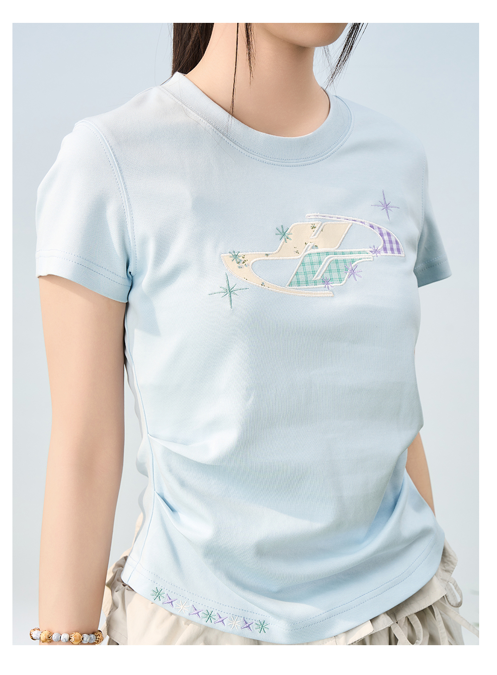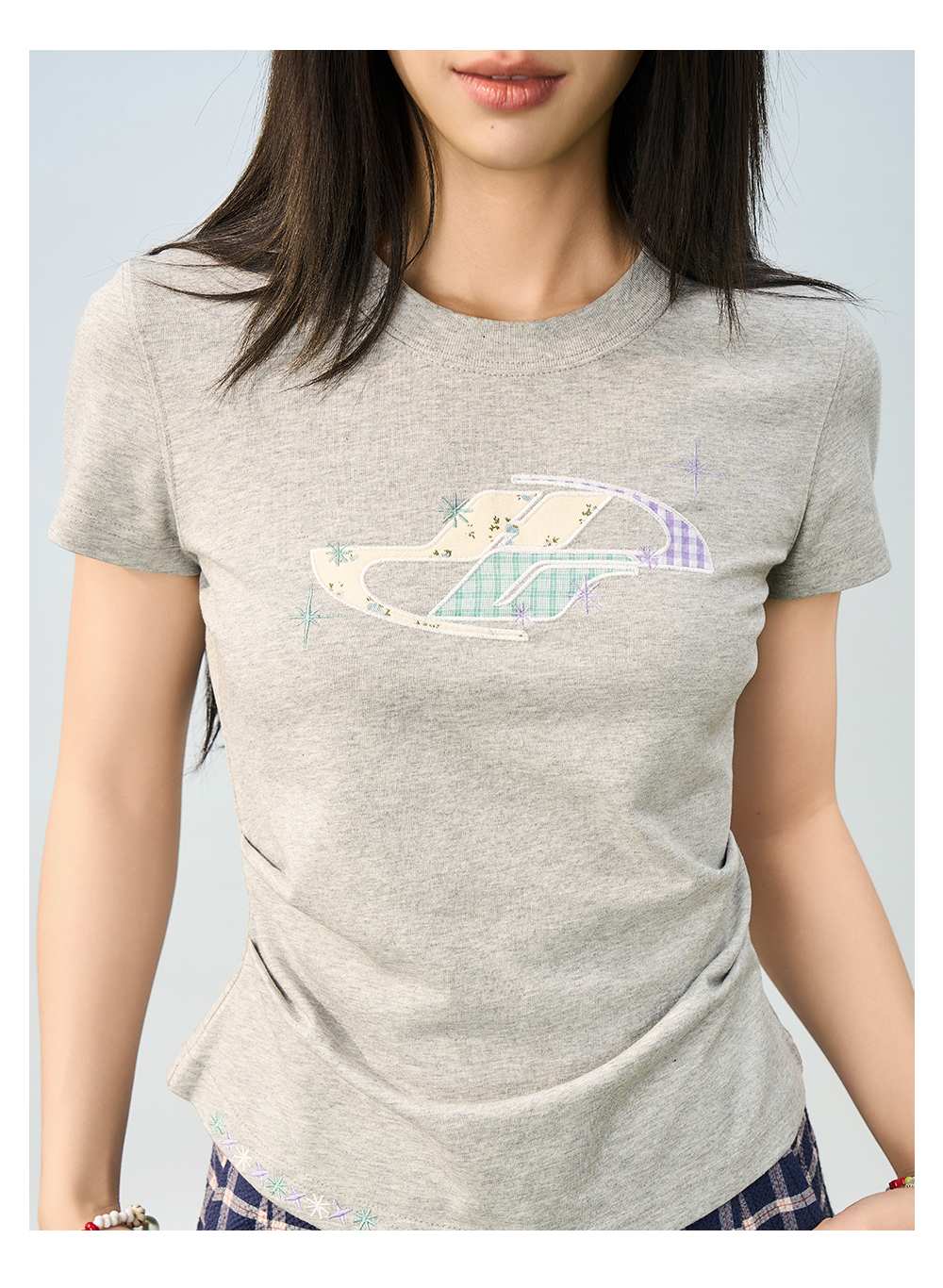HACR Childlike Floral Applique Embroidered Pleated Slim Tee