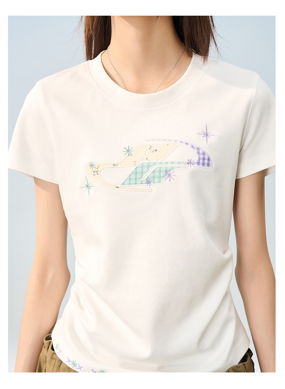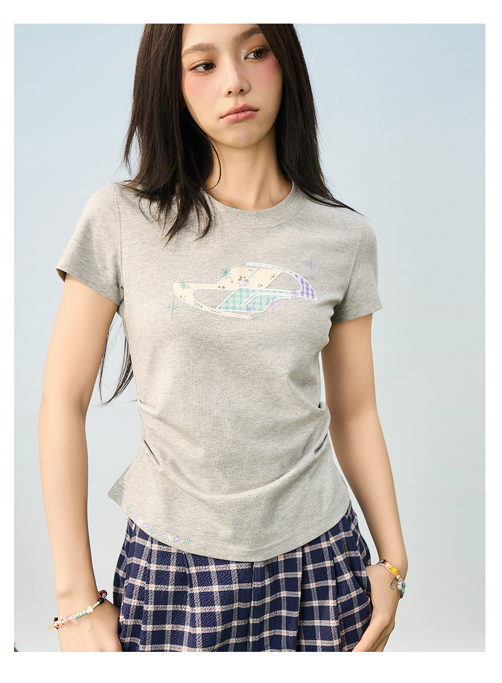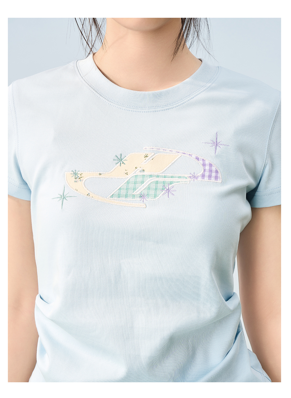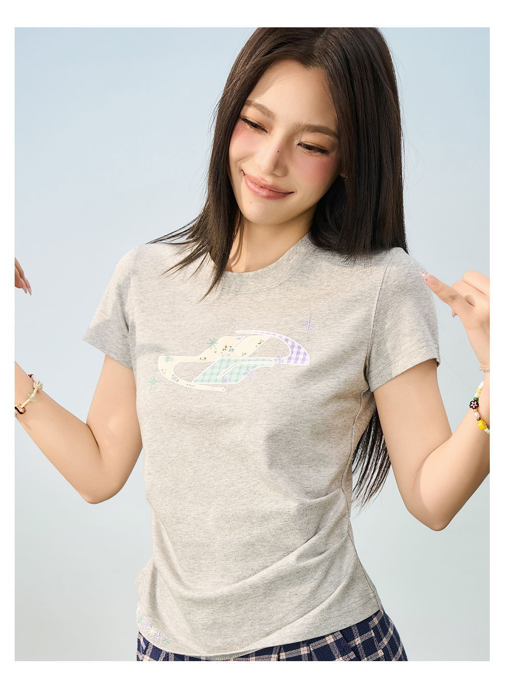HACR Childlike Floral Applique Embroidered Pleated Slim Tee