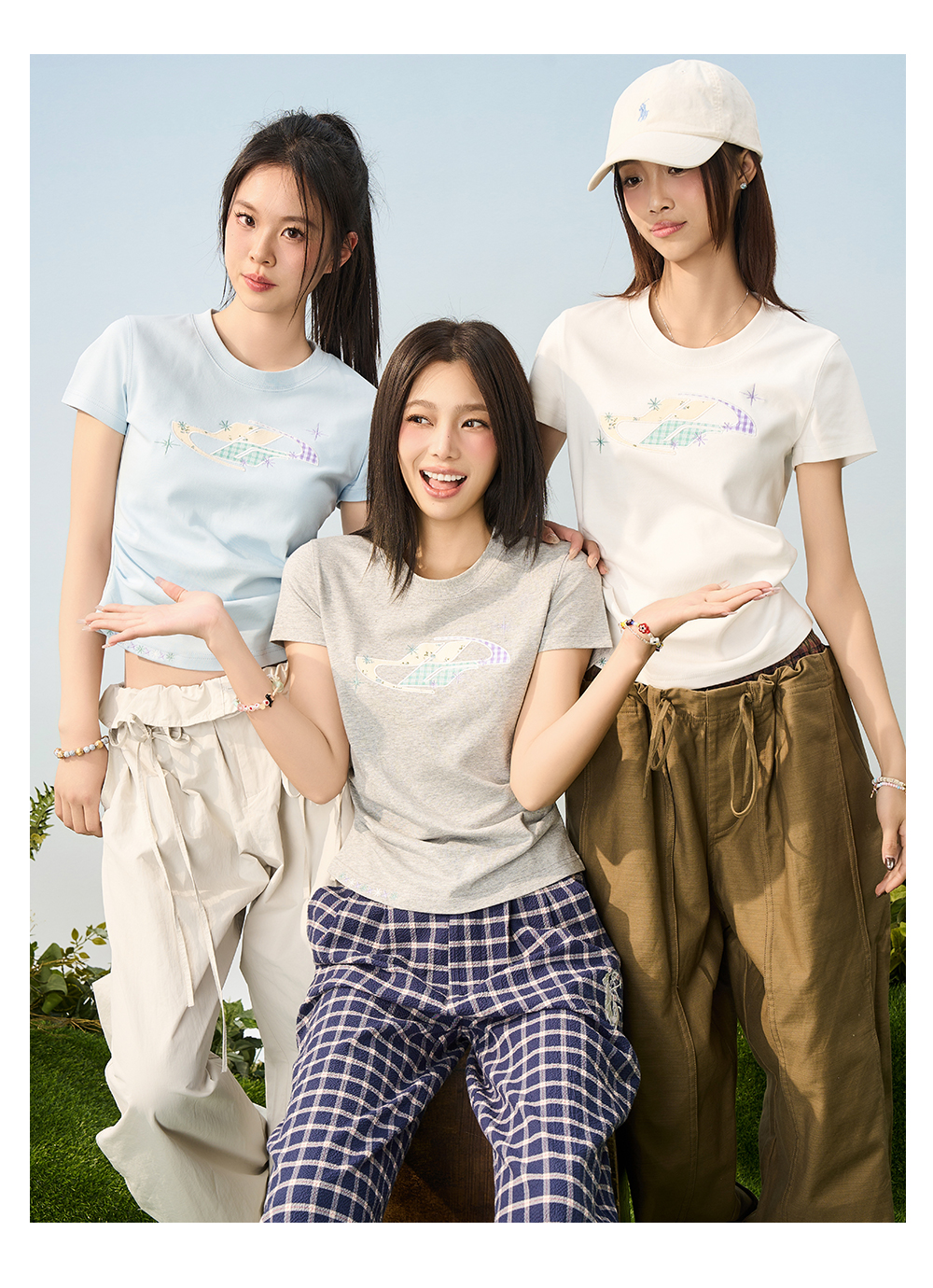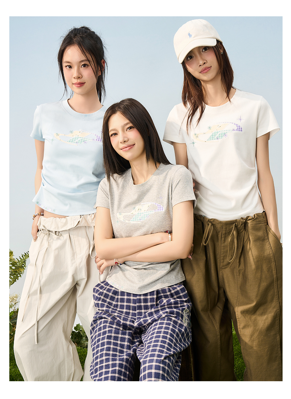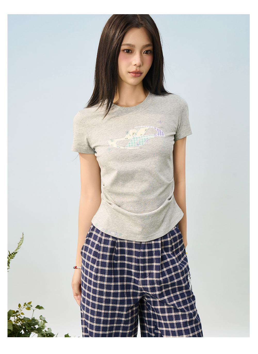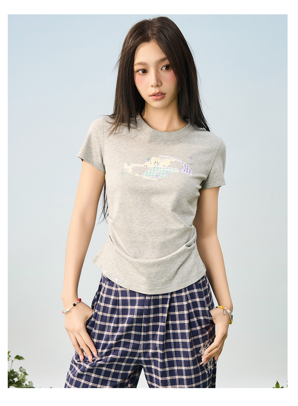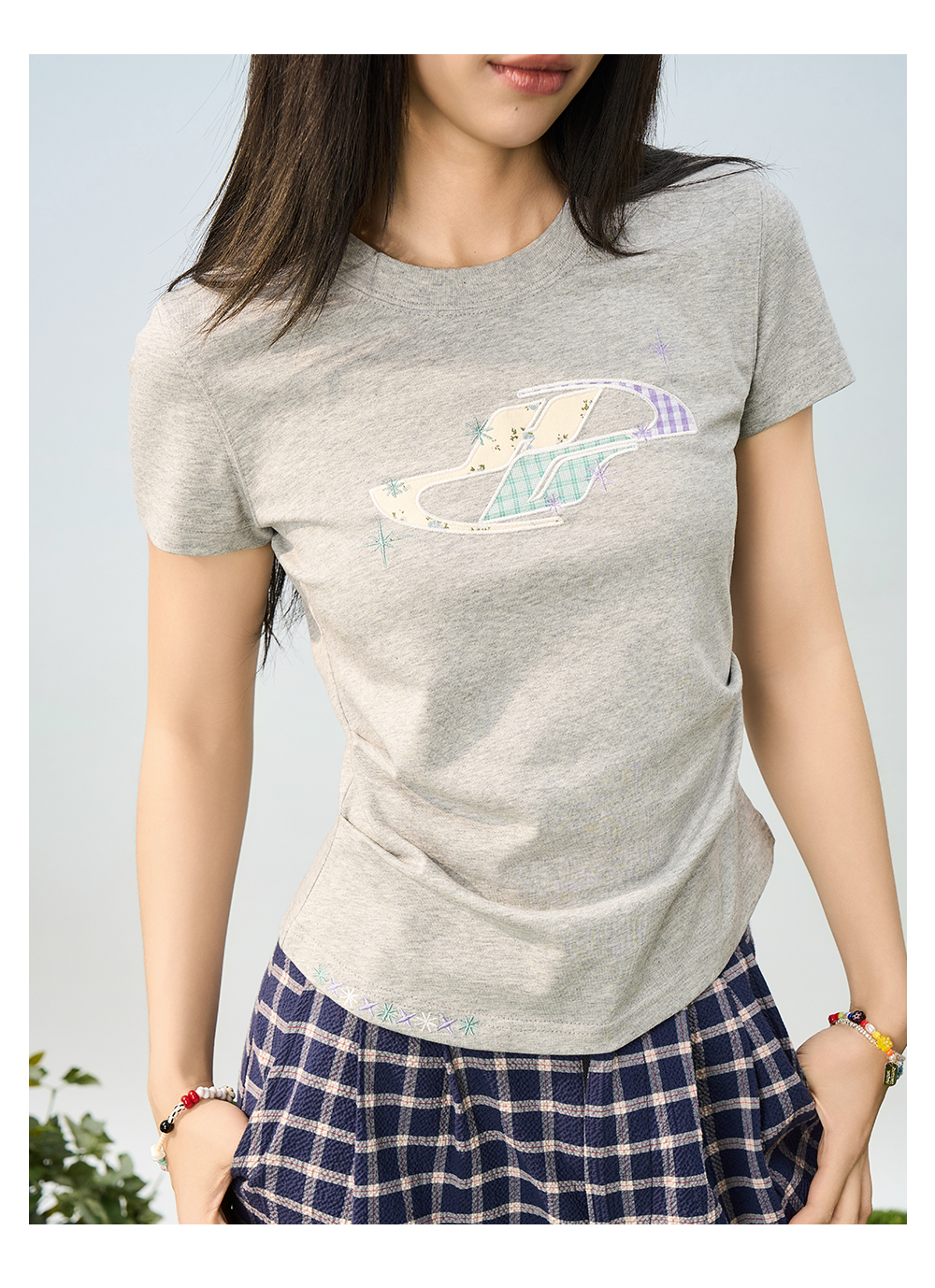 HACR Childlike Floral Applique Embroidered Pleated Slim Tee