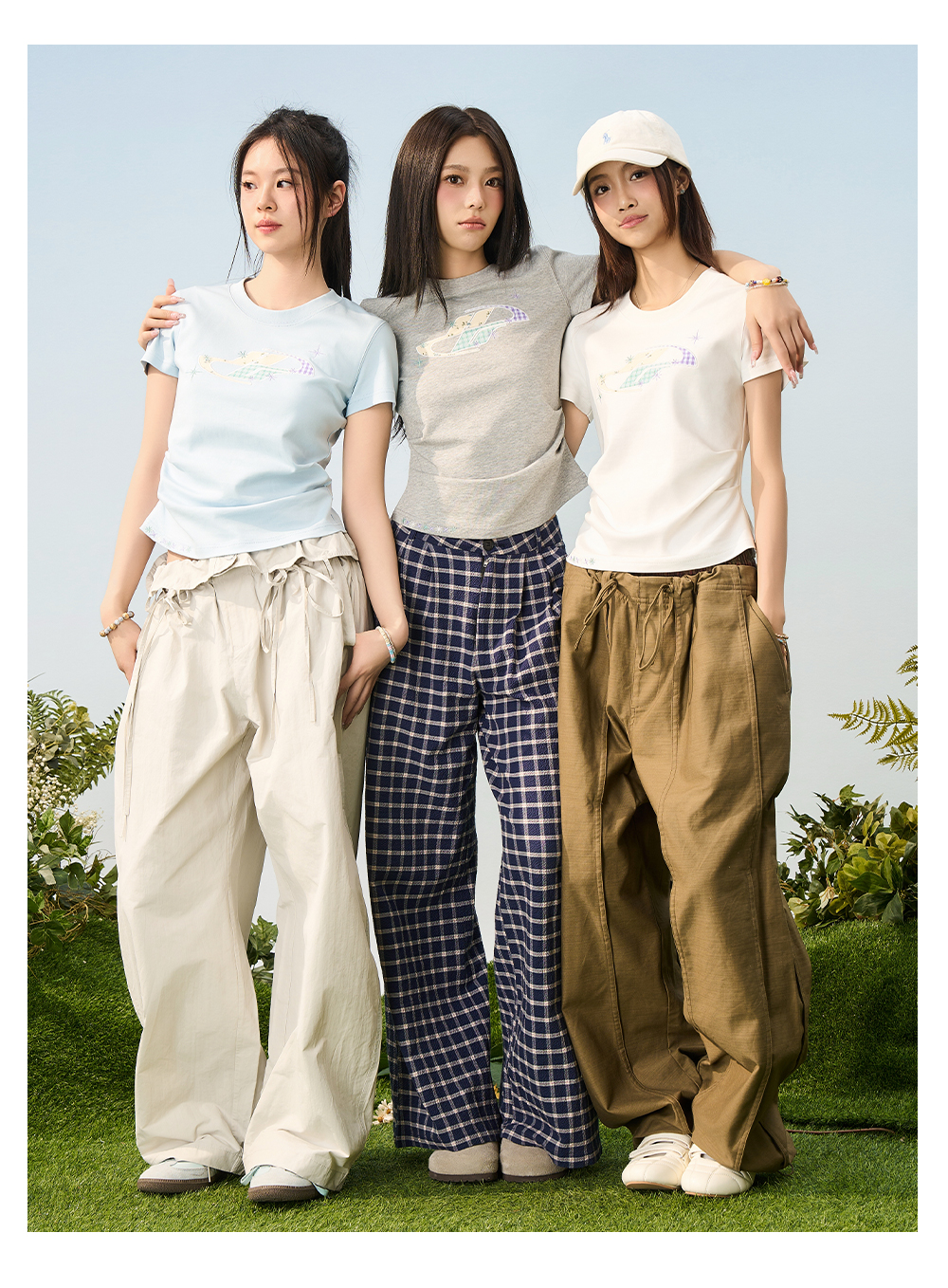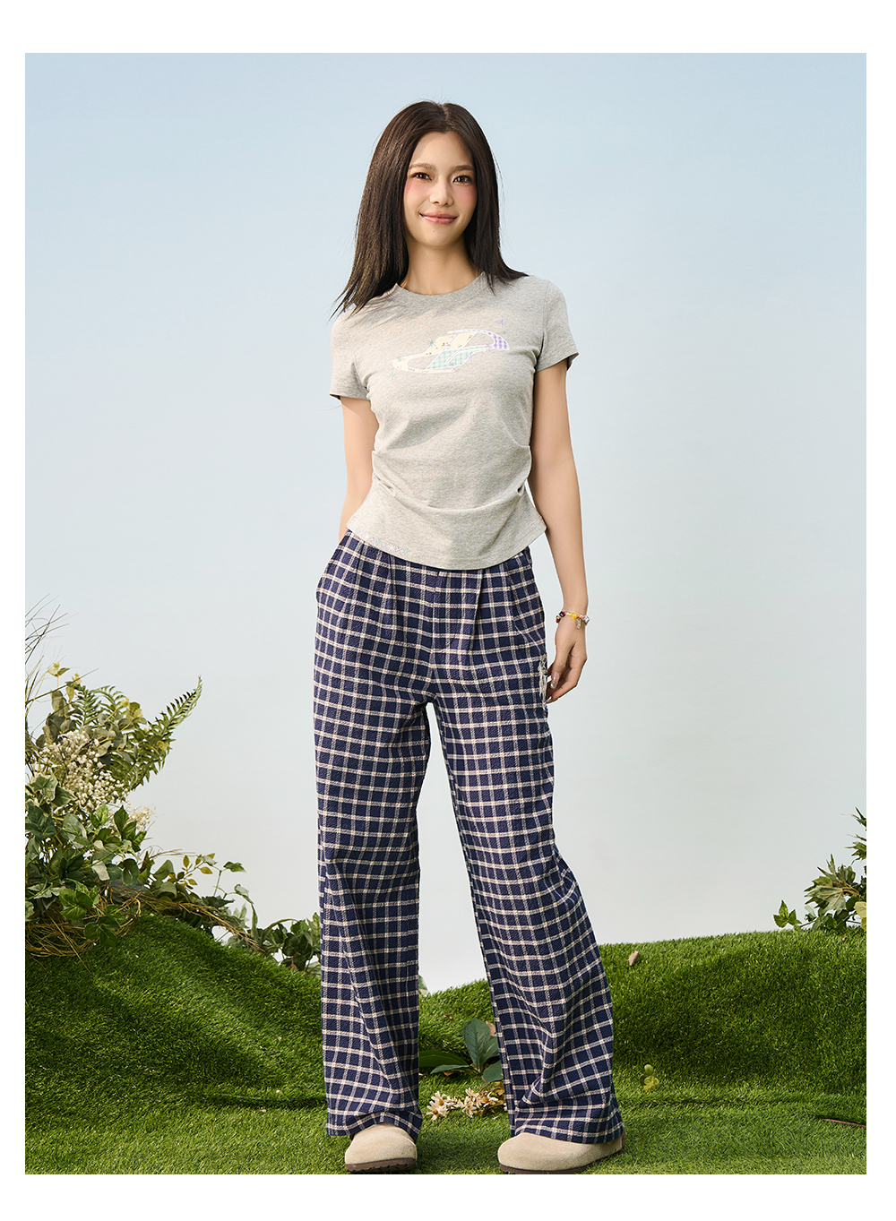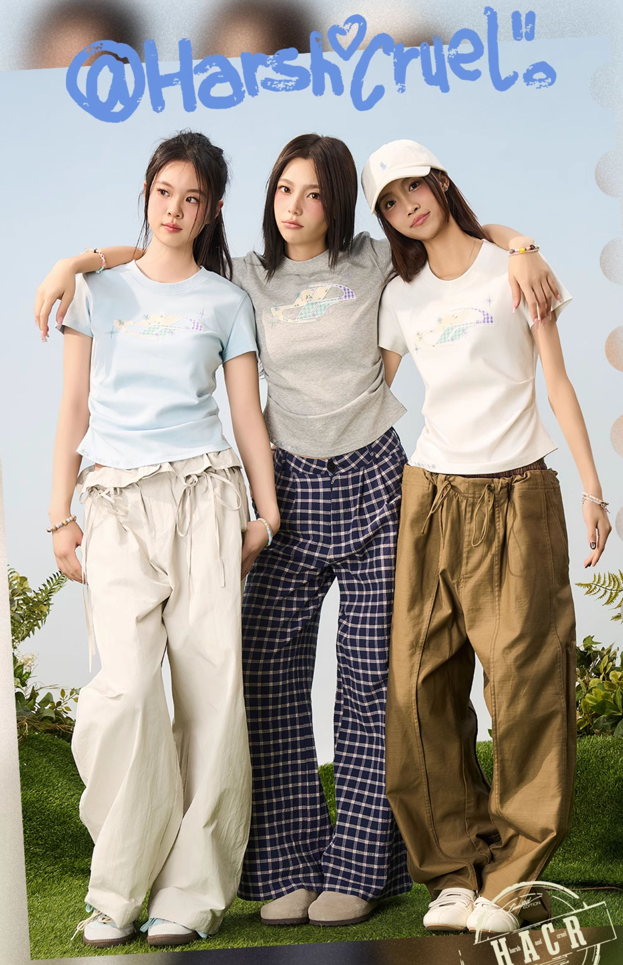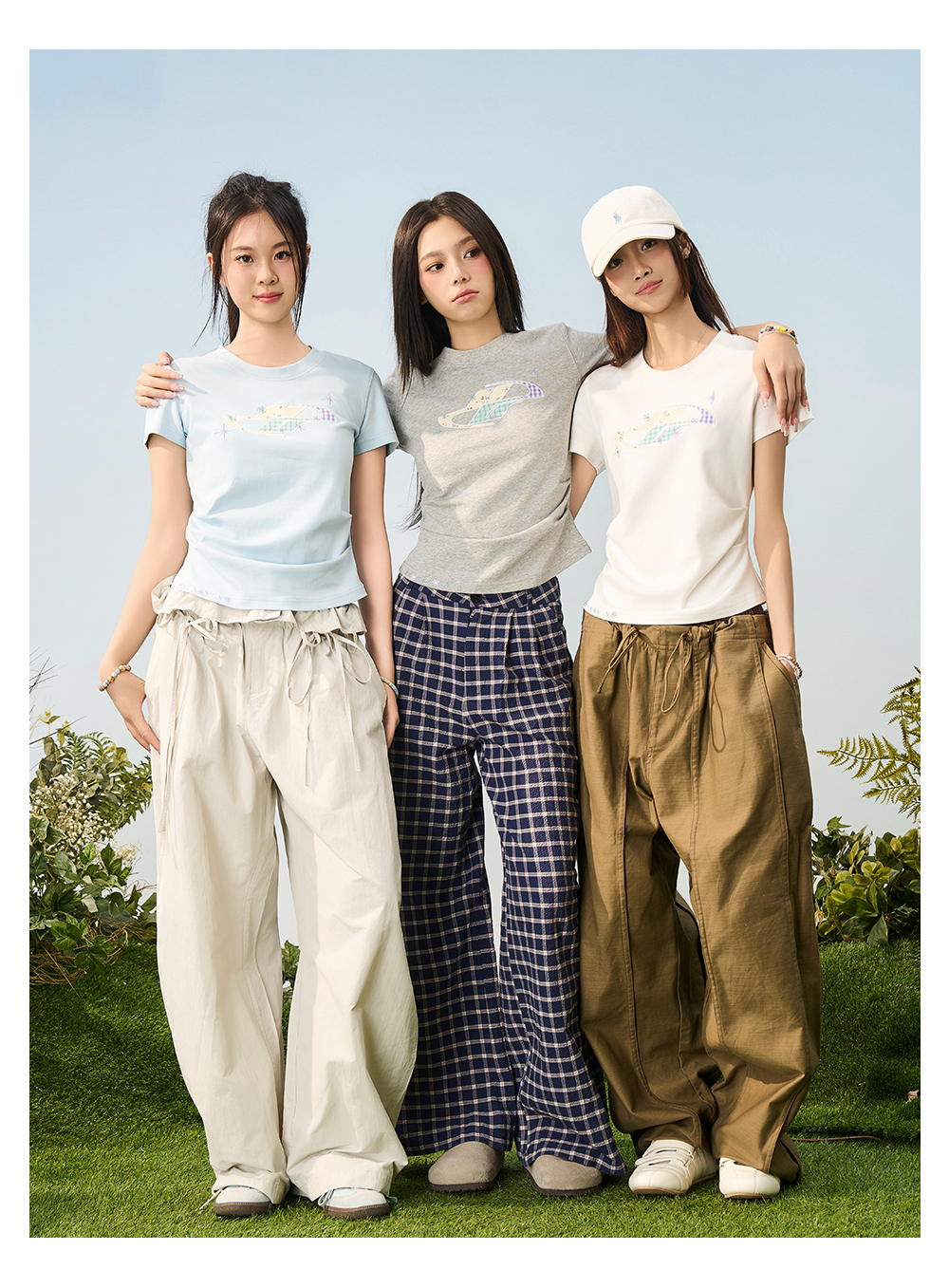 HACR Childlike Floral Applique Embroidered Pleated Slim Tee