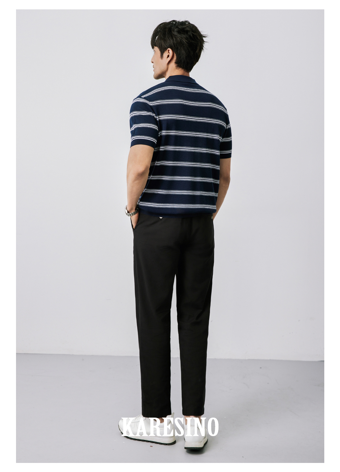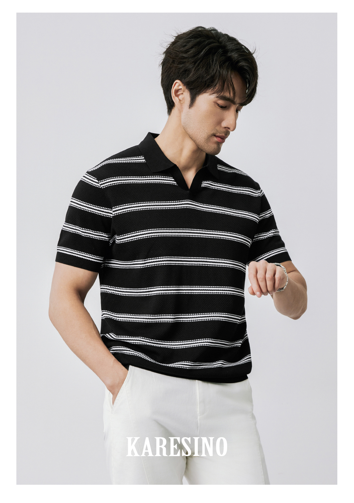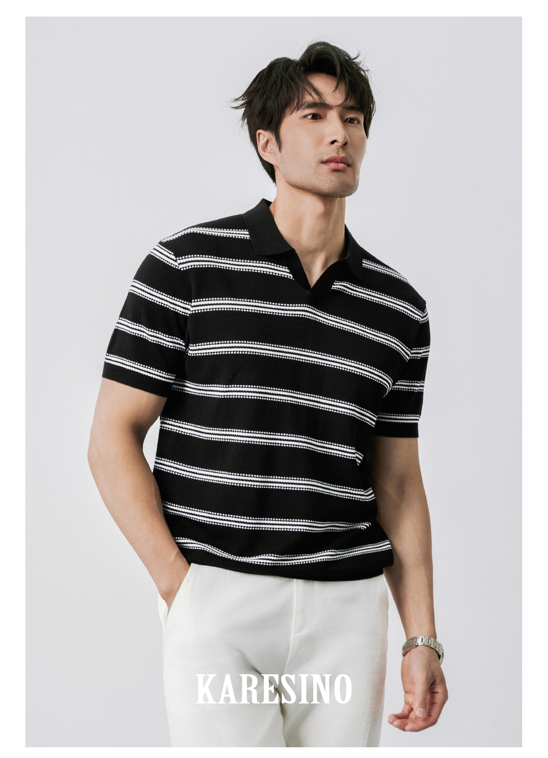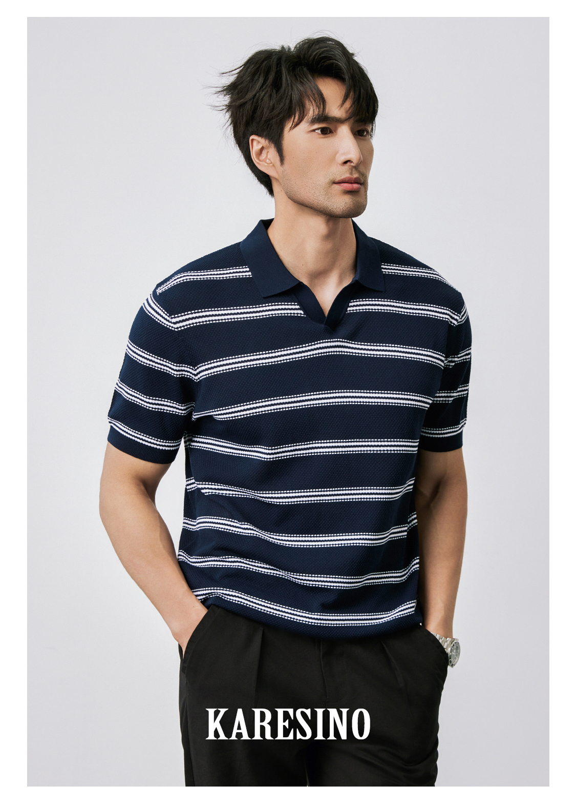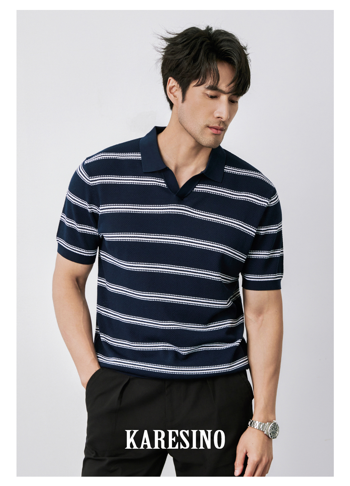 KARESINO Ice-silk Lapel-neck Striped Knitted Polo Shirt