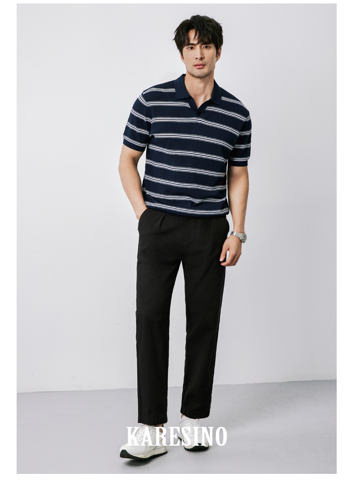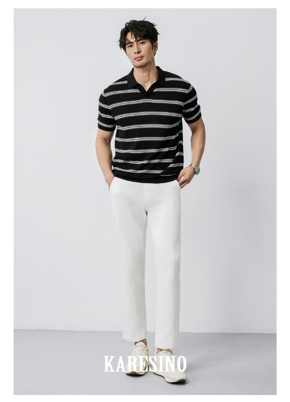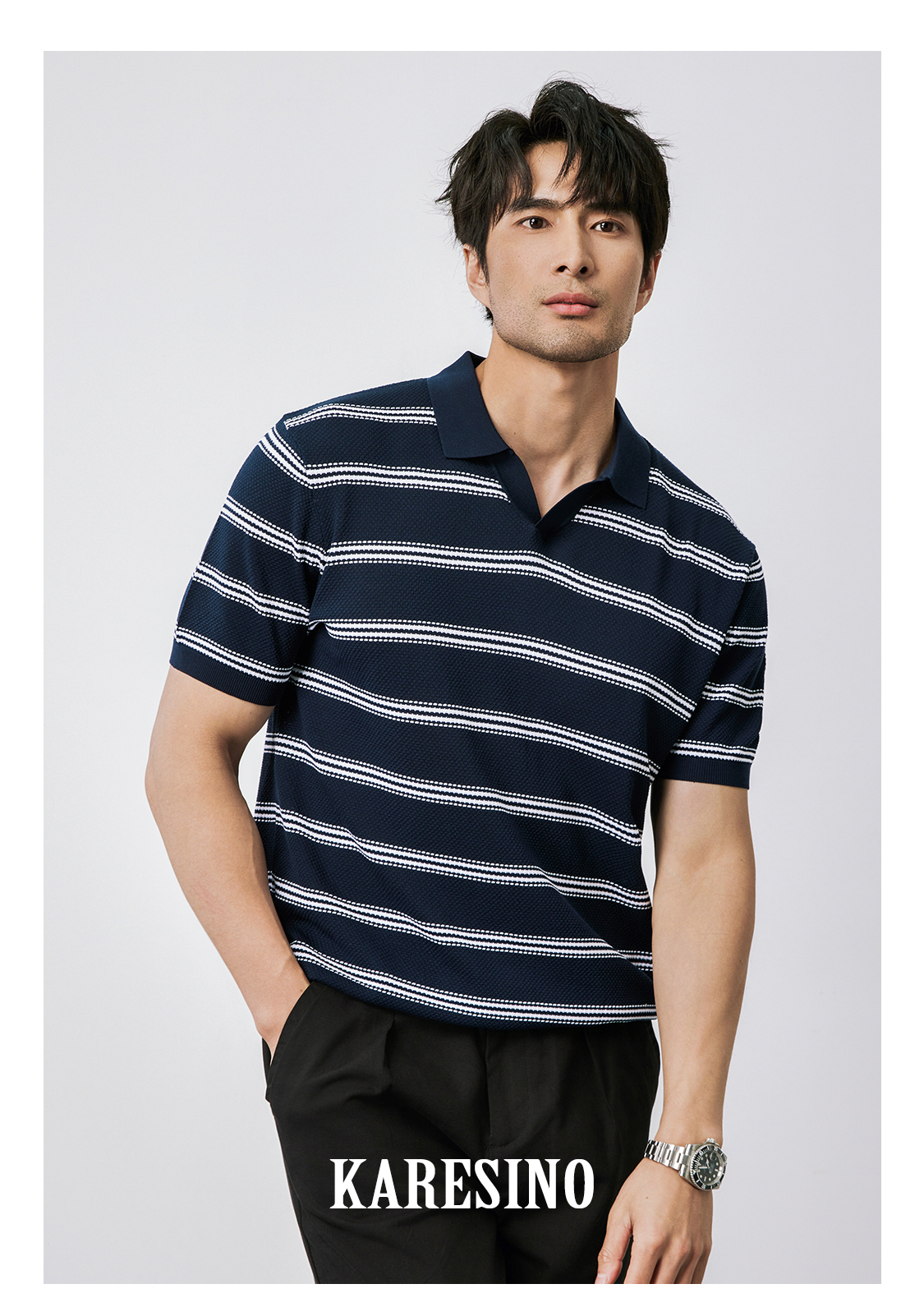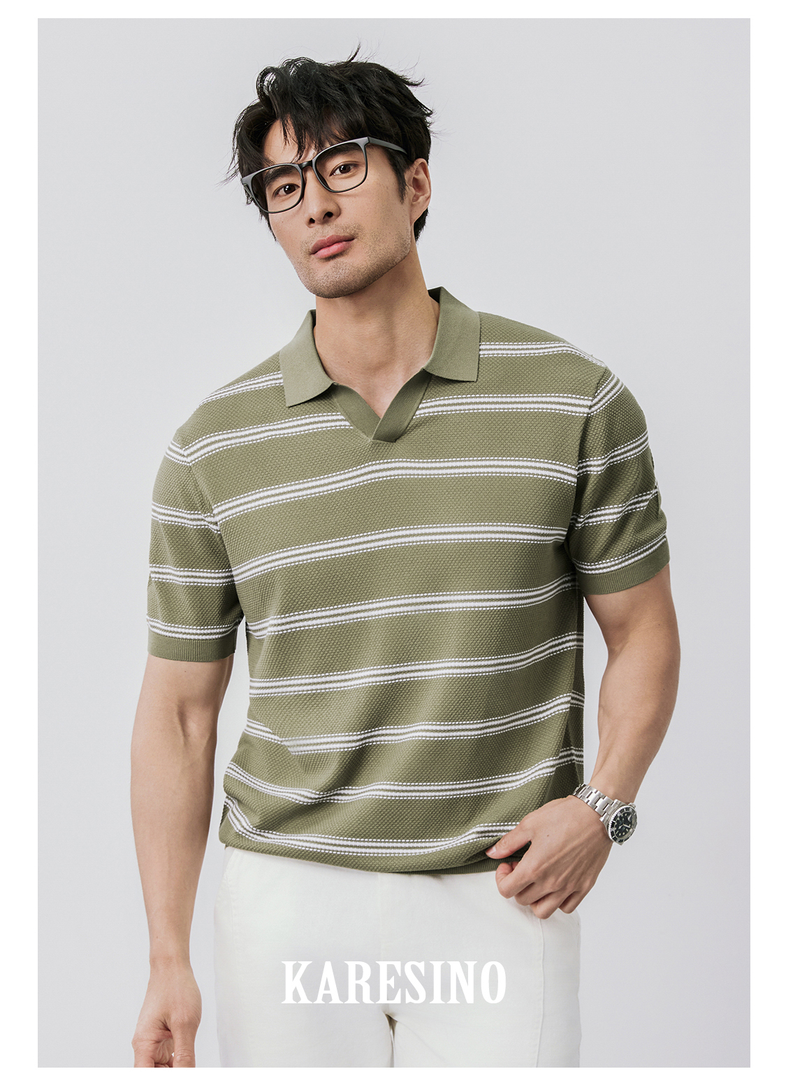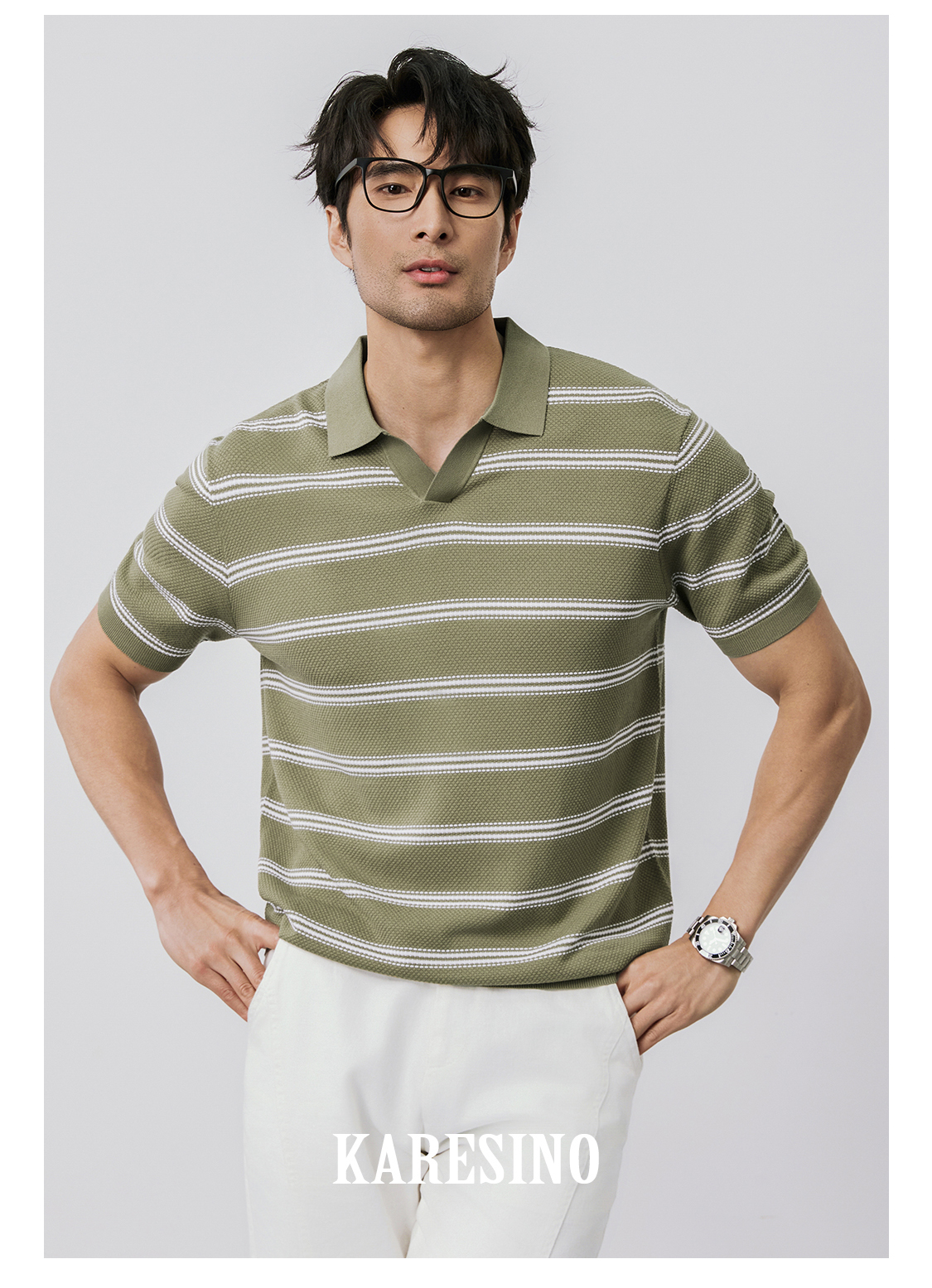 KARESINO Ice-silk Lapel-neck Striped Knitted Polo Shirt