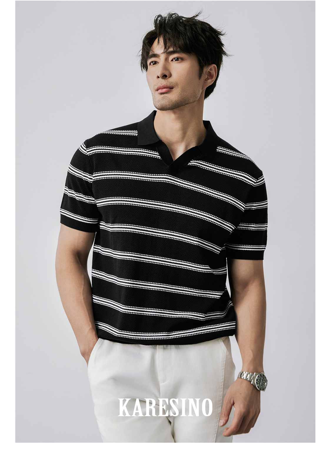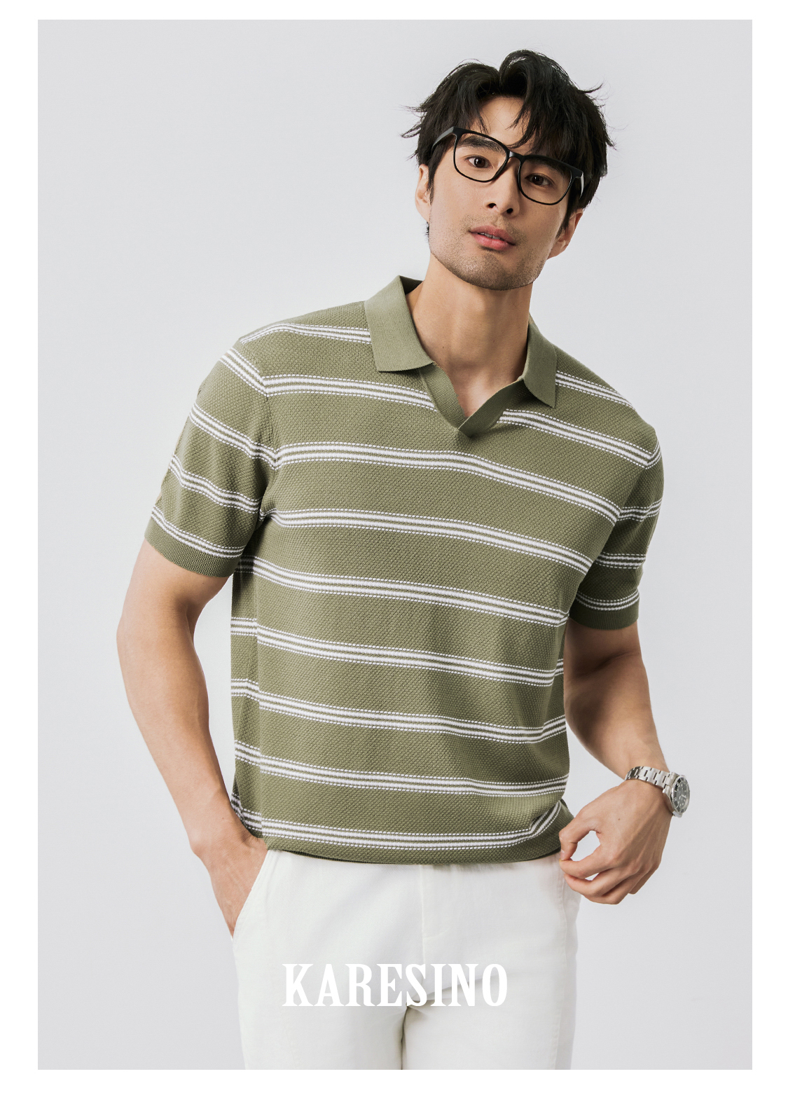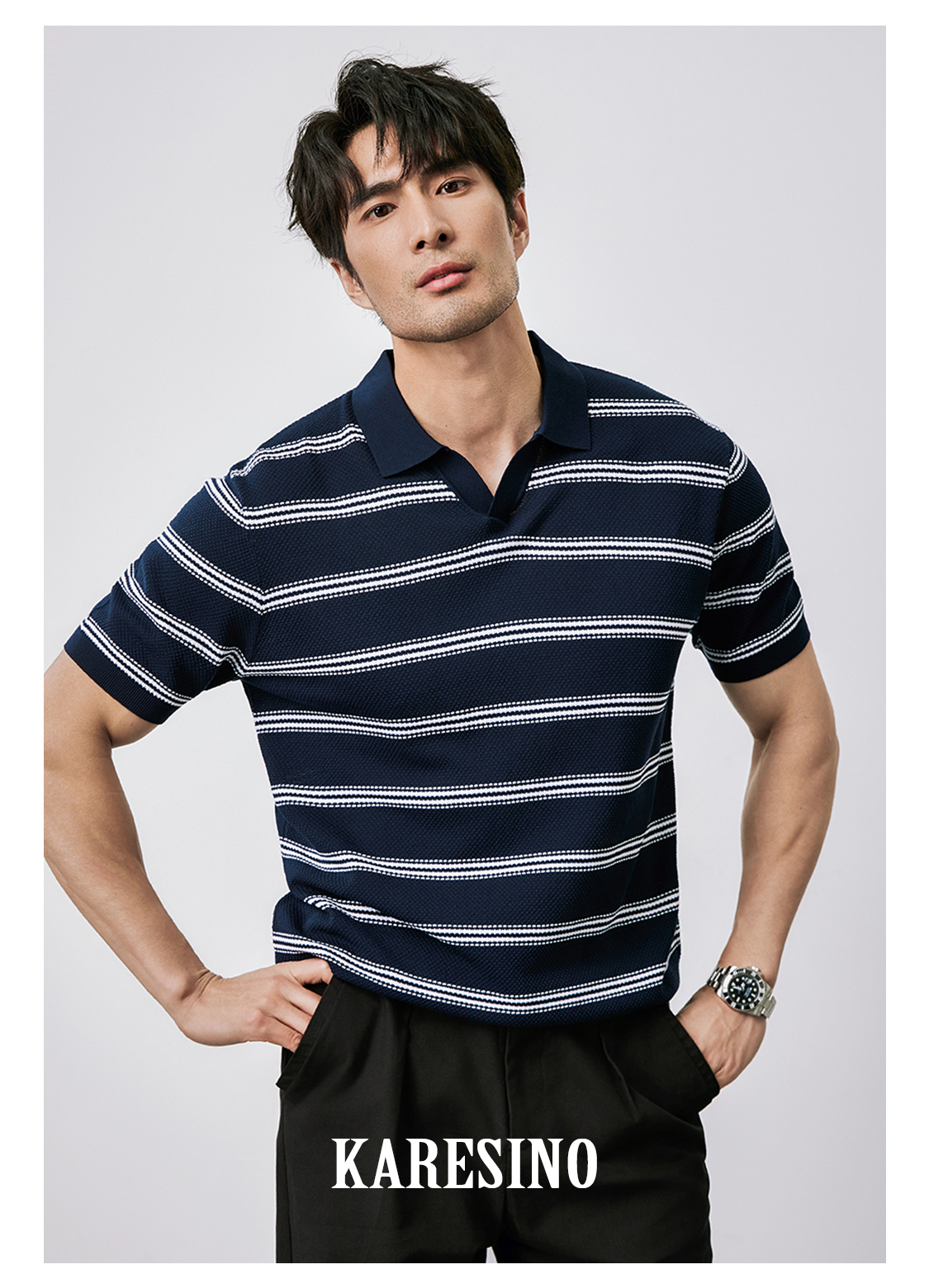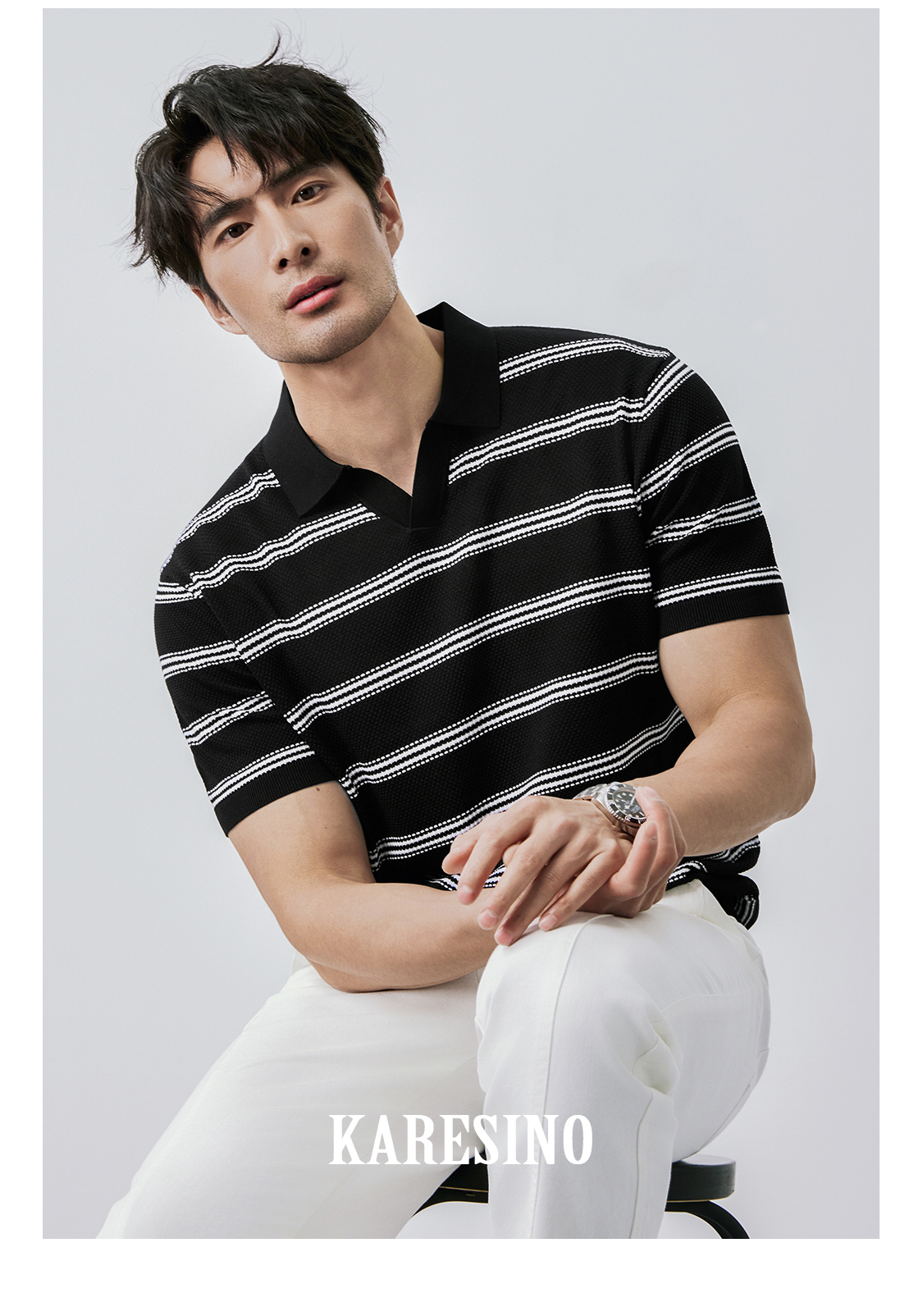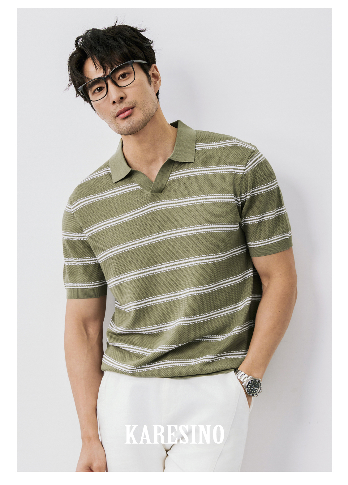 KARESINO Ice-silk Lapel-neck Striped Knitted Polo Shirt