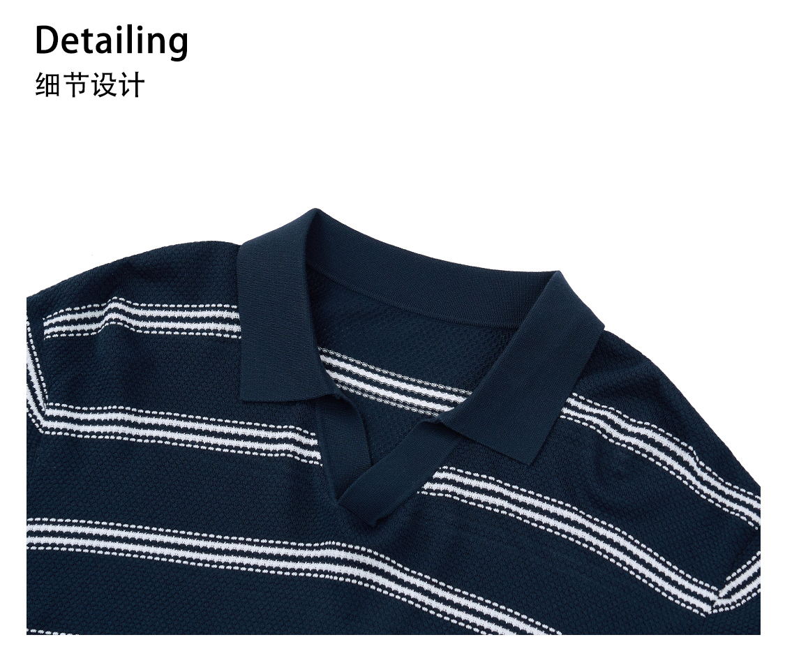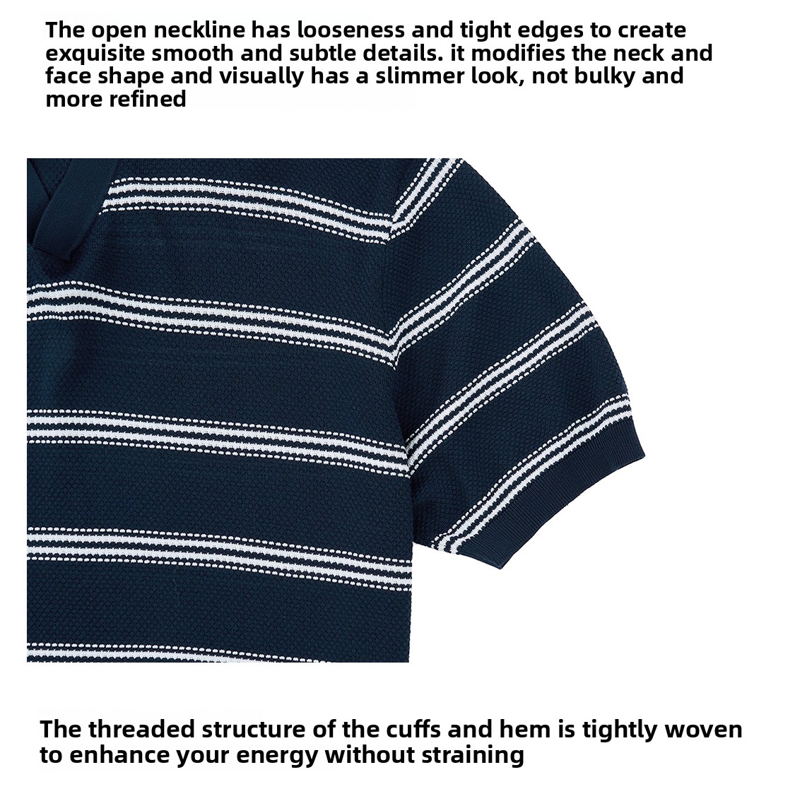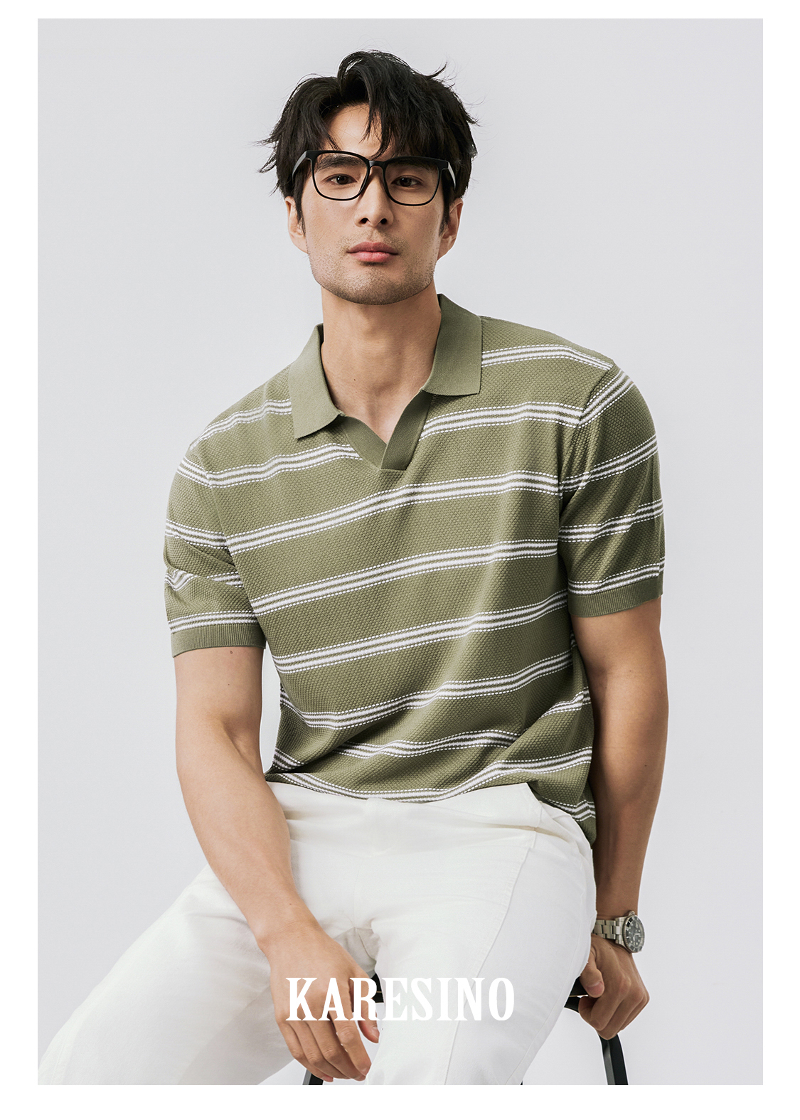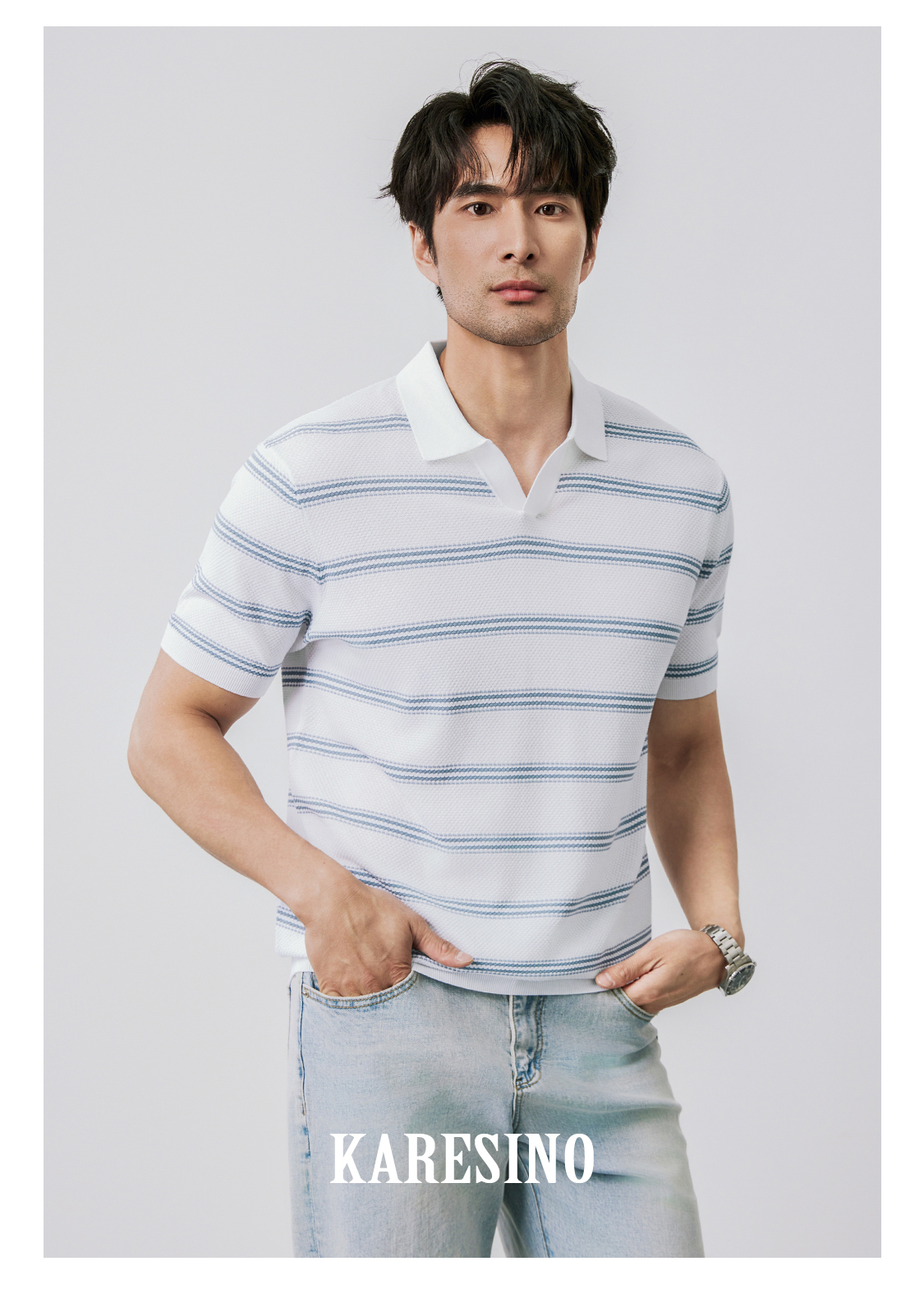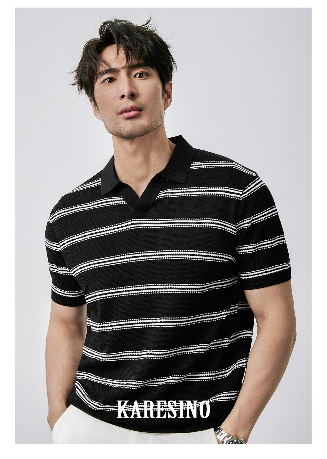 KARESINO Ice-silk Lapel-neck Striped Knitted Polo Shirt