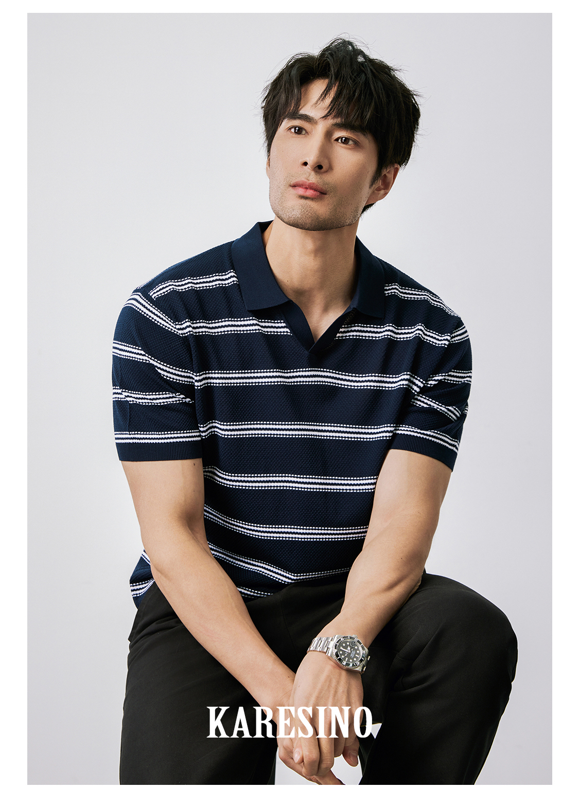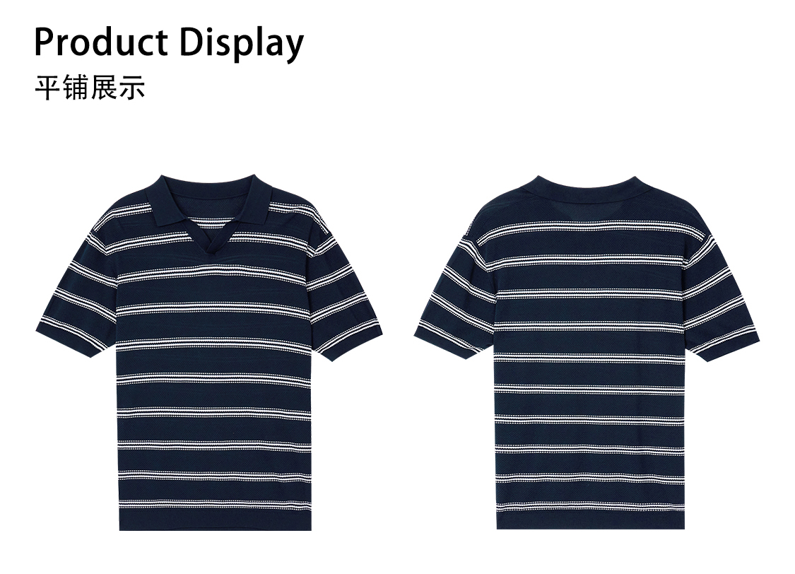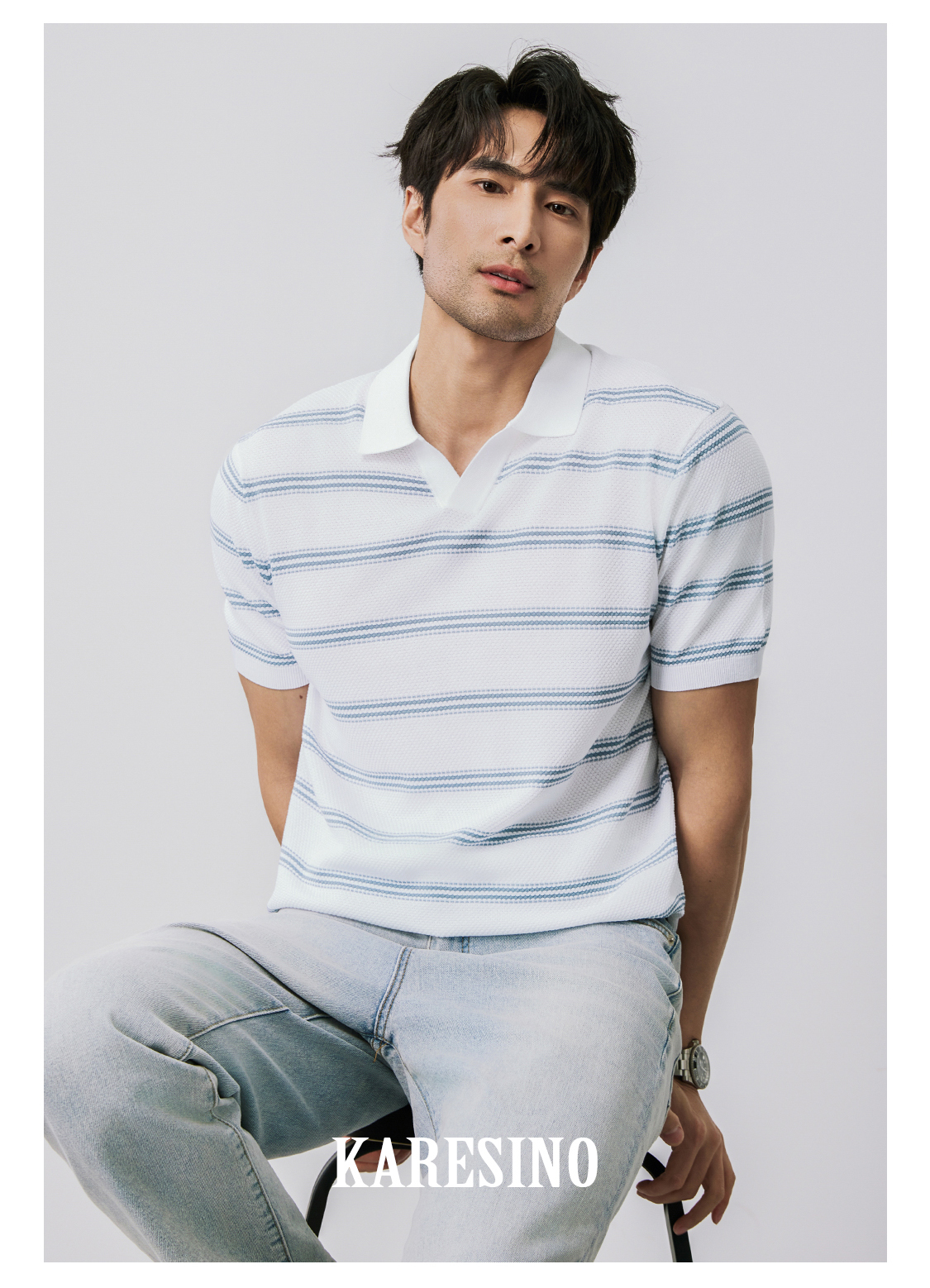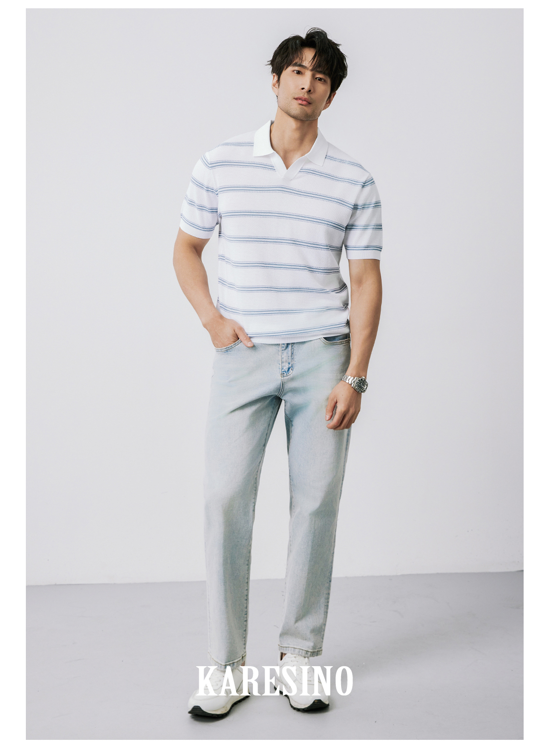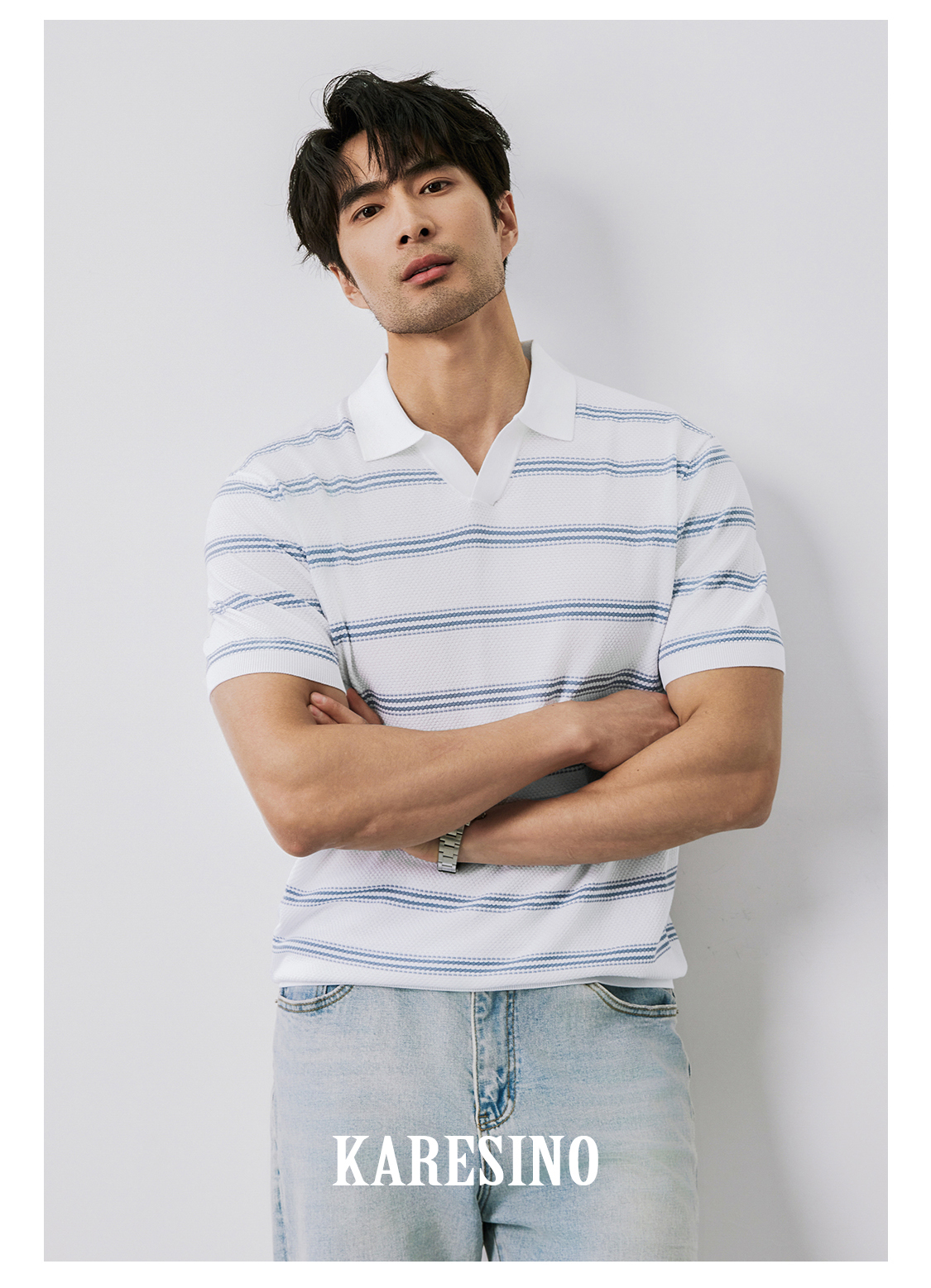 KARESINO Ice-silk Lapel-neck Striped Knitted Polo Shirt