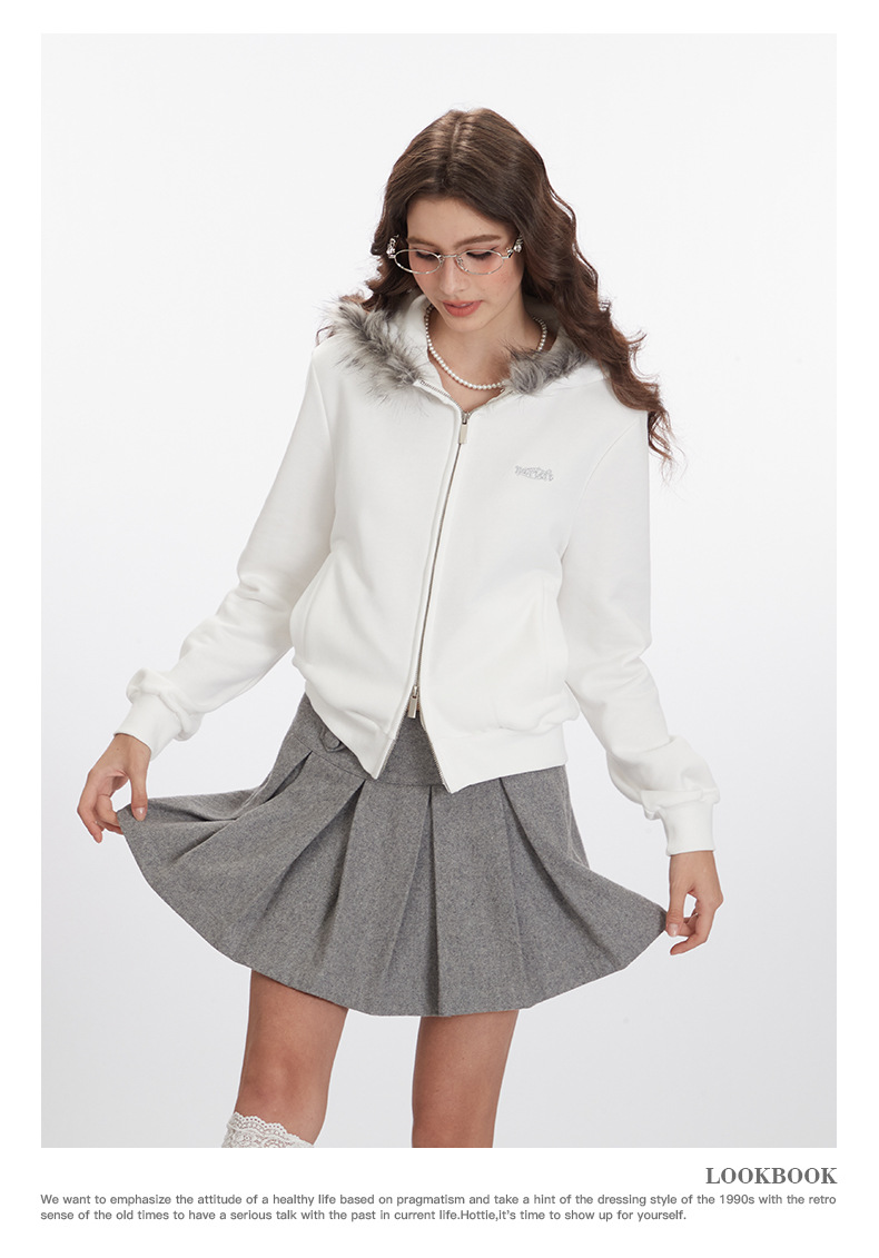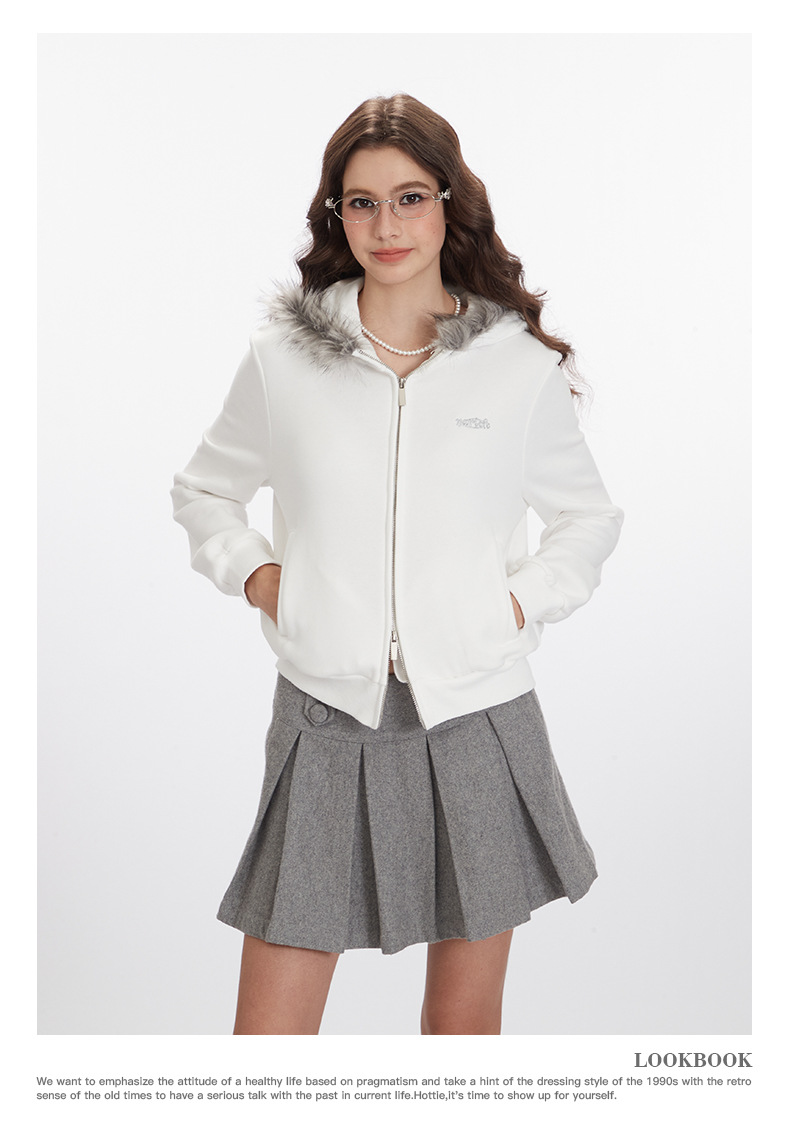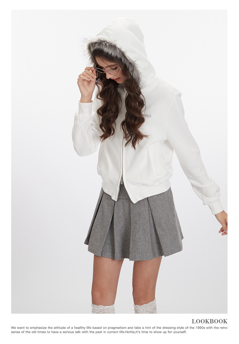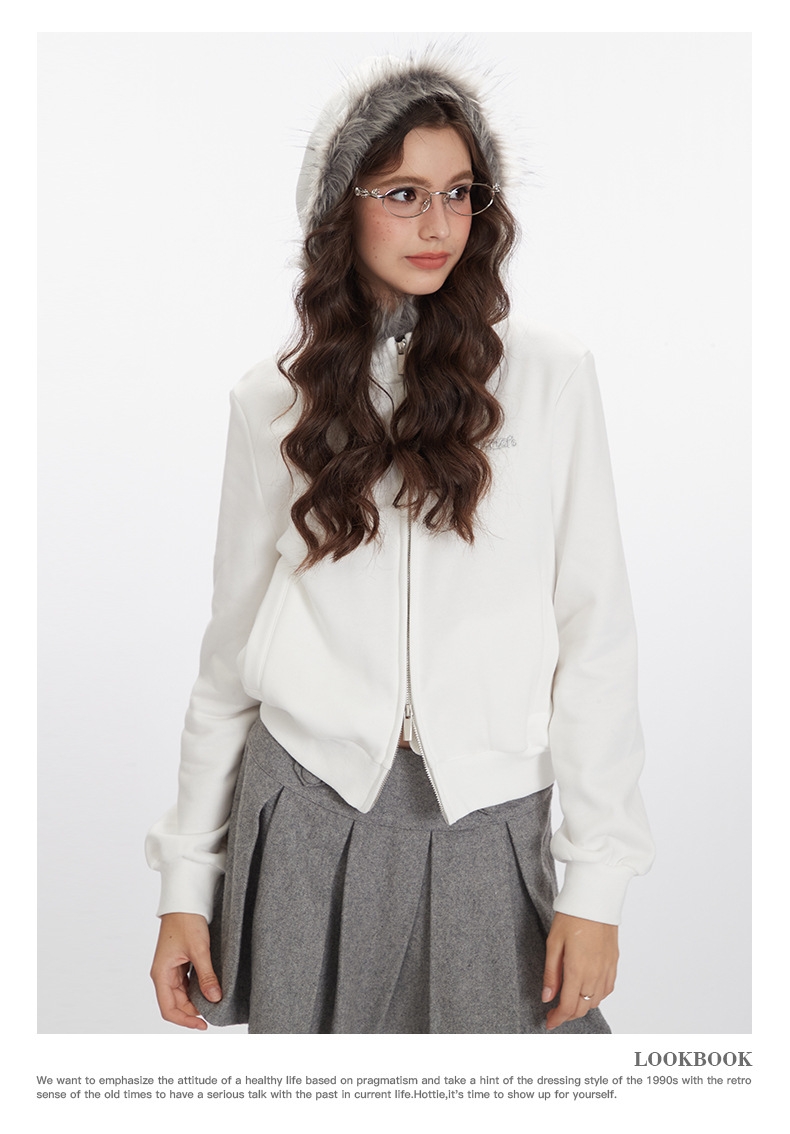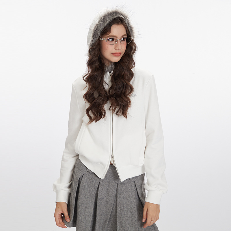 Nariele Fur Hood Embroidery Design Short Sweatshirt Zipper Hoodie