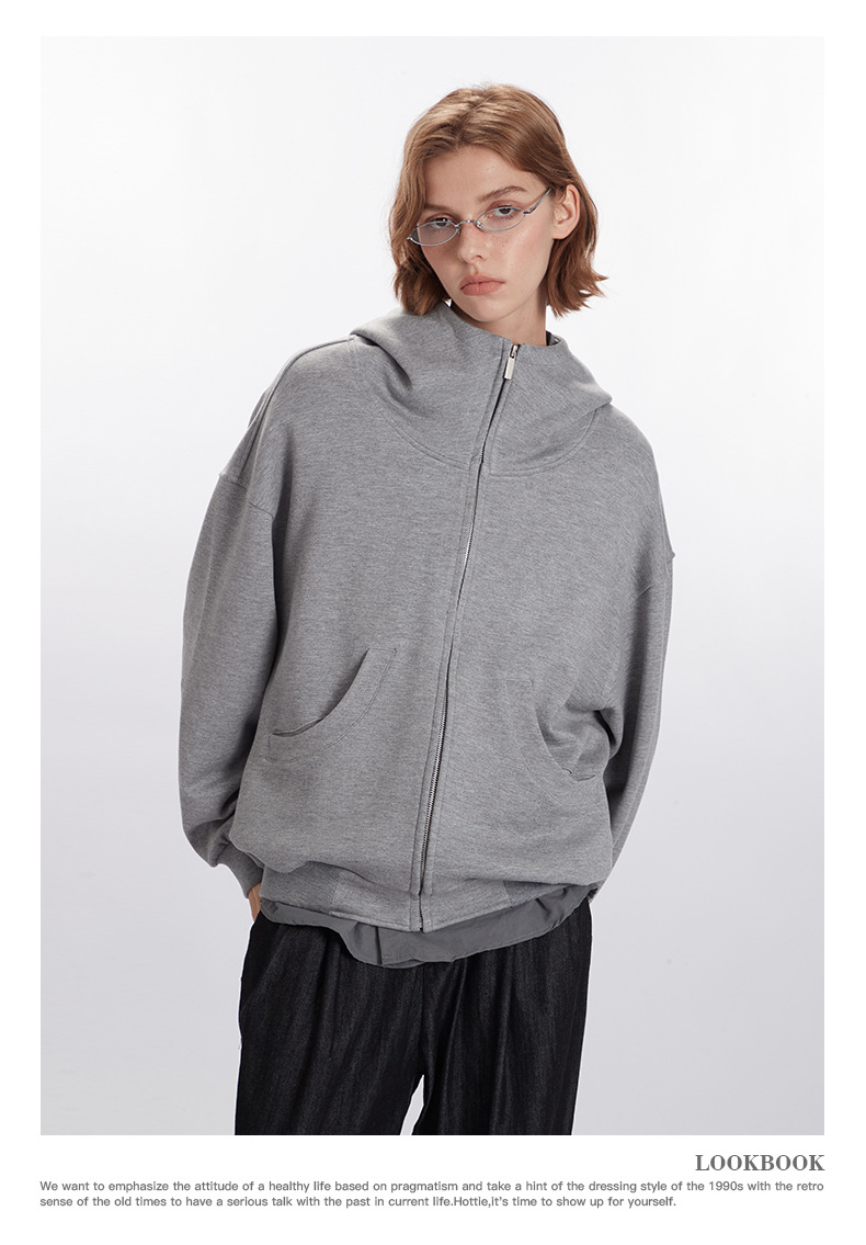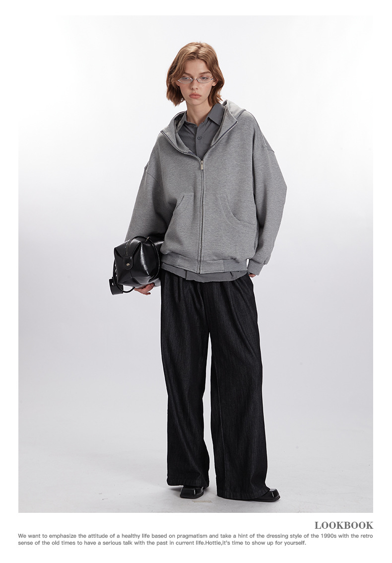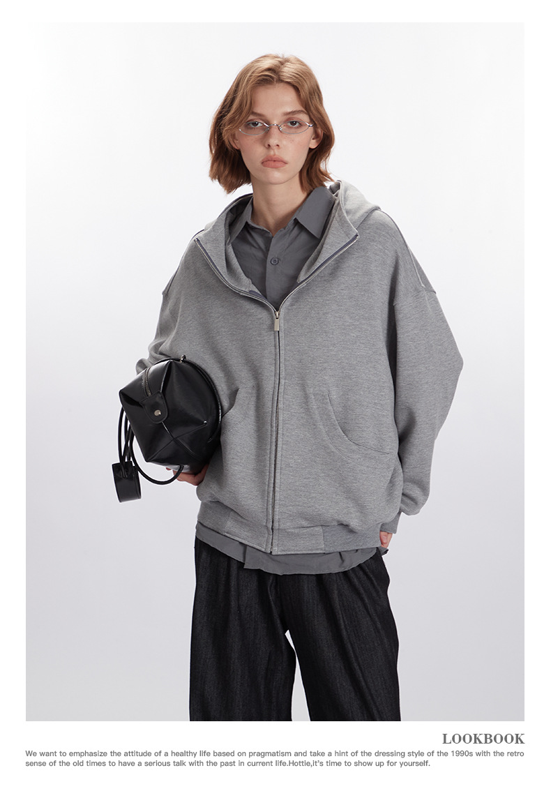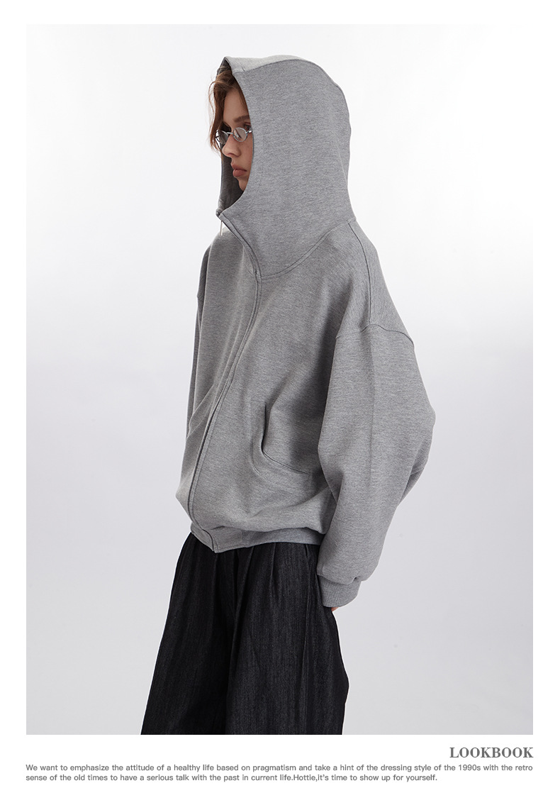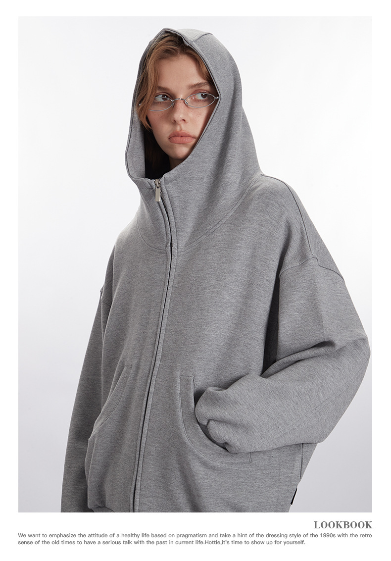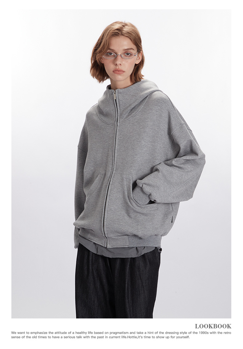 Nariele Retro Style Heavy Hoodie Trendy Zipper Solid Color Jackets