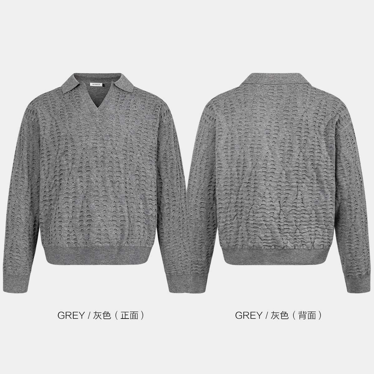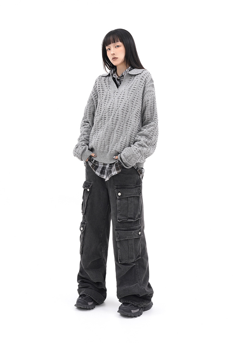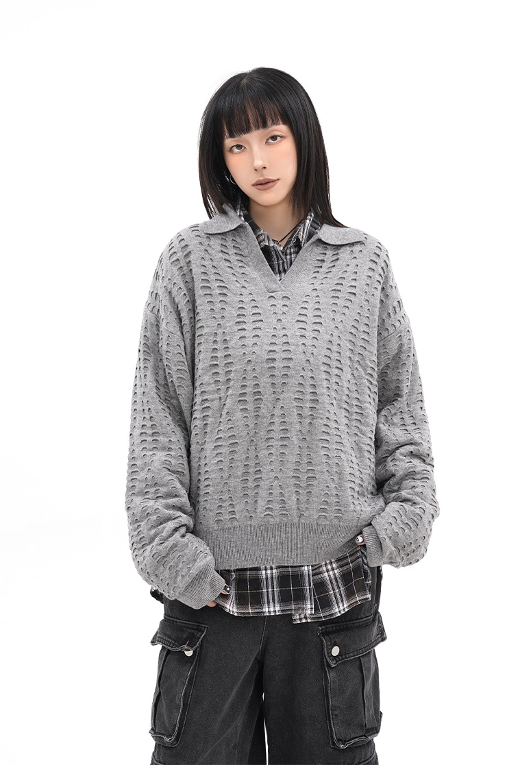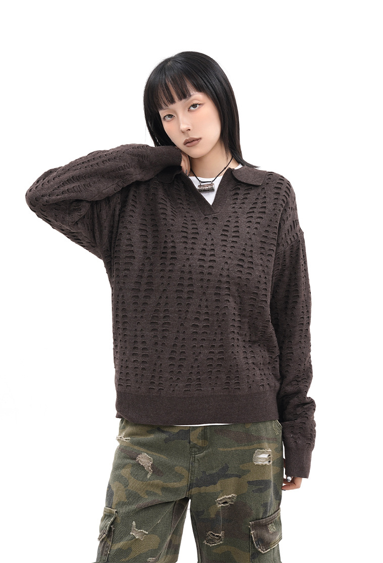 TRYTHMCLUB V-neck Lapel Ripped-knit Sweater