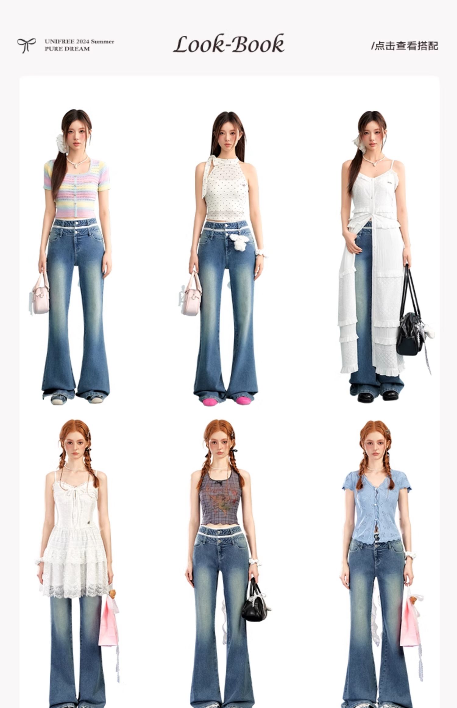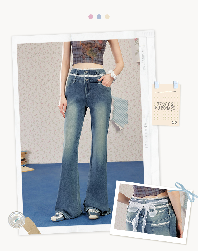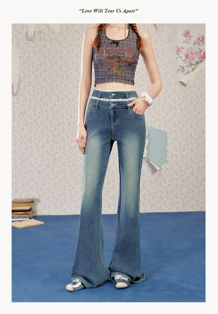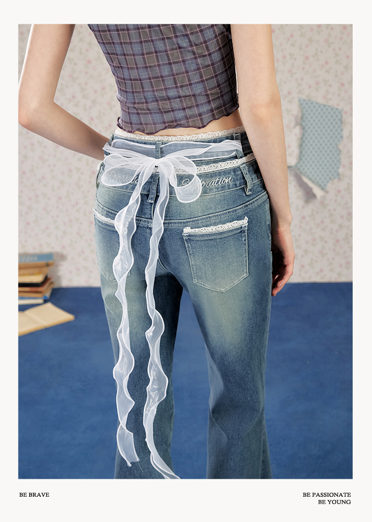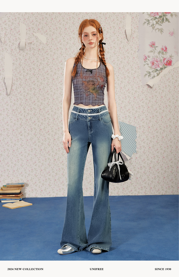 UNIFREE Double Waist Lace Stitching Slim Fit Jeans