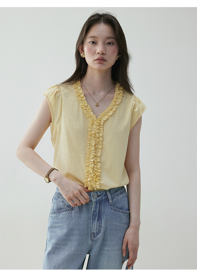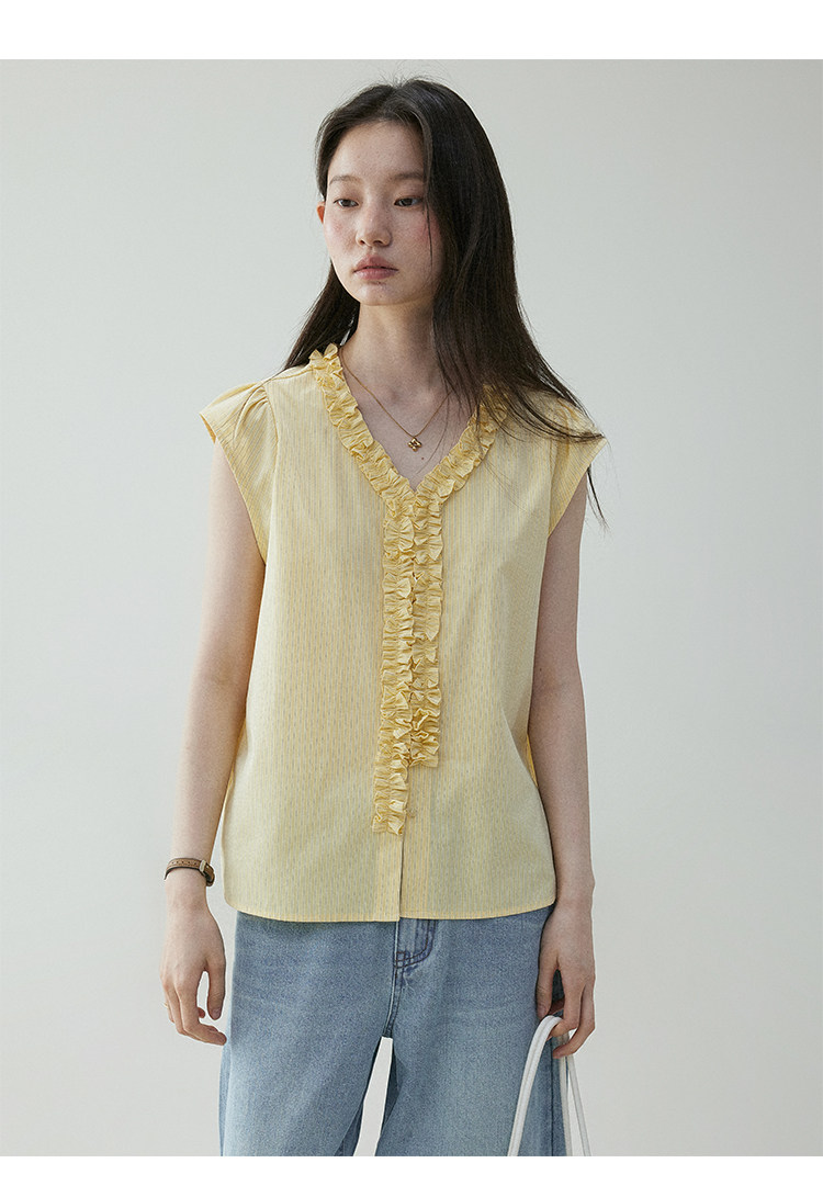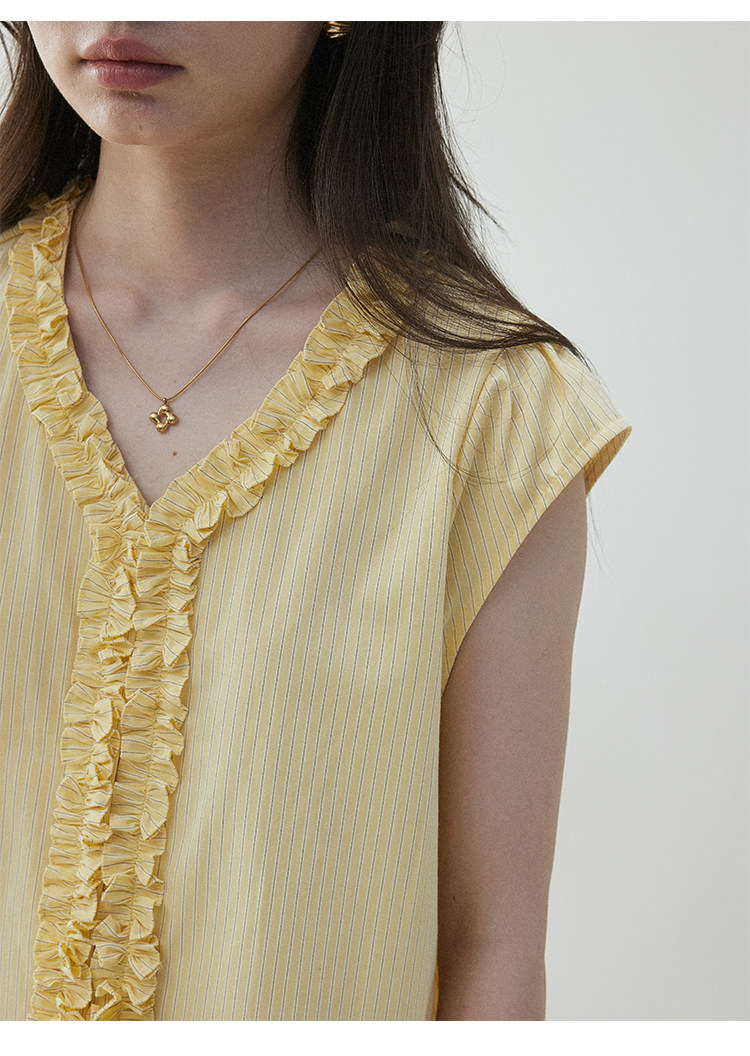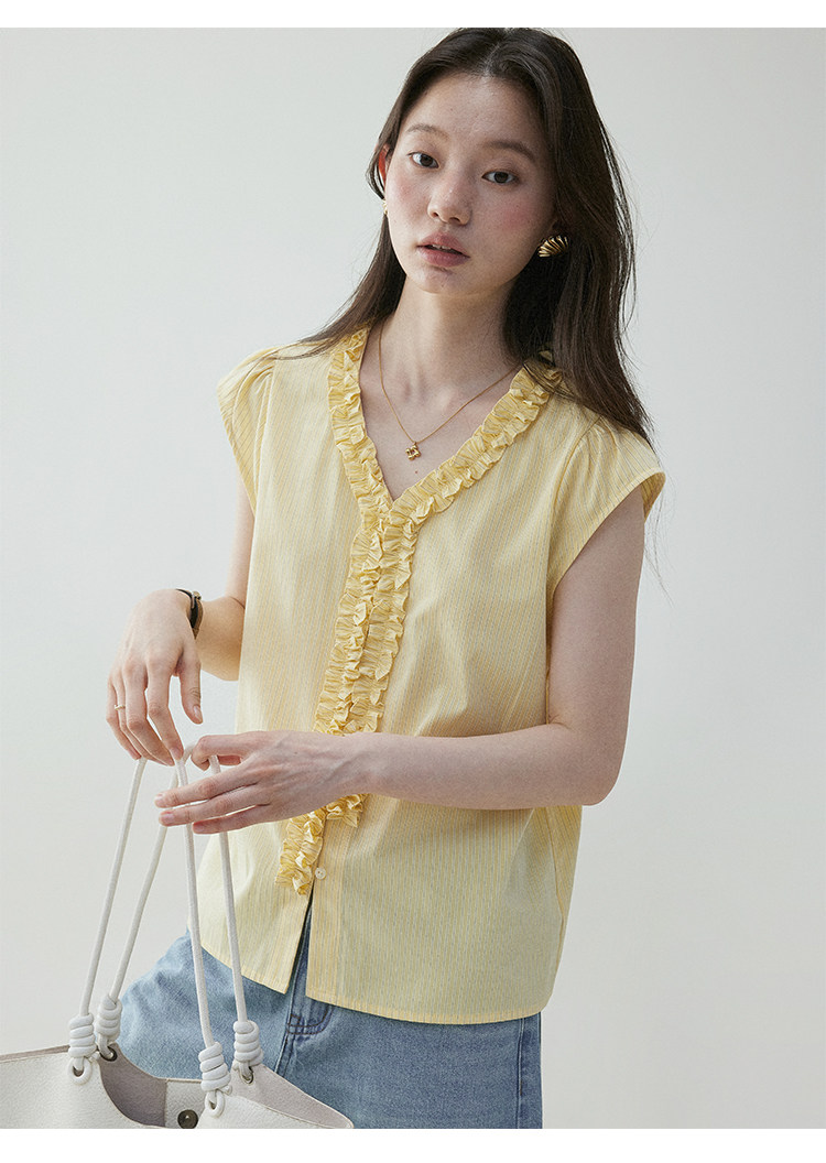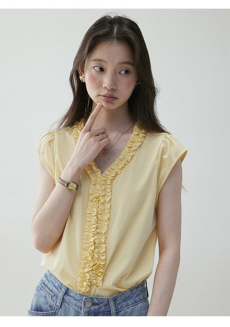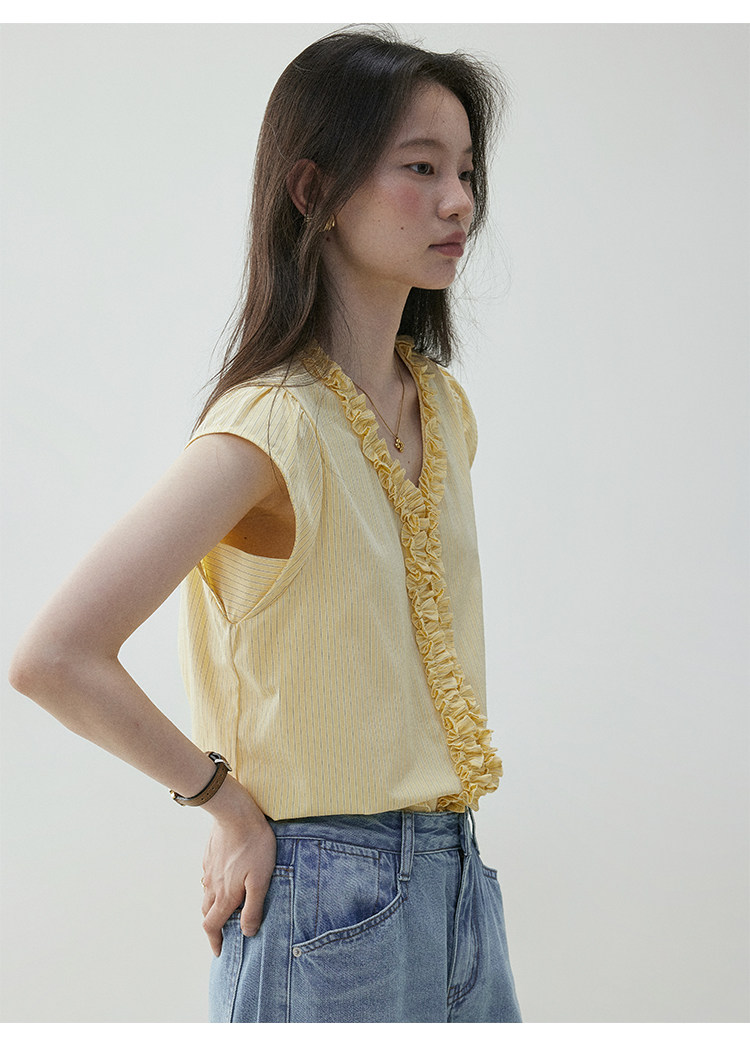 VOOE Fungus Edge V-Neck Striped Small Flying Sleeve Shirt