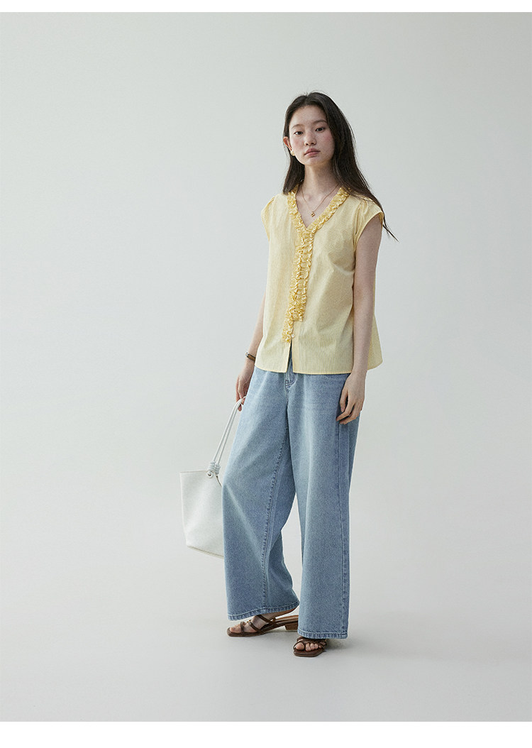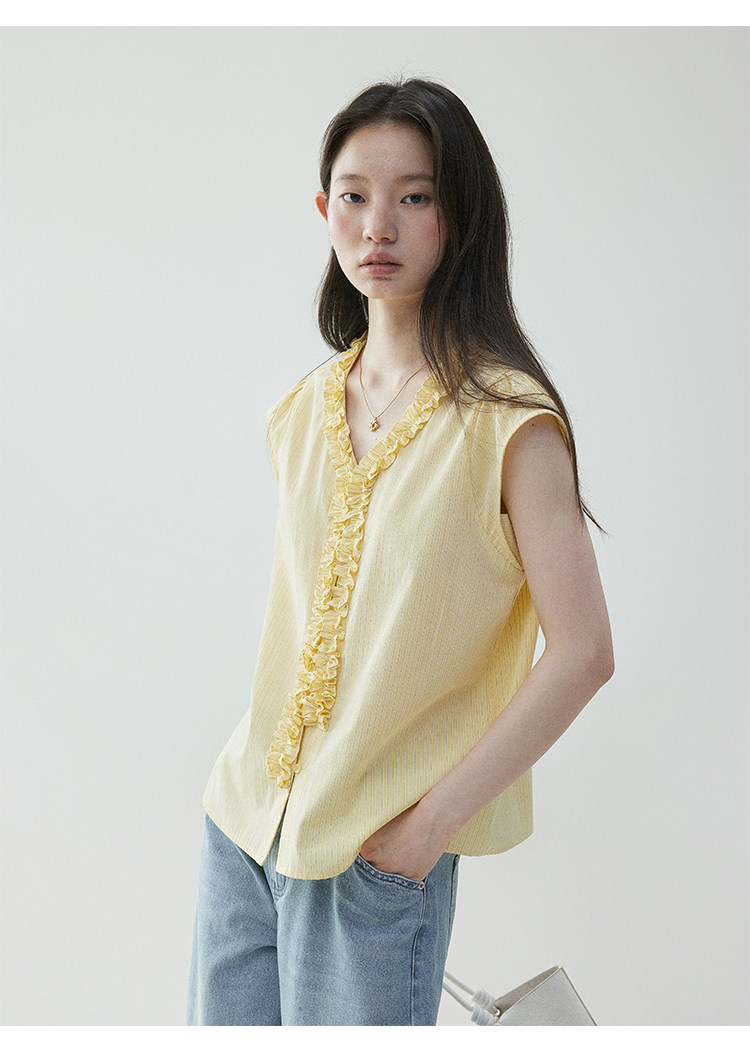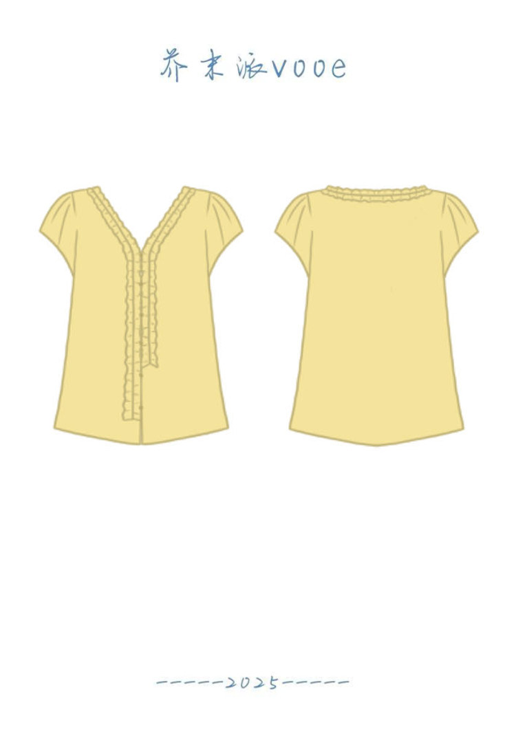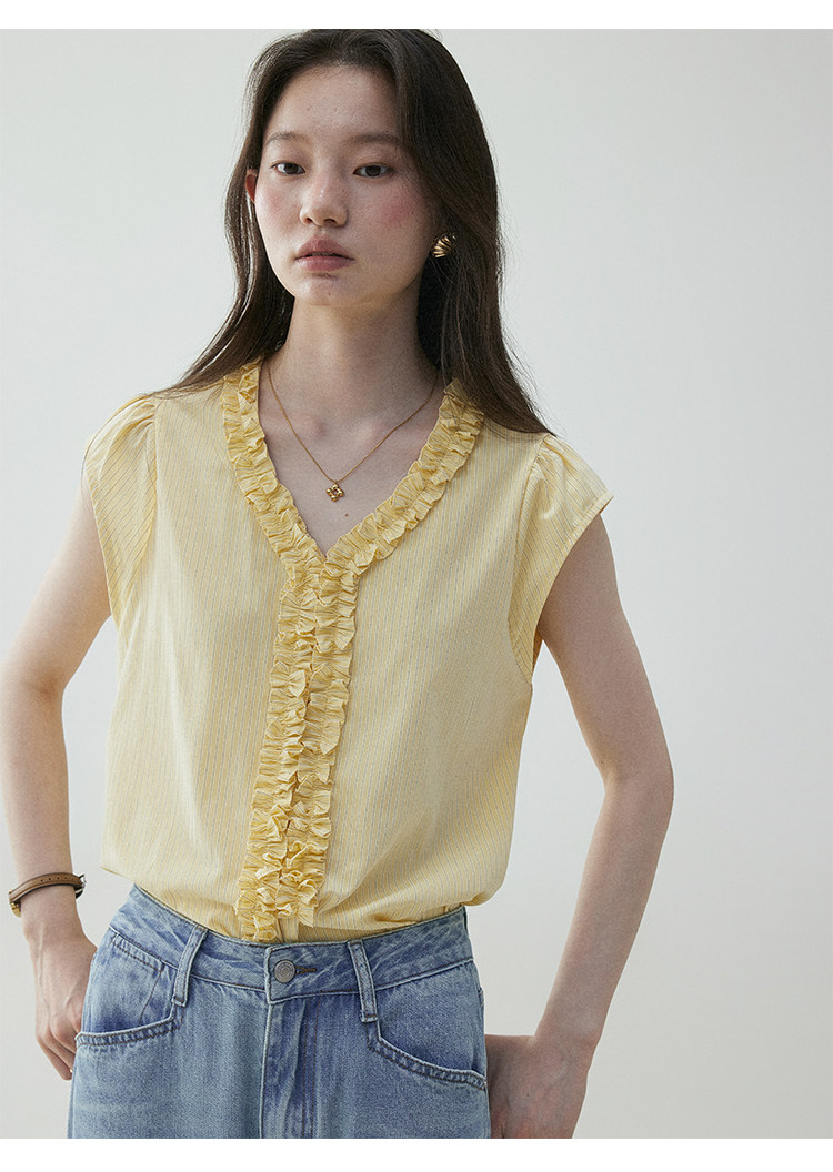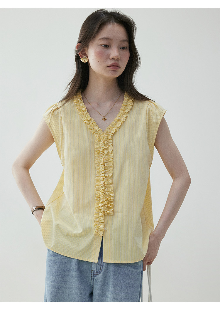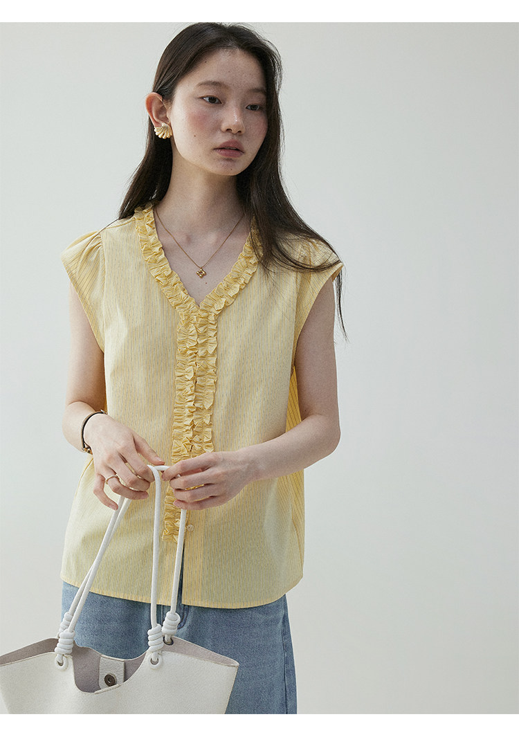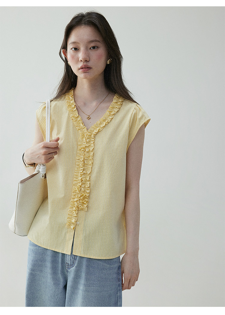 VOOE Fungus Edge V-Neck Striped Small Flying Sleeve Shirt