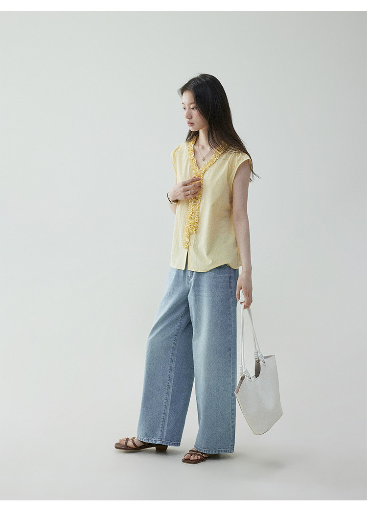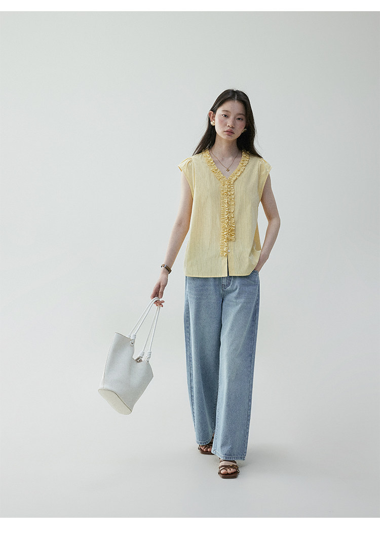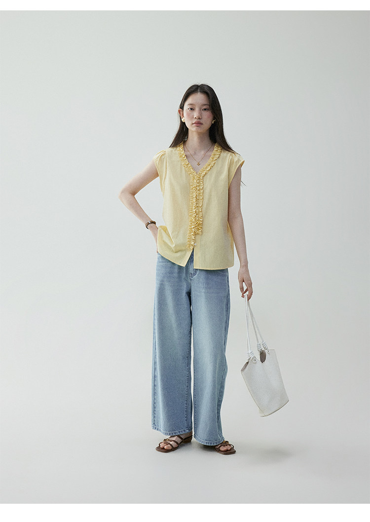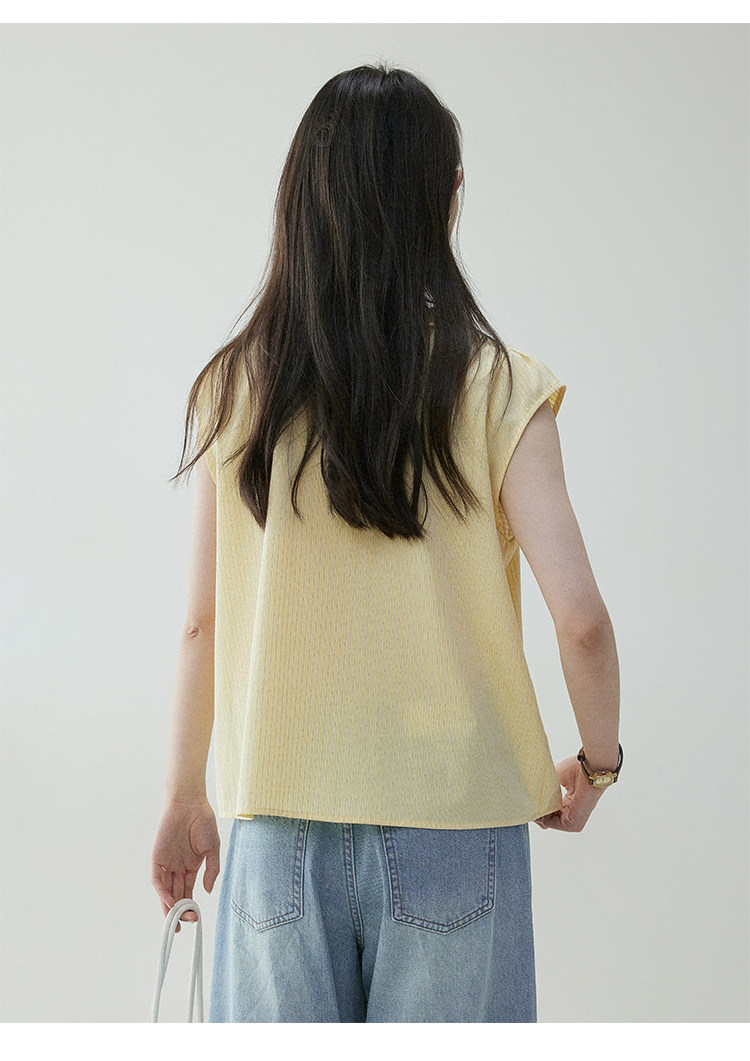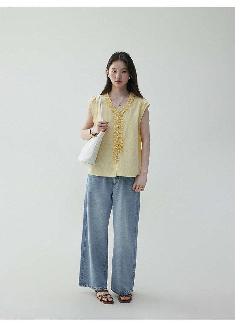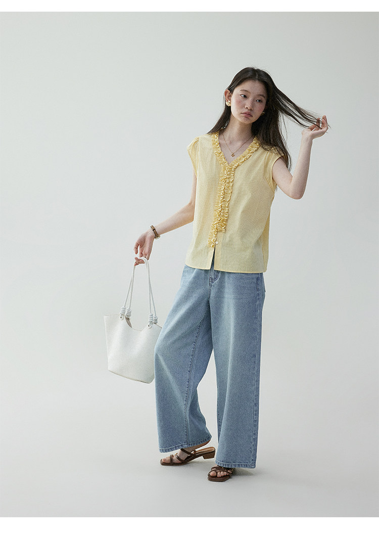VOOE Fungus Edge V-Neck Striped Small Flying Sleeve Shirt