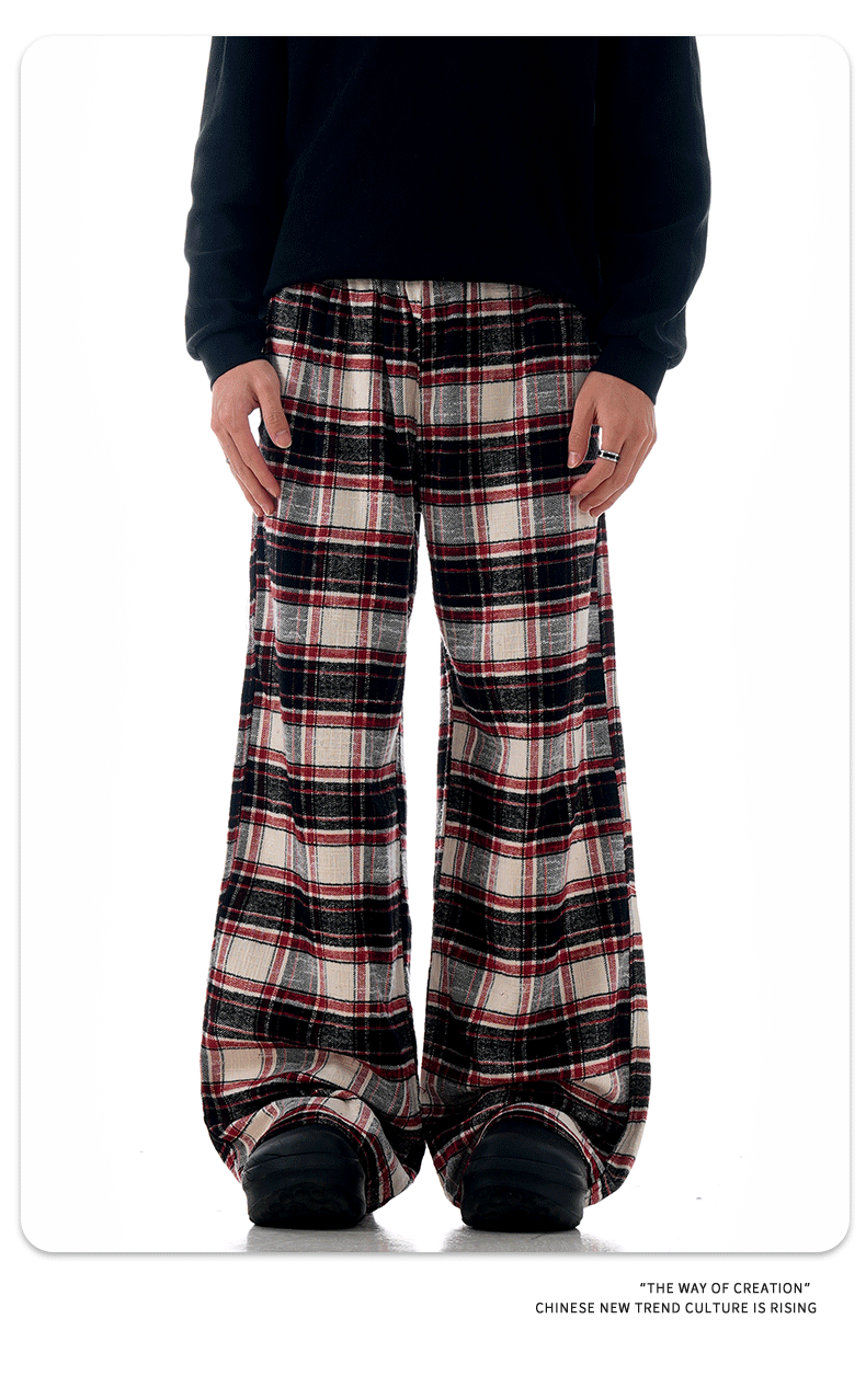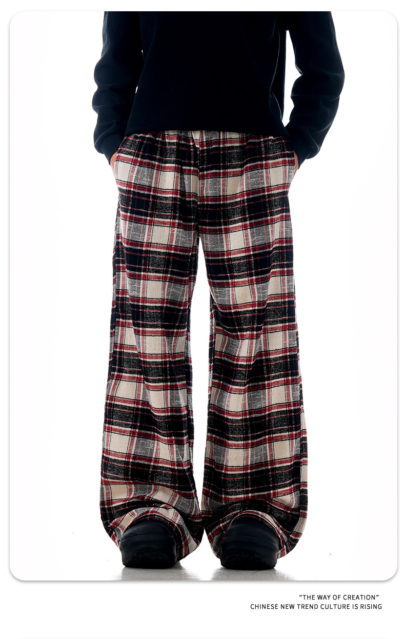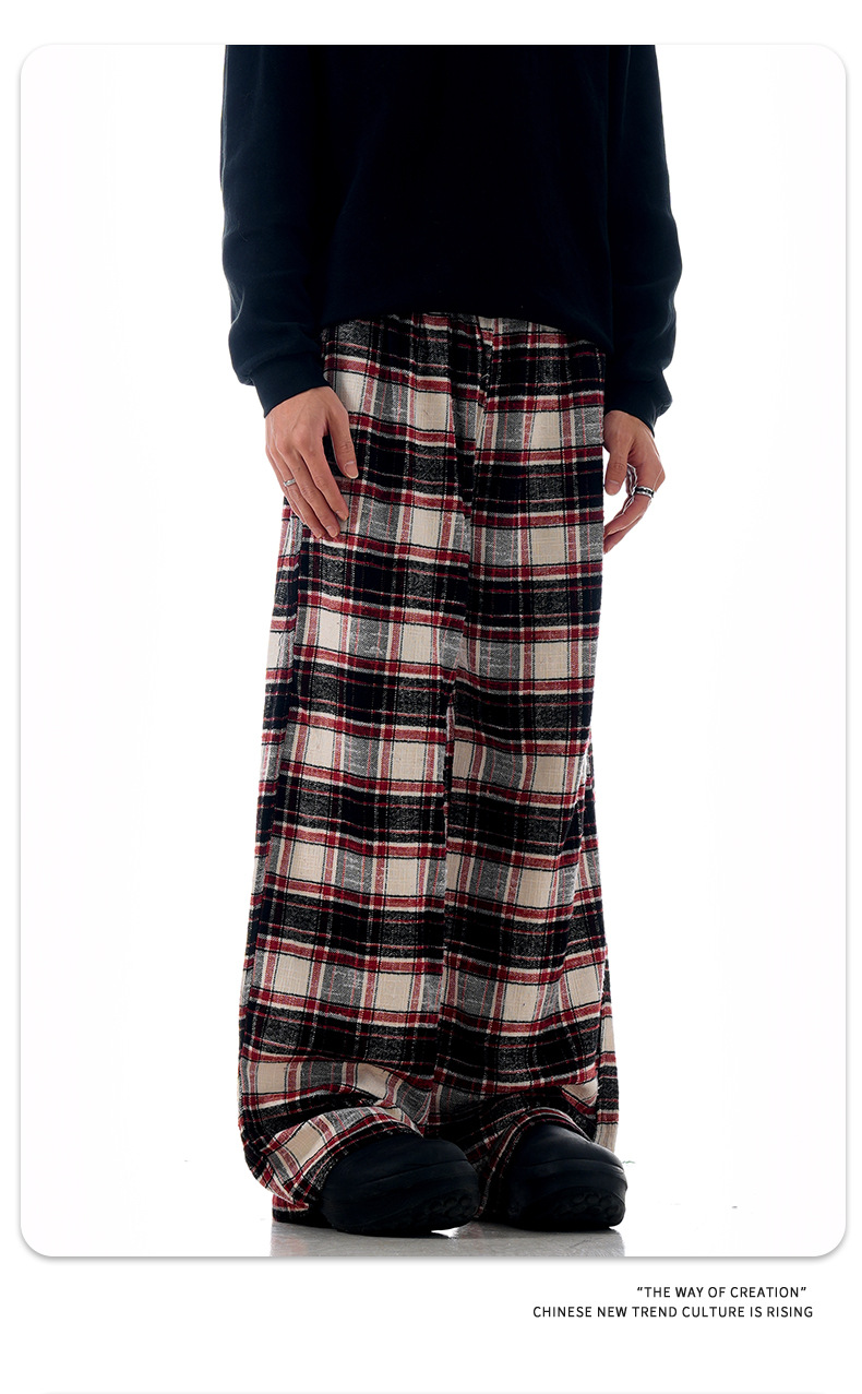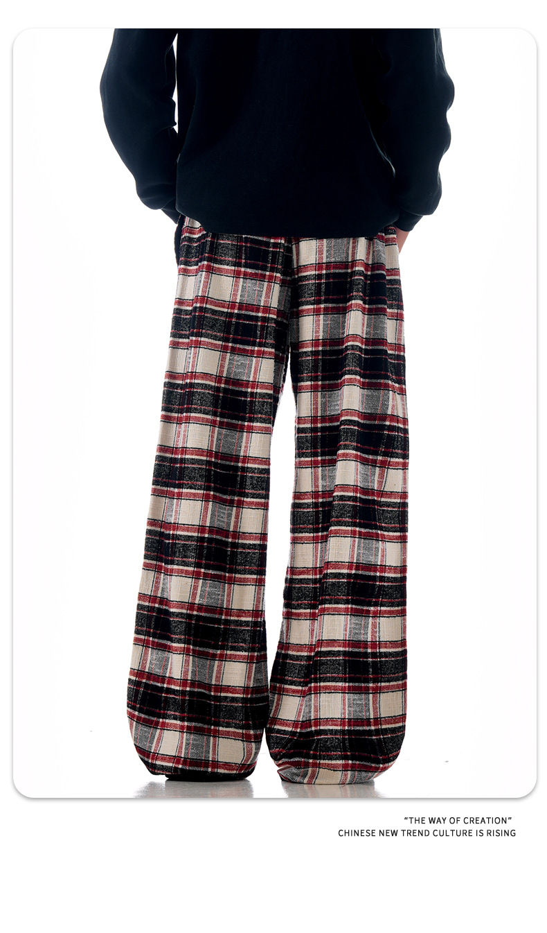 Plaid casual pants with an American impactLoose straight wide pants for spring and fallTrendy long pants with a draped feel