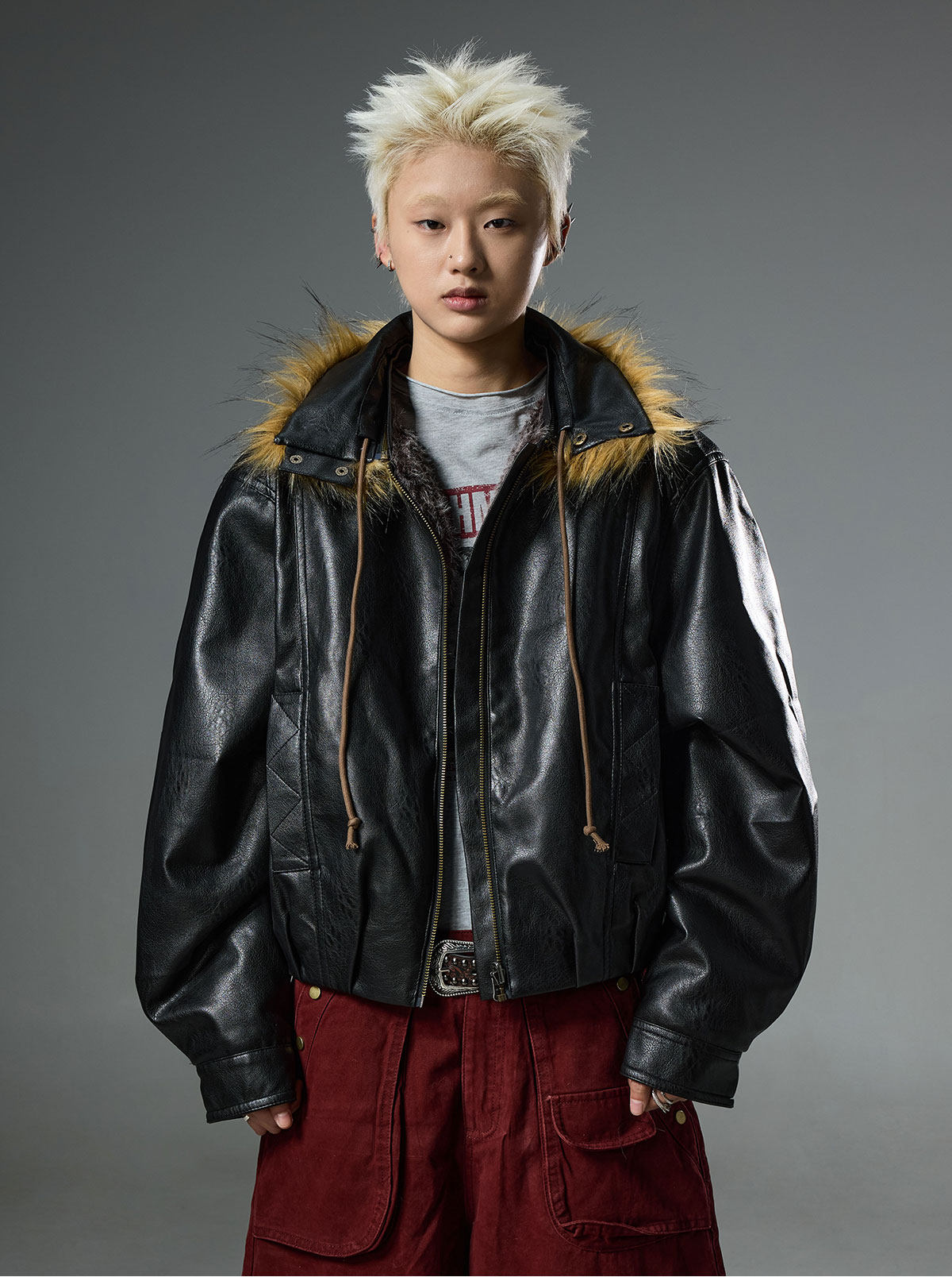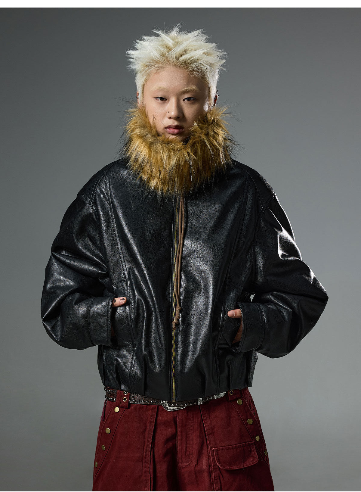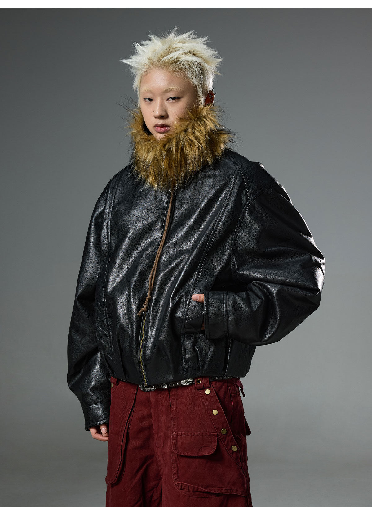 BTSG retro double-sided wear fur collar leather jacket