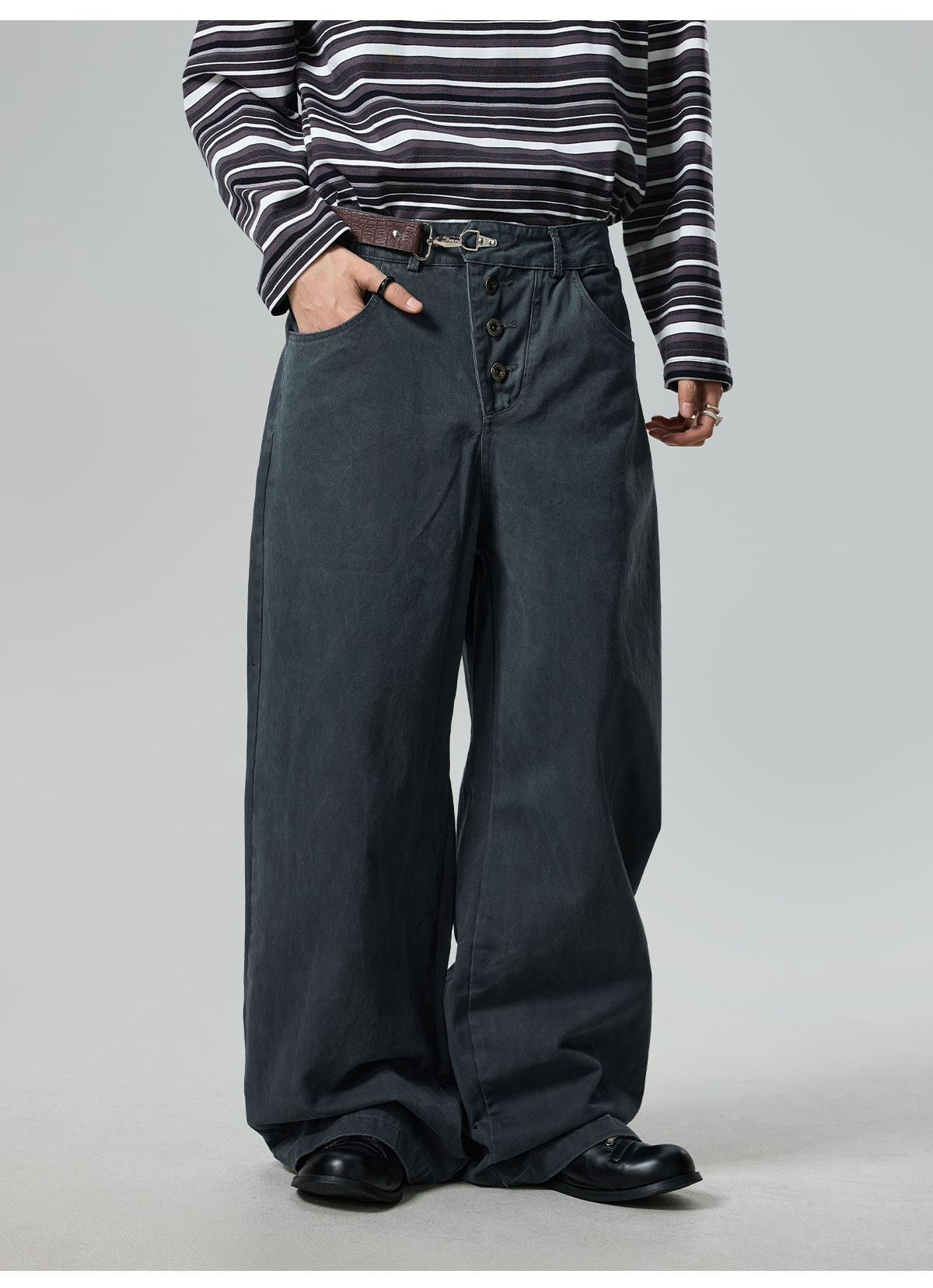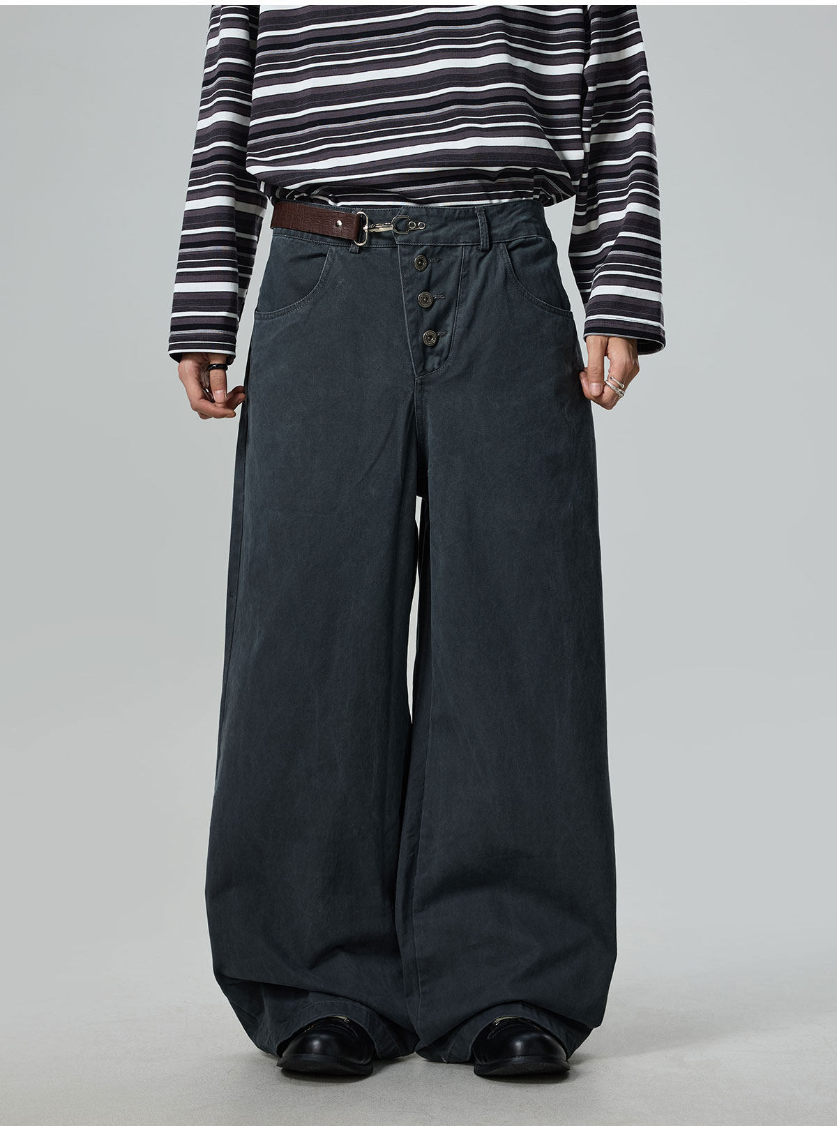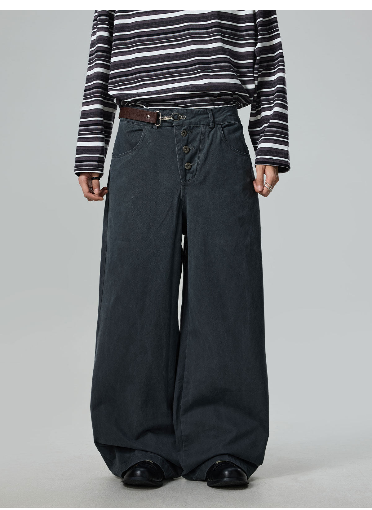 BTSG retro leather buckle waist washed gray loose wide-leg pants