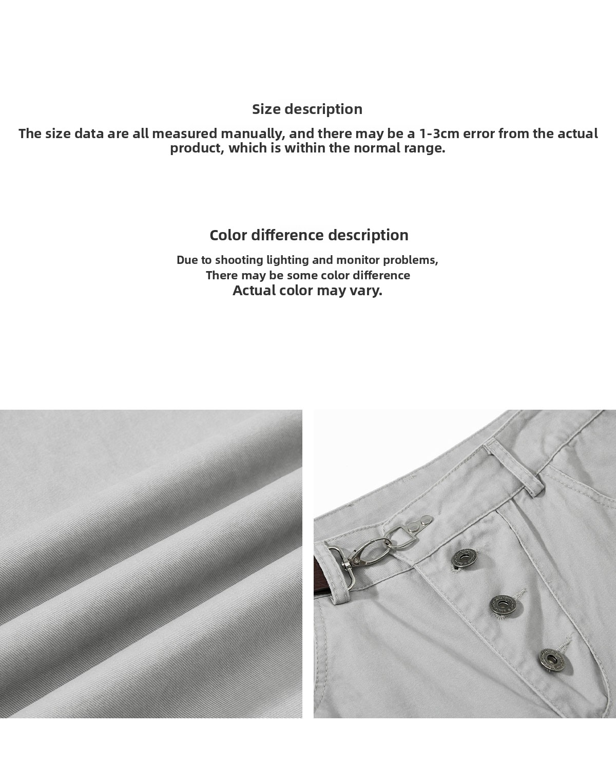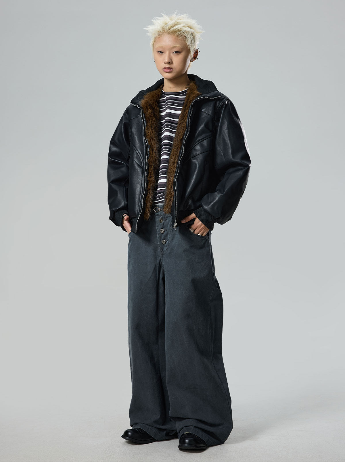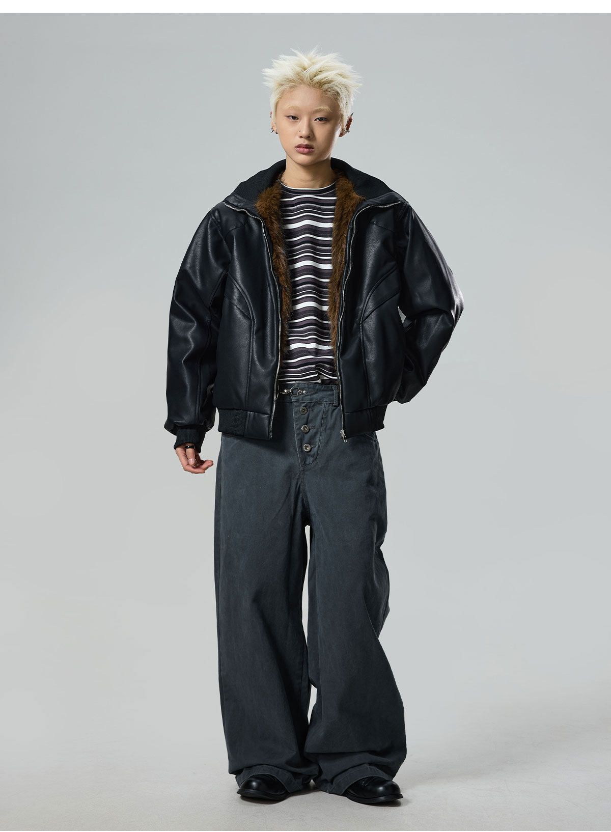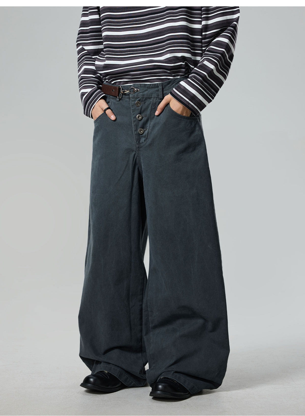 BTSG retro leather buckle waist washed gray loose wide-leg pants
