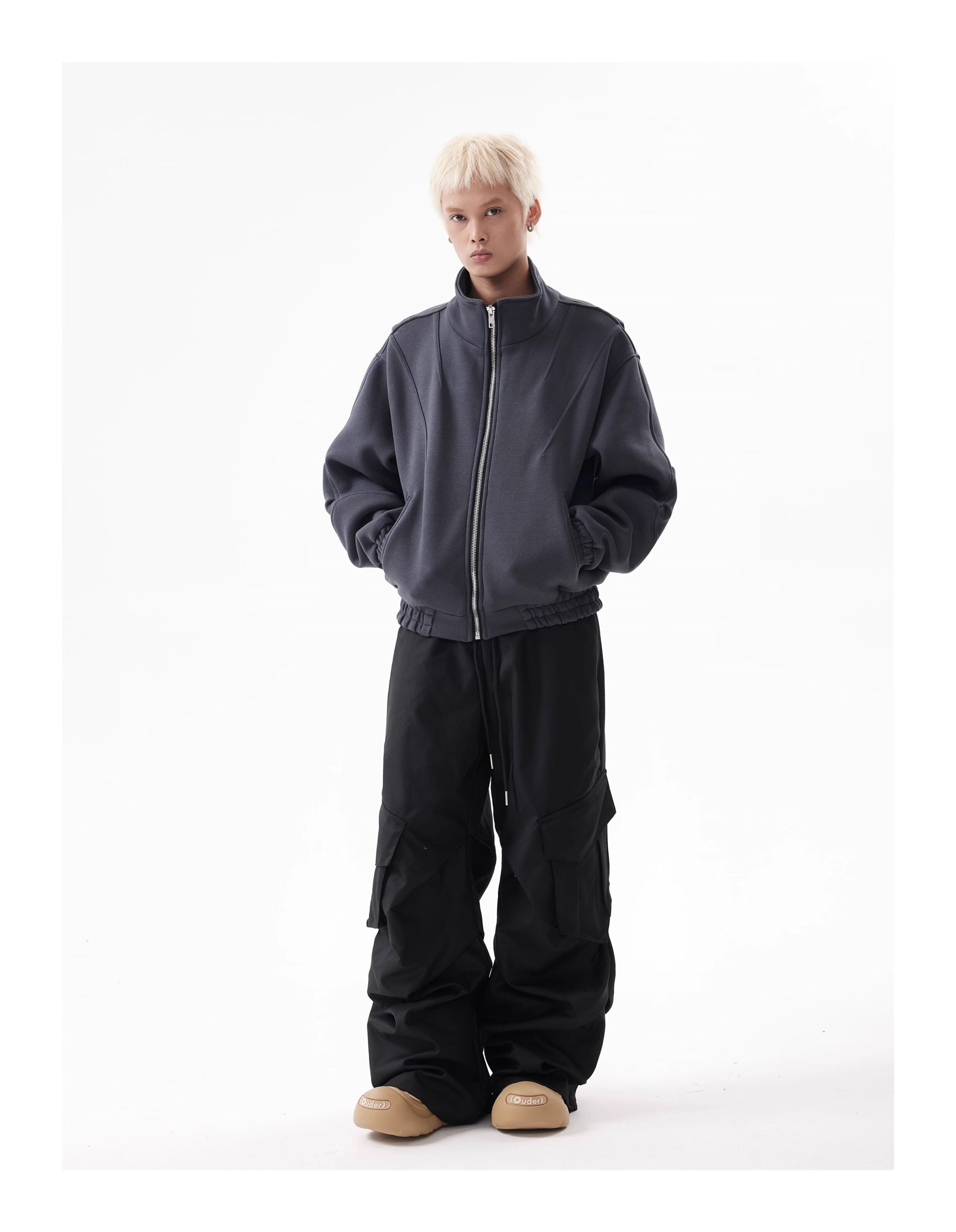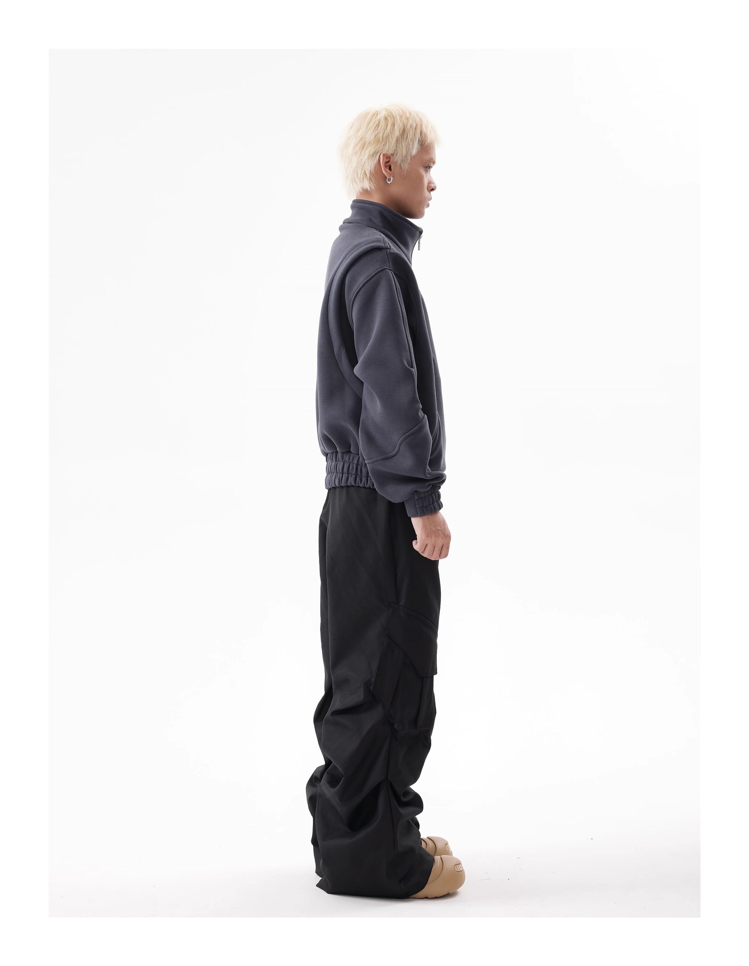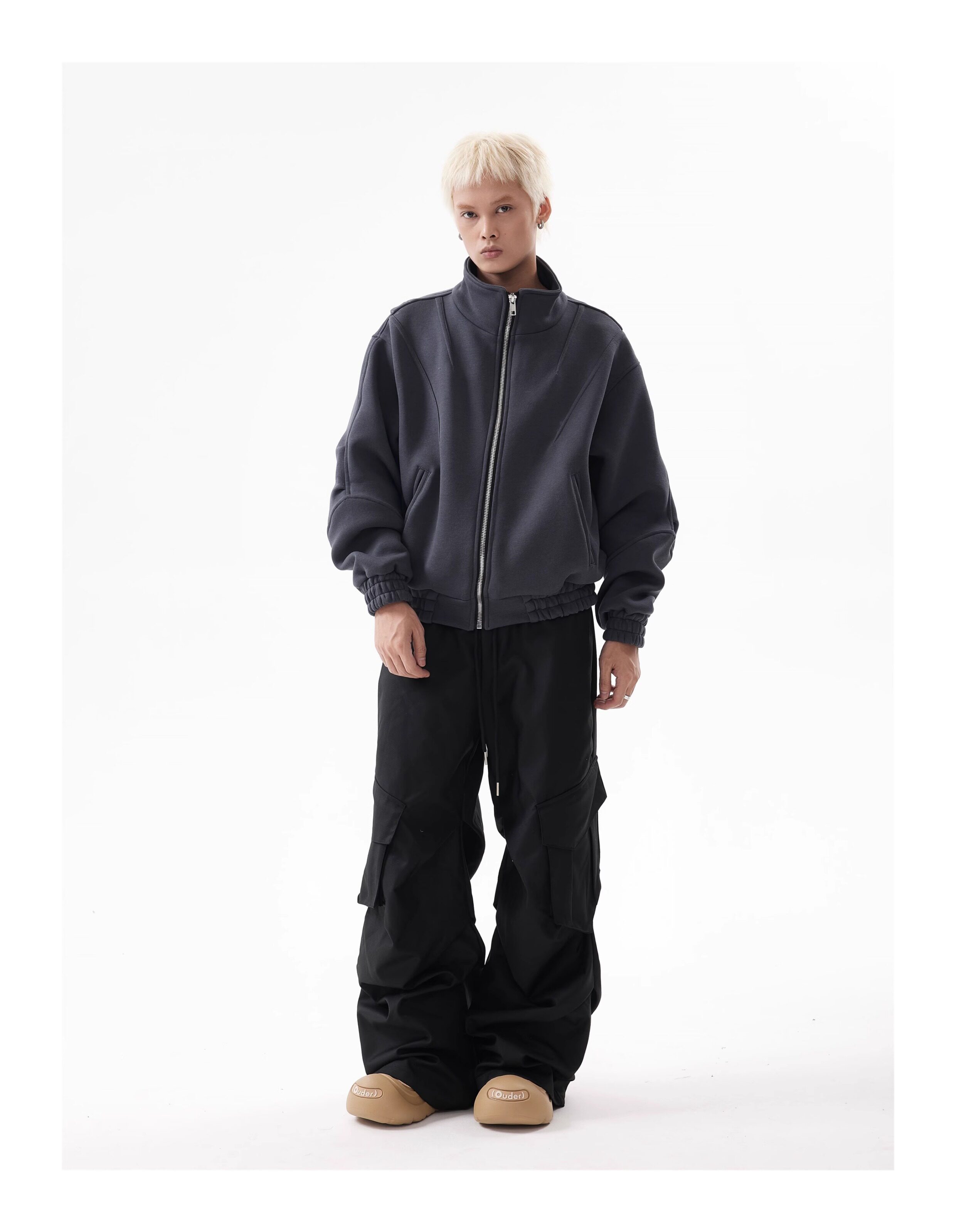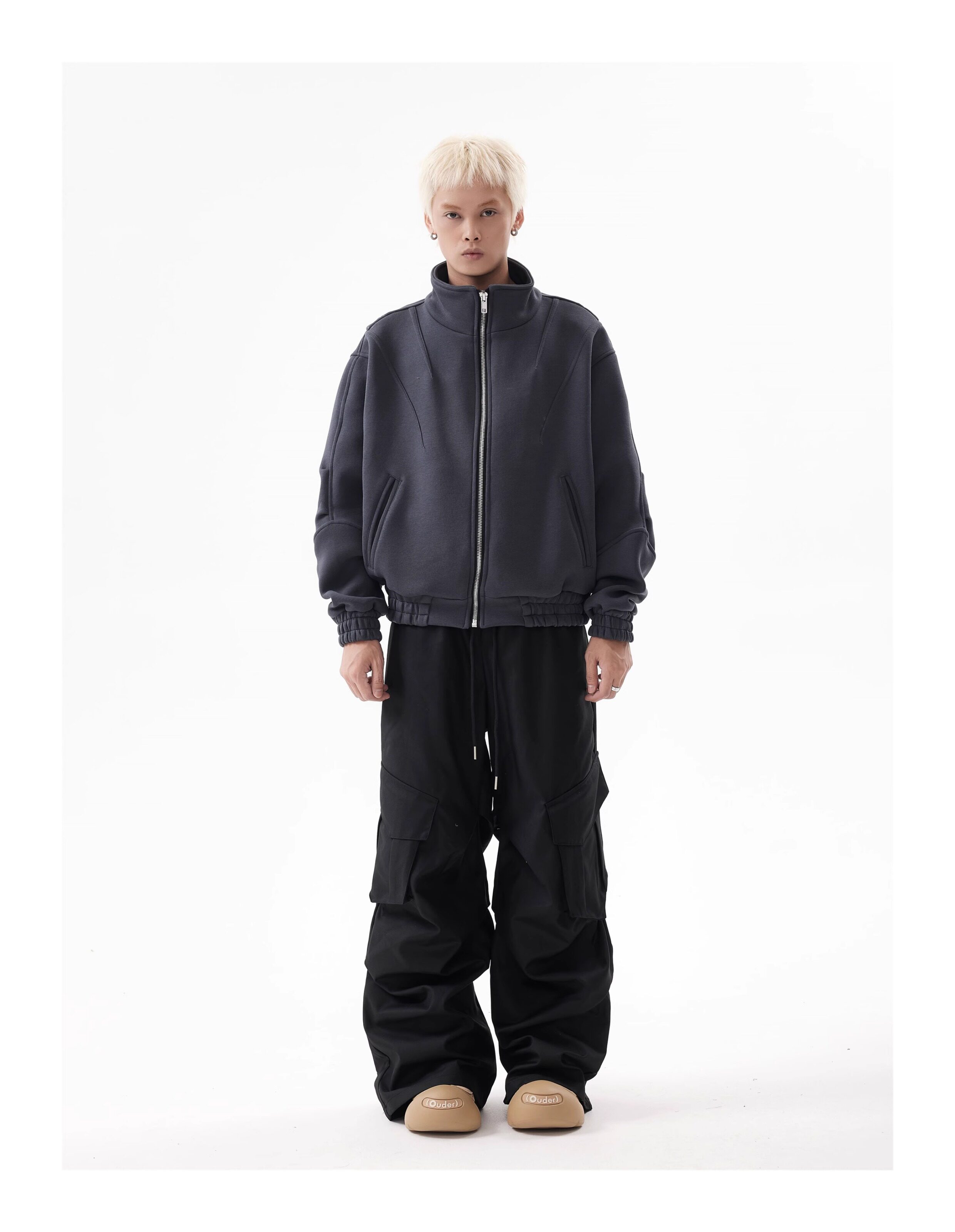 BTSG Deconstructed boxy cropped silhouette double zip jacket
