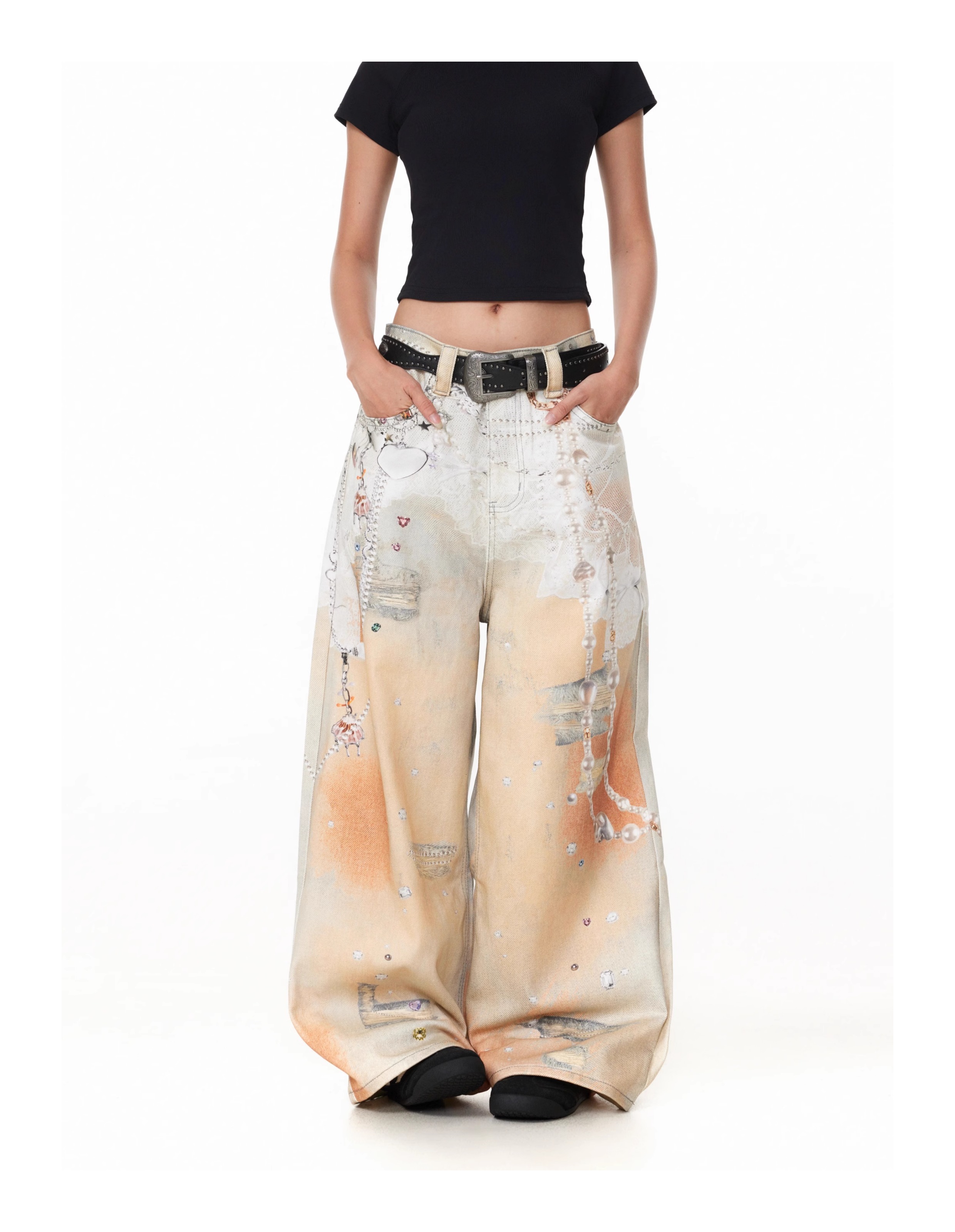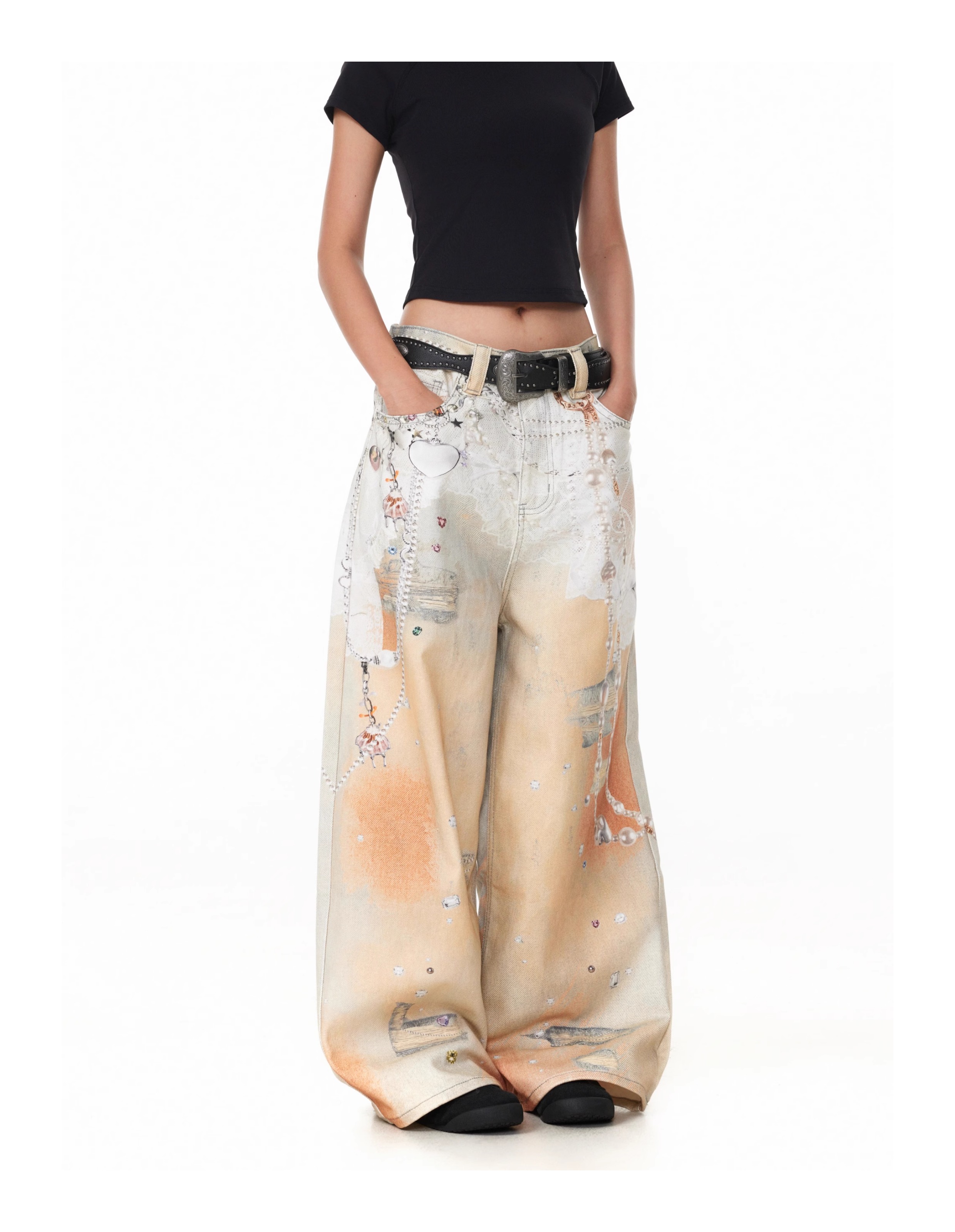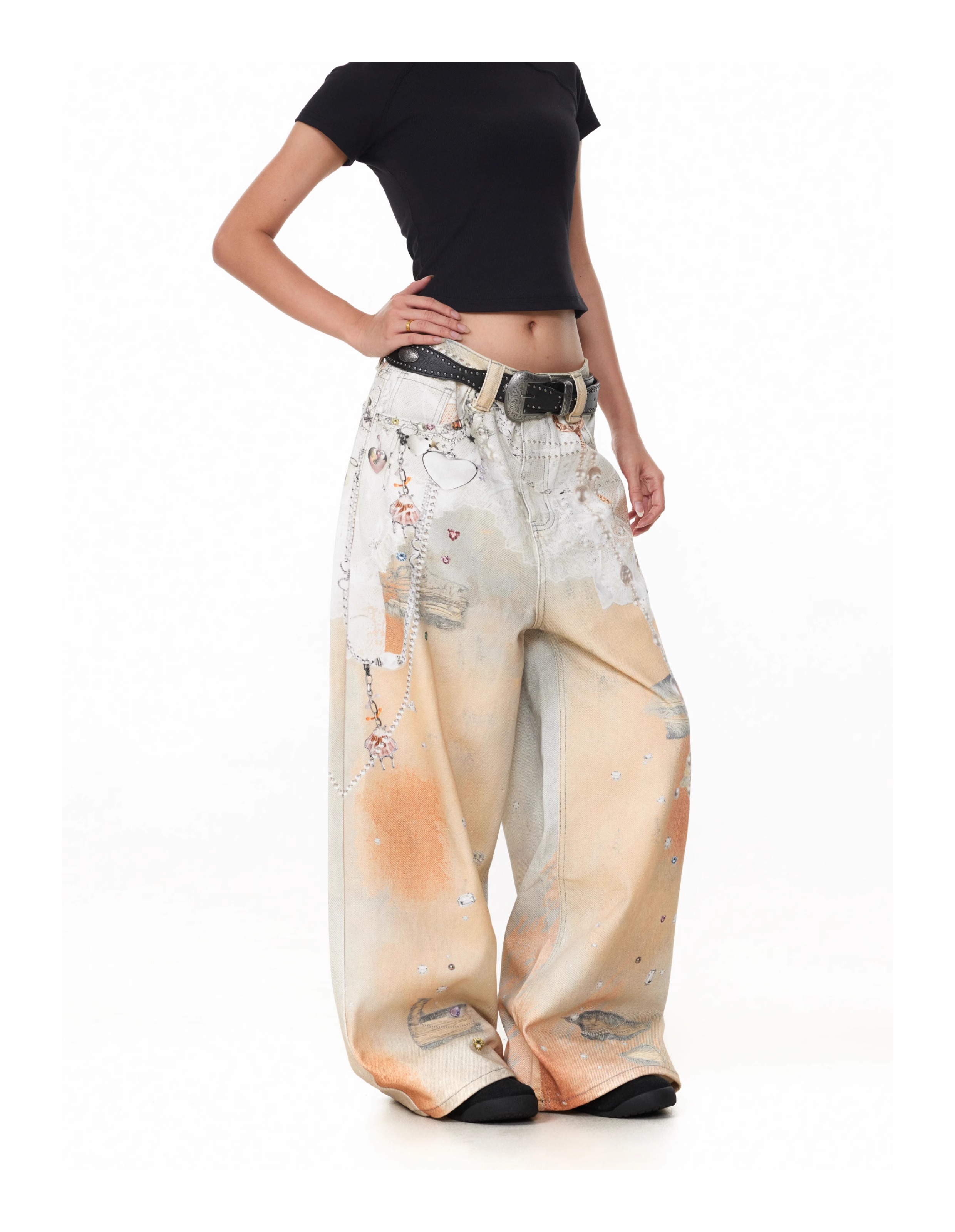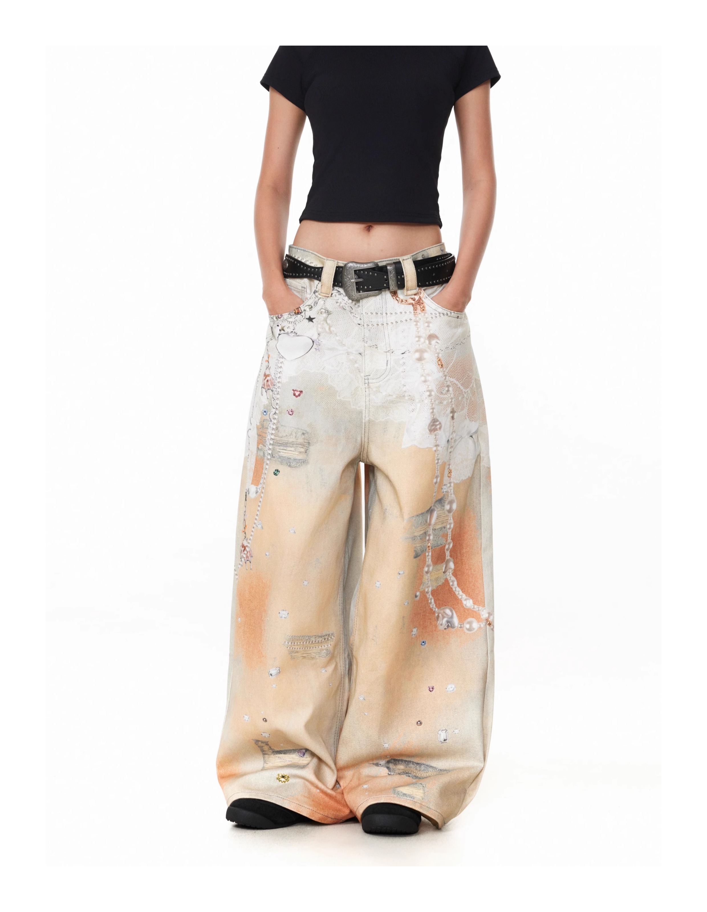BTSG Retro 3D Chain Printing Loose Wide-leg Jeans