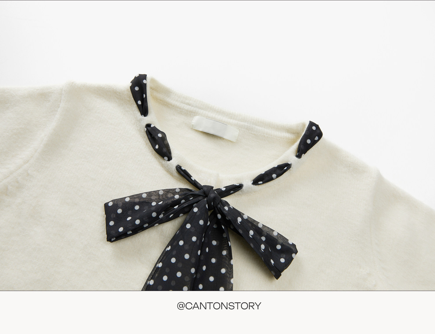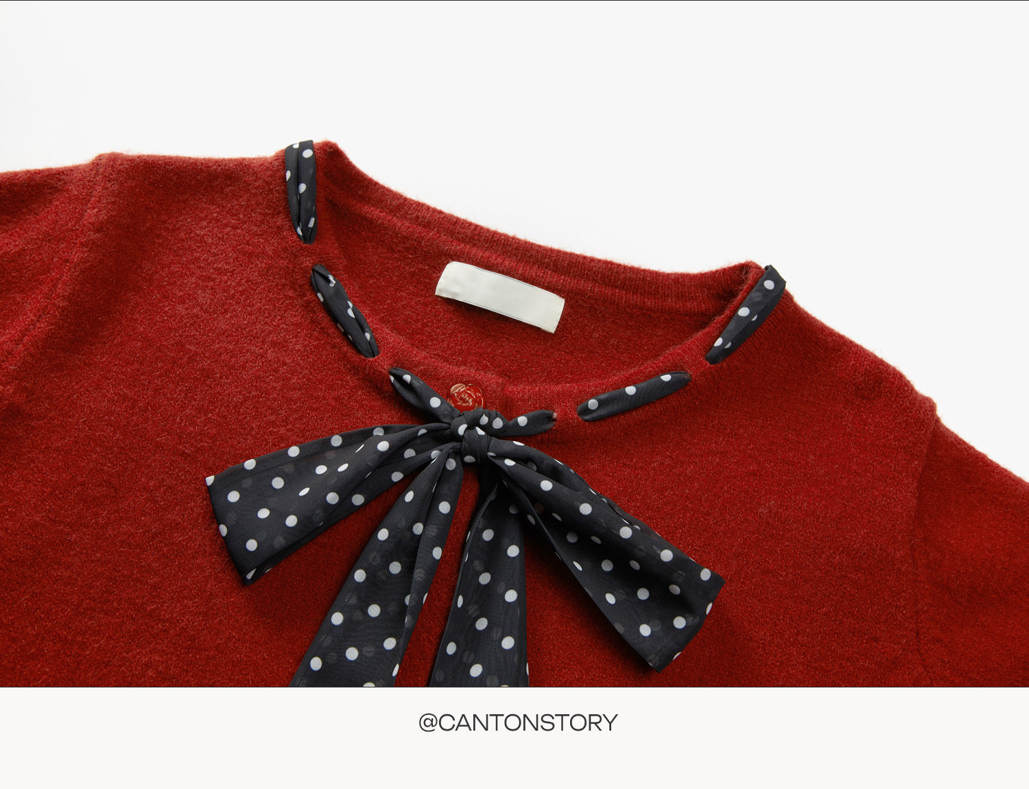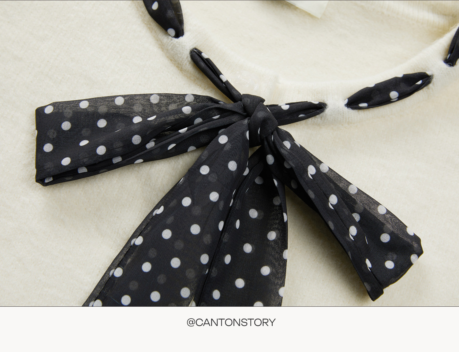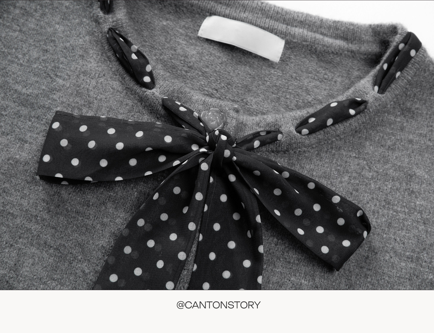 Cantonstory Polka Dot Silk Scarf Crew Neck Knitted Cardigan Sweater