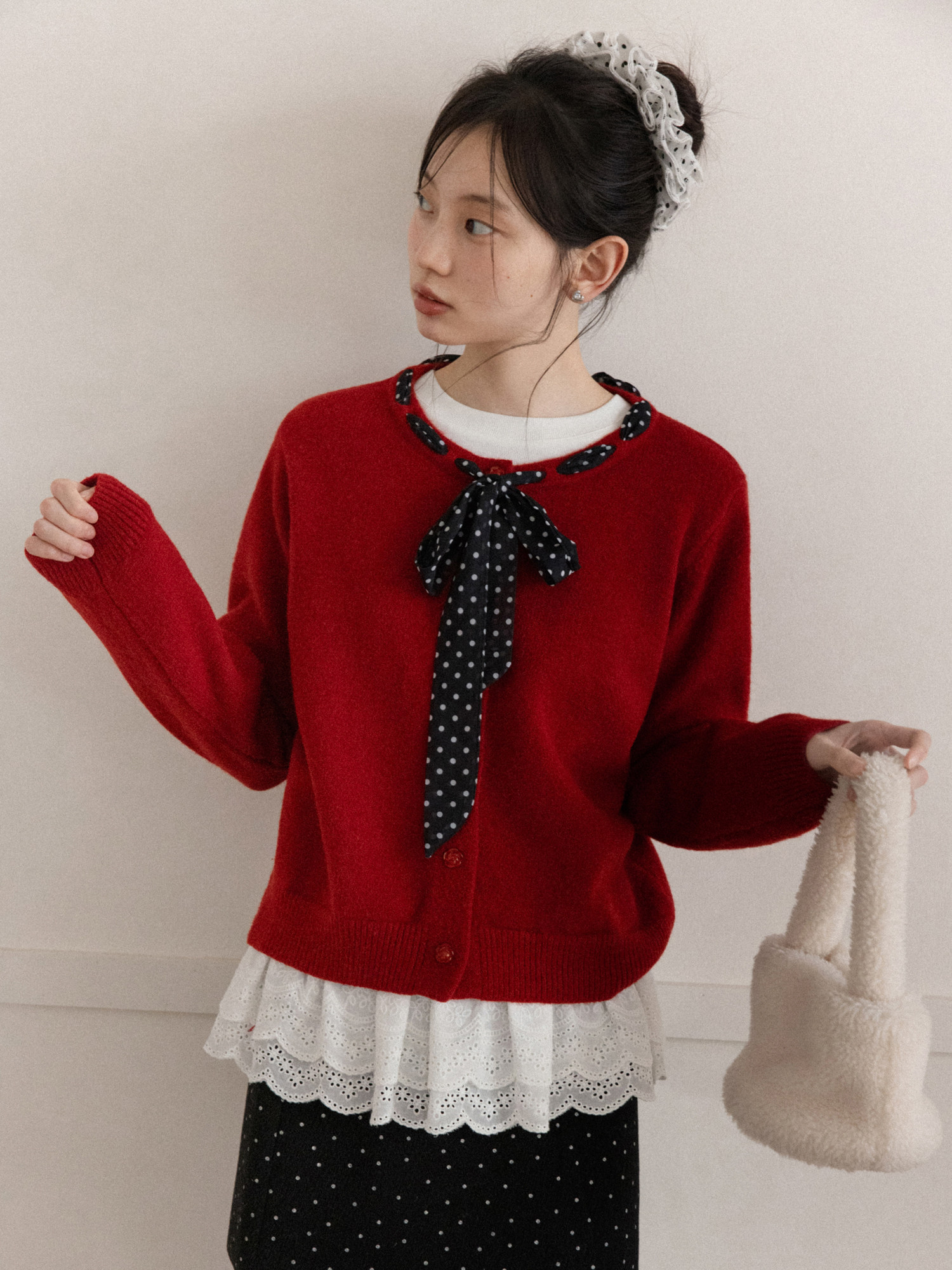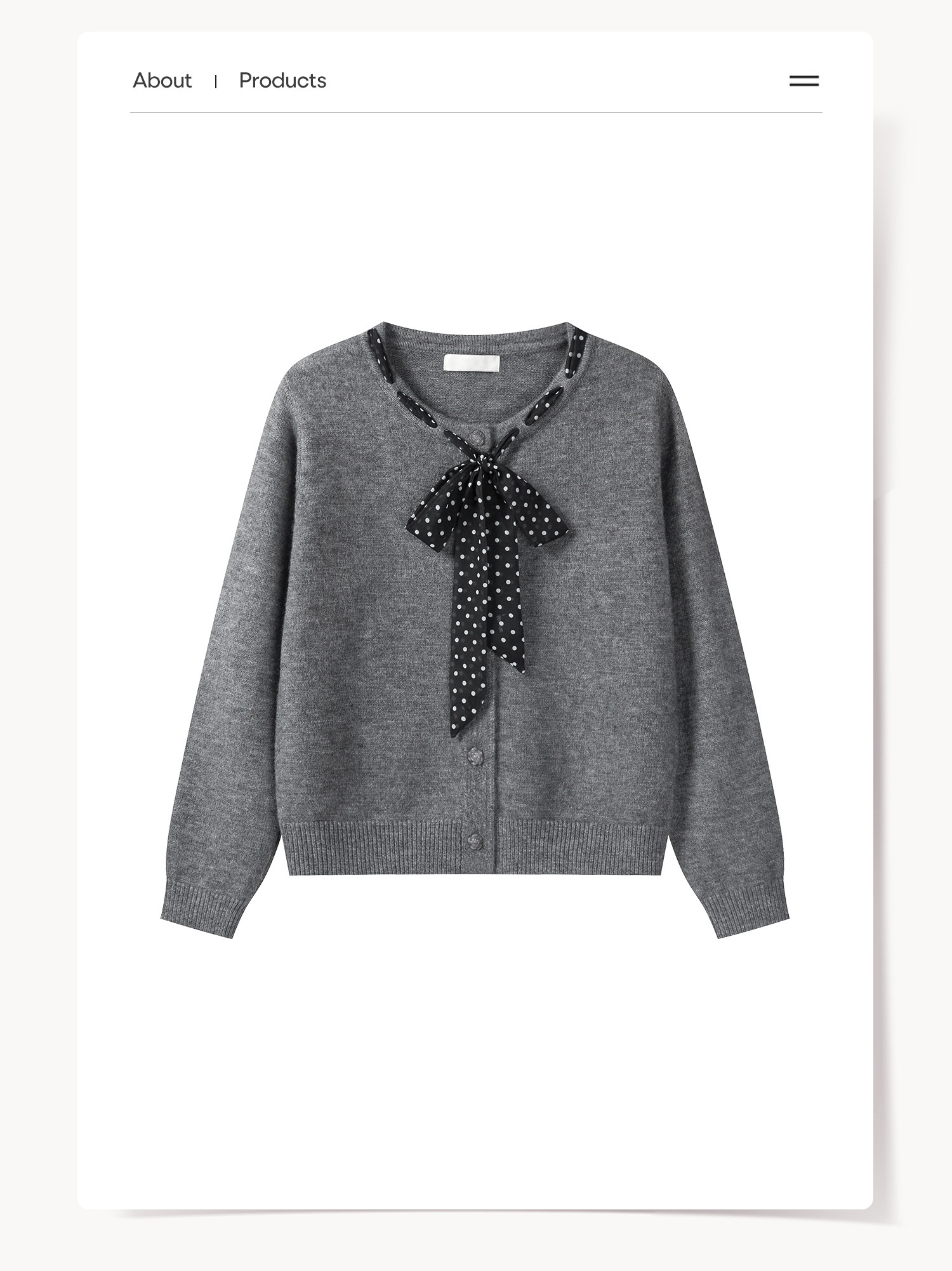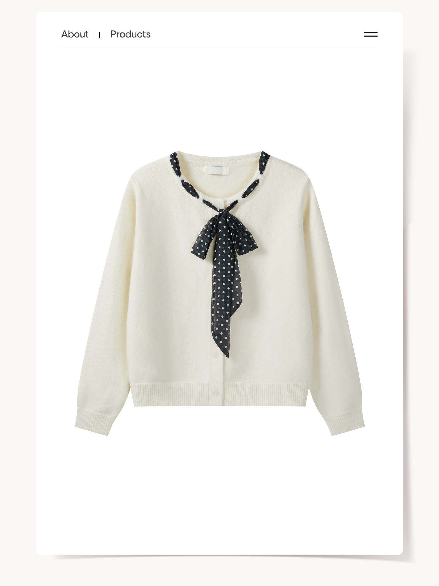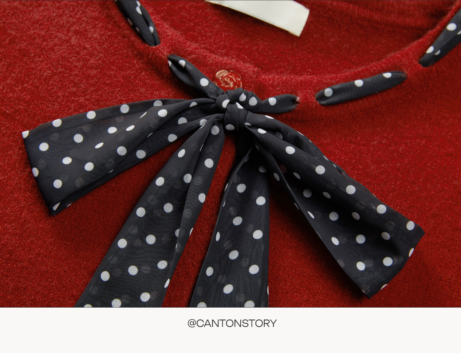 Cantonstory Polka Dot Silk Scarf Crew Neck Knitted Cardigan Sweater