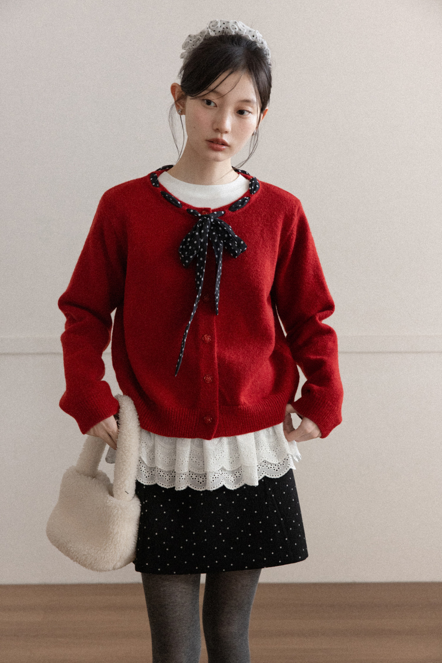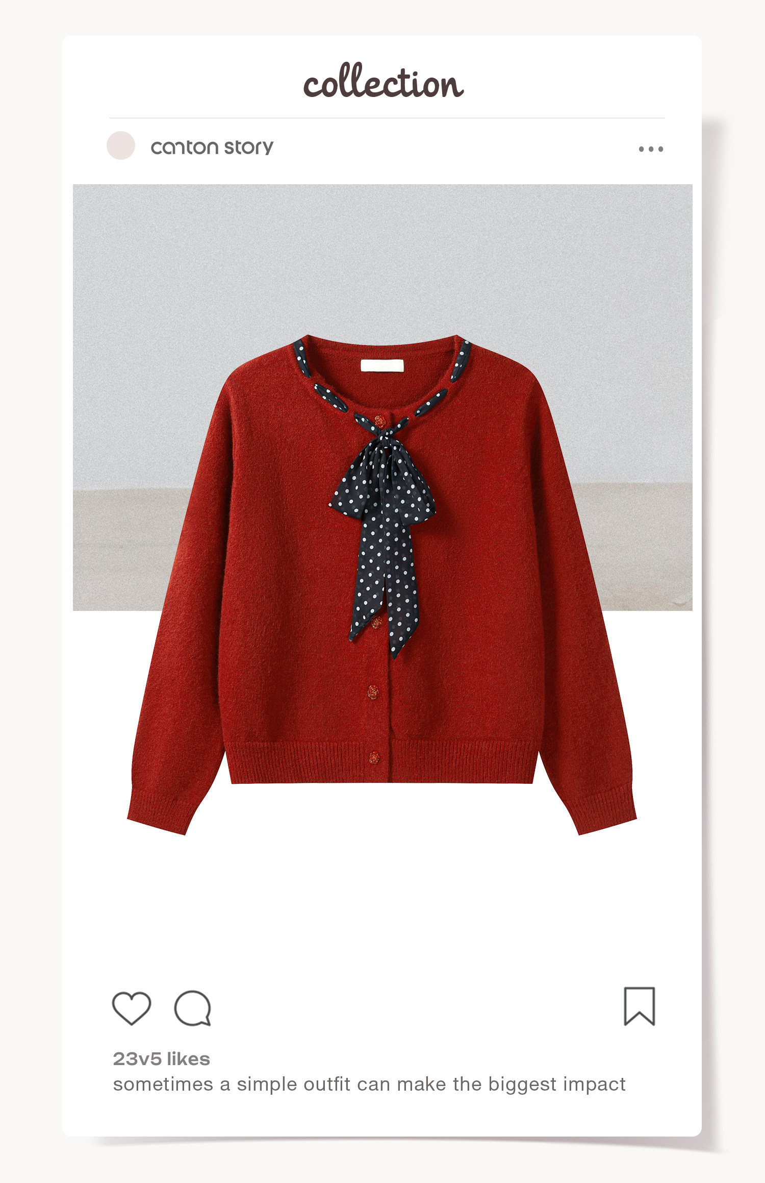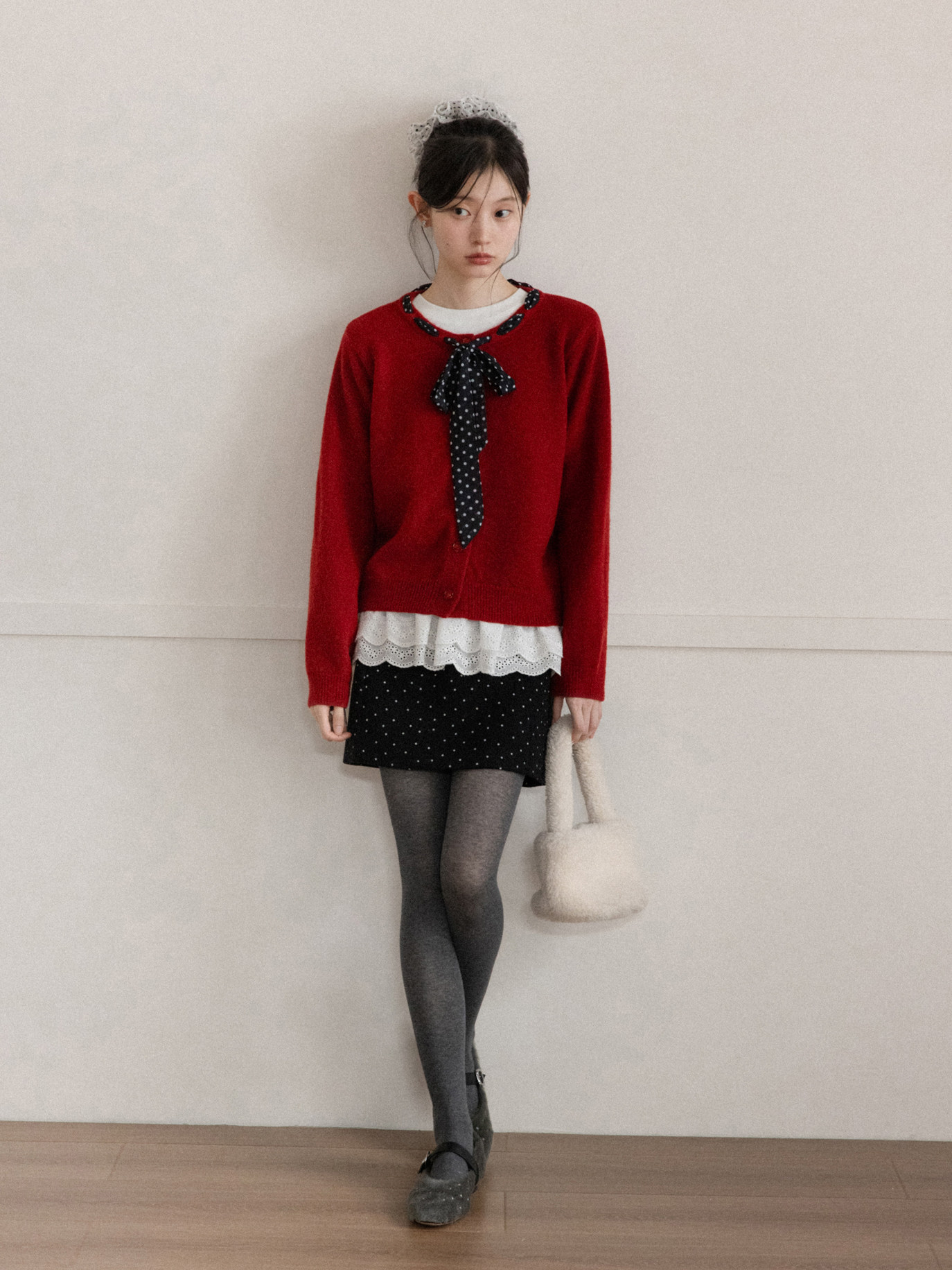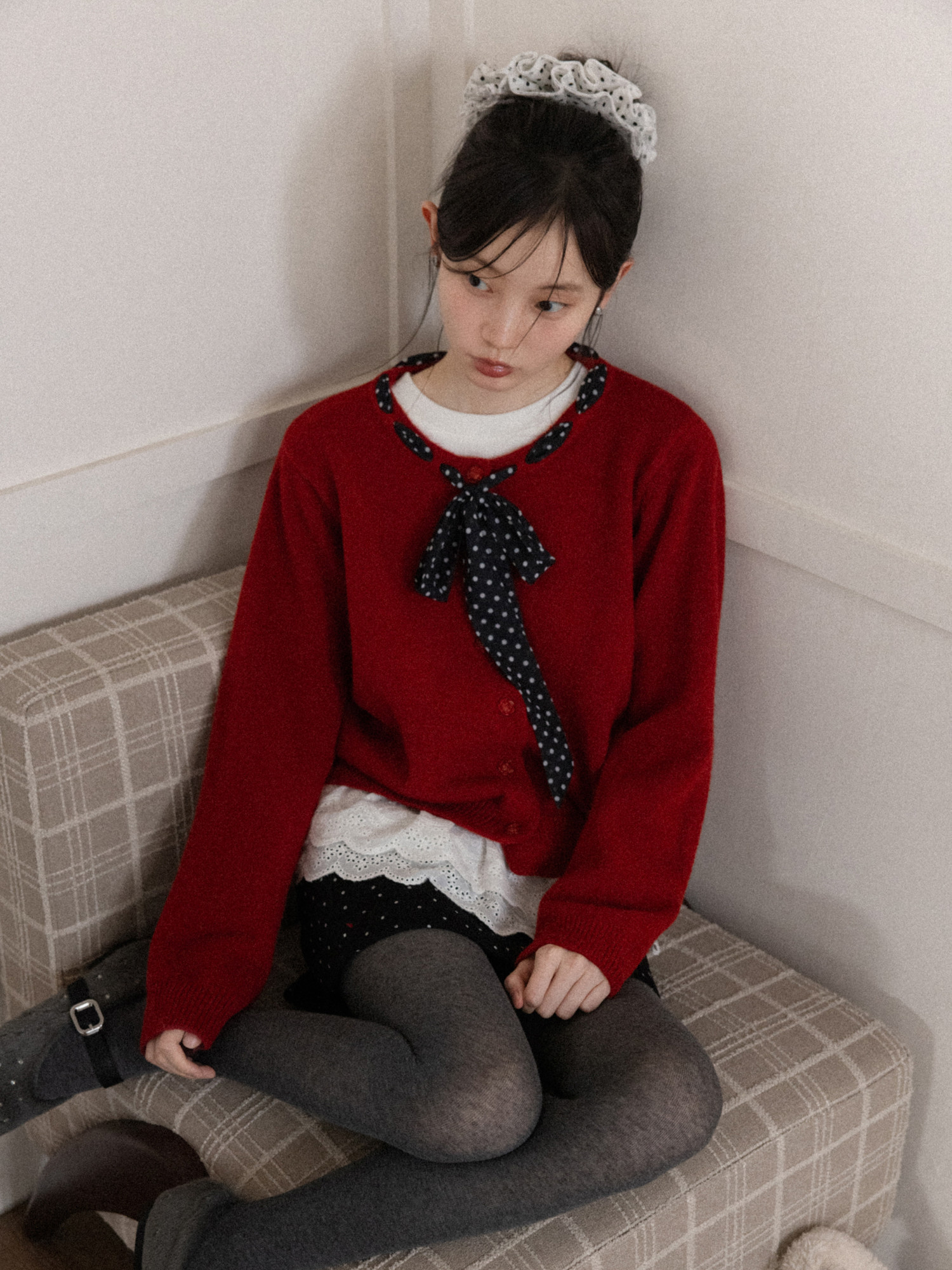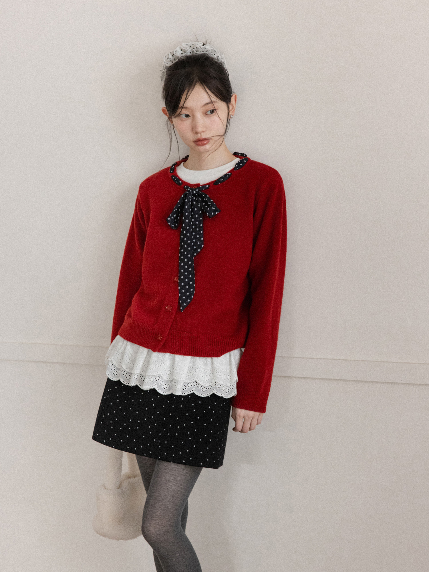 Cantonstory Polka Dot Silk Scarf Crew Neck Knitted Cardigan Sweater