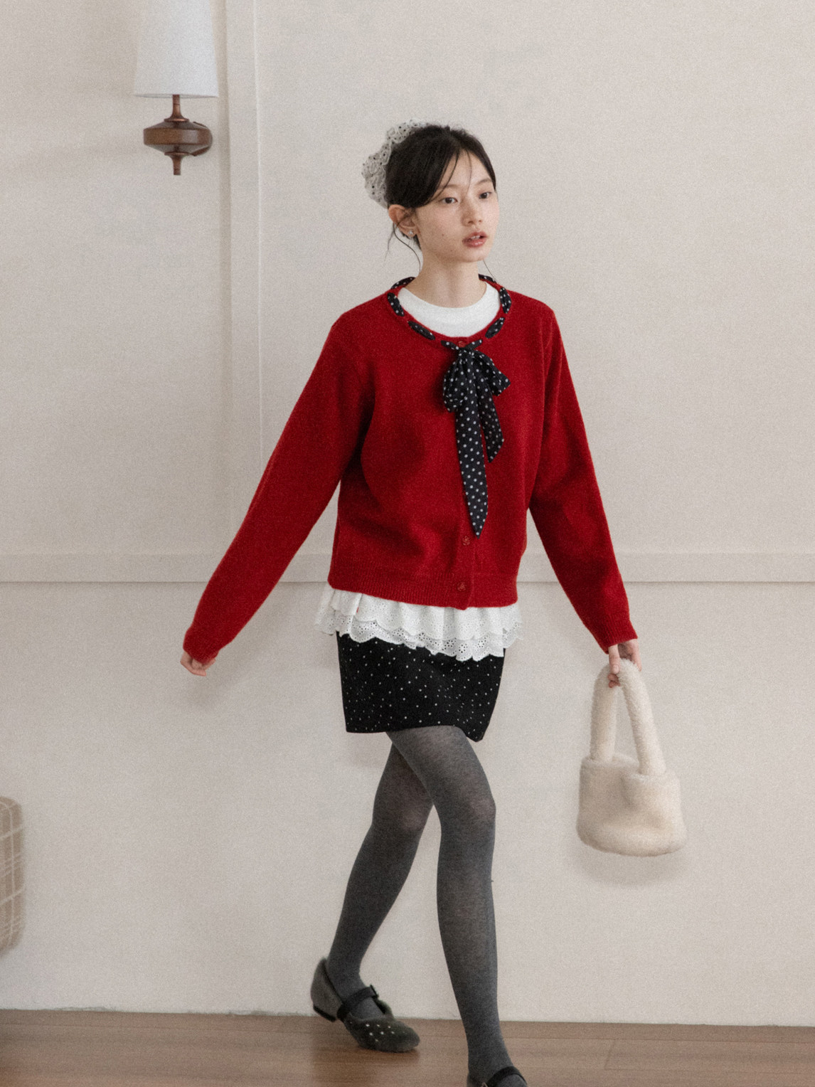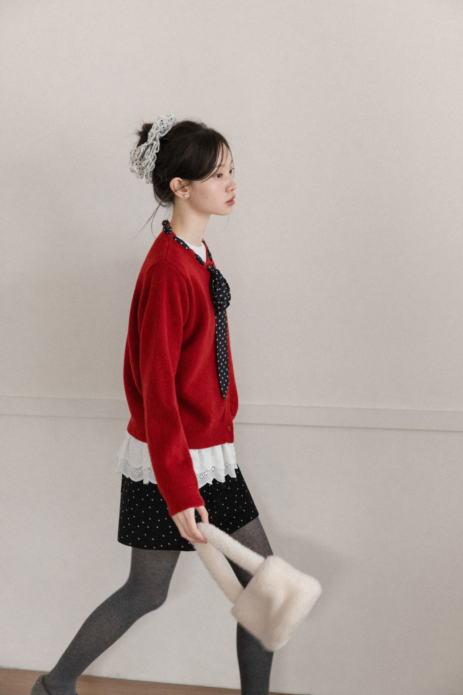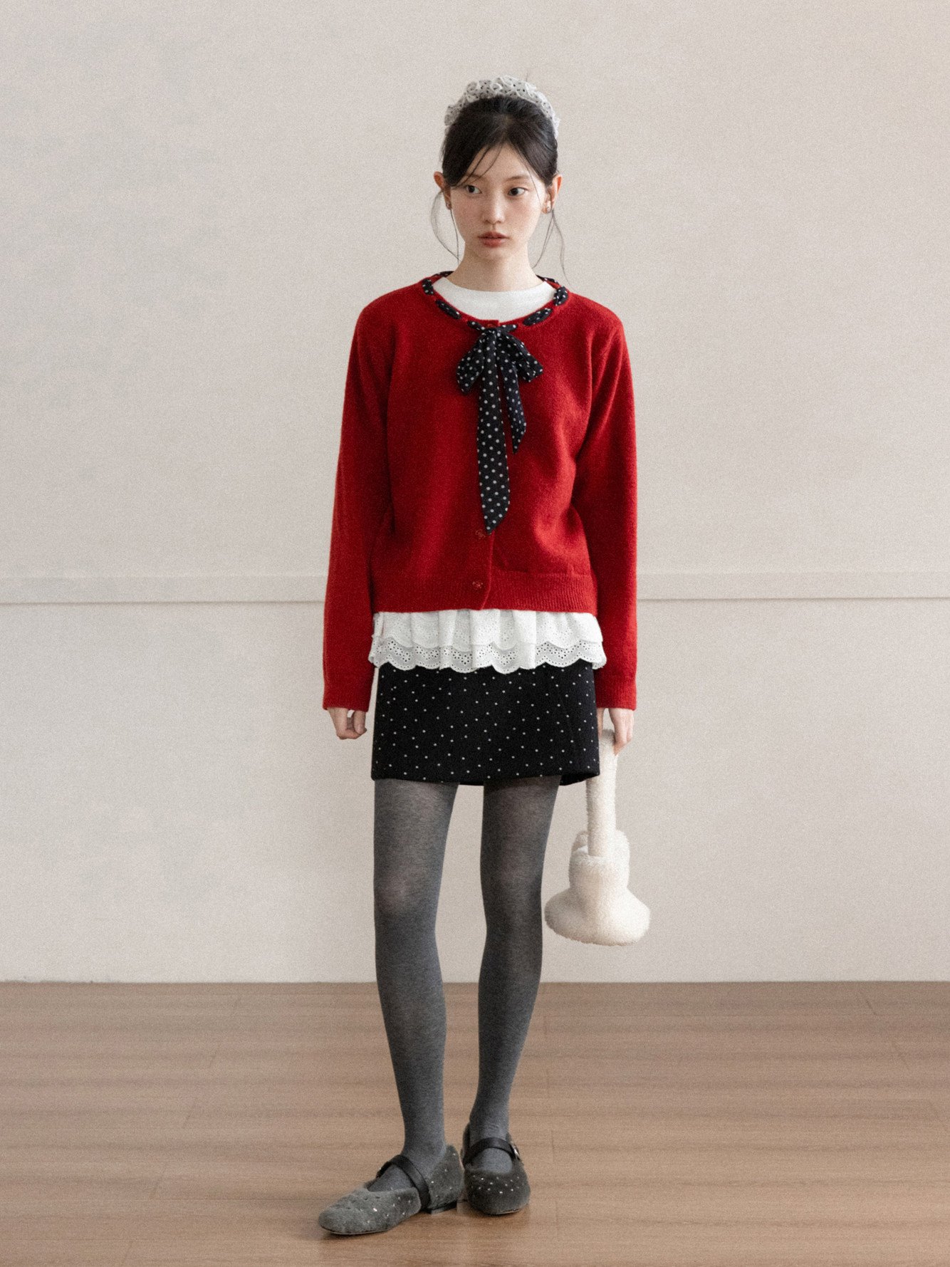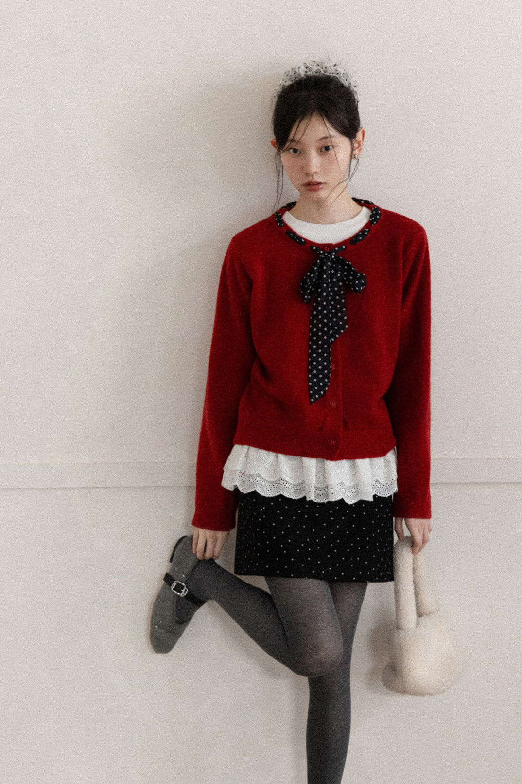 Cantonstory Polka Dot Silk Scarf Crew Neck Knitted Cardigan Sweater