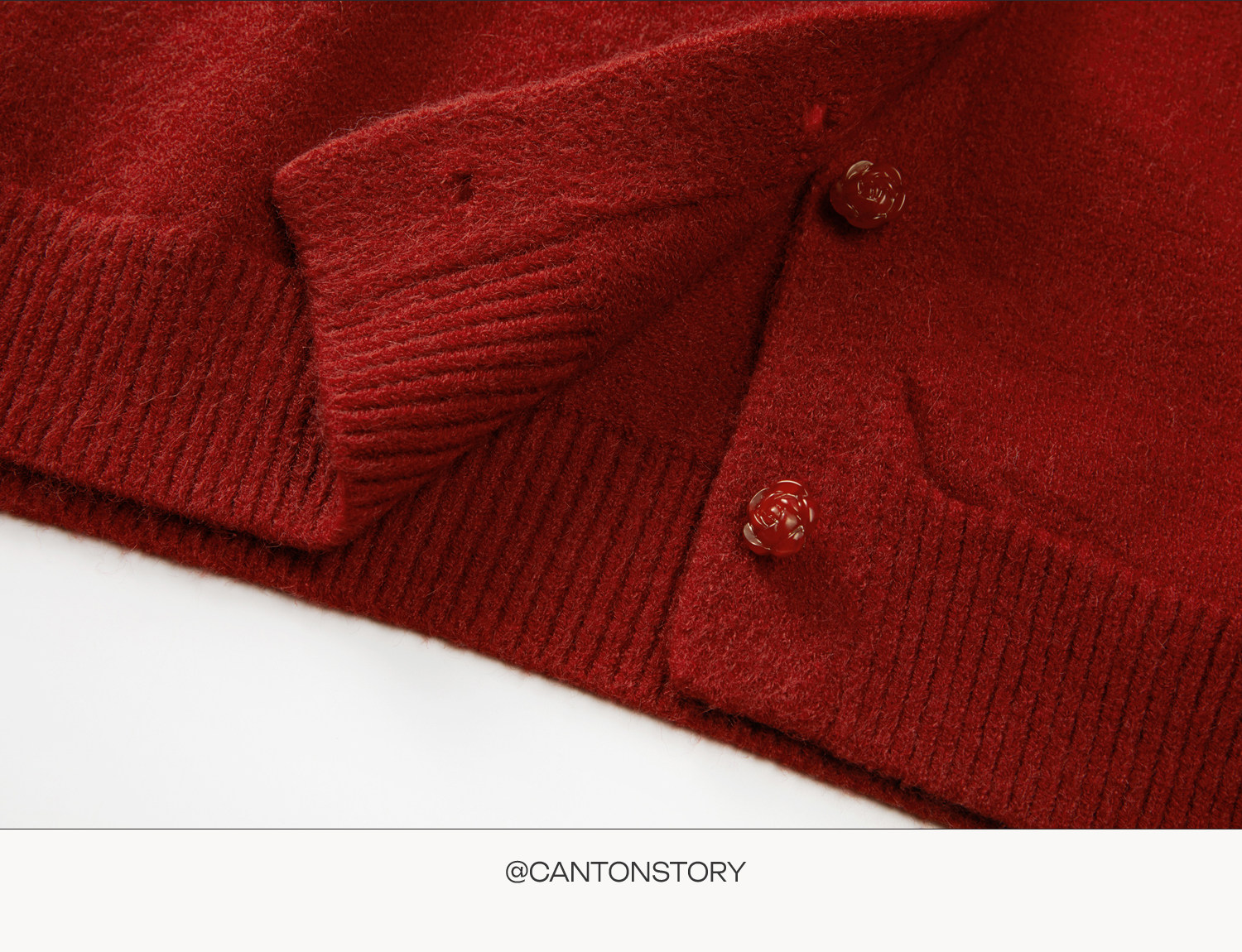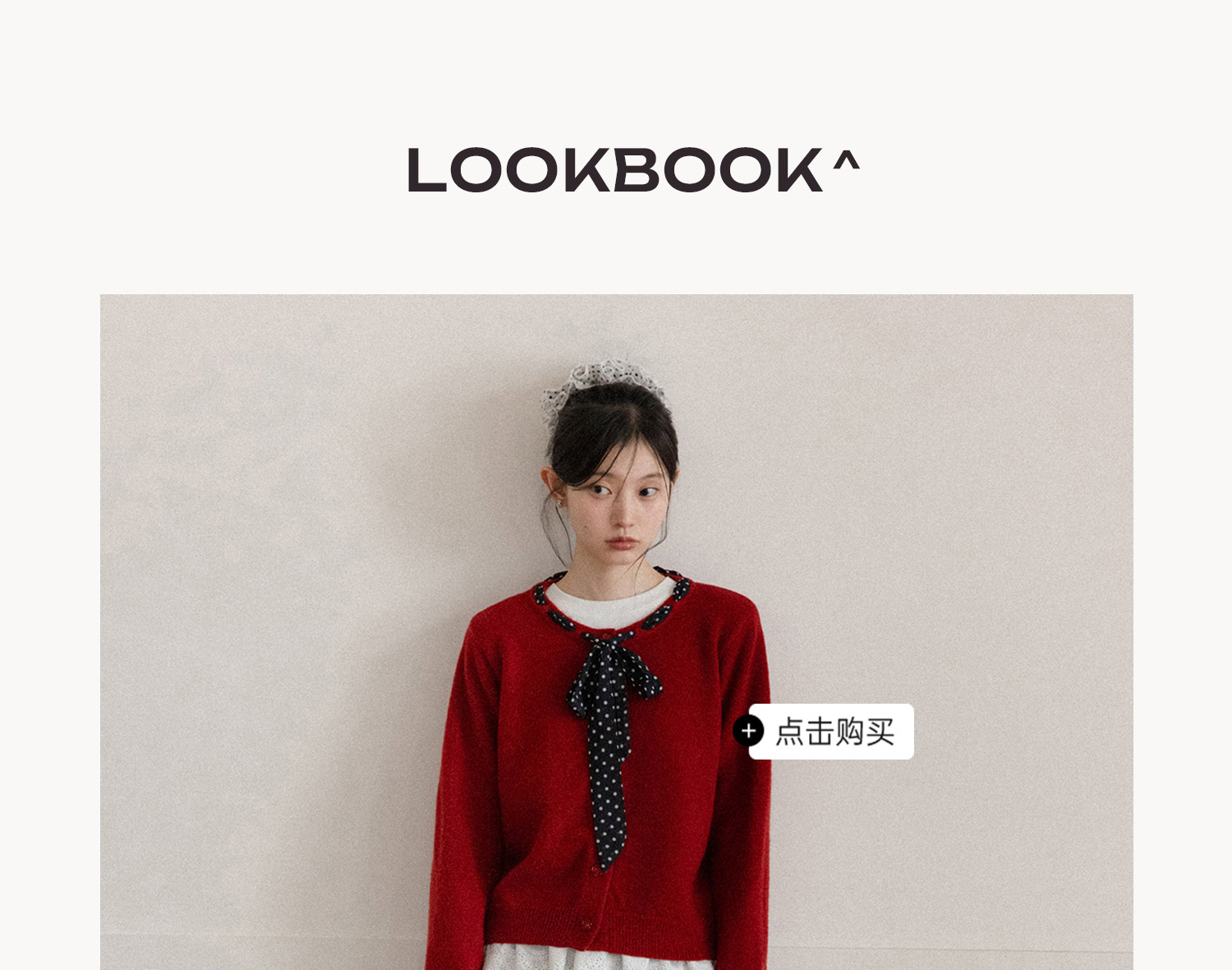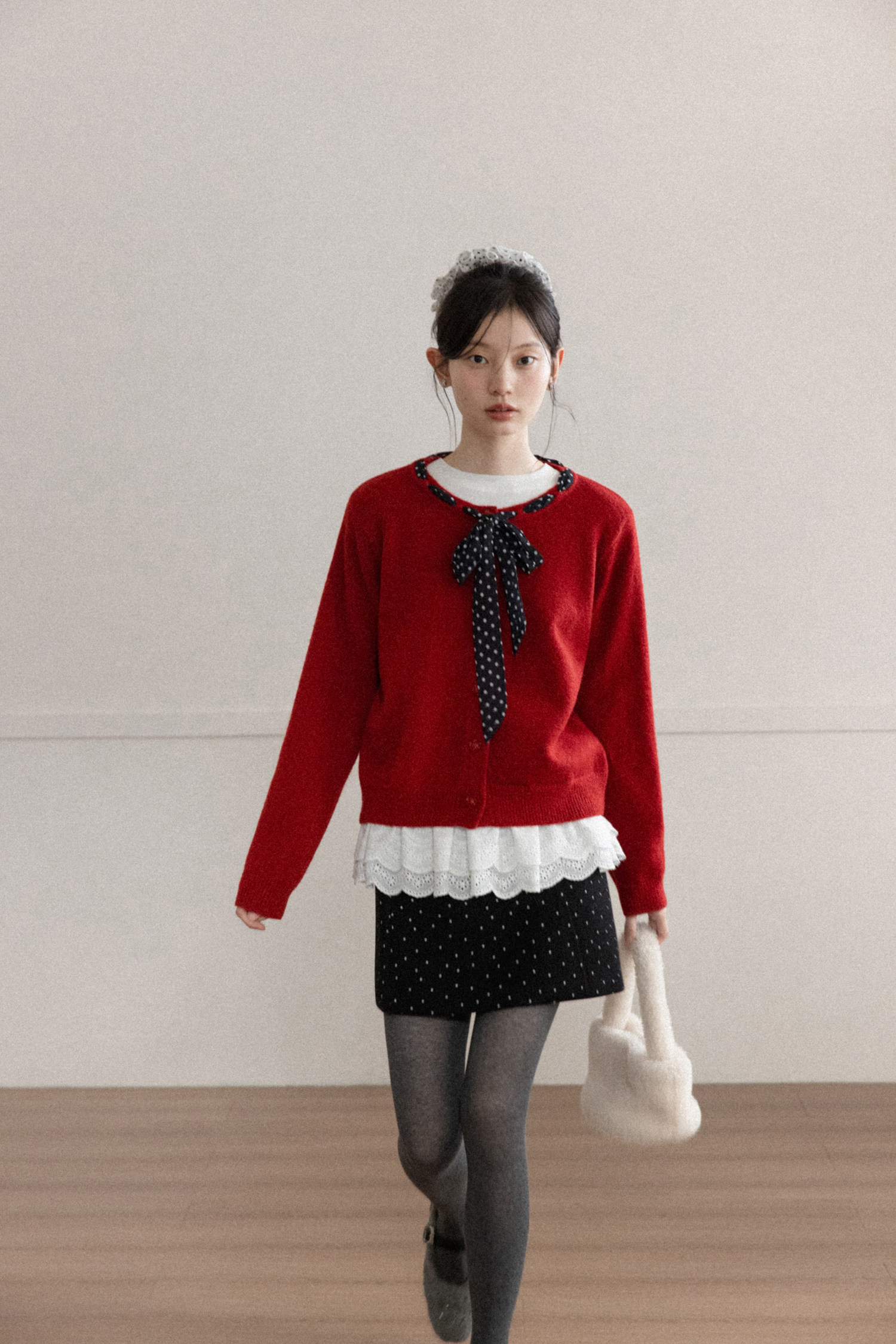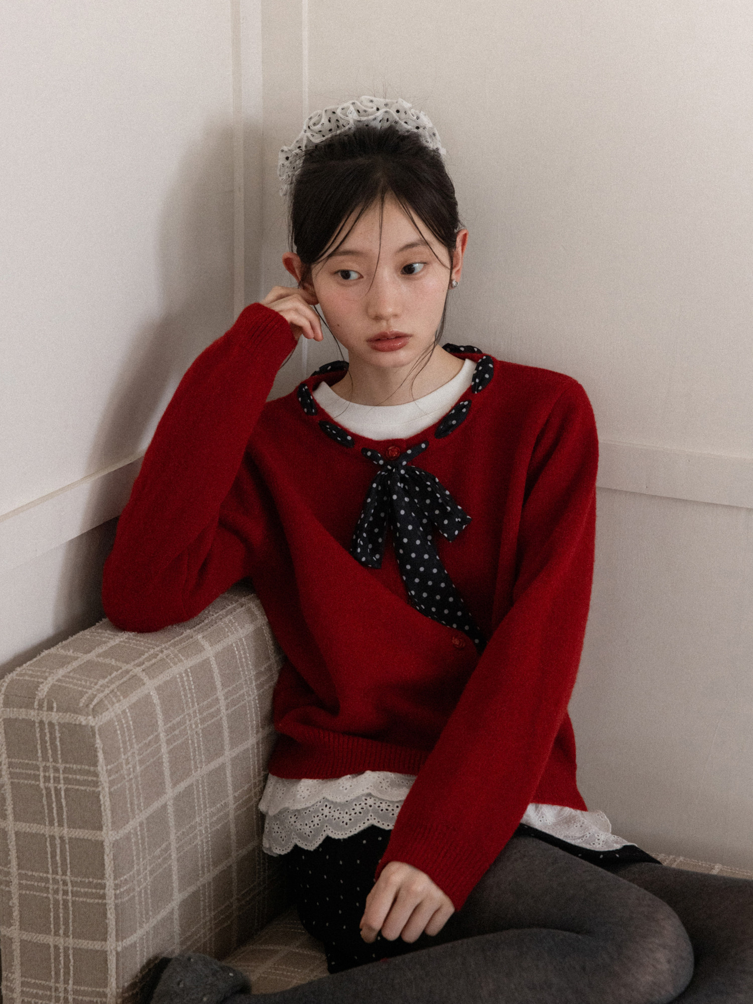 Cantonstory Polka Dot Silk Scarf Crew Neck Knitted Cardigan Sweater