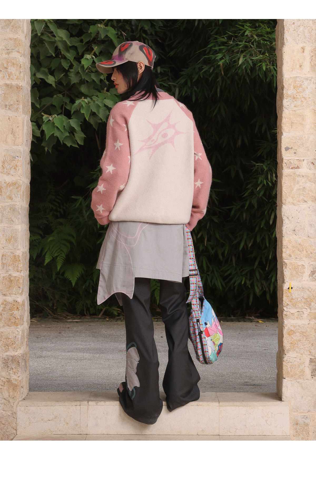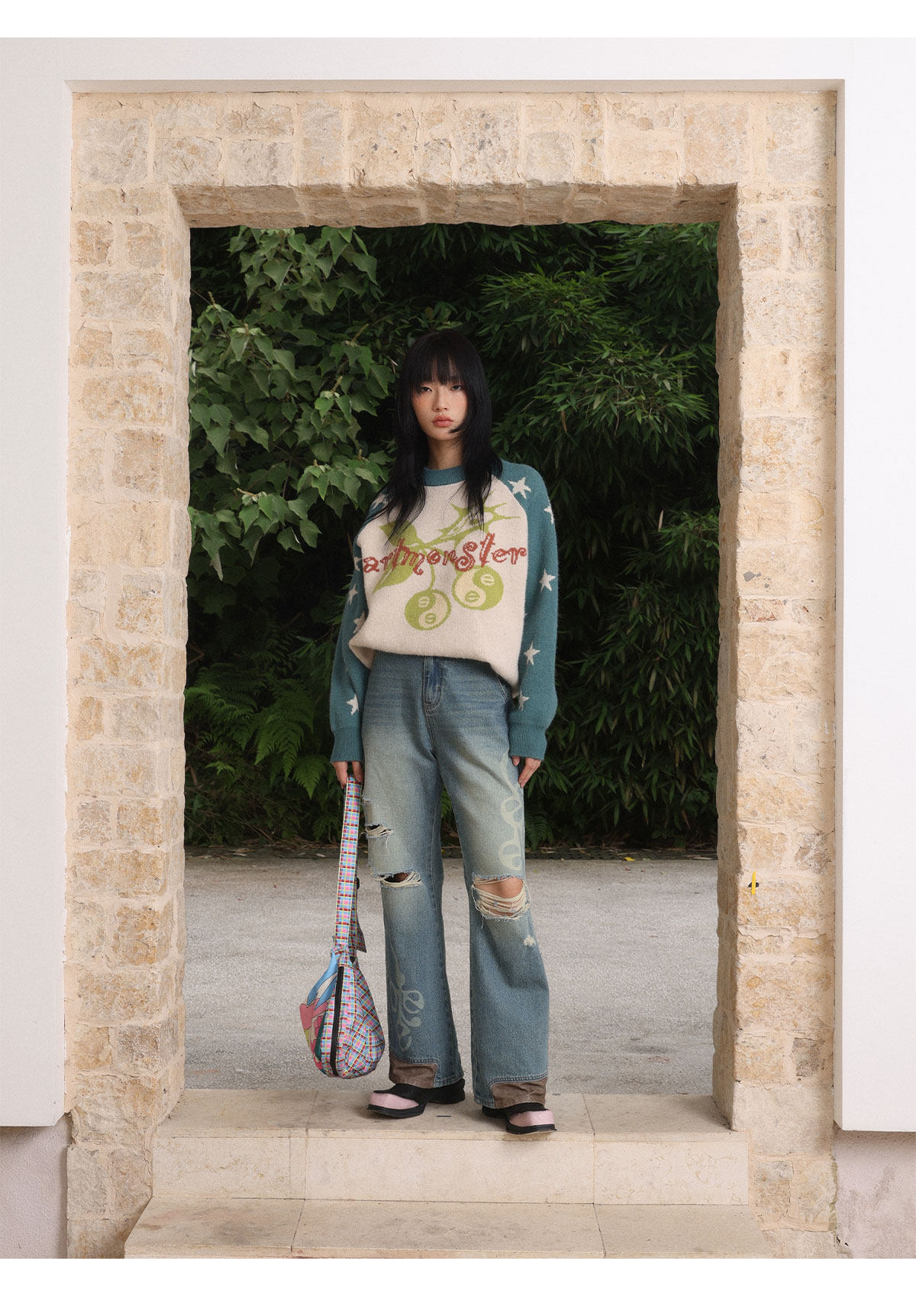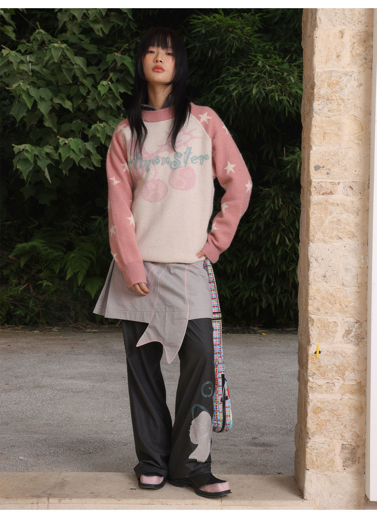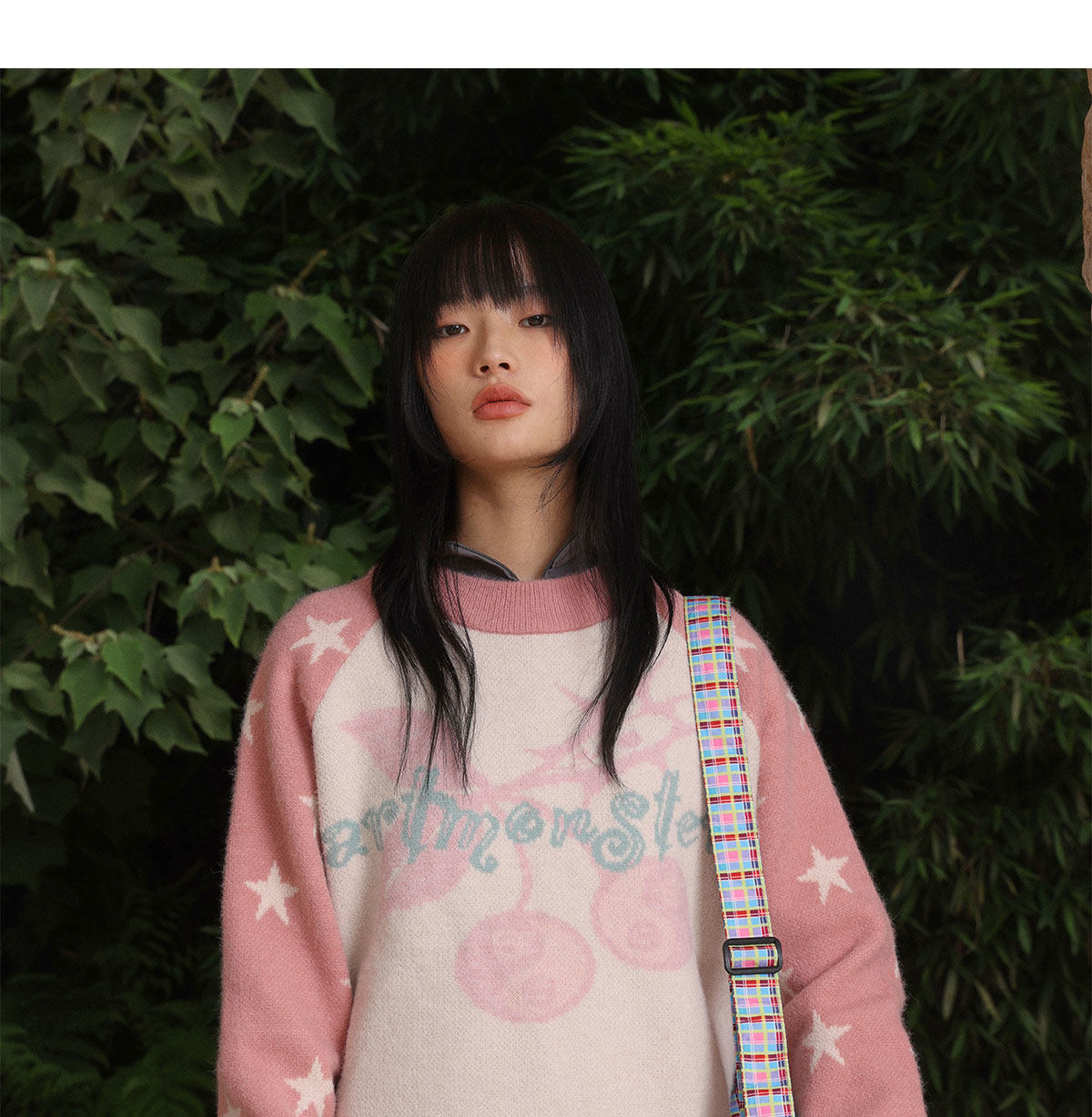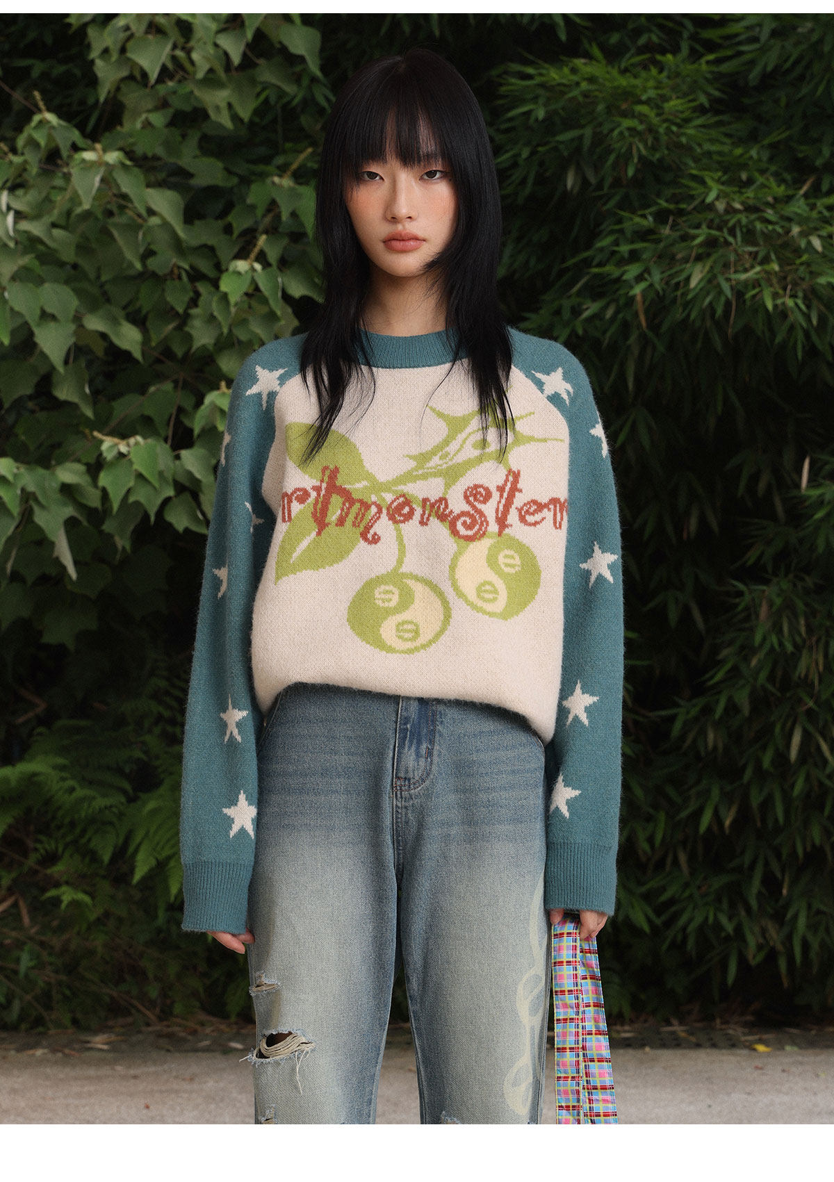 EeeeArtmonster Cherry Print Color Matching Heavy Crew Neck Sweater