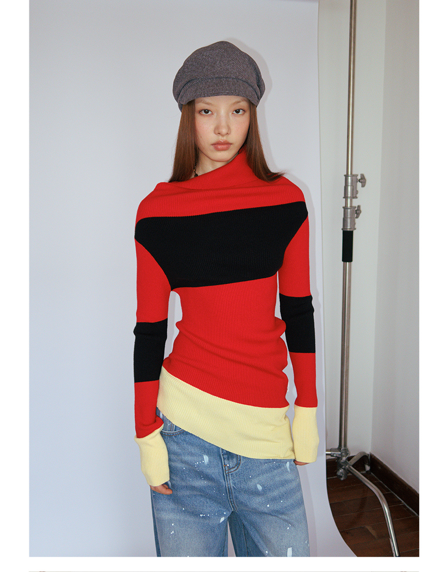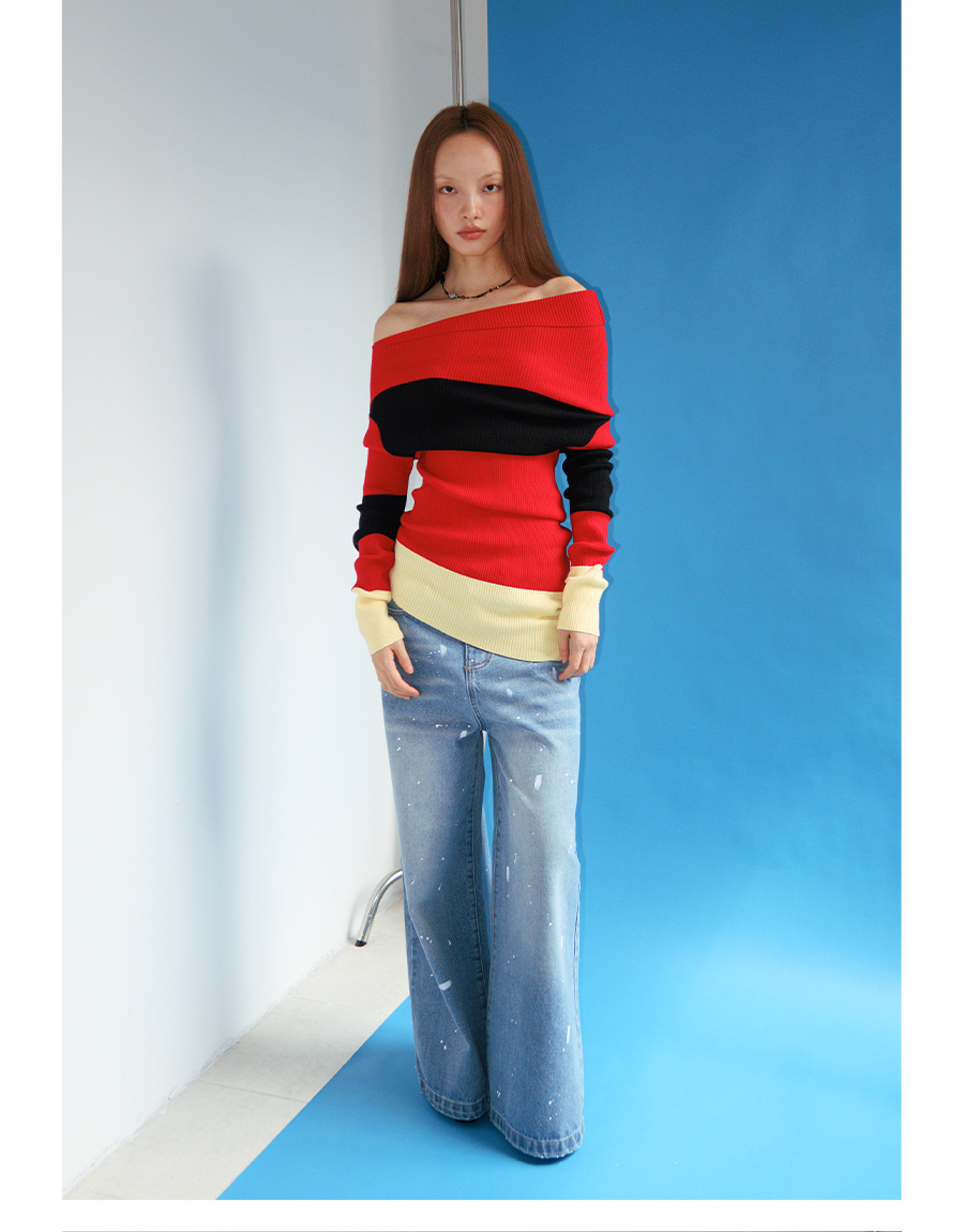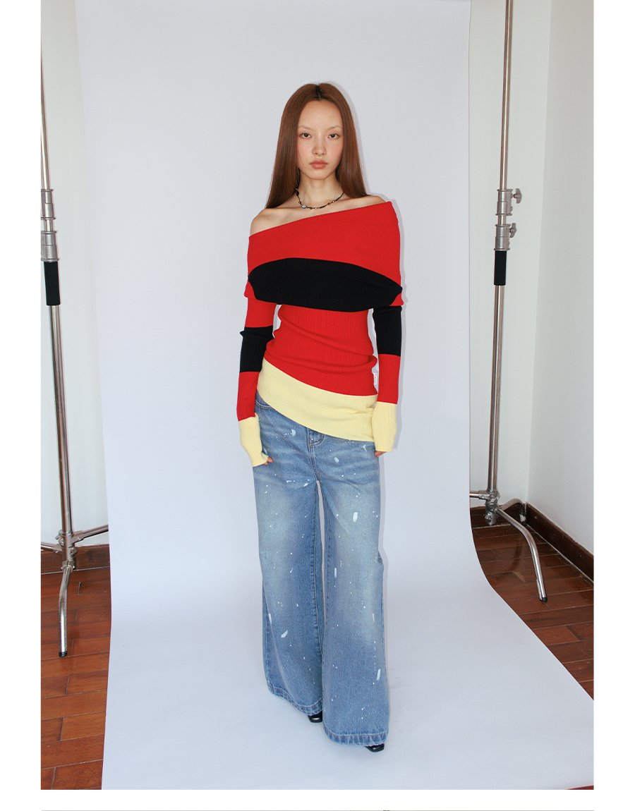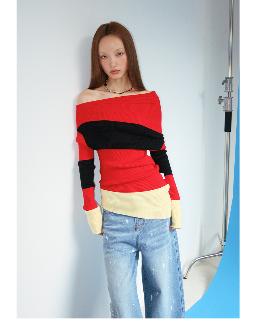 FUNKYFUN Contrasting Color Retro Spliced Slanted Shoulder Knitted Sweater