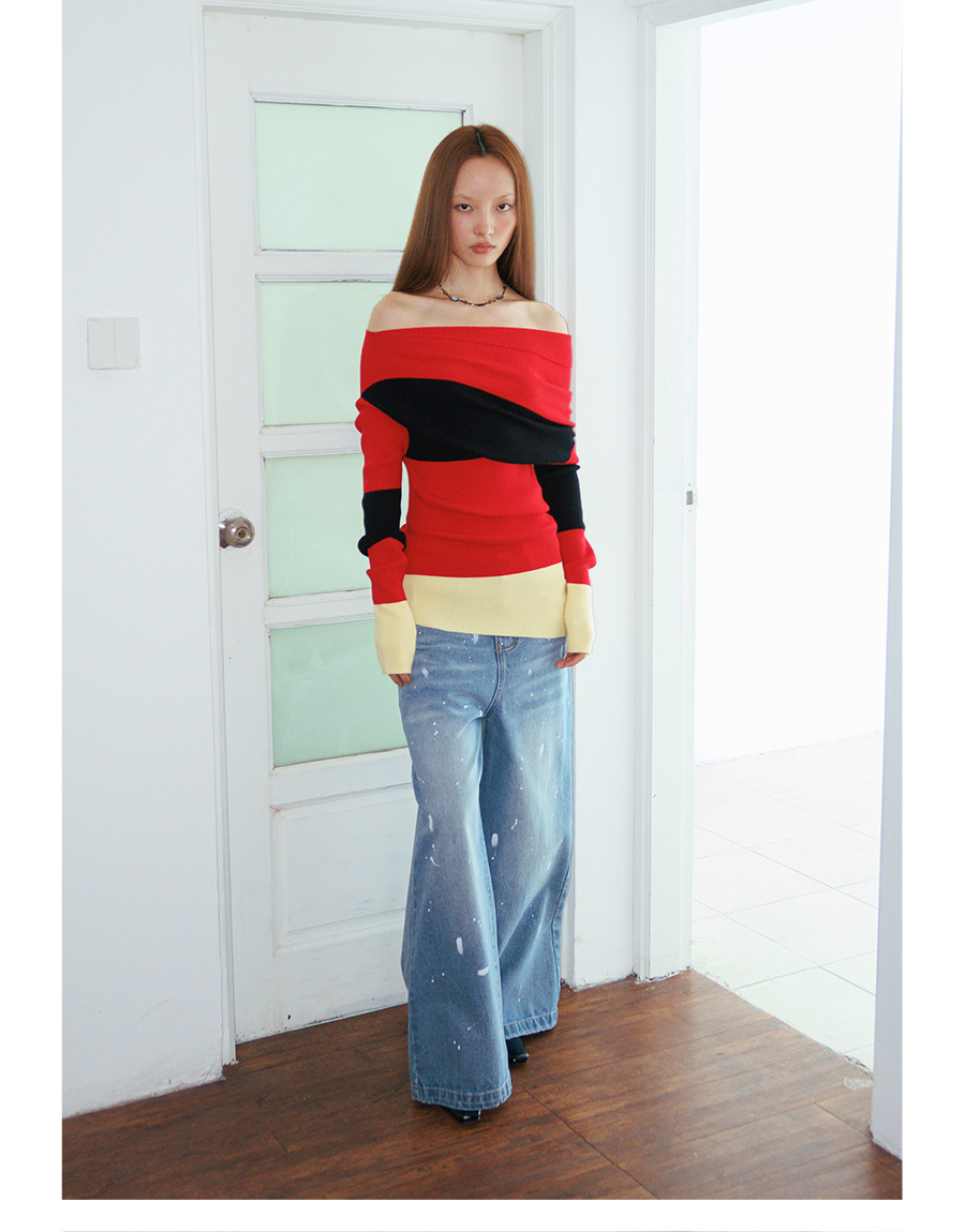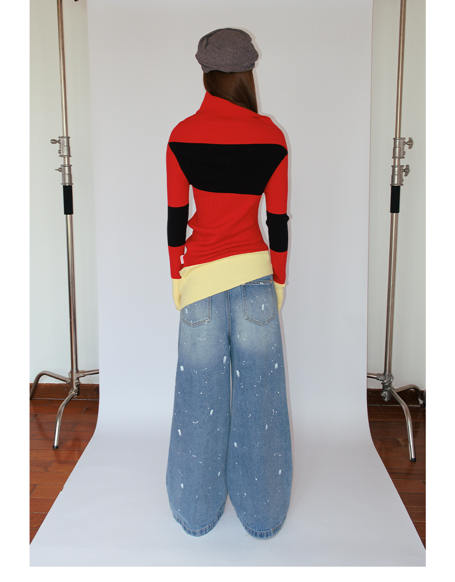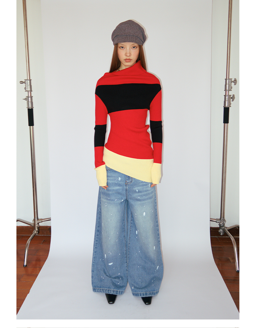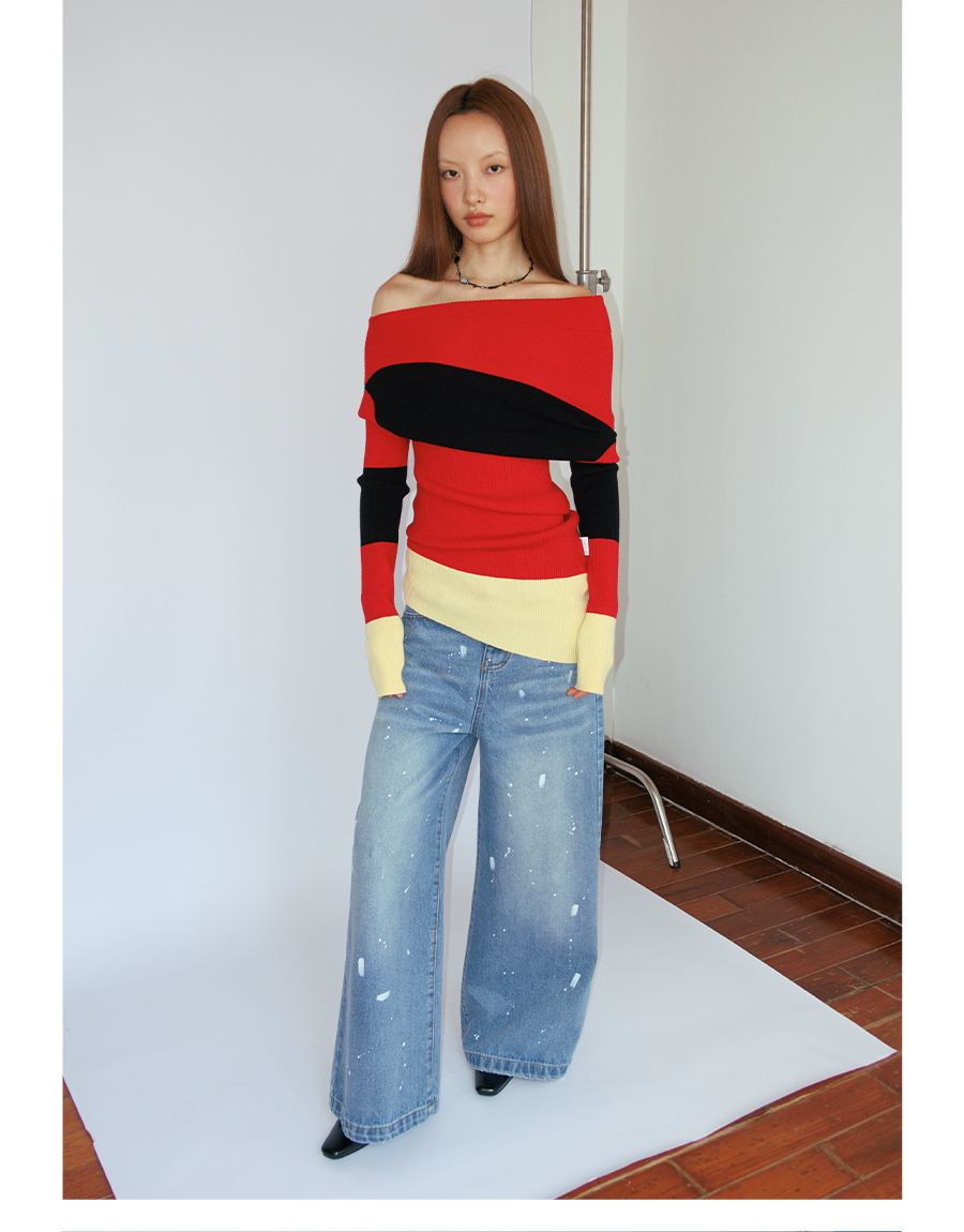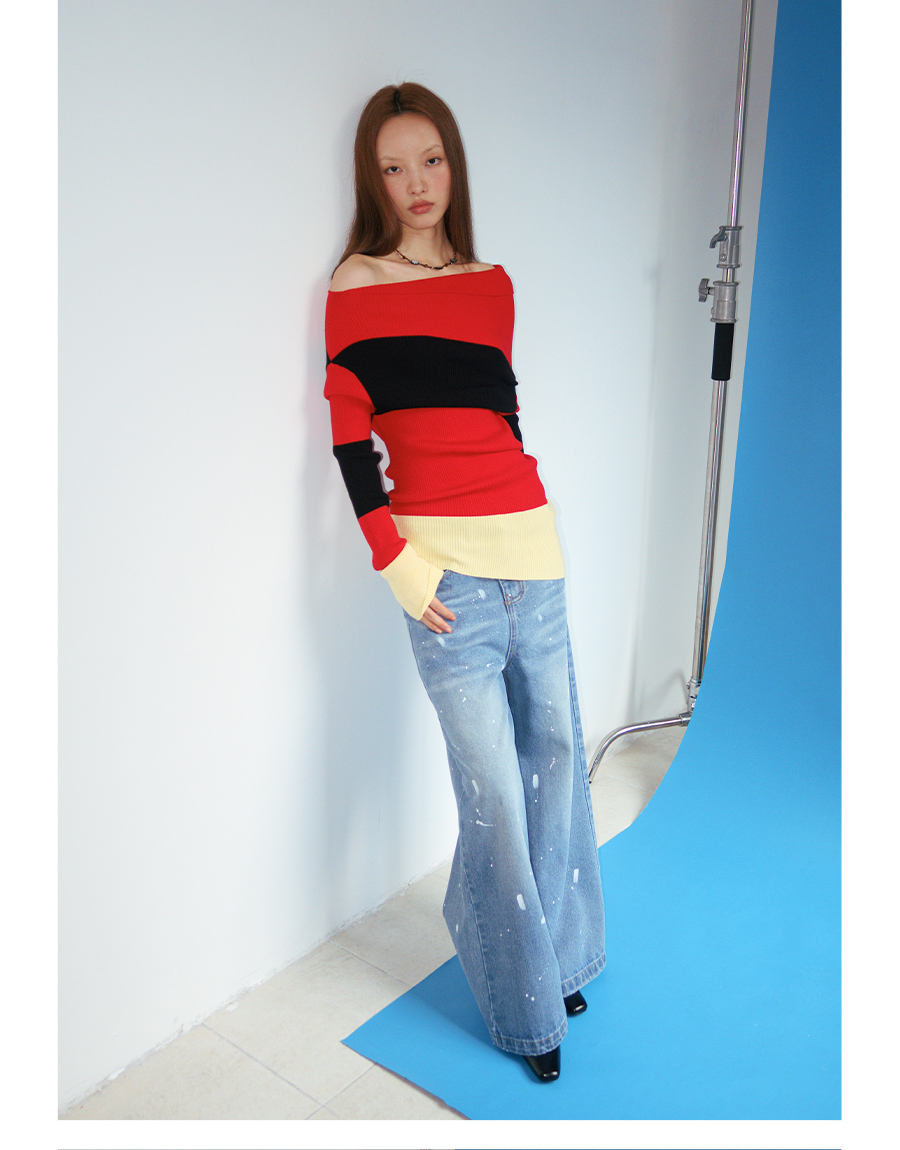 FUNKYFUN Contrasting Color Retro Spliced Slanted Shoulder Knitted Sweater