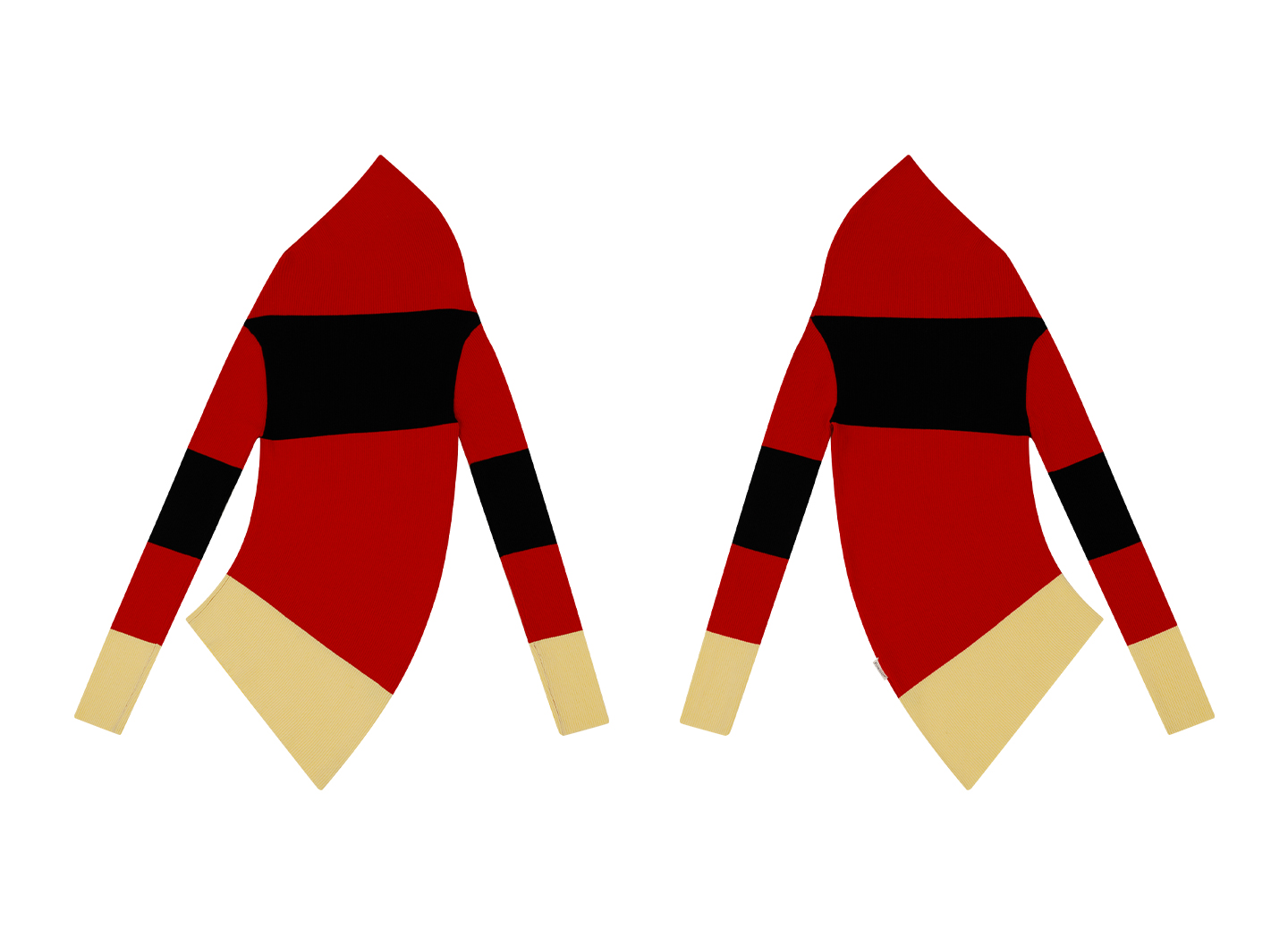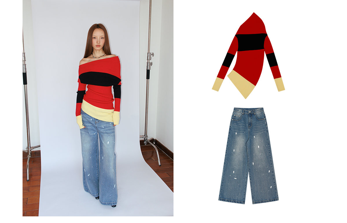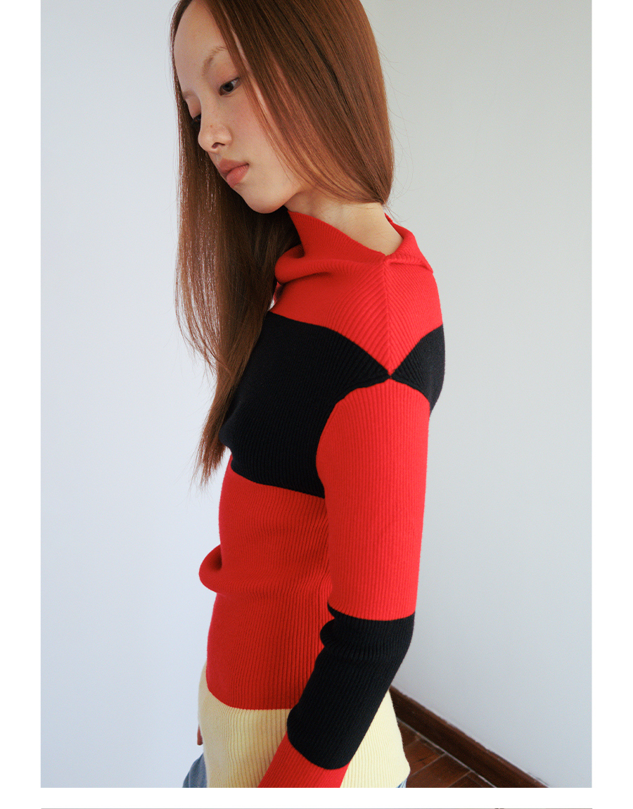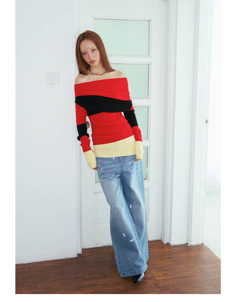 FUNKYFUN Contrasting Color Retro Spliced Slanted Shoulder Knitted Sweater