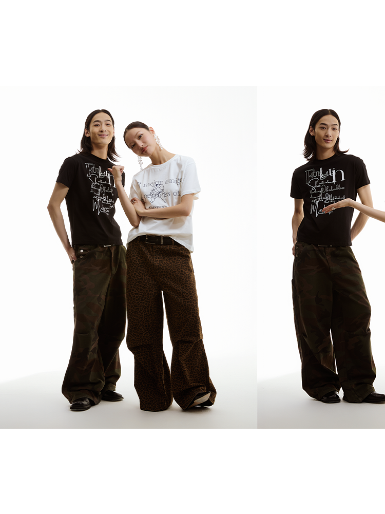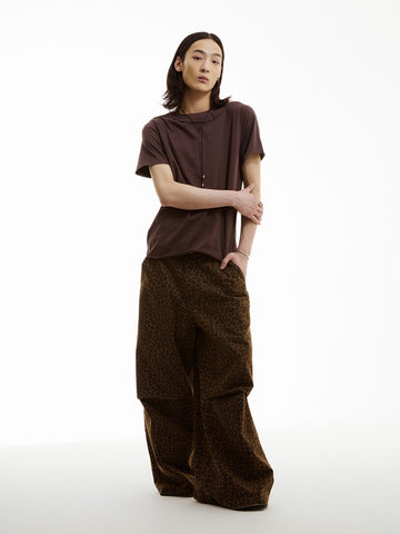 FUNKYFUN Leopard Print Knee Pleated Design Wide-leg Pants