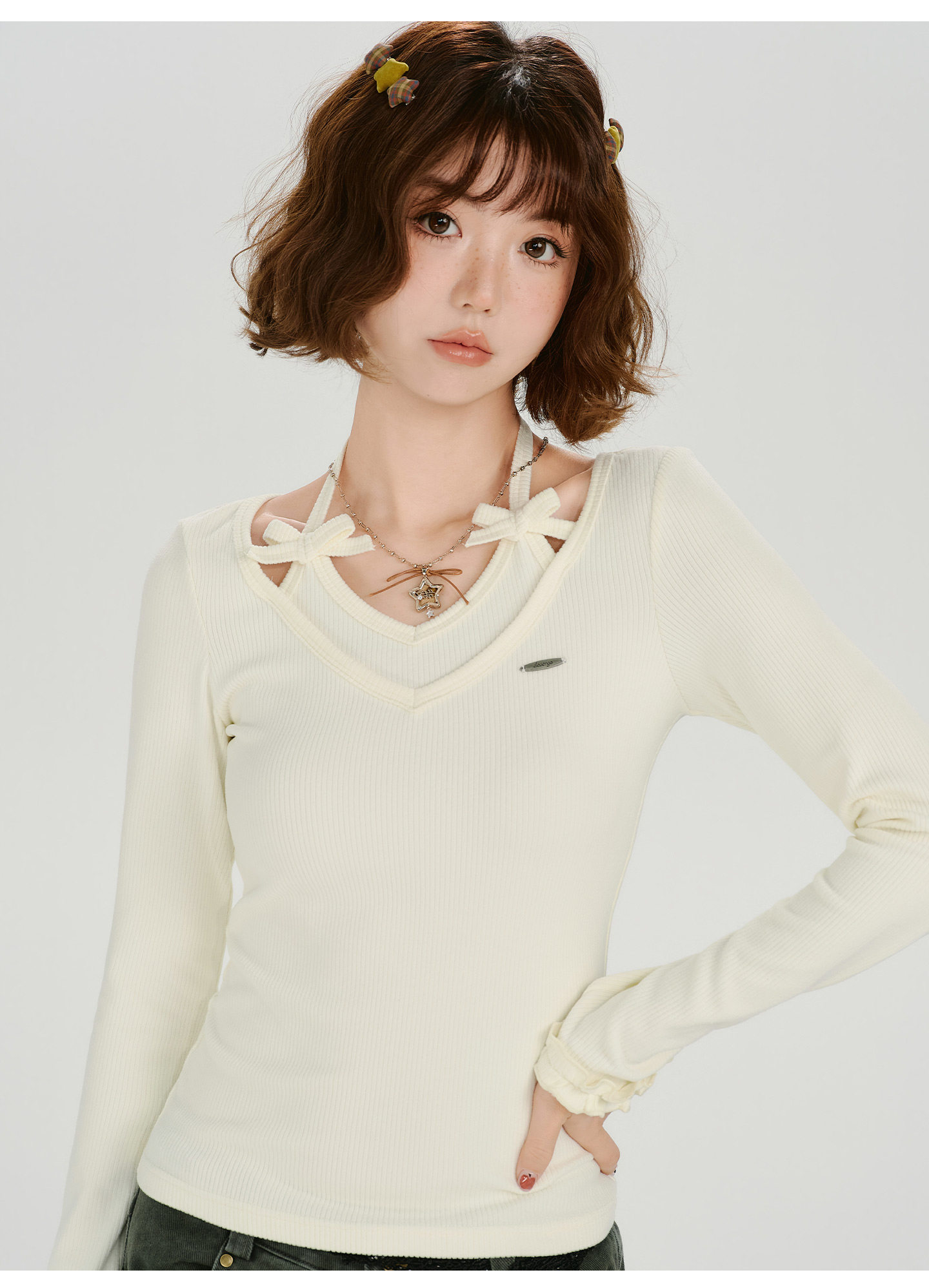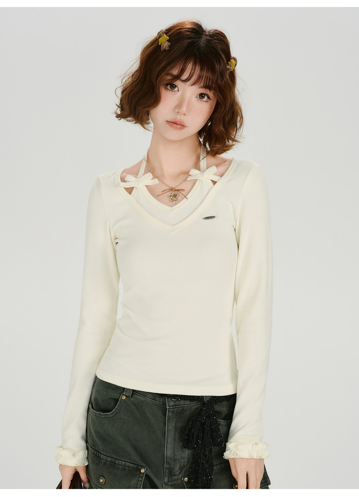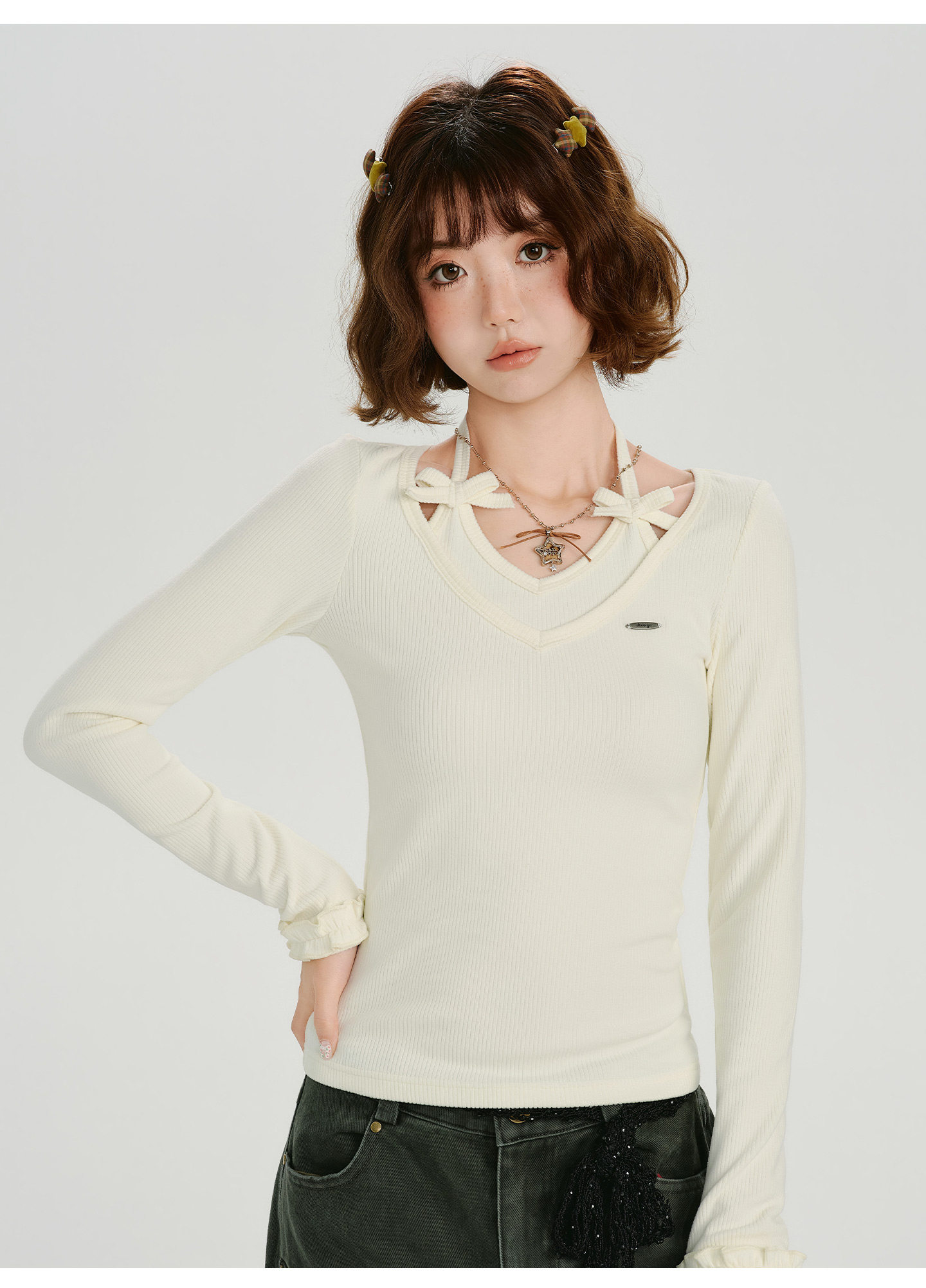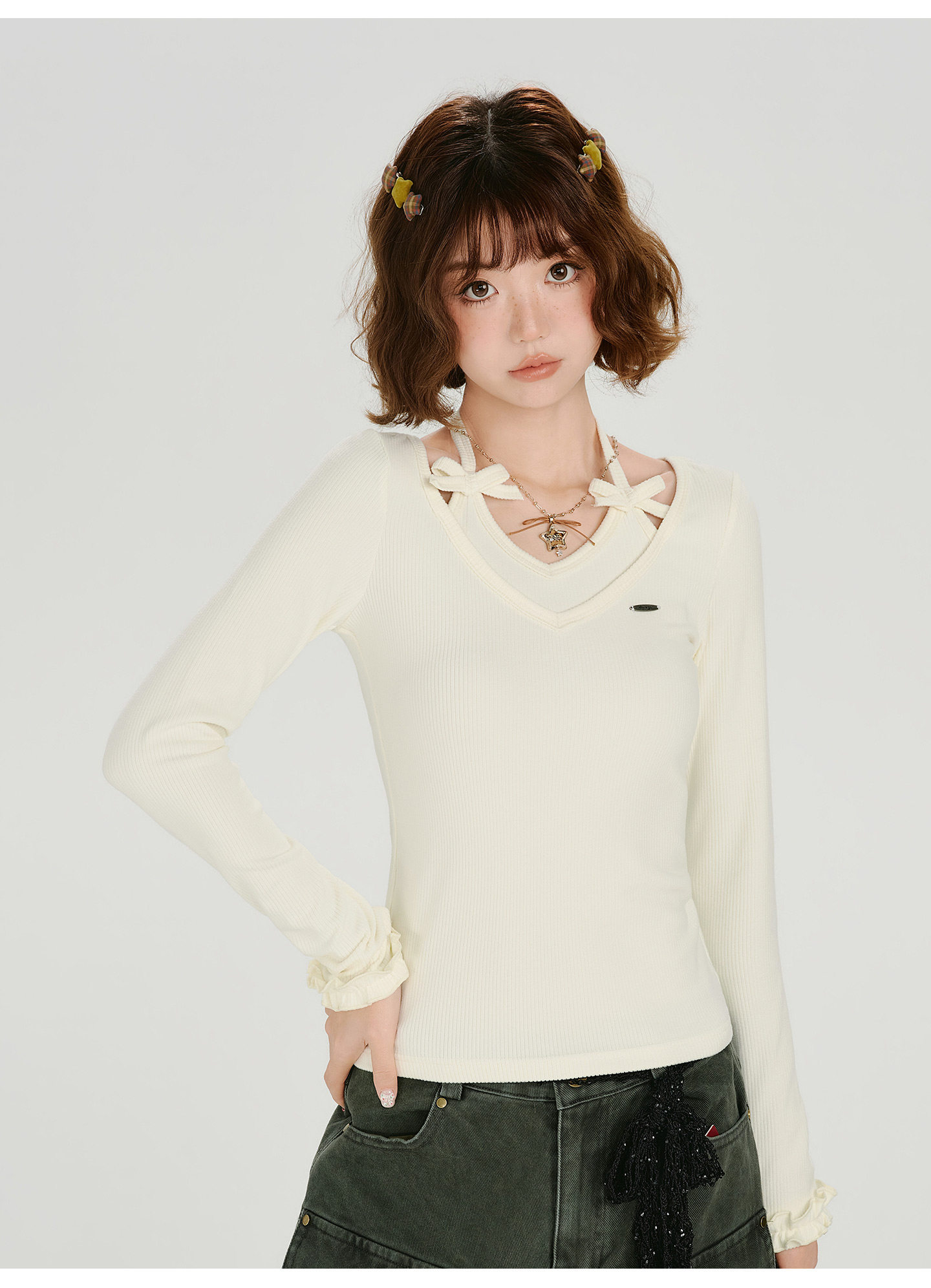 Girlyhalo Vintage Fake Two Piece Neck Slim Long Sleeve