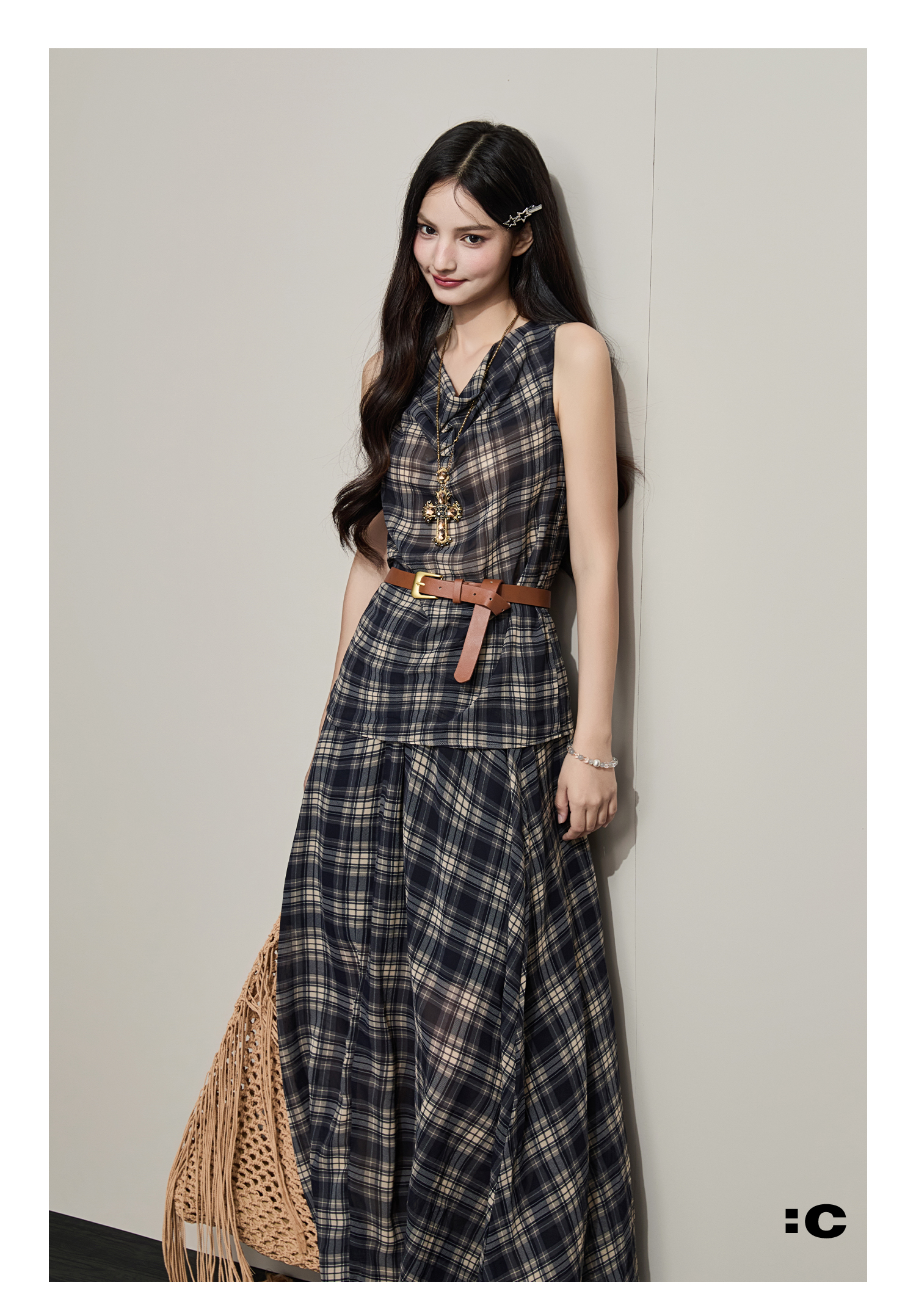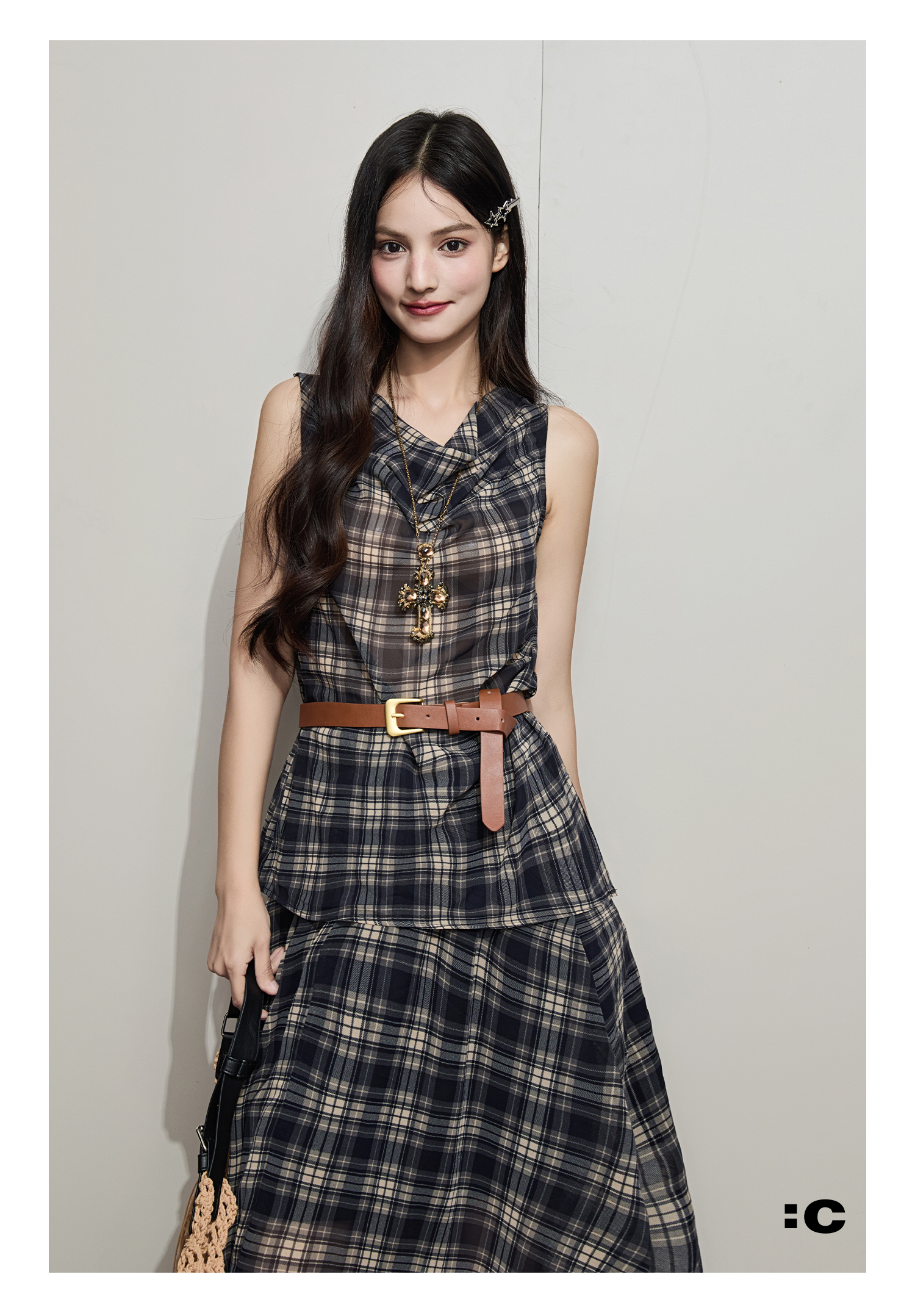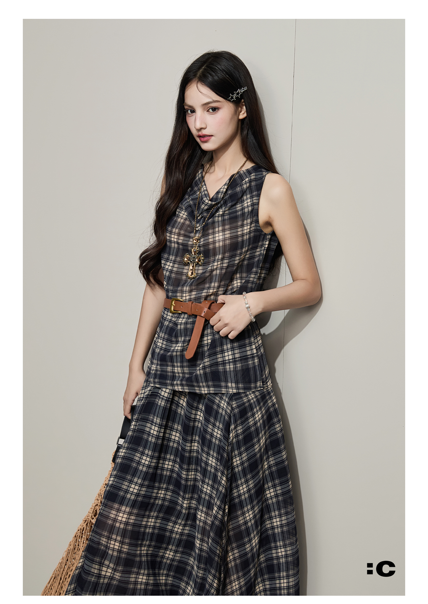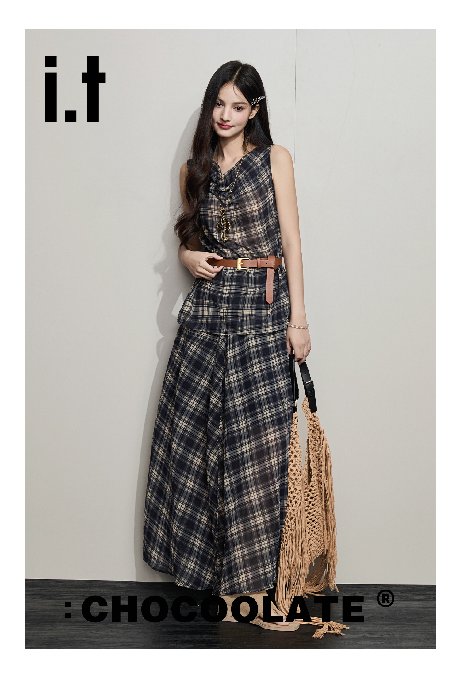 IT: CHOCOOLATE Check Neck Top High Waist Skirt Two-piece Set