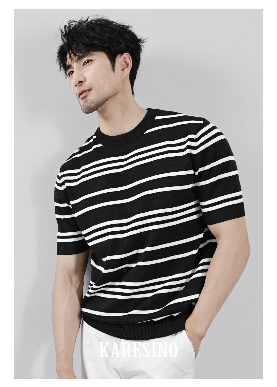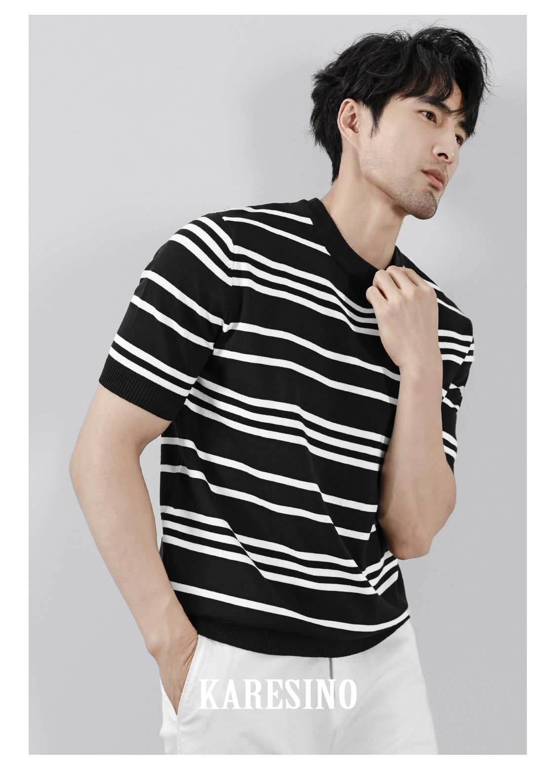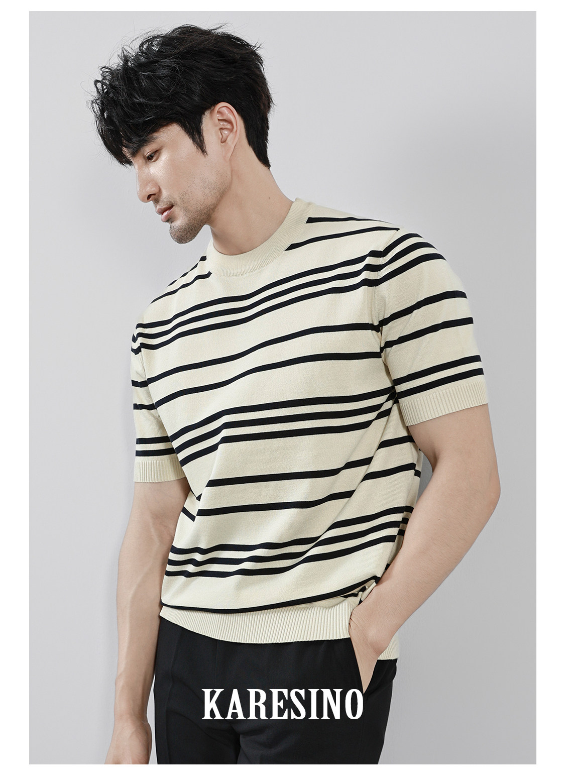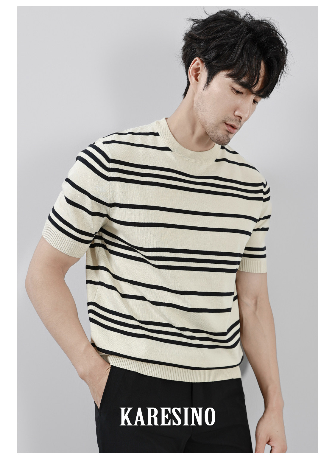 KARESINO Ice Silk Breathable, Striped Crew Neck Casual Tee