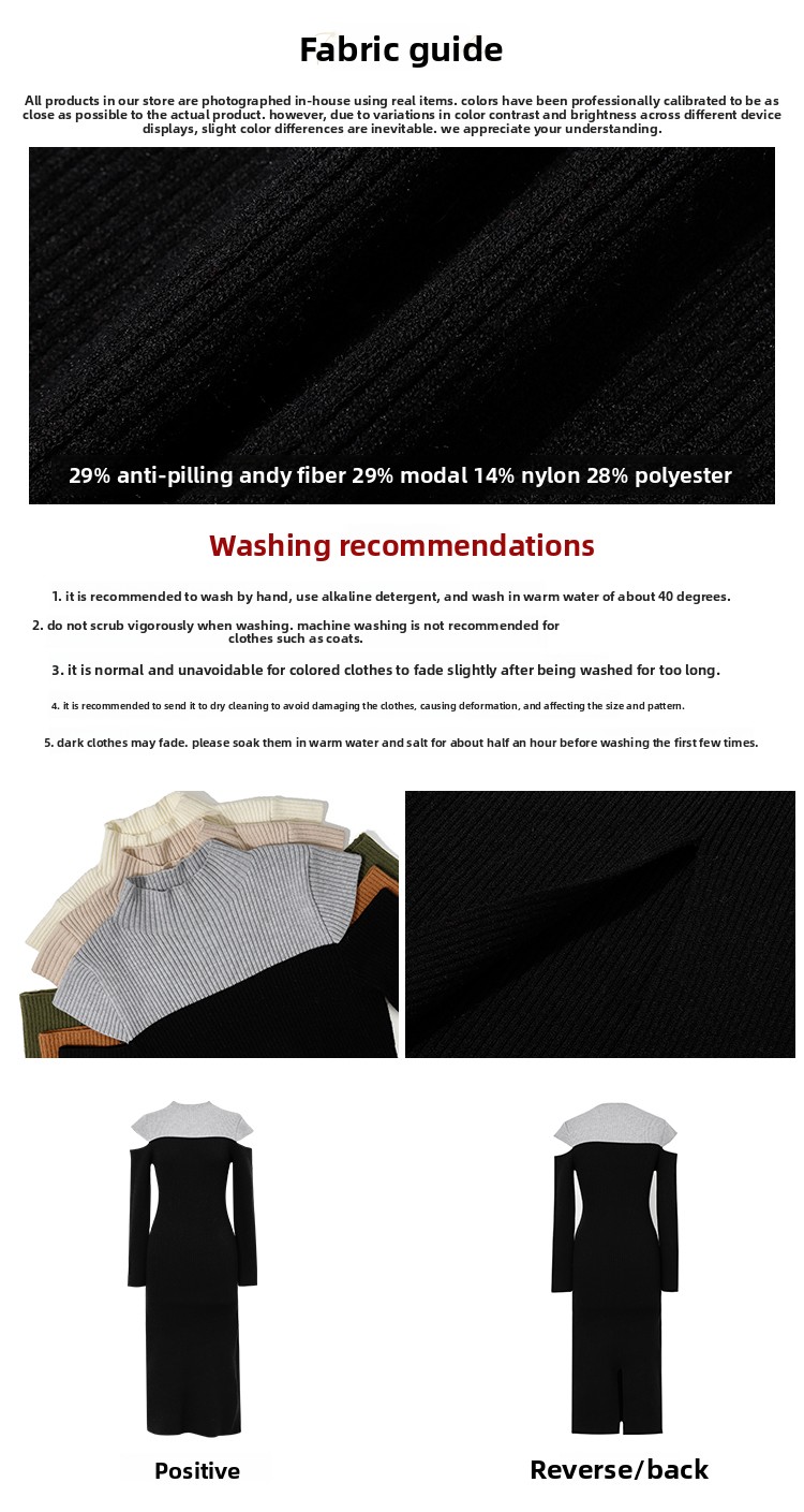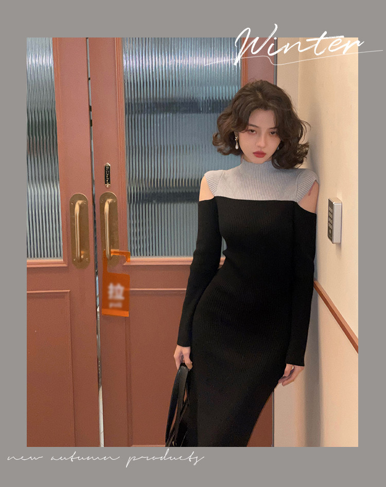 KELIFAN Semi-high-neck Waist Off-the-shoulder Knitted Dress