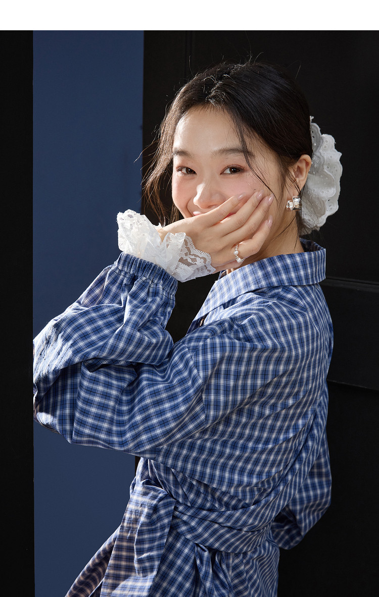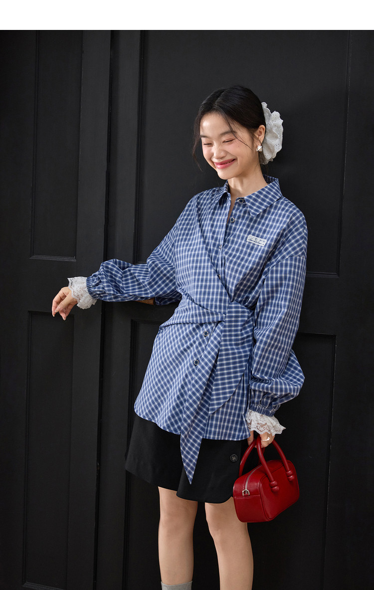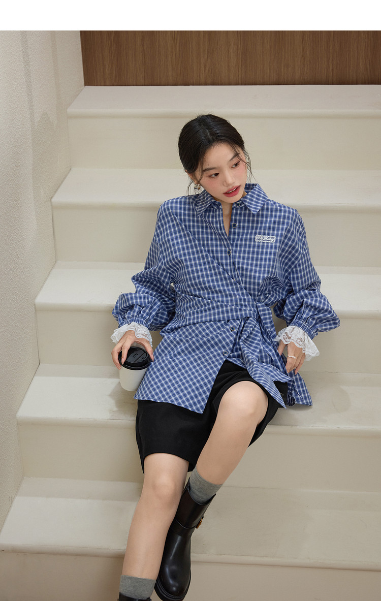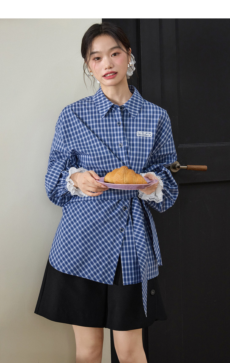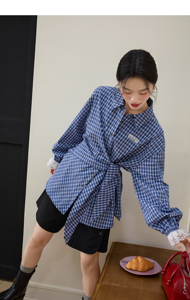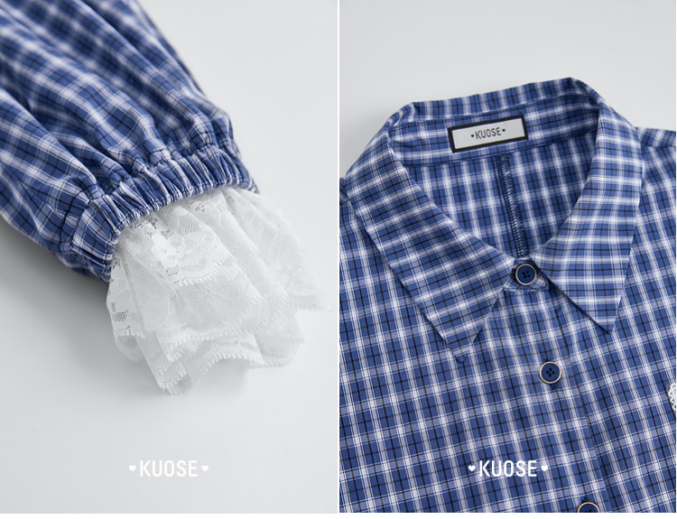 Kuose Lace Patchwork Waist Plaid Shirt
