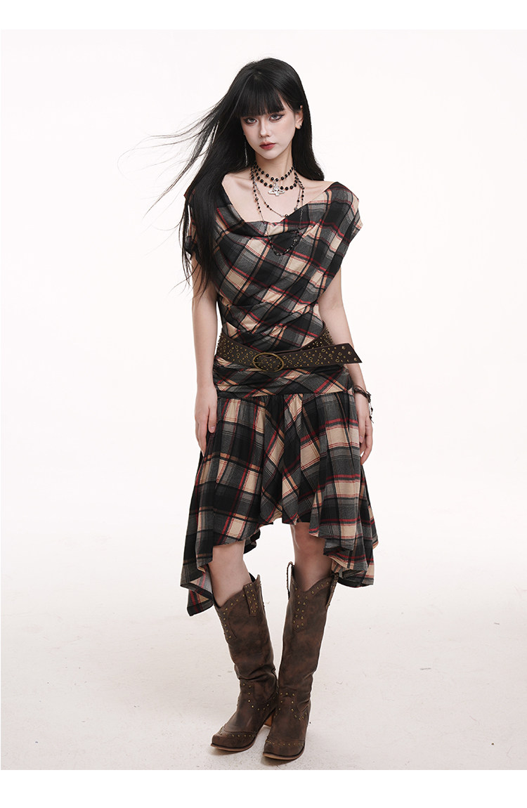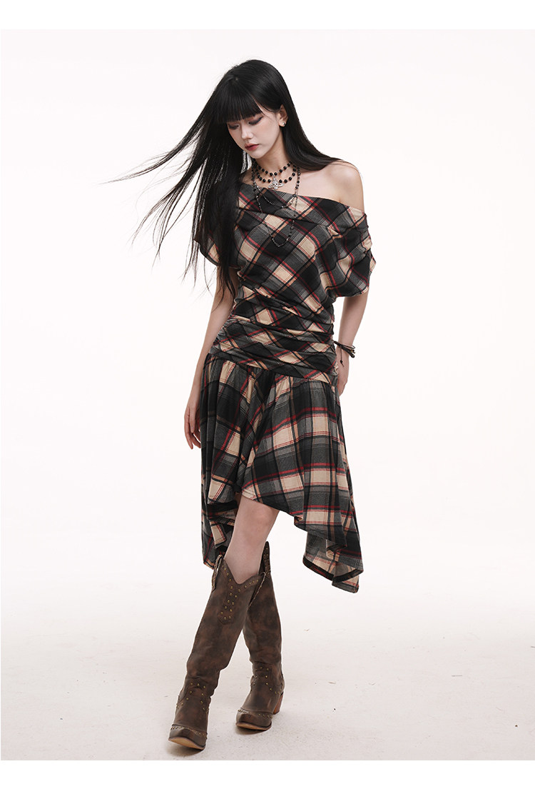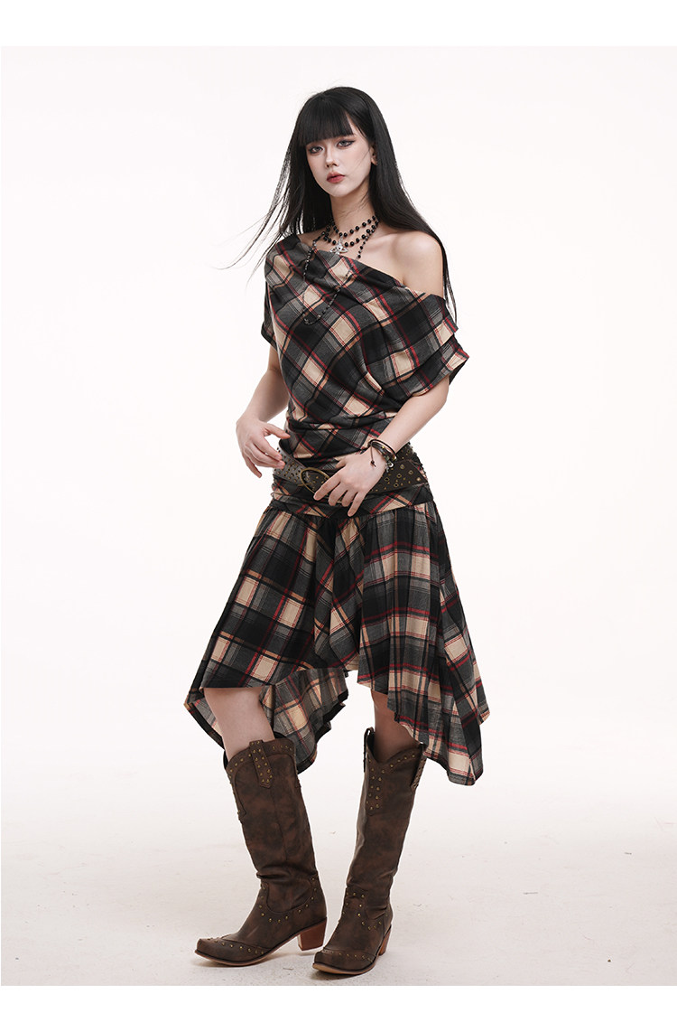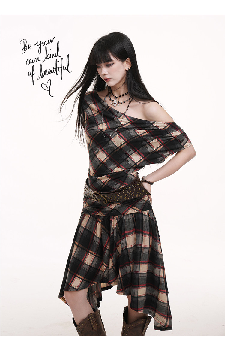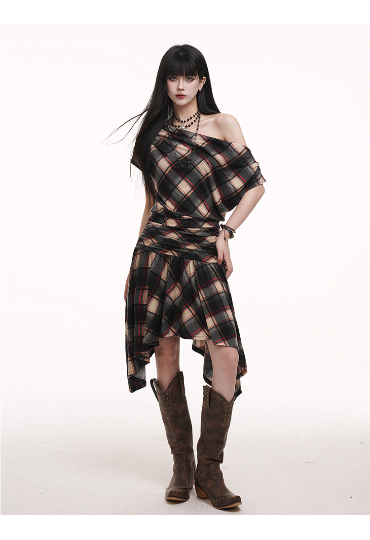 LADYGHOST Slanted Shoulder Plaid Dress