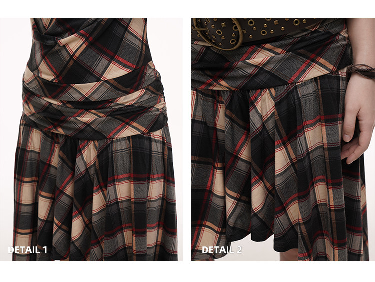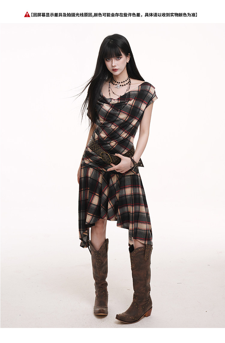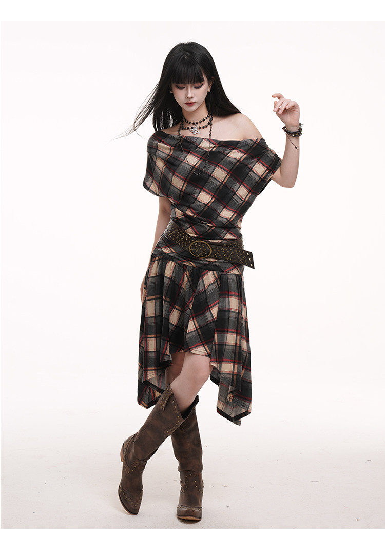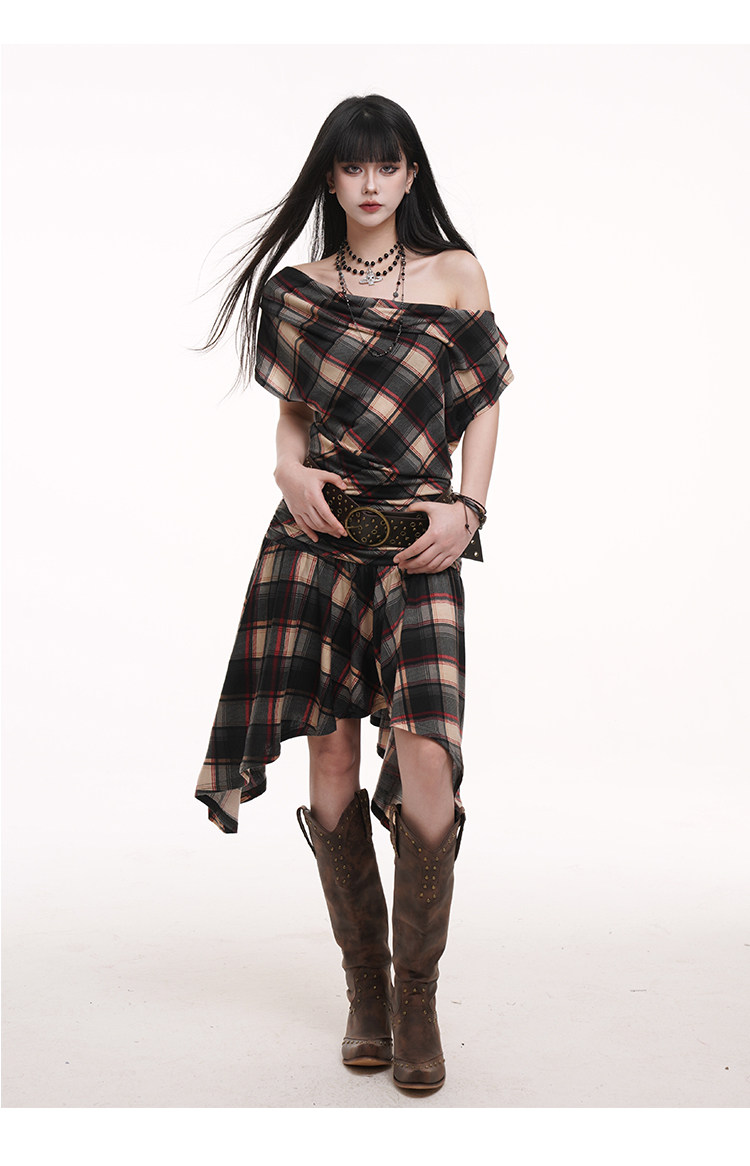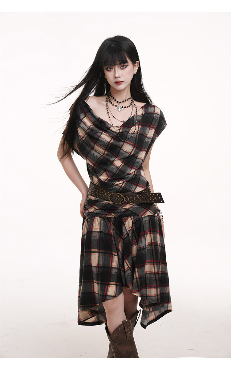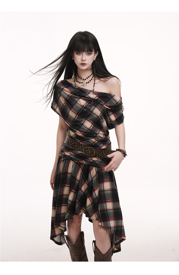 LADYGHOST Slanted Shoulder Plaid Dress