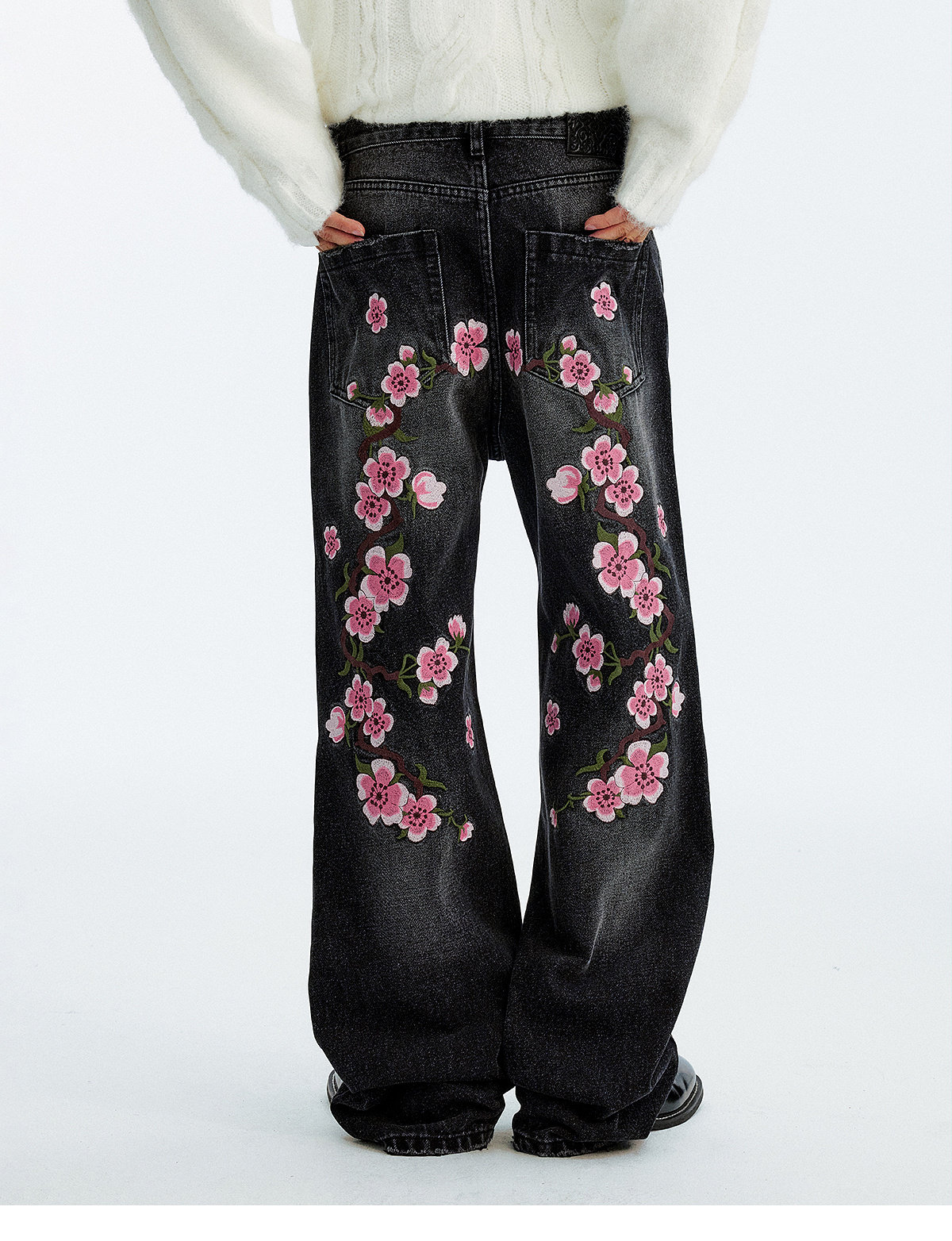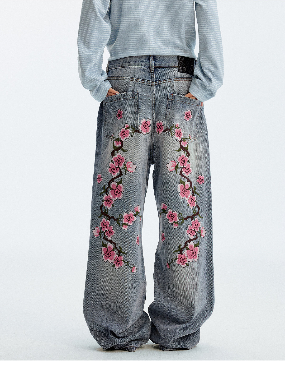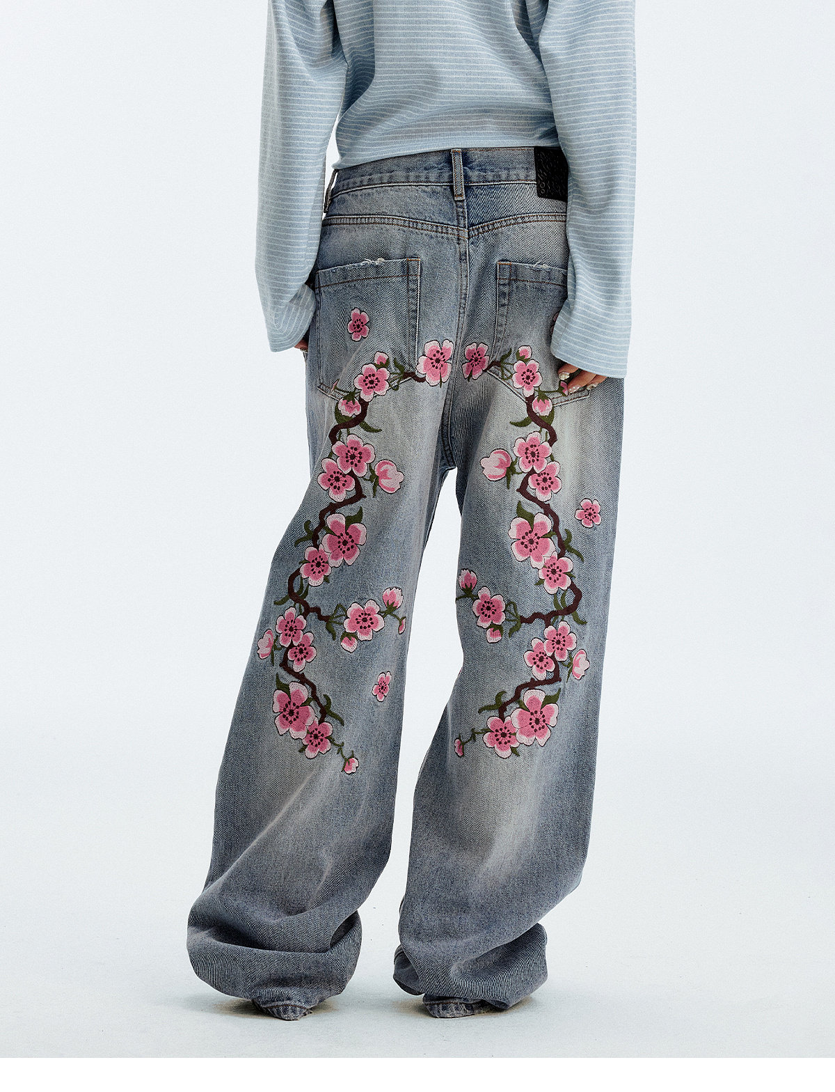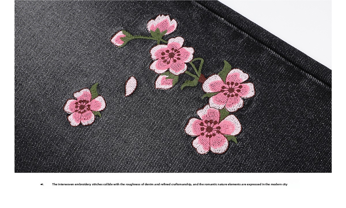 MEDM Sakura Pattern Embroidered Micro-elastic Casual Jeans