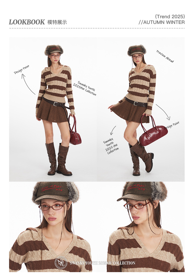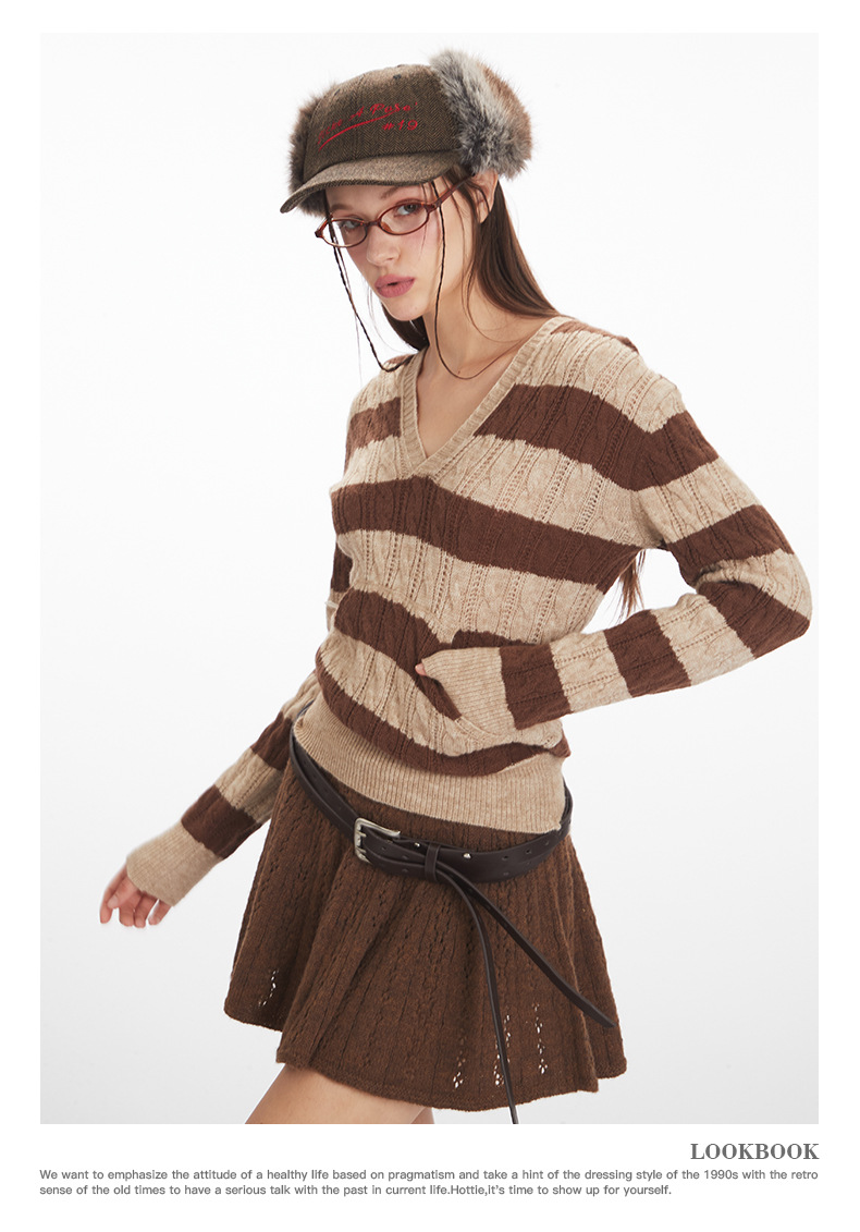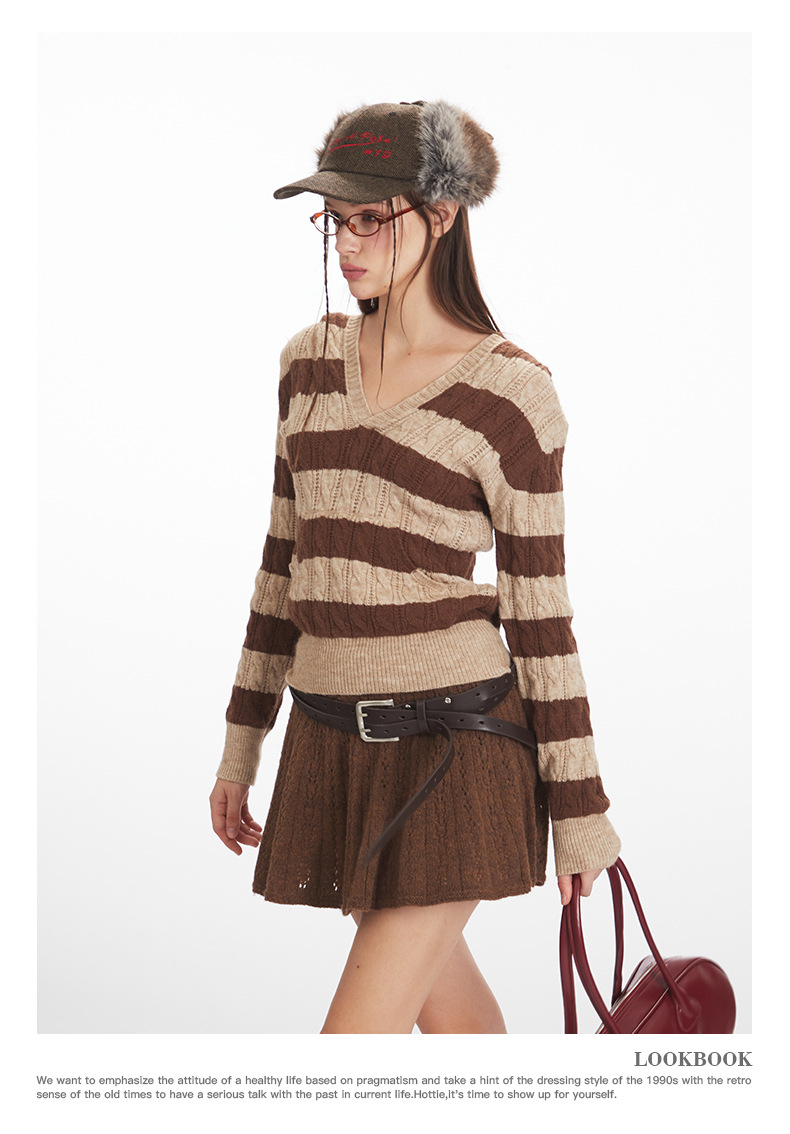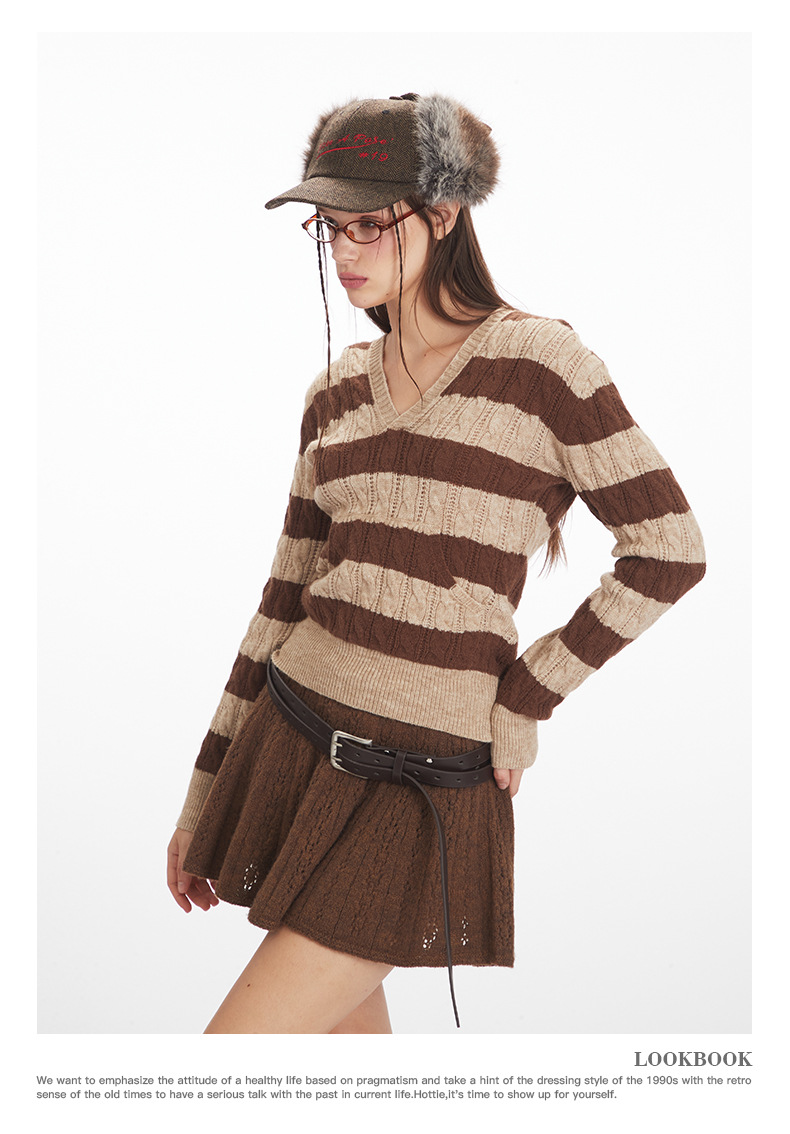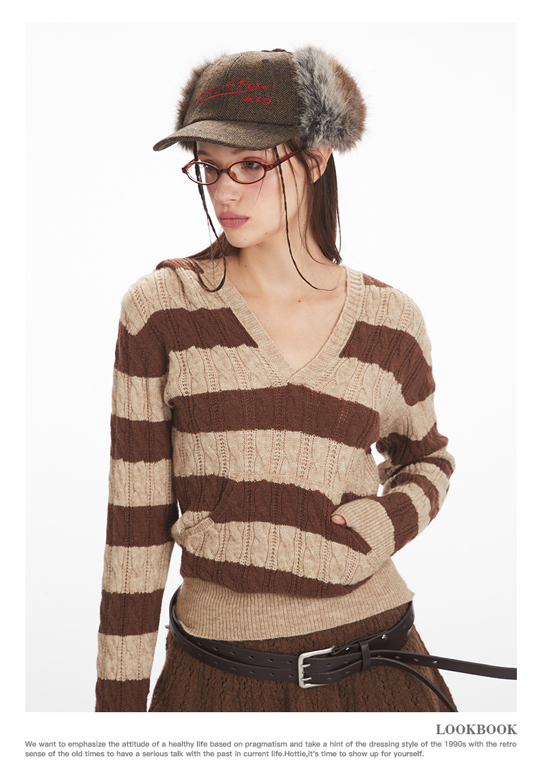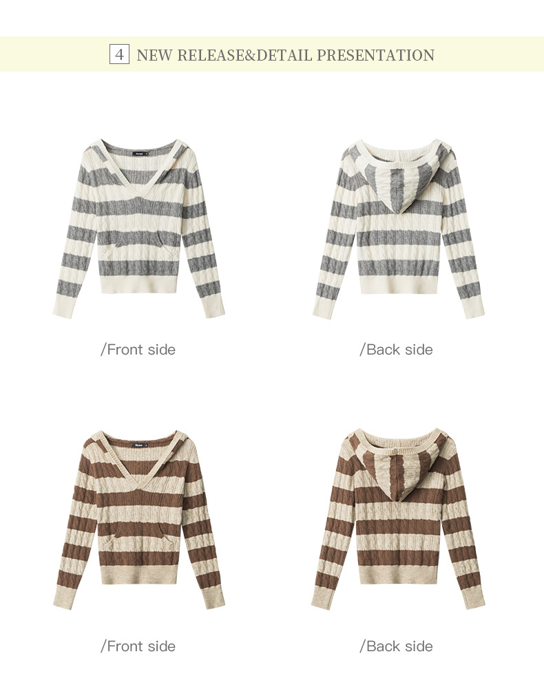Nariele Striped Hooded V-Neck Long Sleeve Sweater
