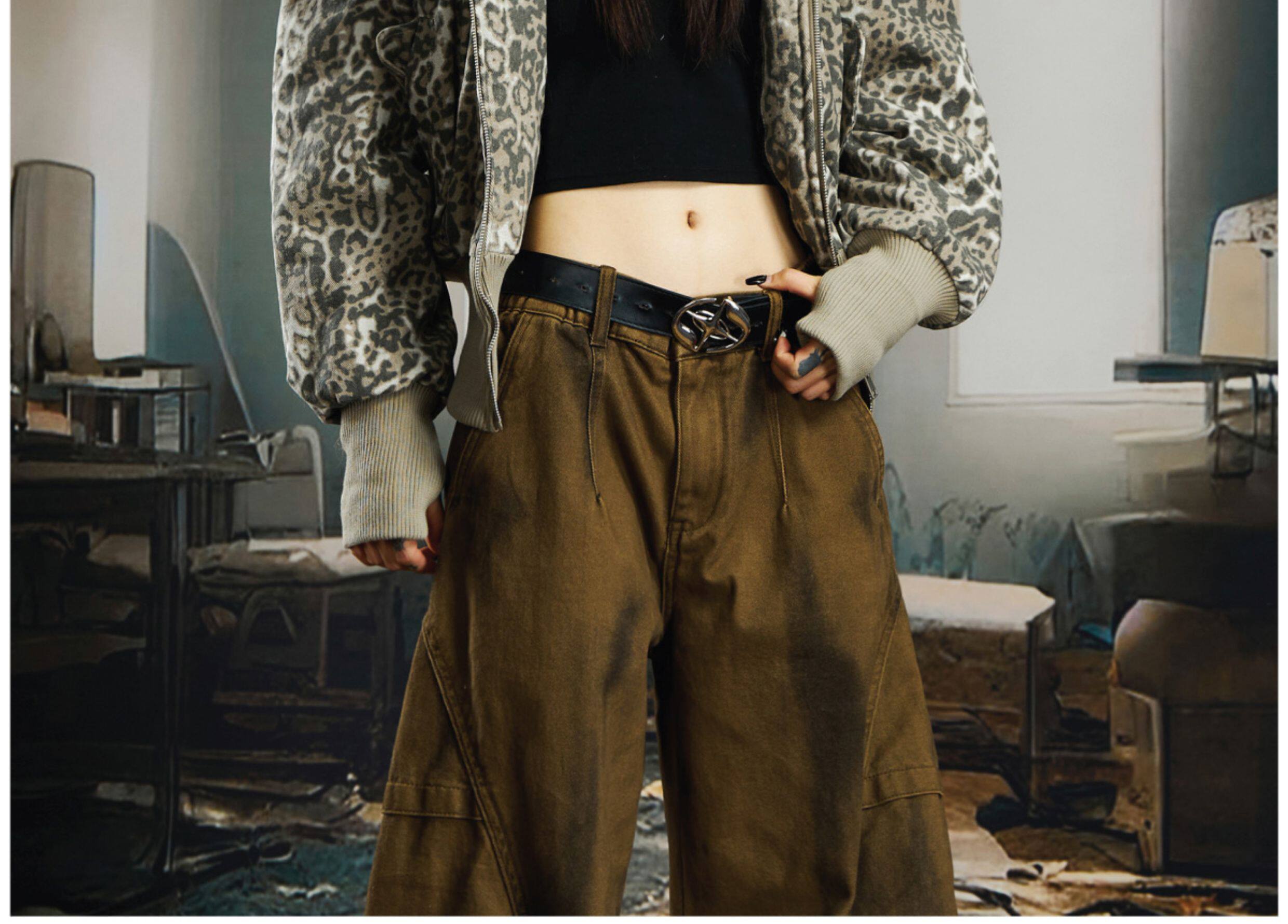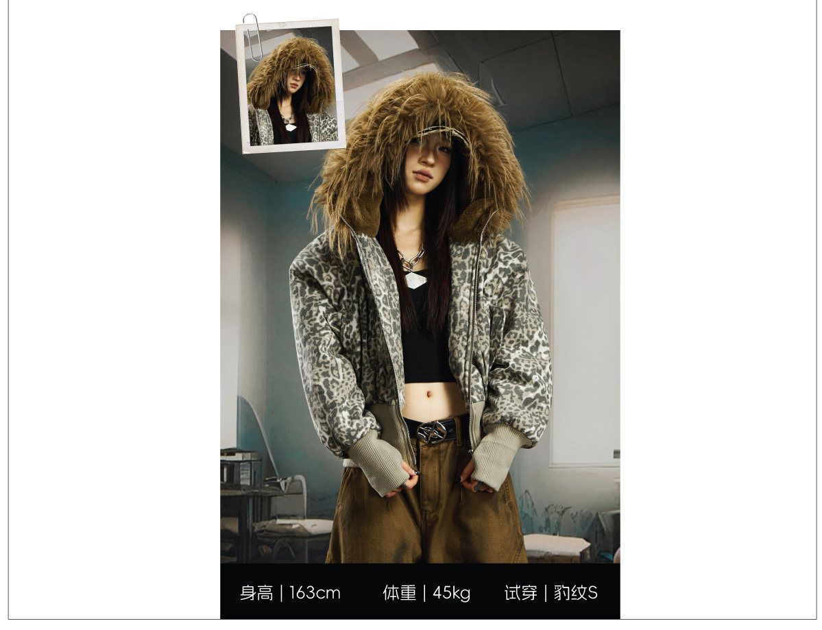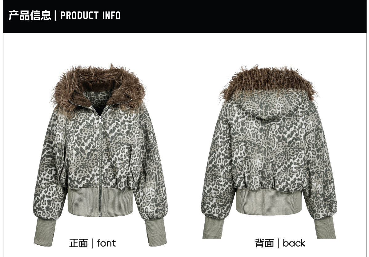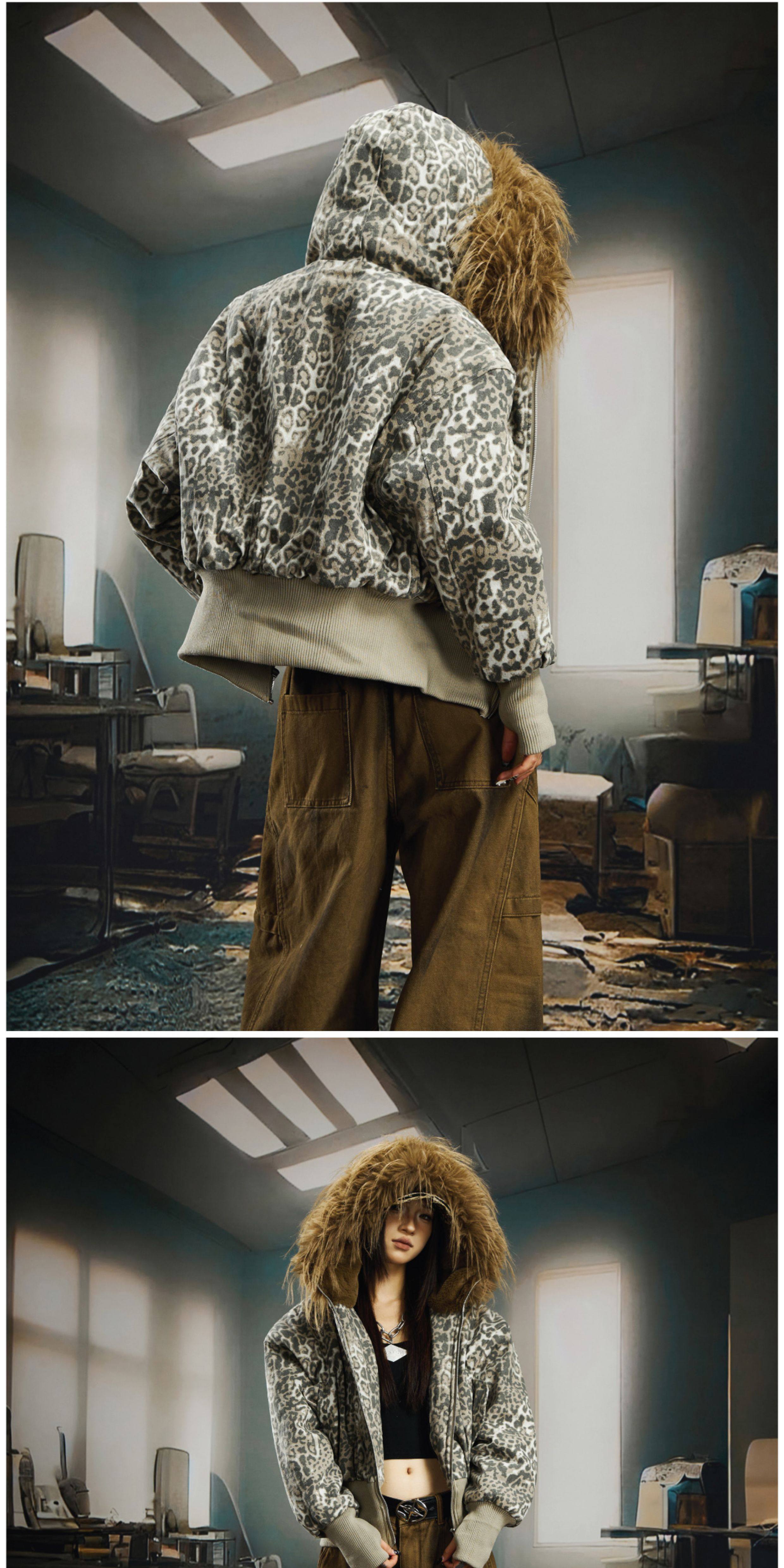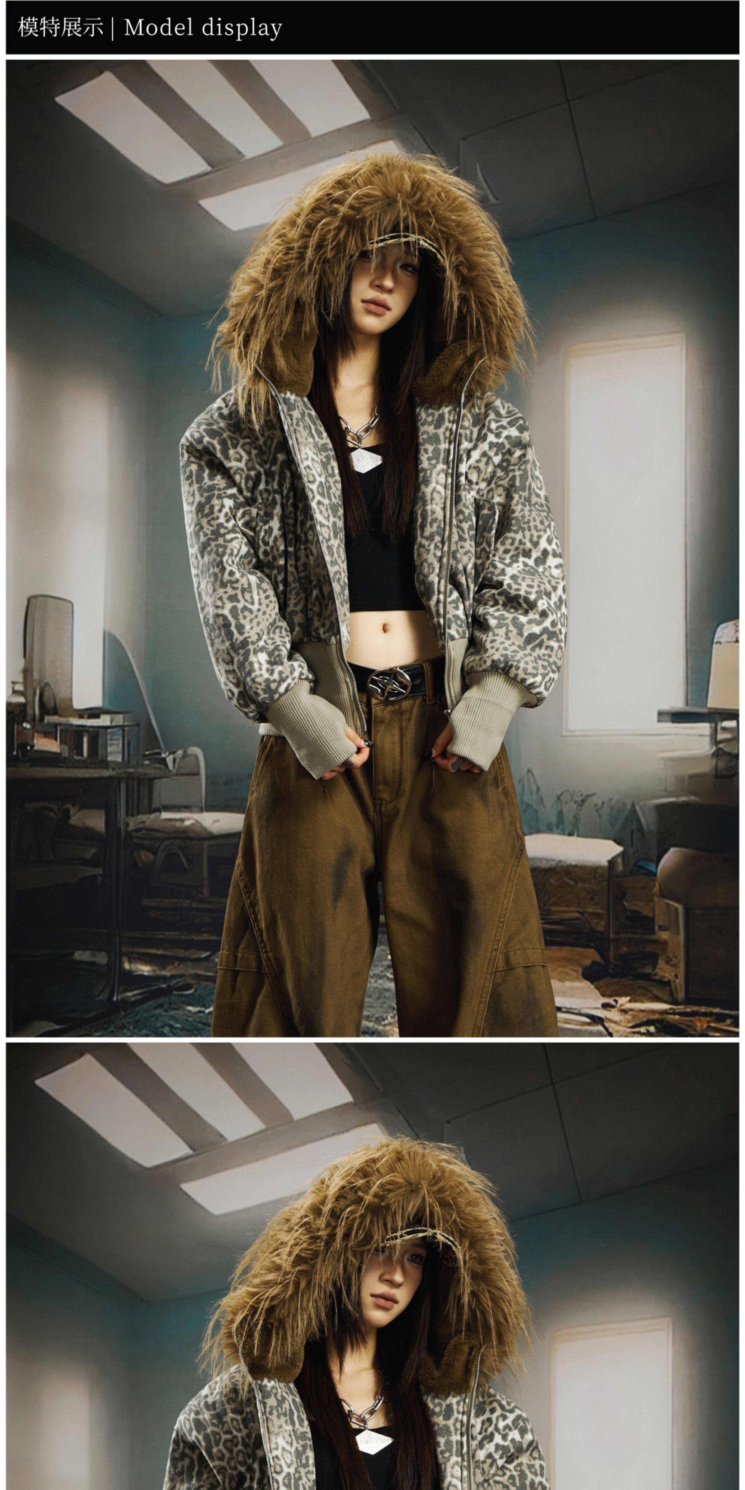 NOMANIAI Big Fur Collar Hooded Leopard Print Short Wide Cotton Suit