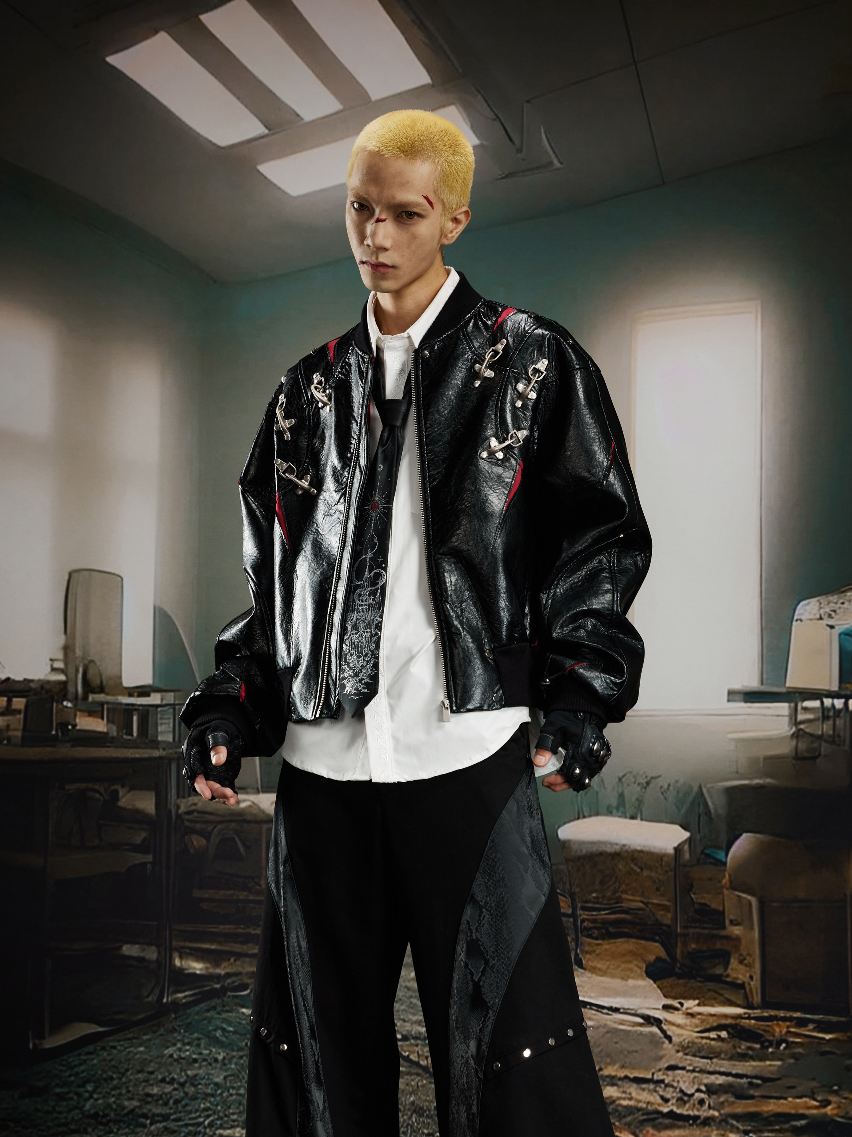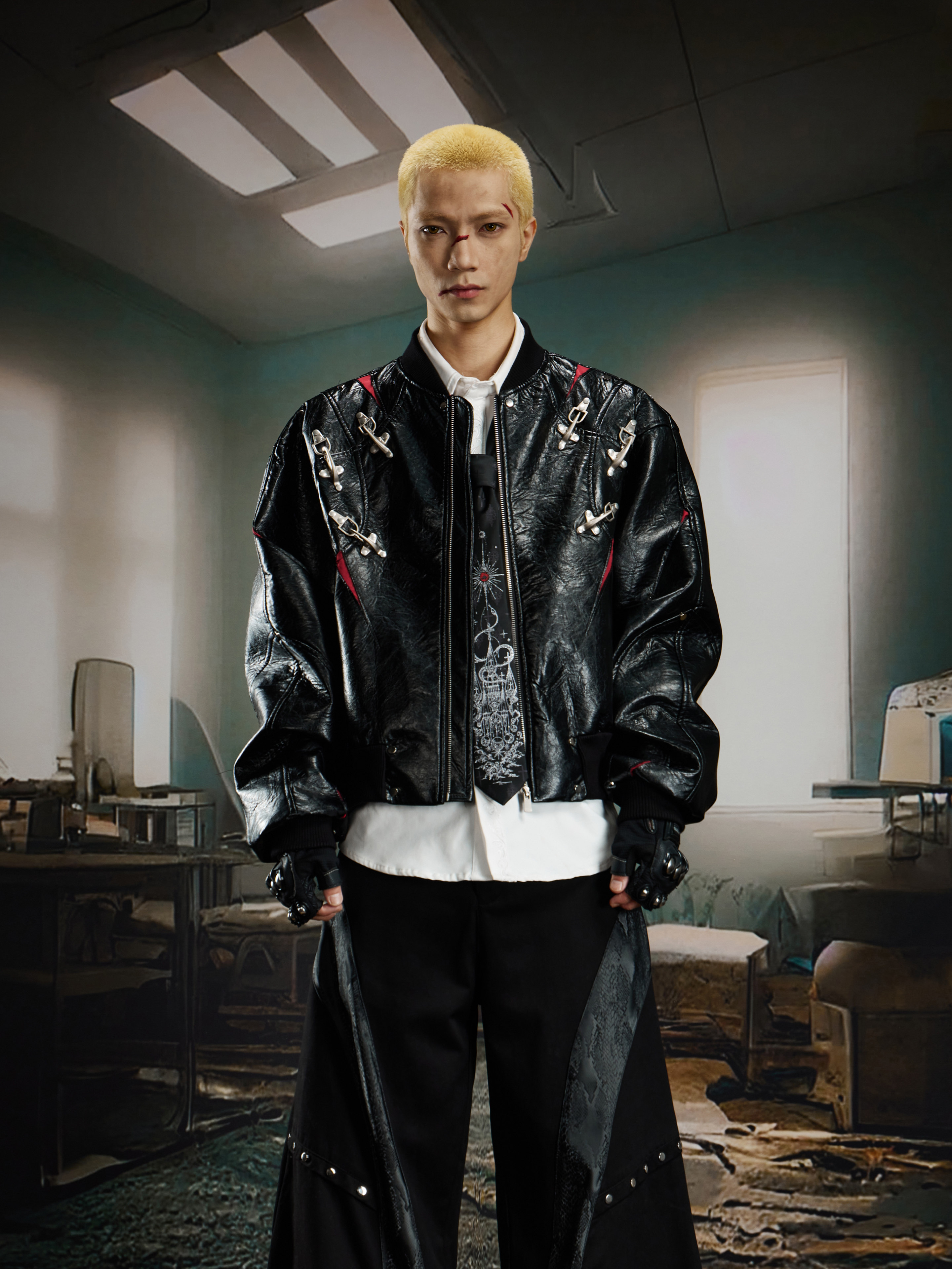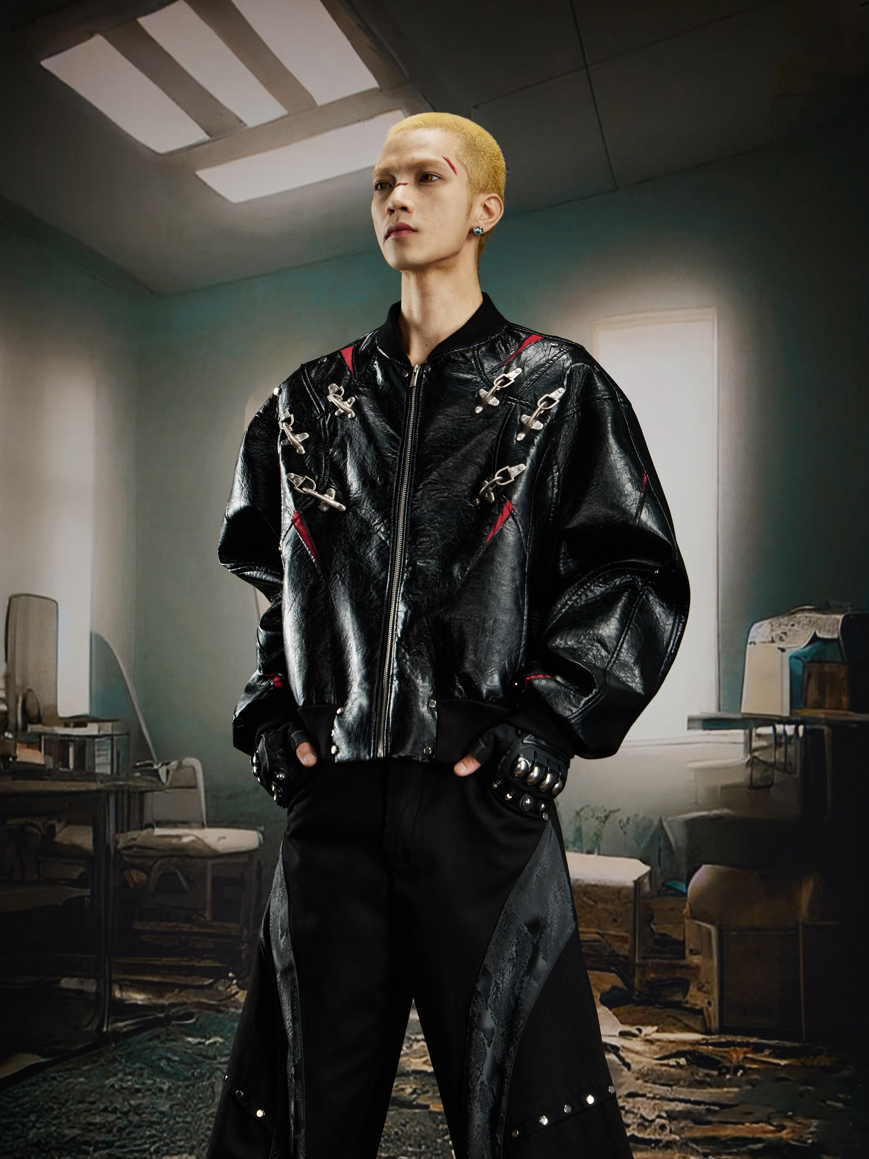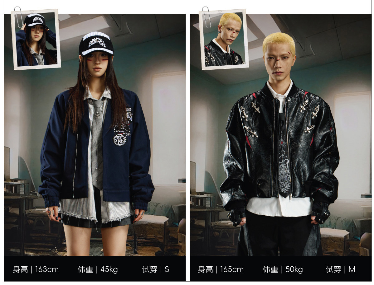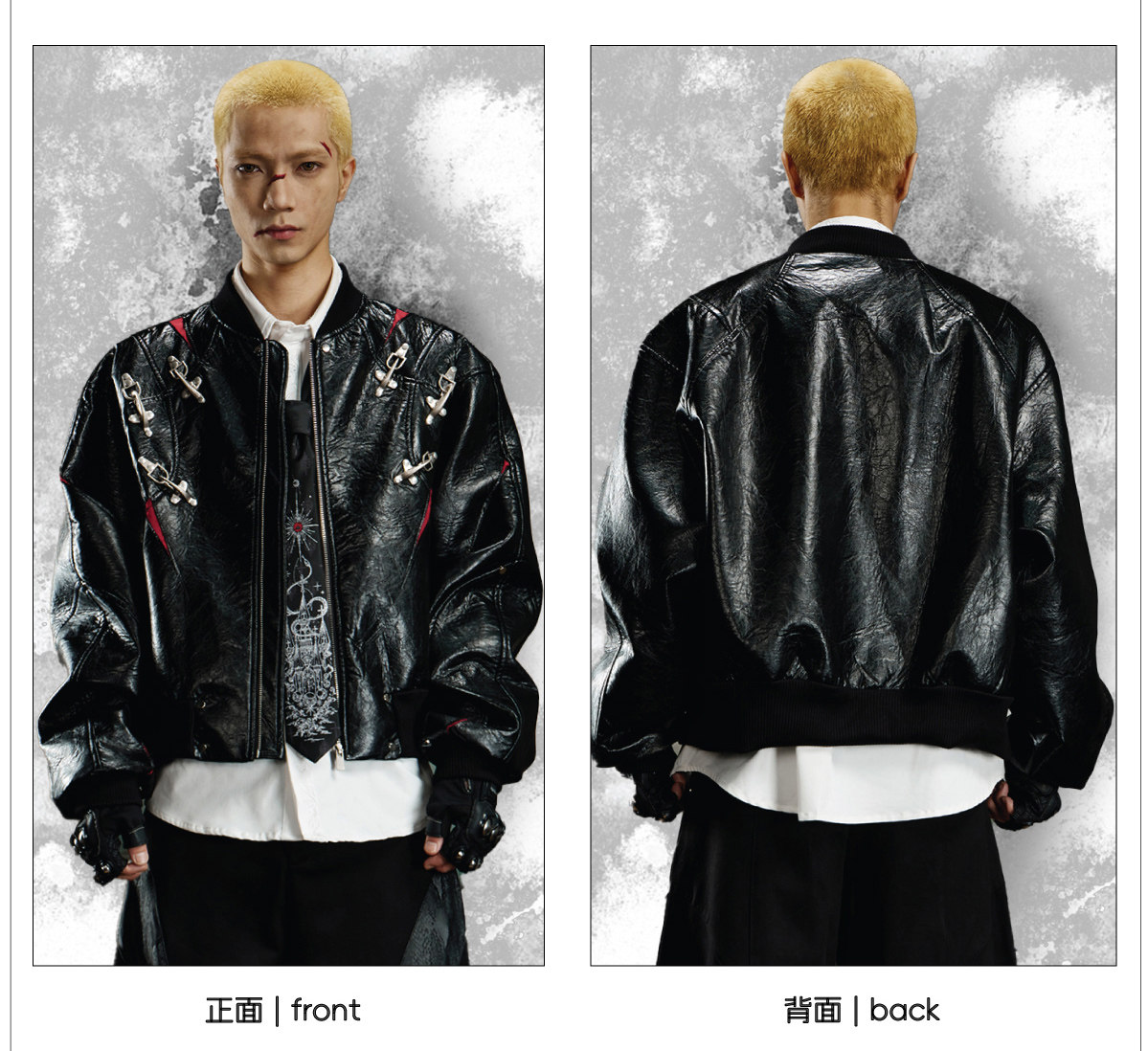NUndefined Contrasting Color Splicing Stand-up Collar Short Zipper Leather Jacket