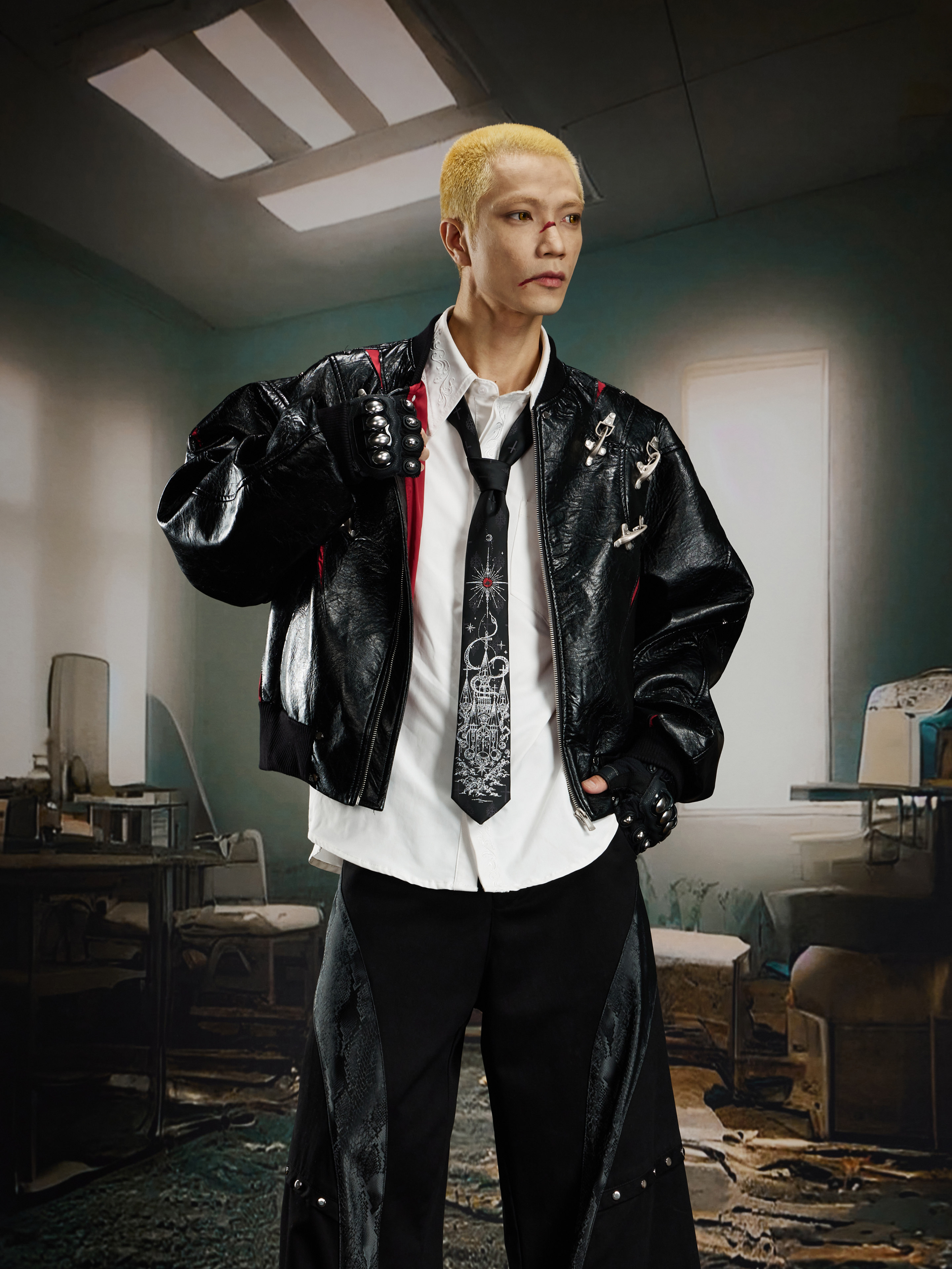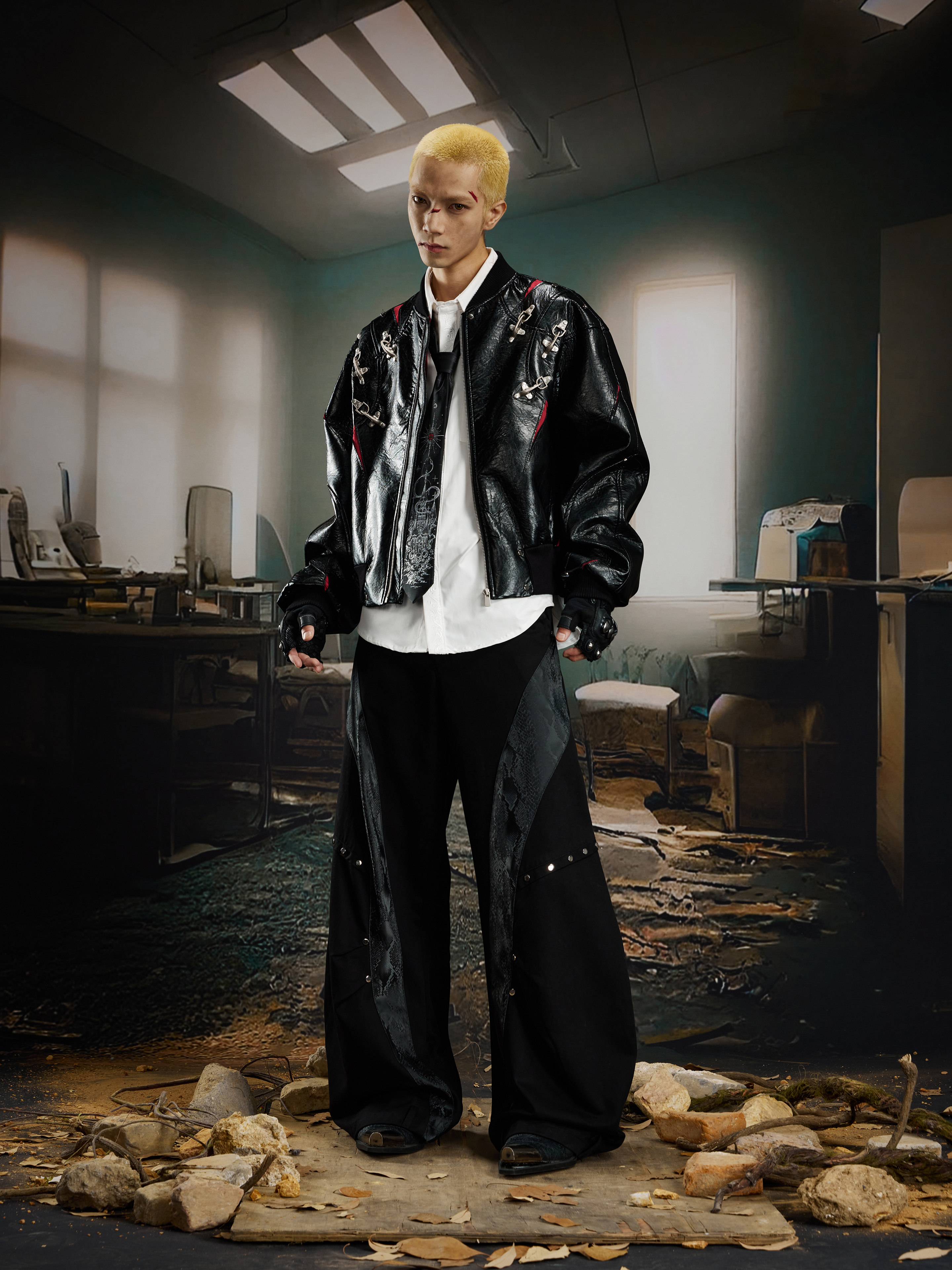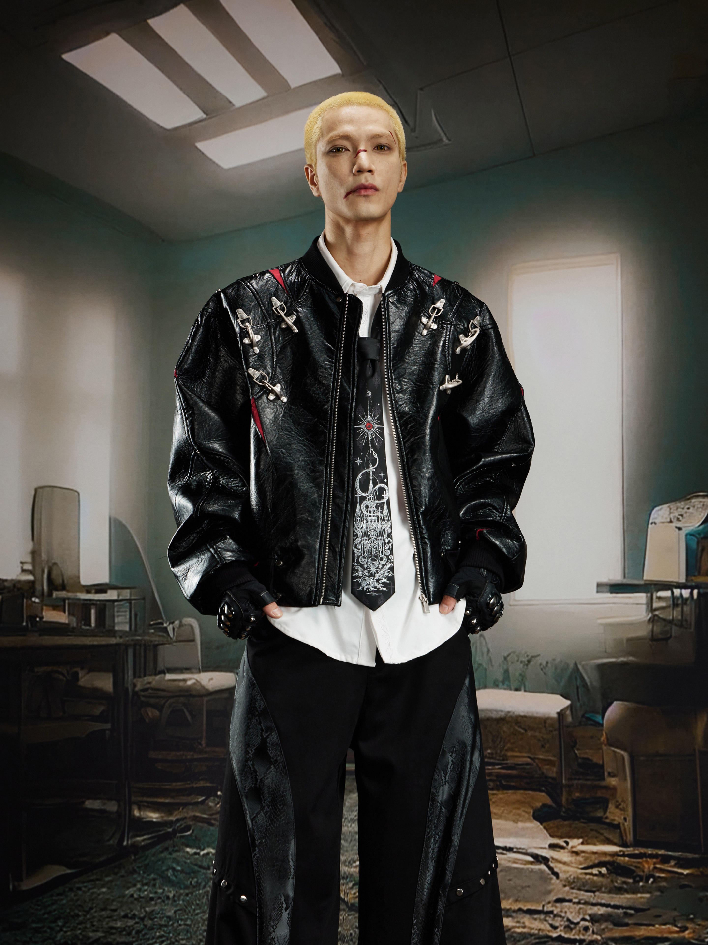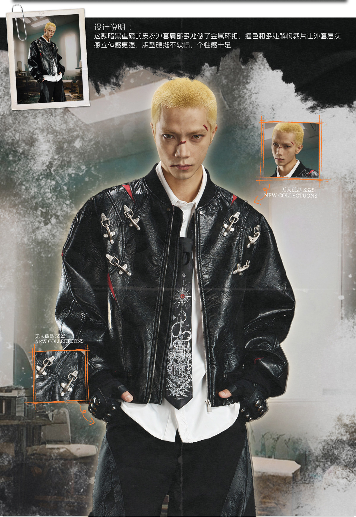 NUndefined Contrasting Color Splicing Stand-up Collar Short Zipper Leather Jacket