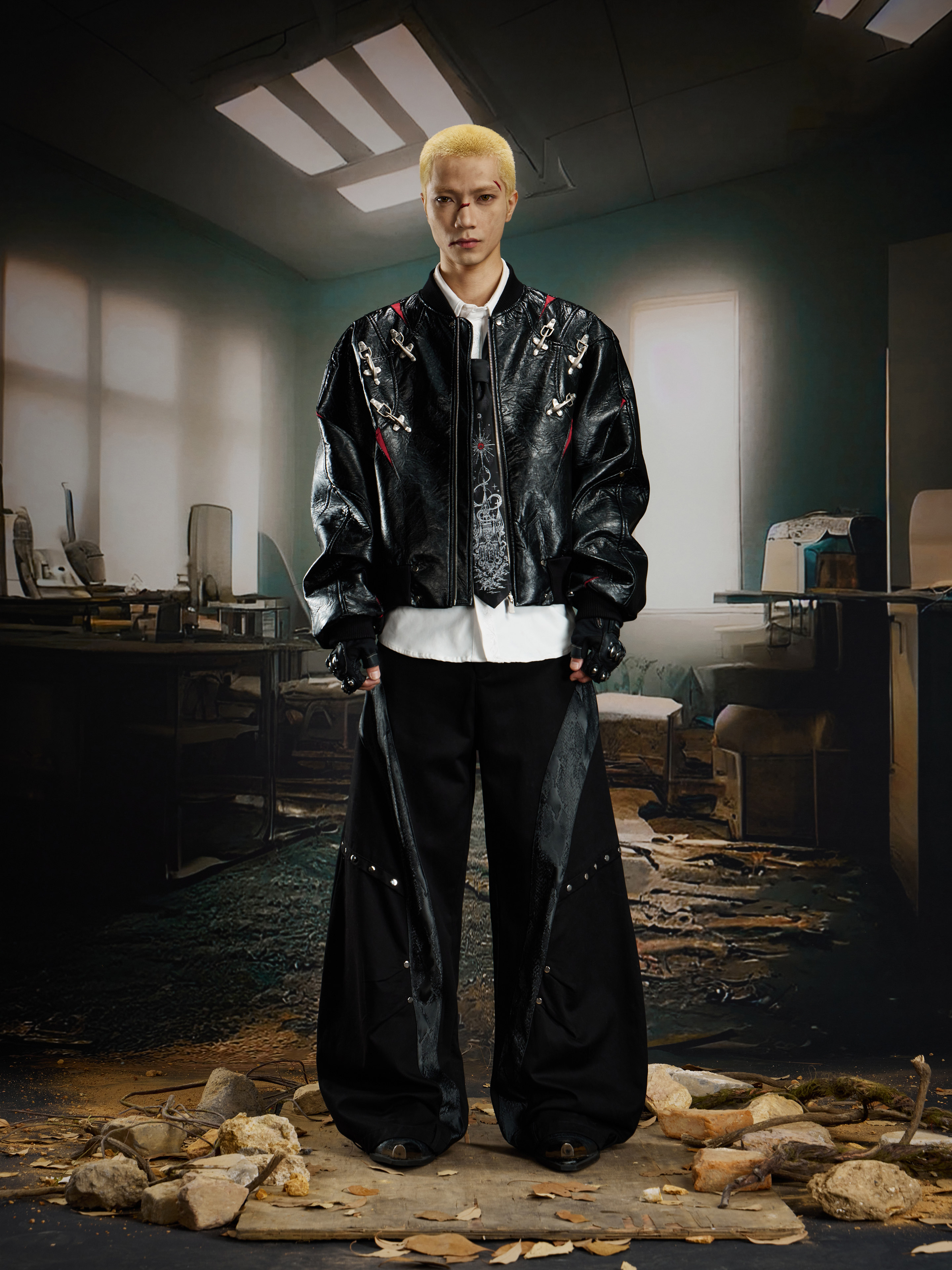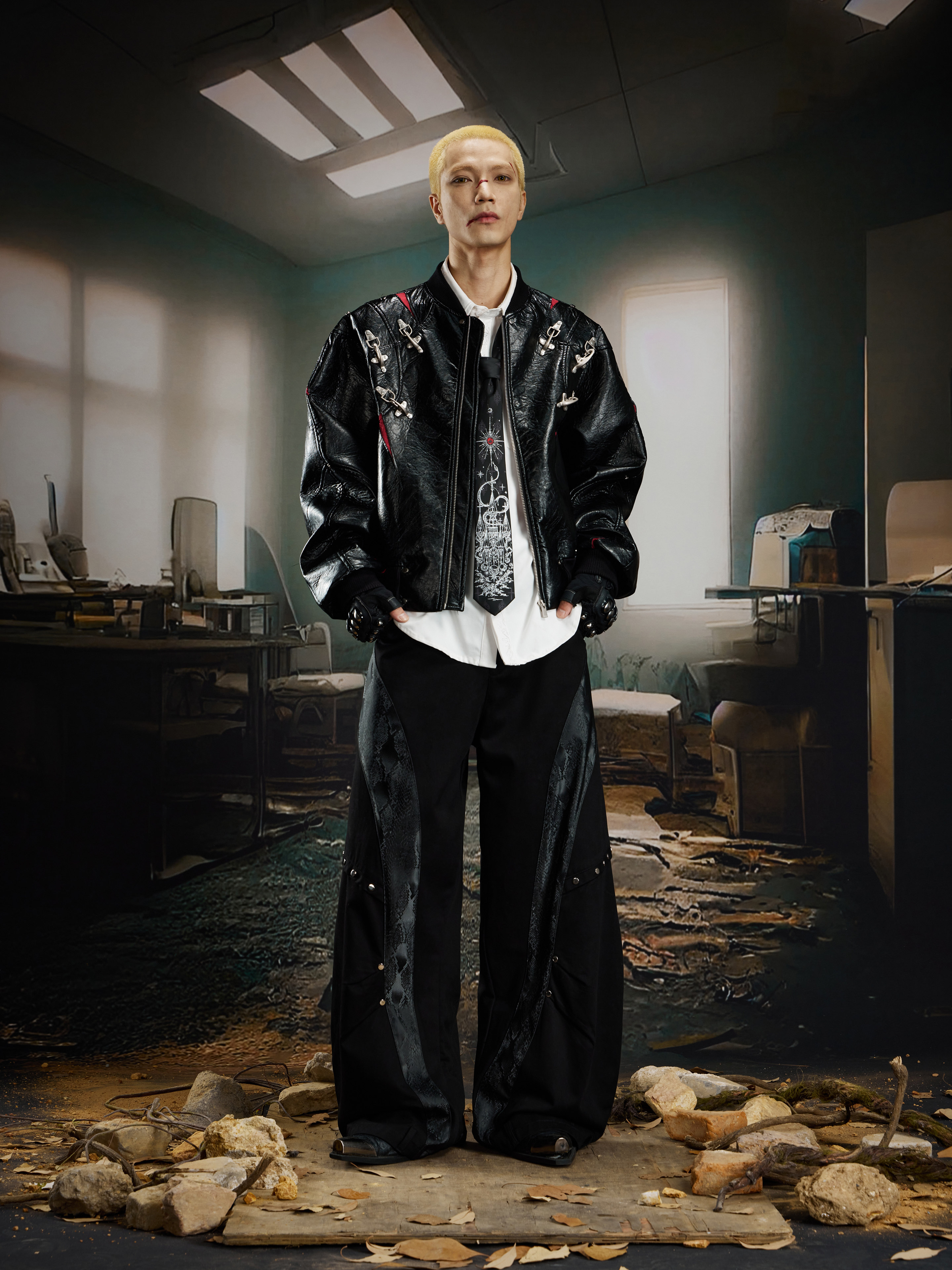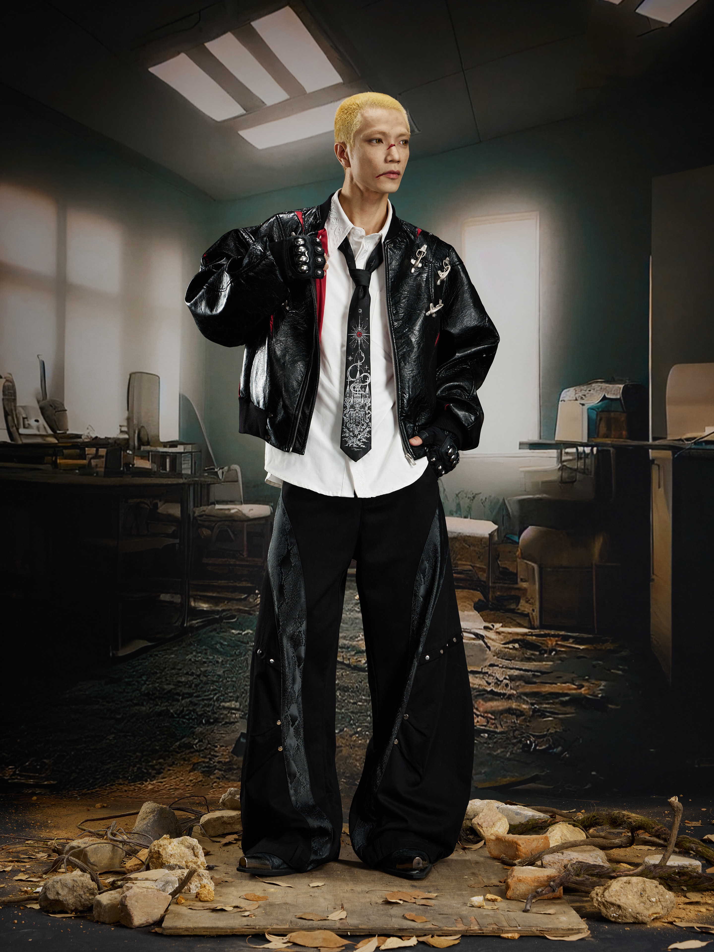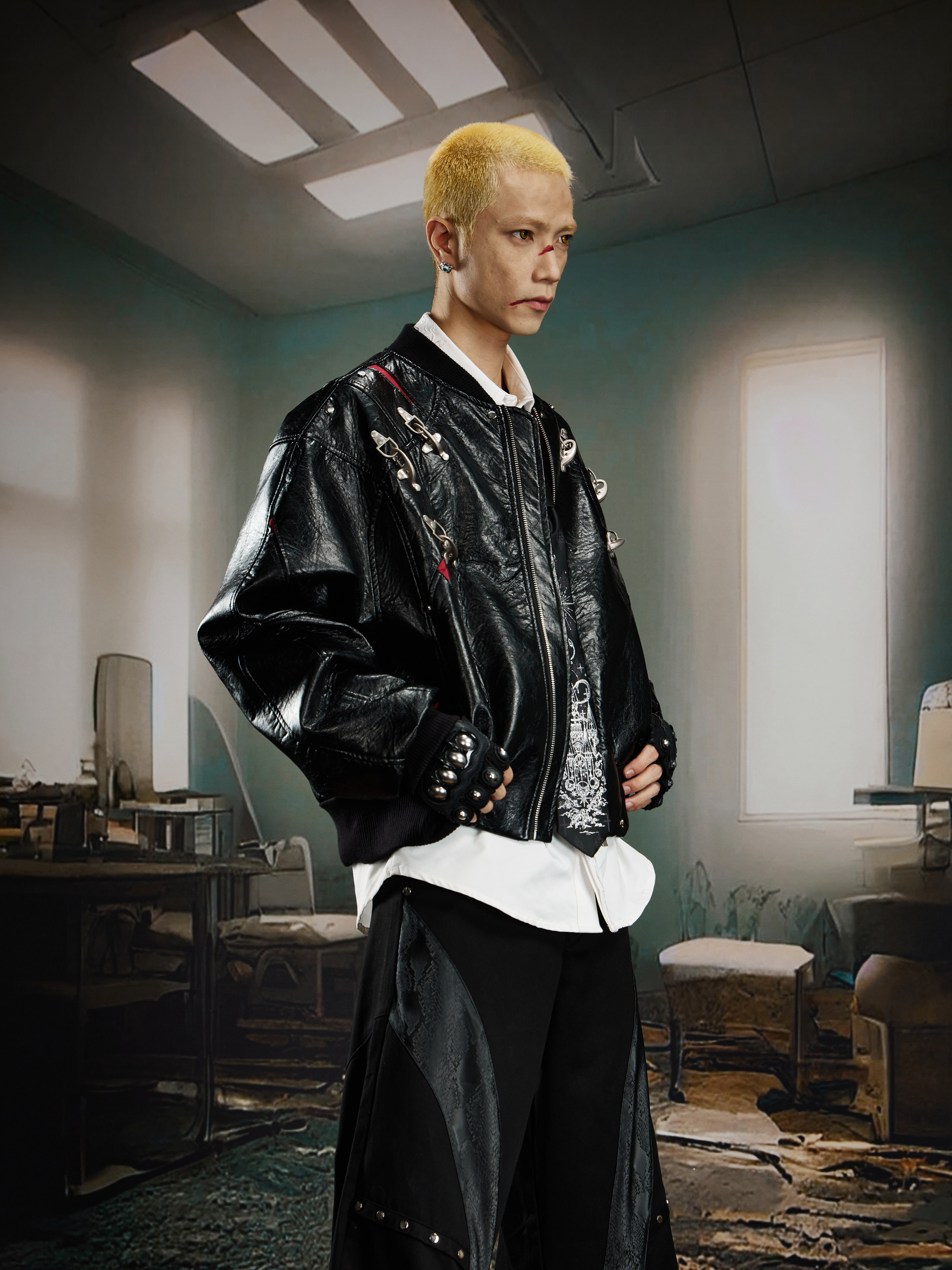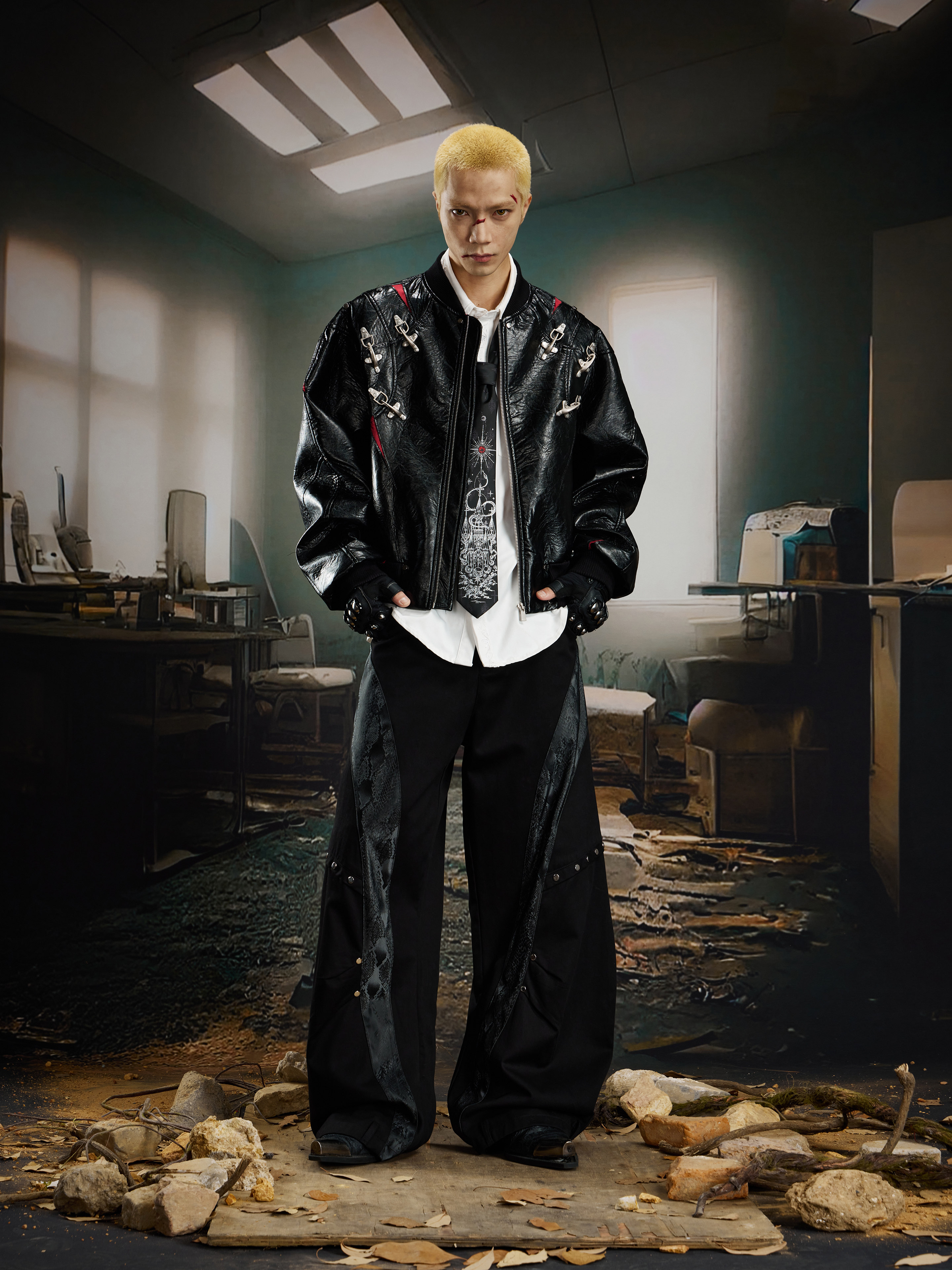 NUndefined Contrasting Color Splicing Stand-up Collar Short Zipper Leather Jacket