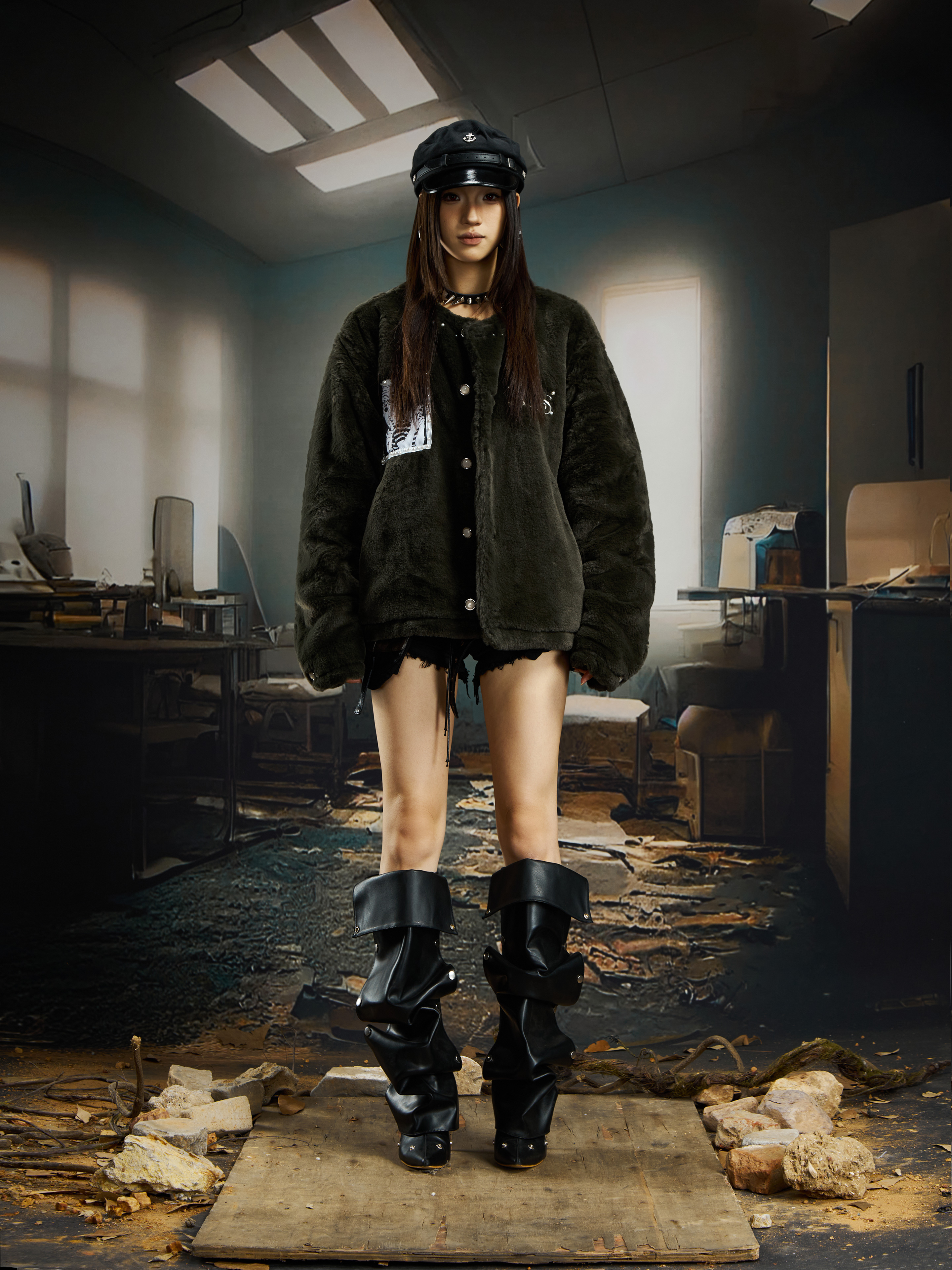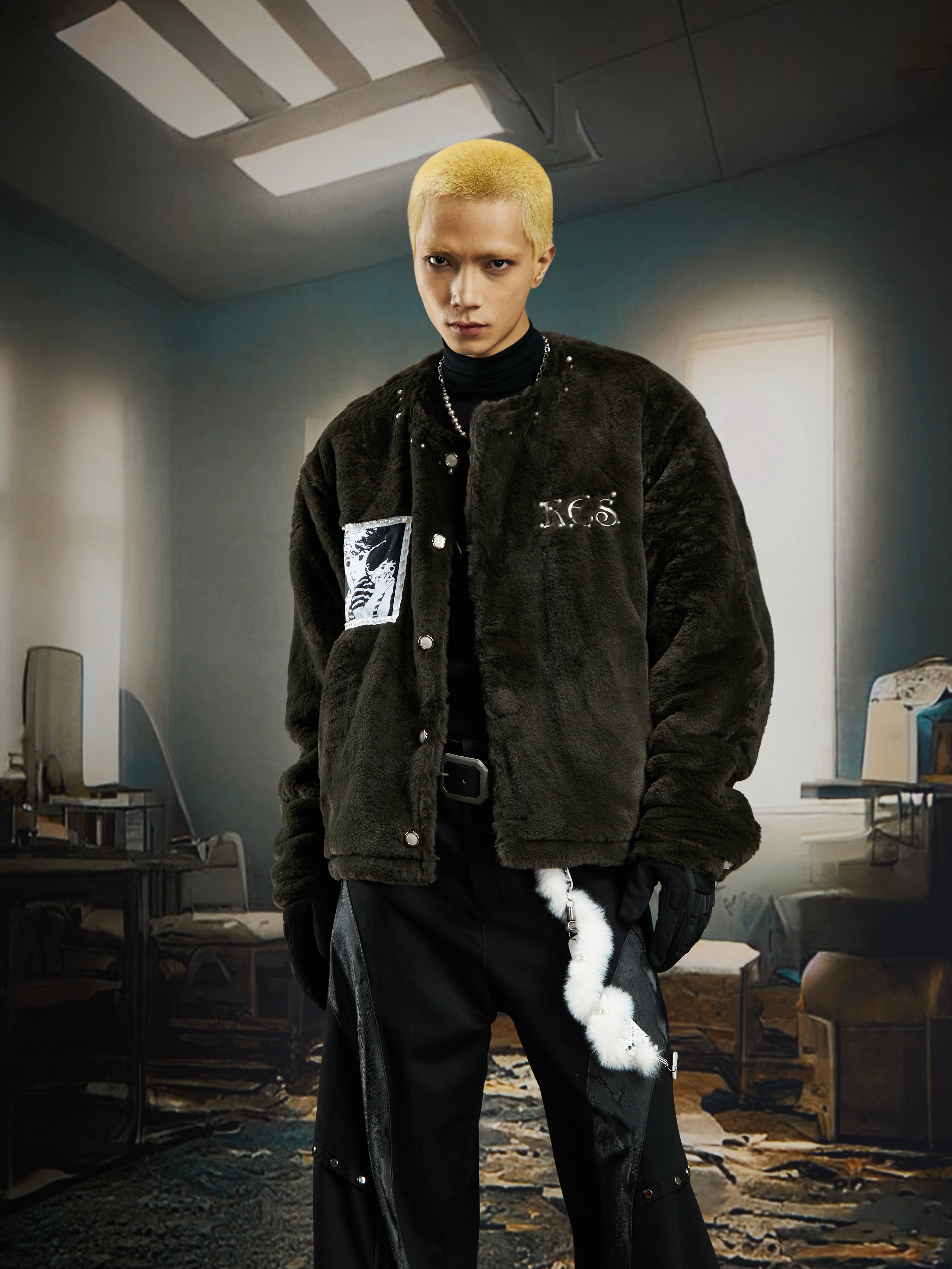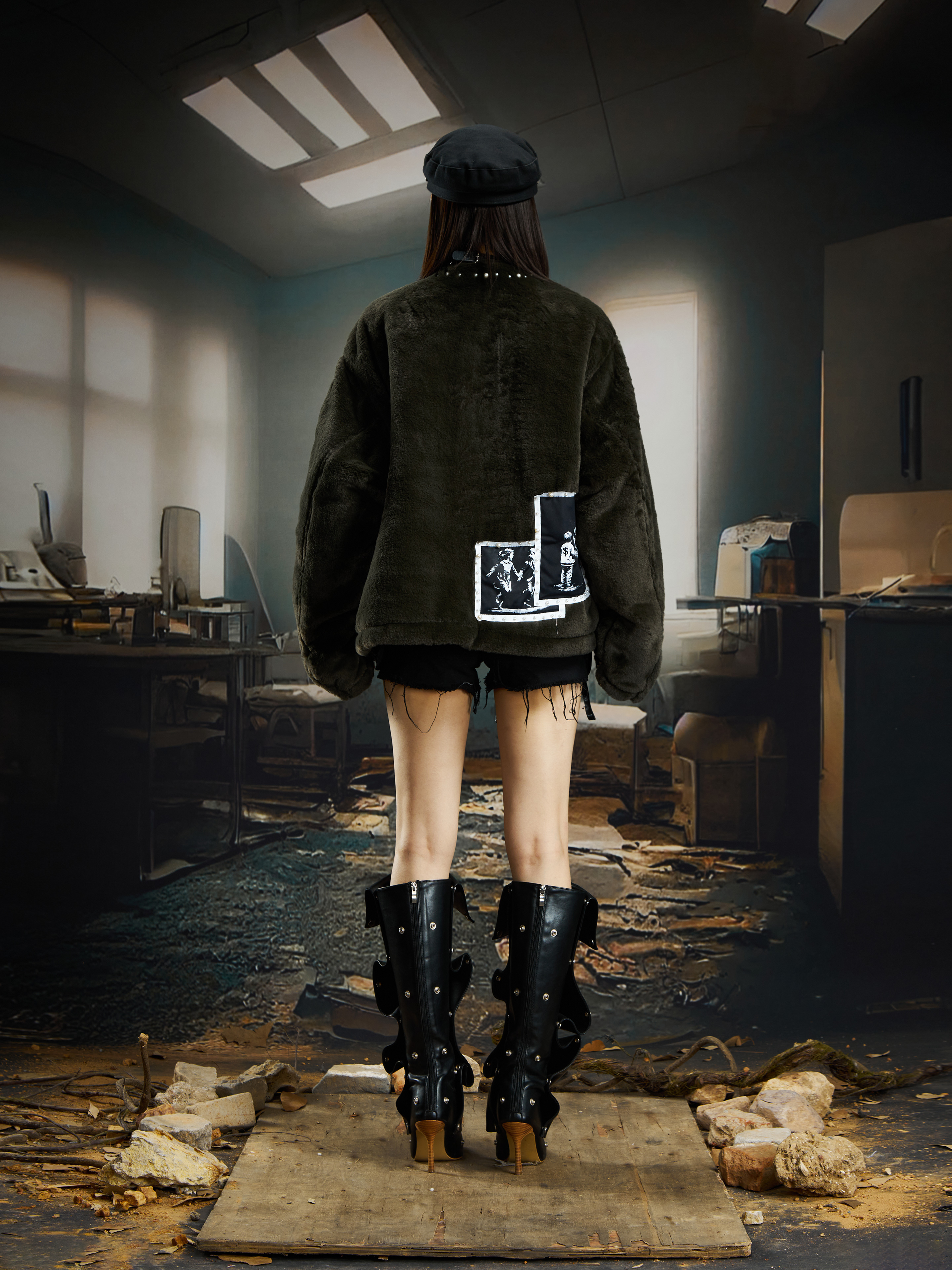 NOMANIAI Plush Comic Patch Short Padded Jacket