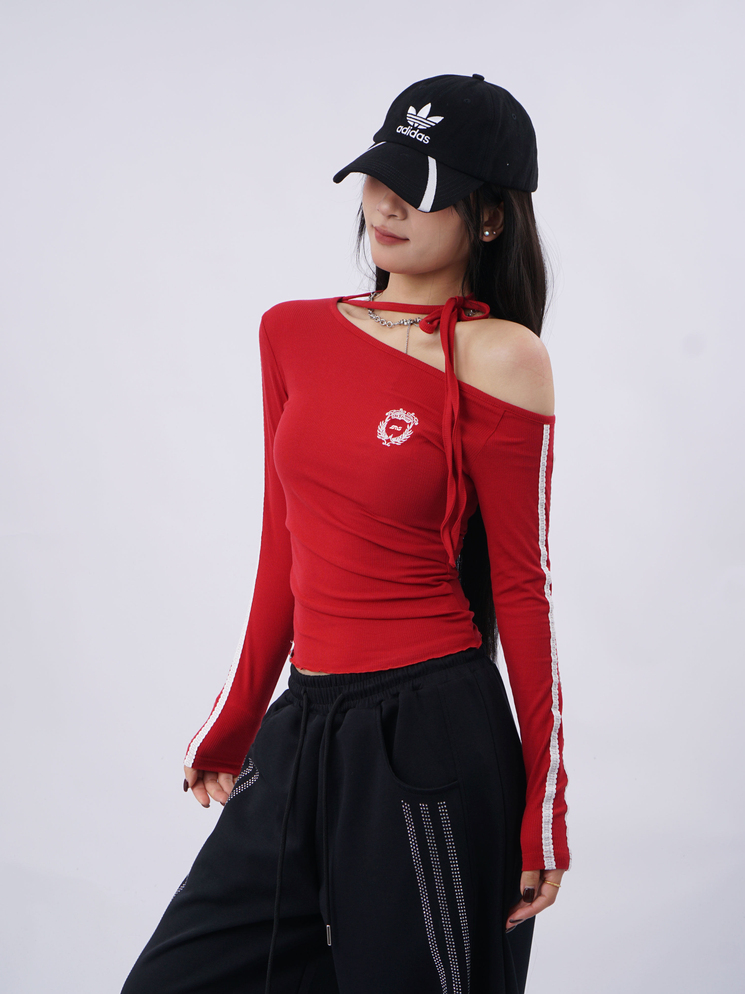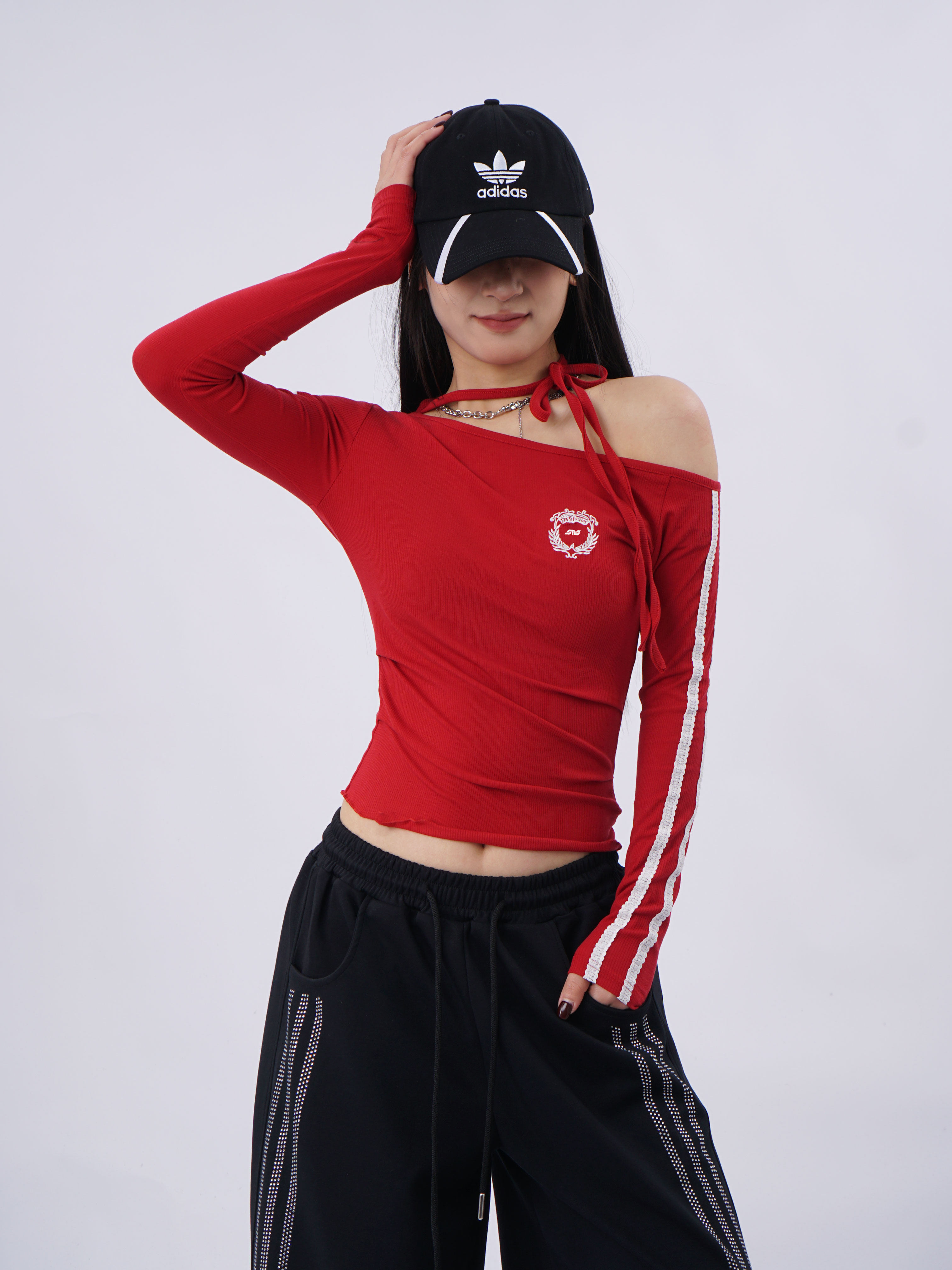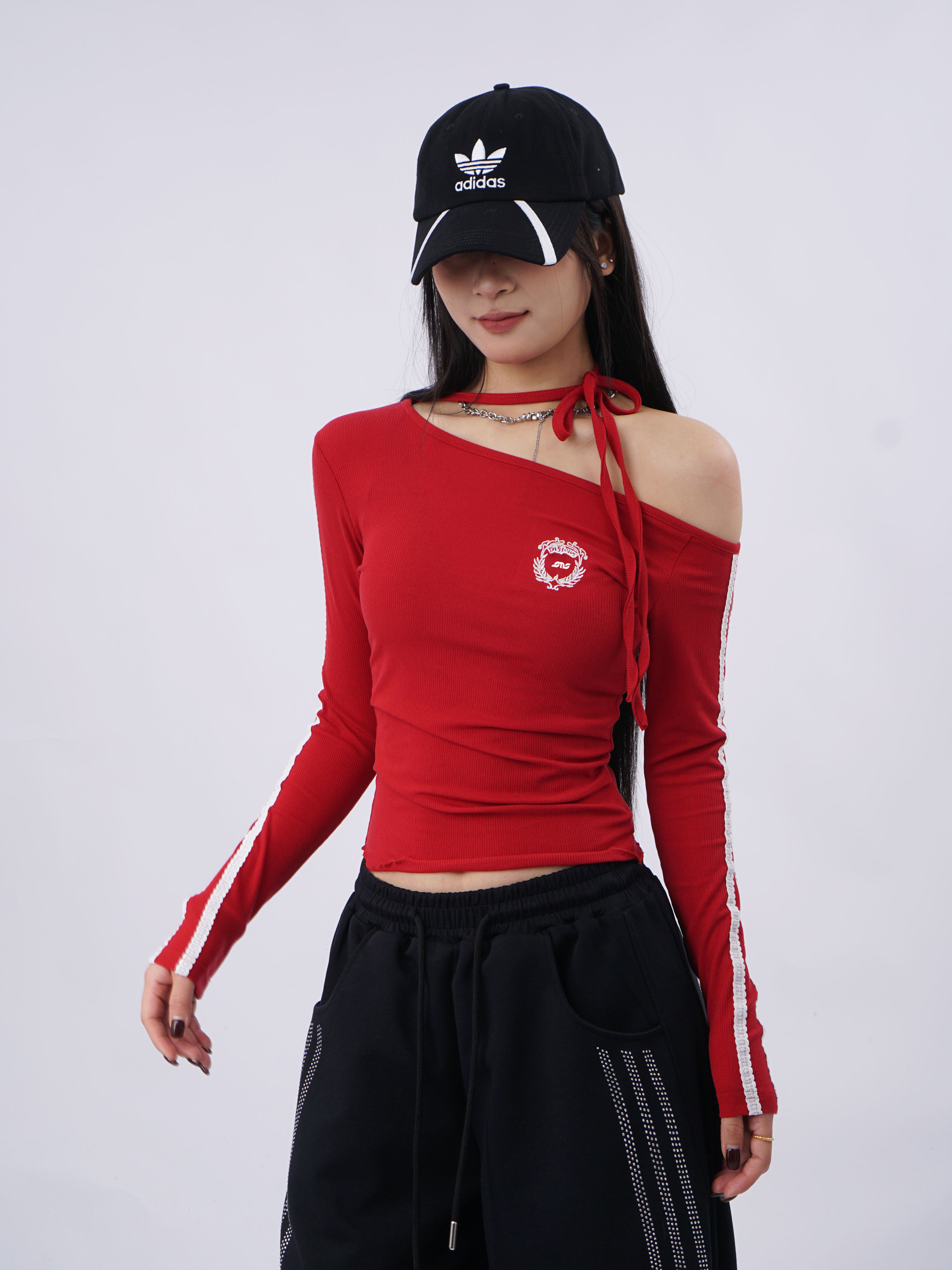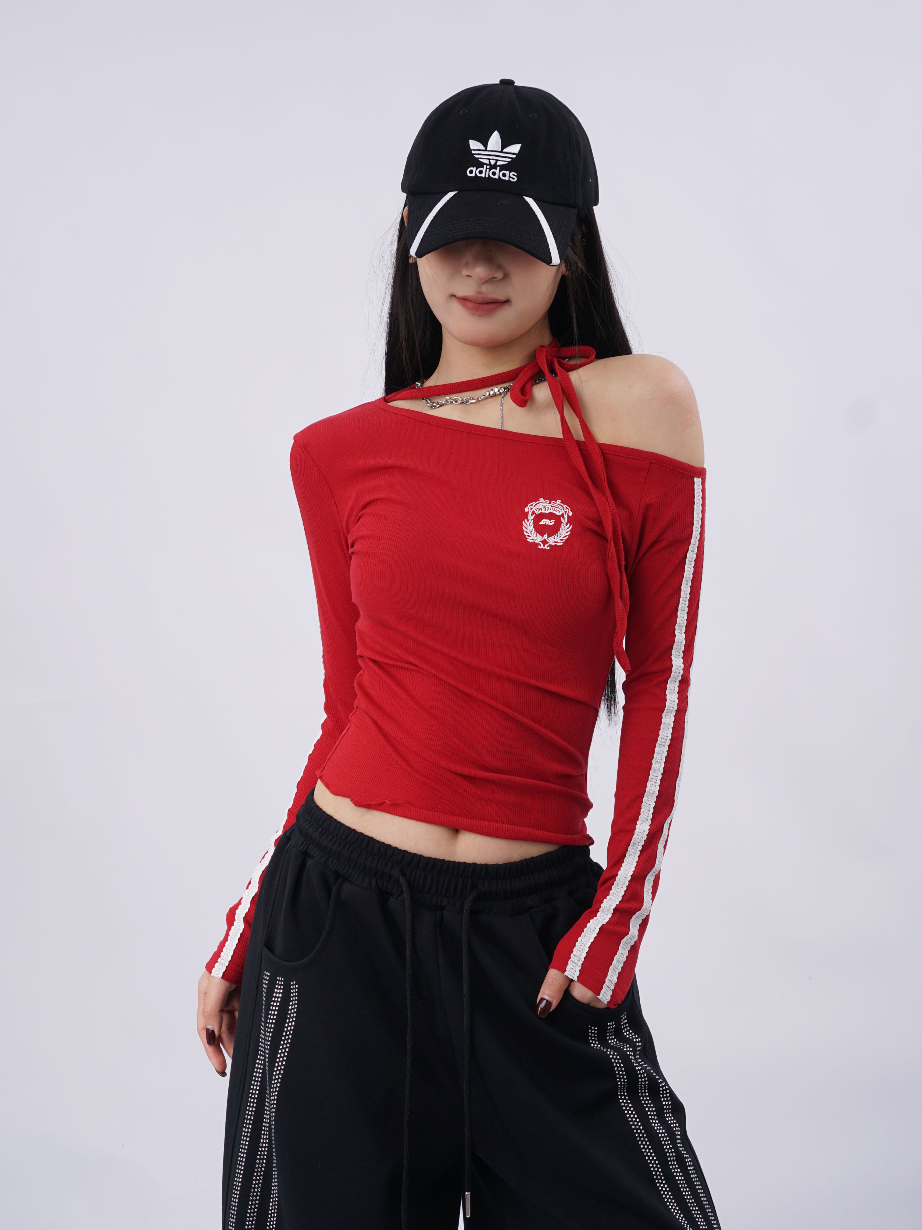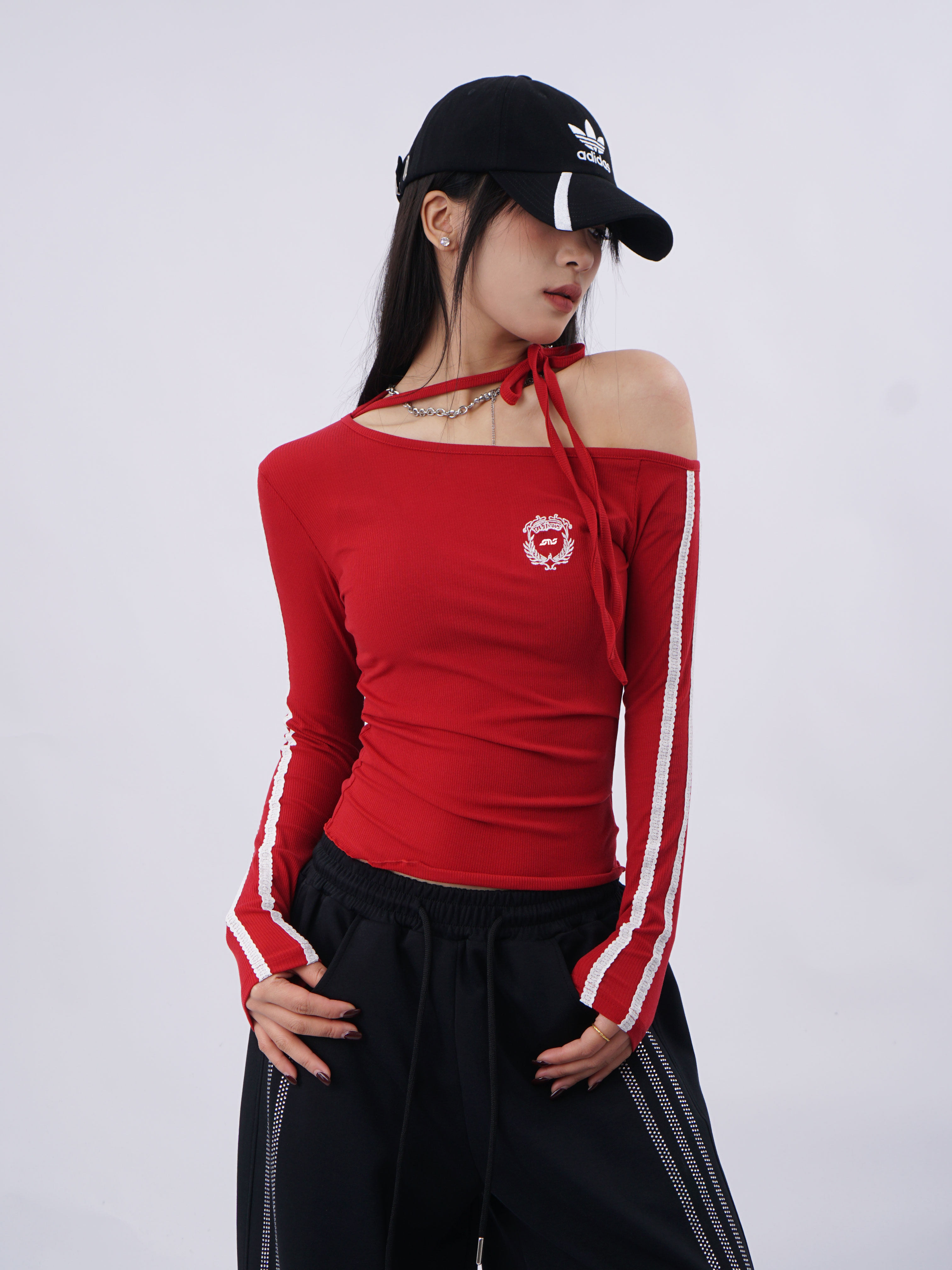SAMUSAN Slanted Shoulder Striped Strap Long Sleeve