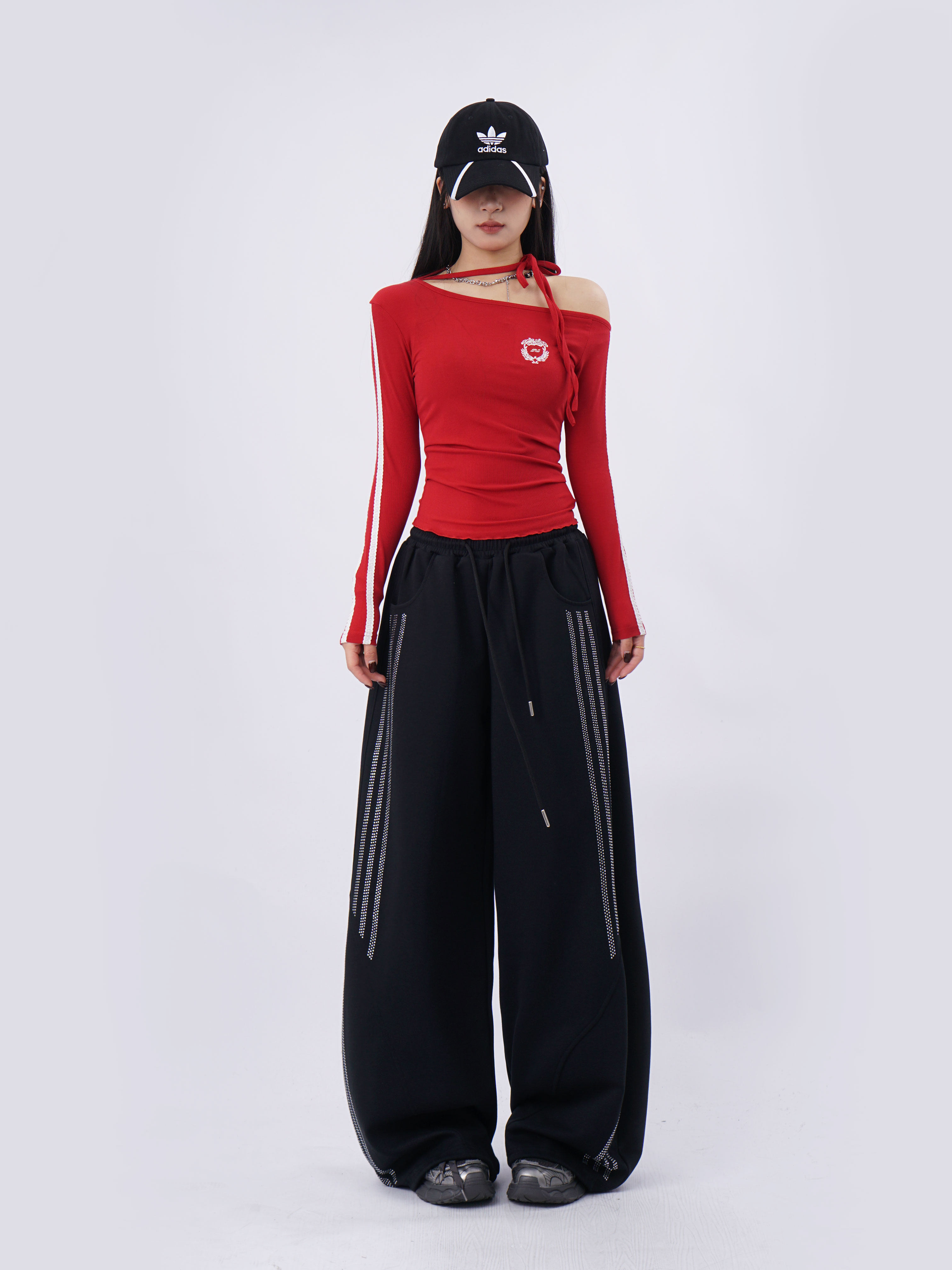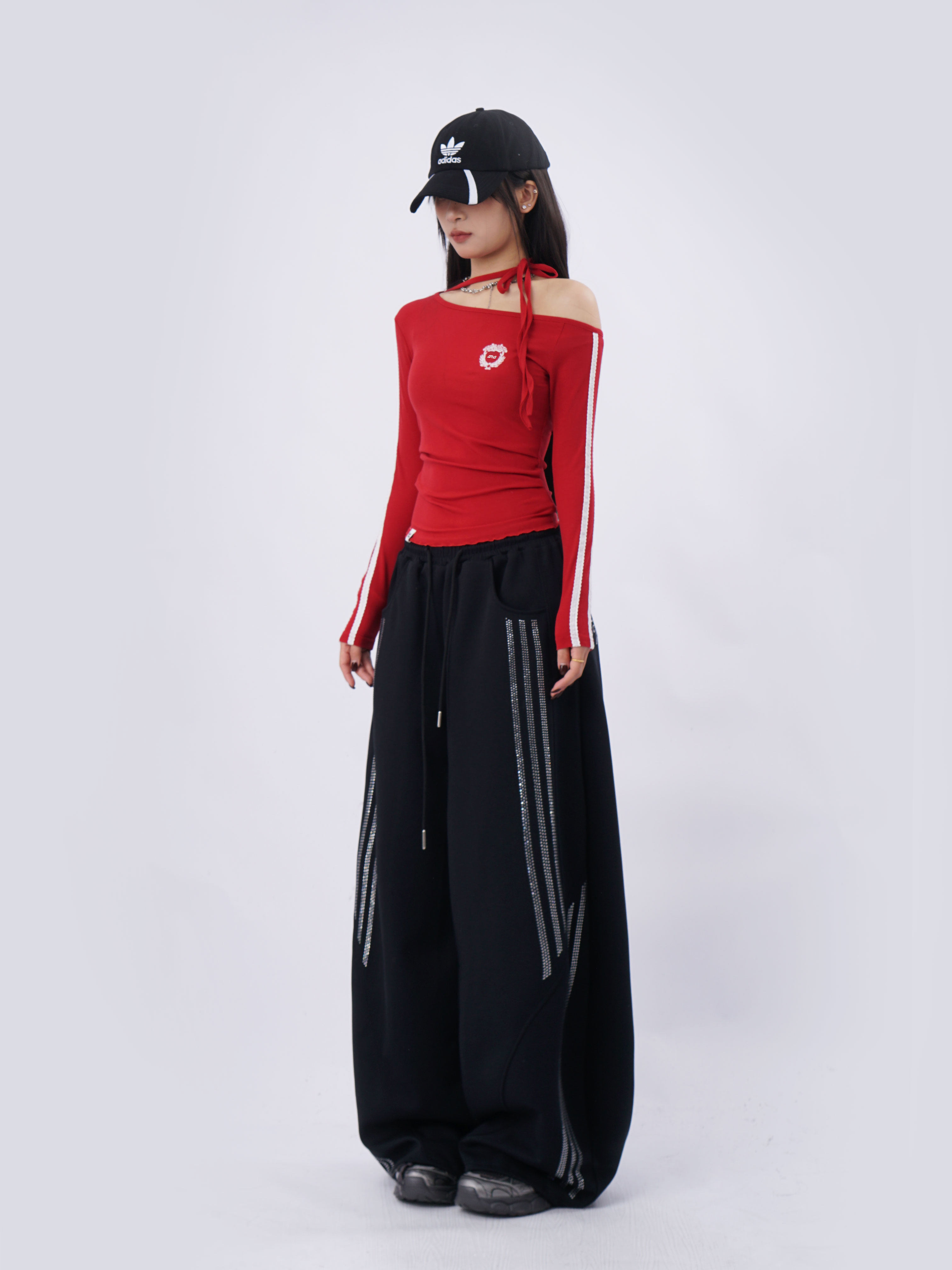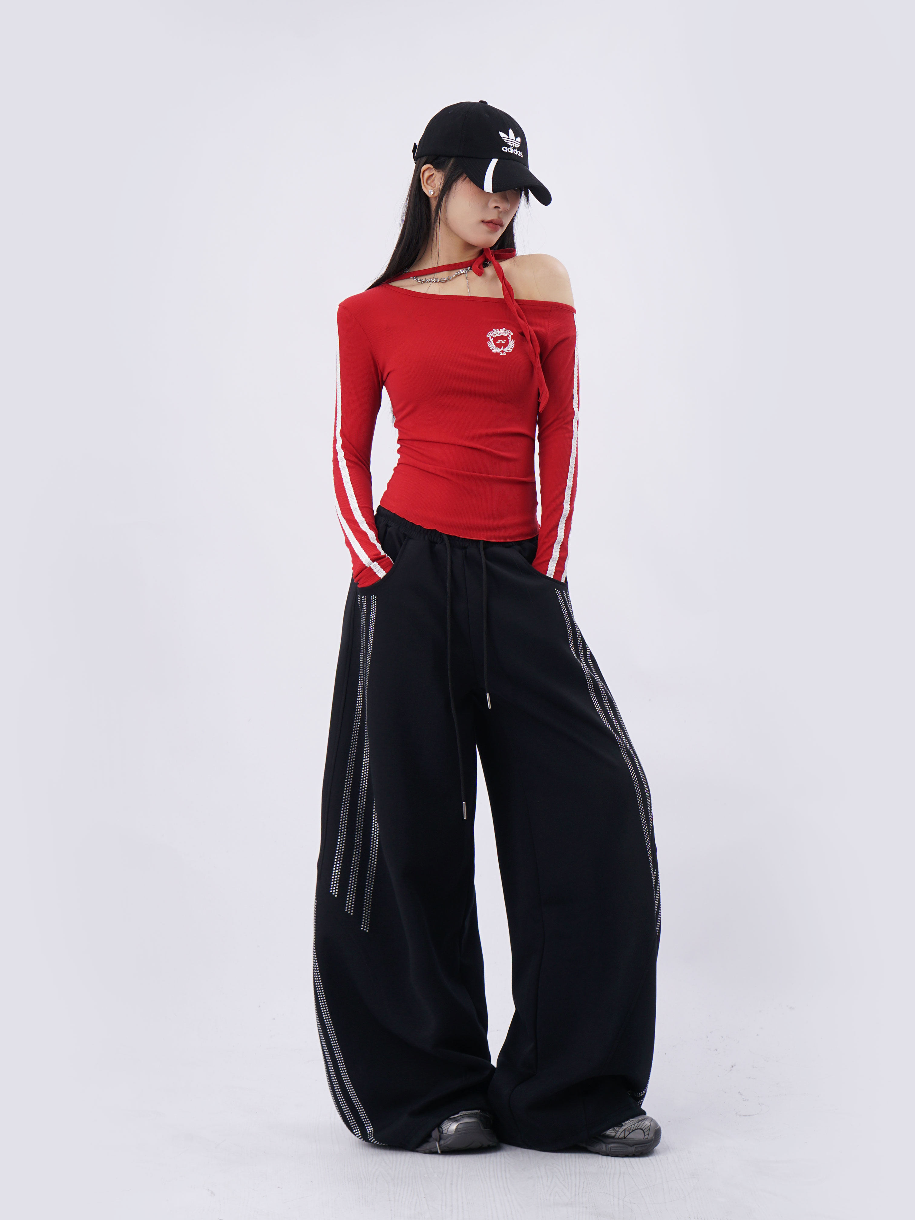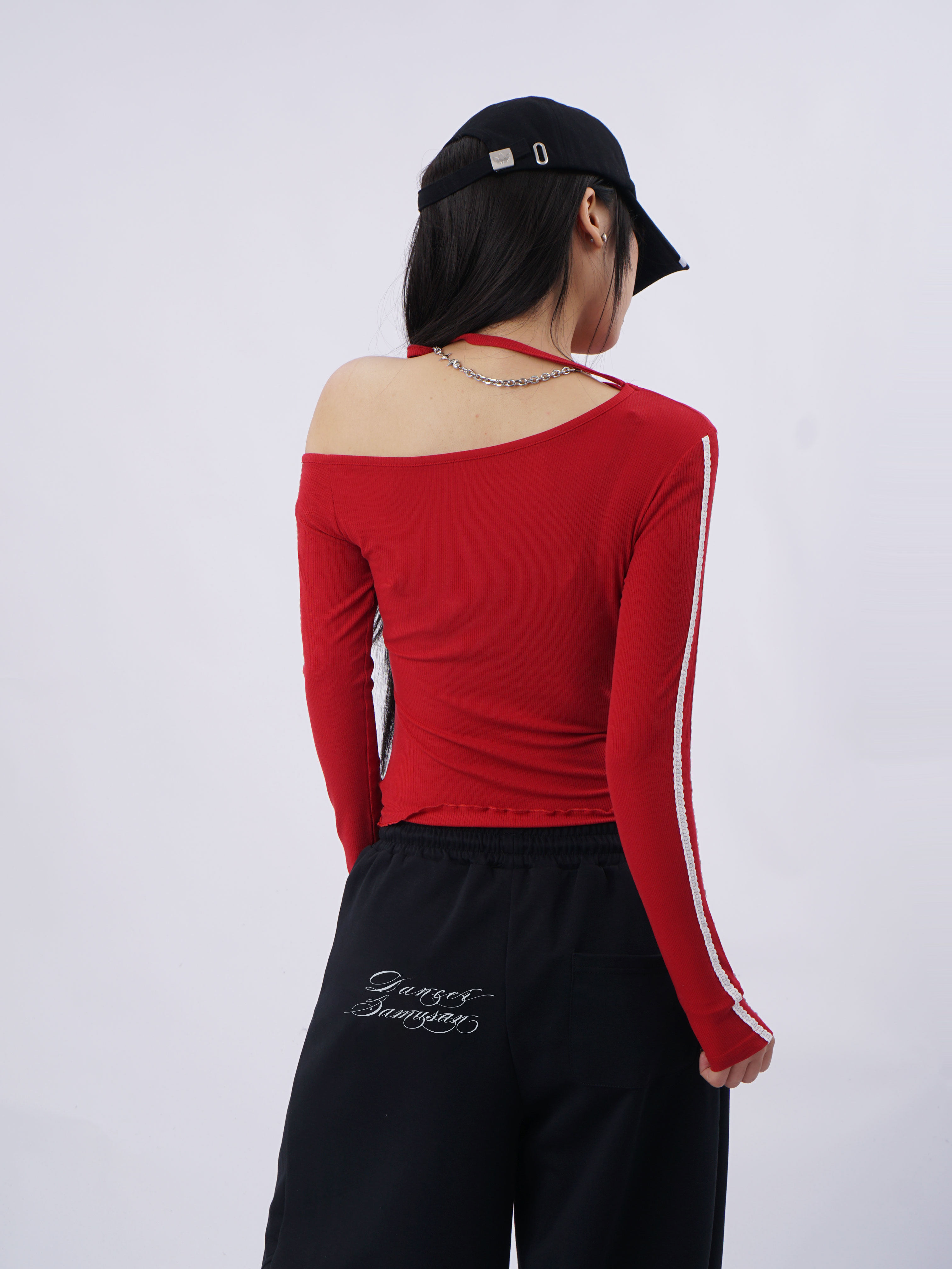 SAMUSAN Slanted Shoulder Striped Strap Long Sleeve
