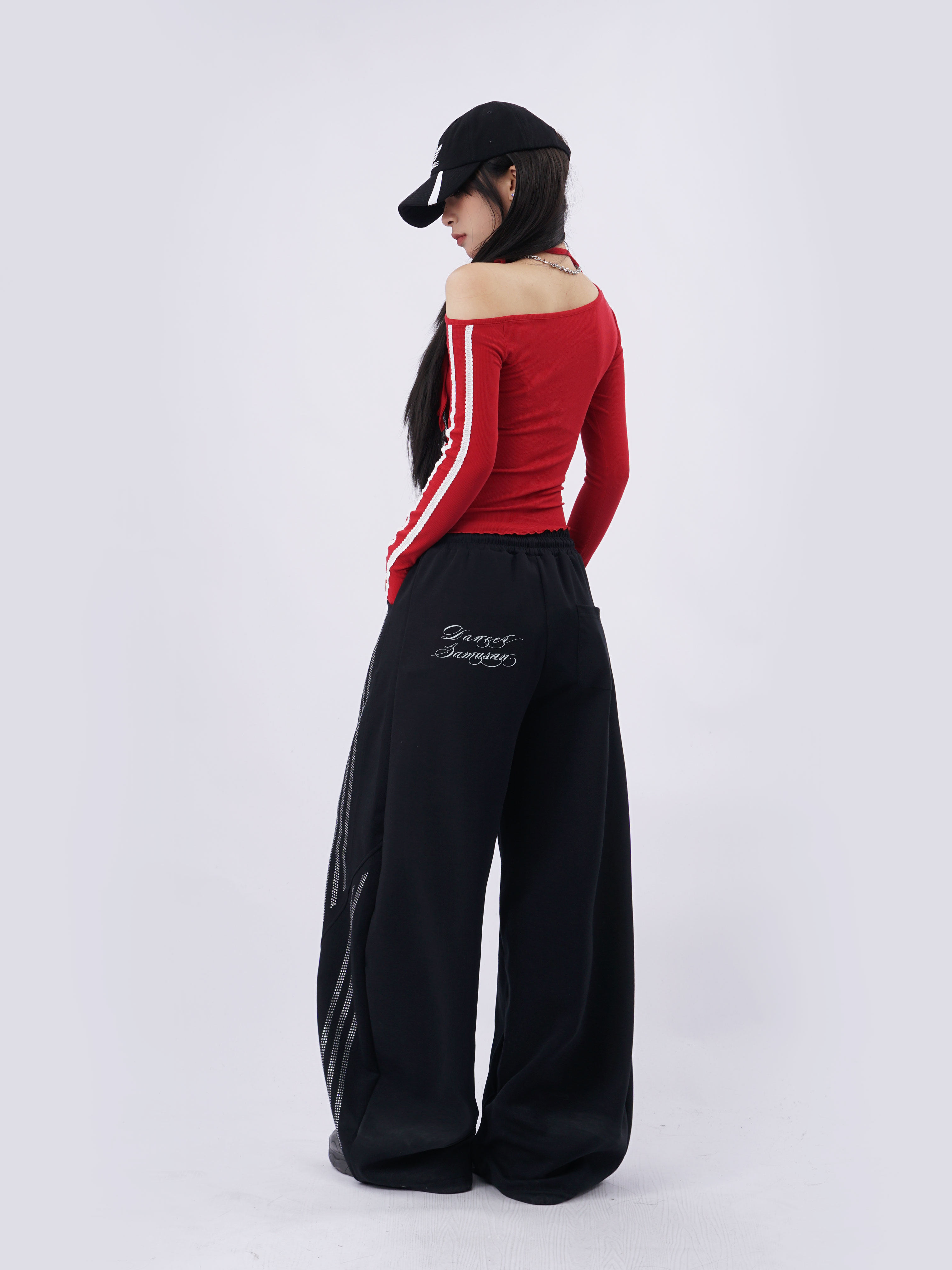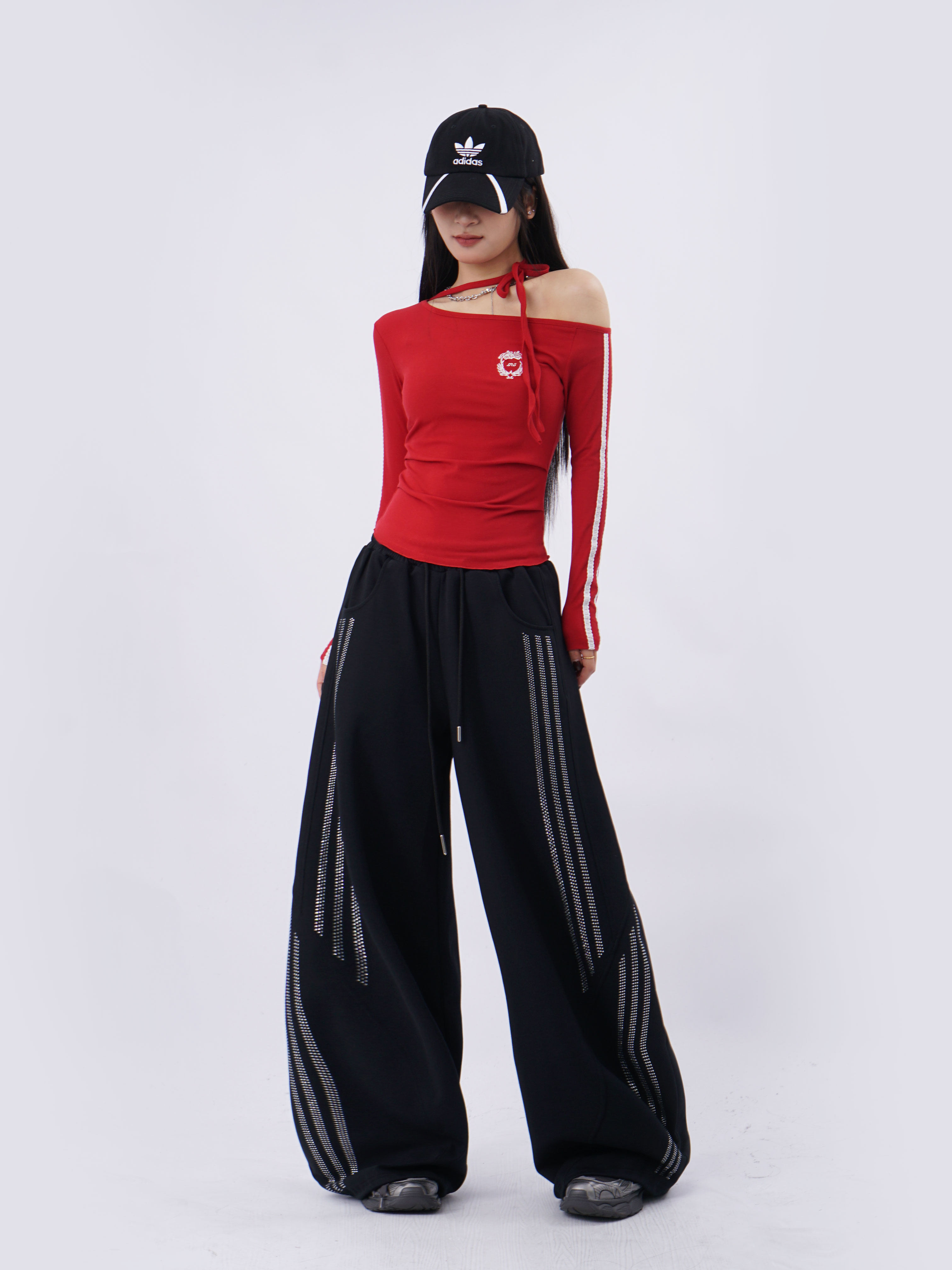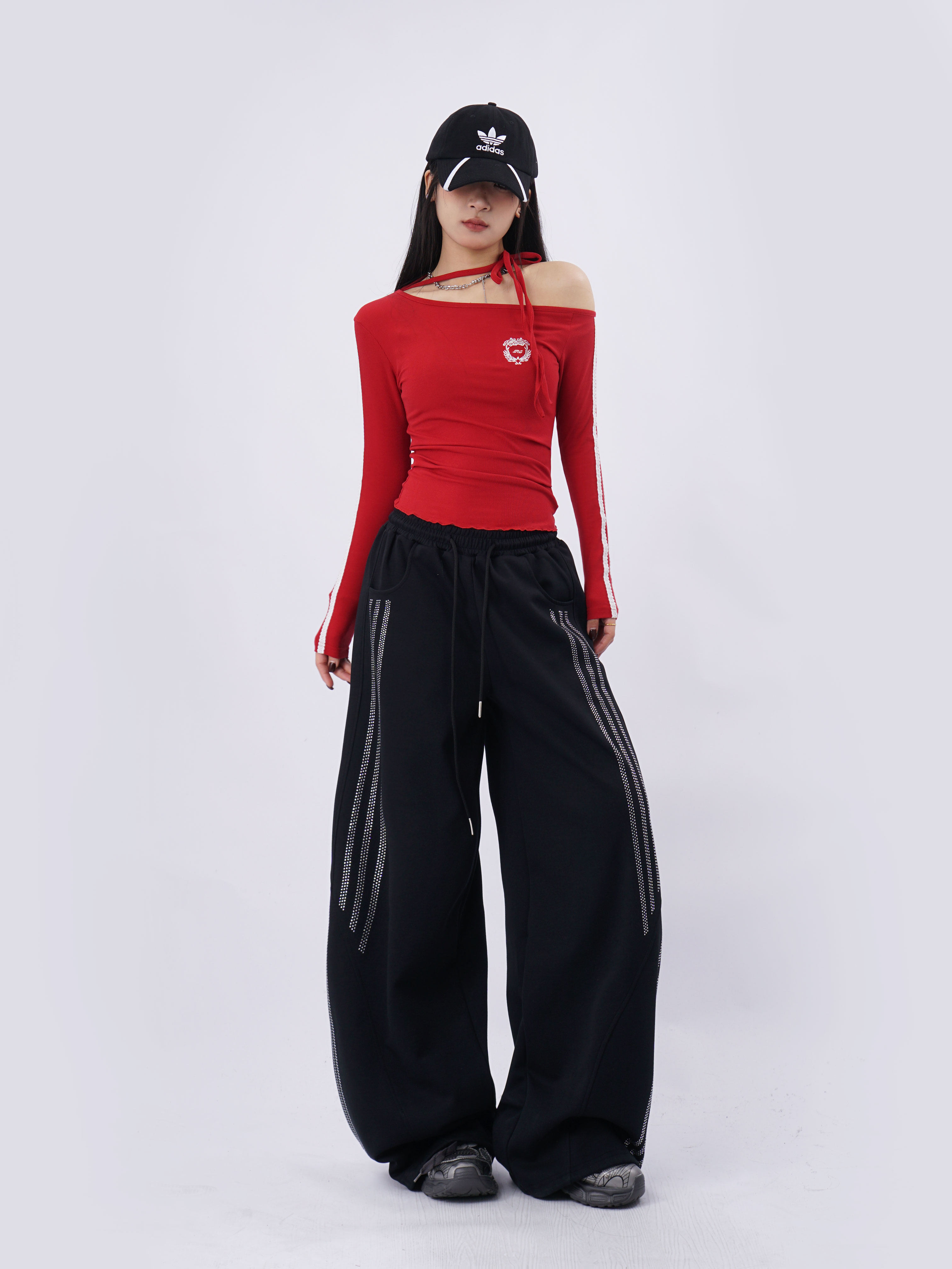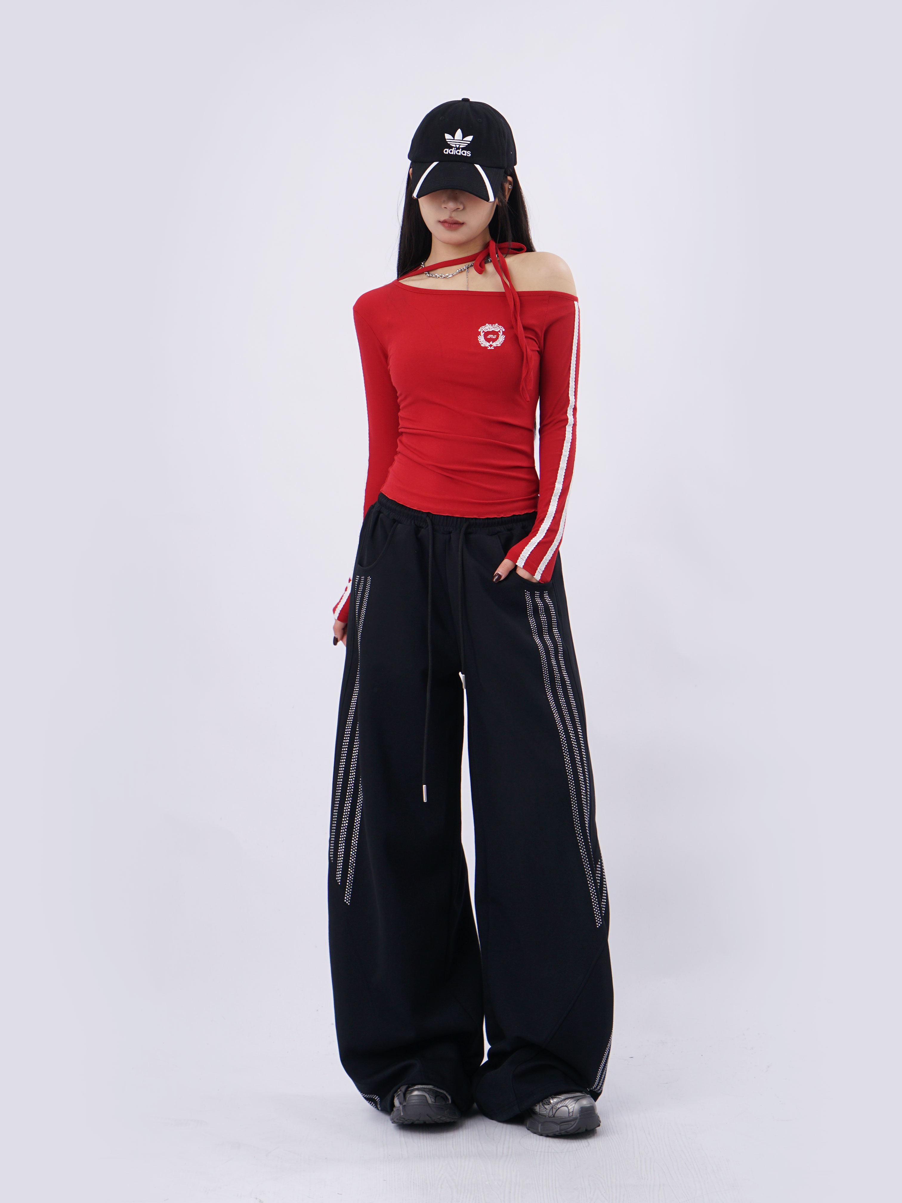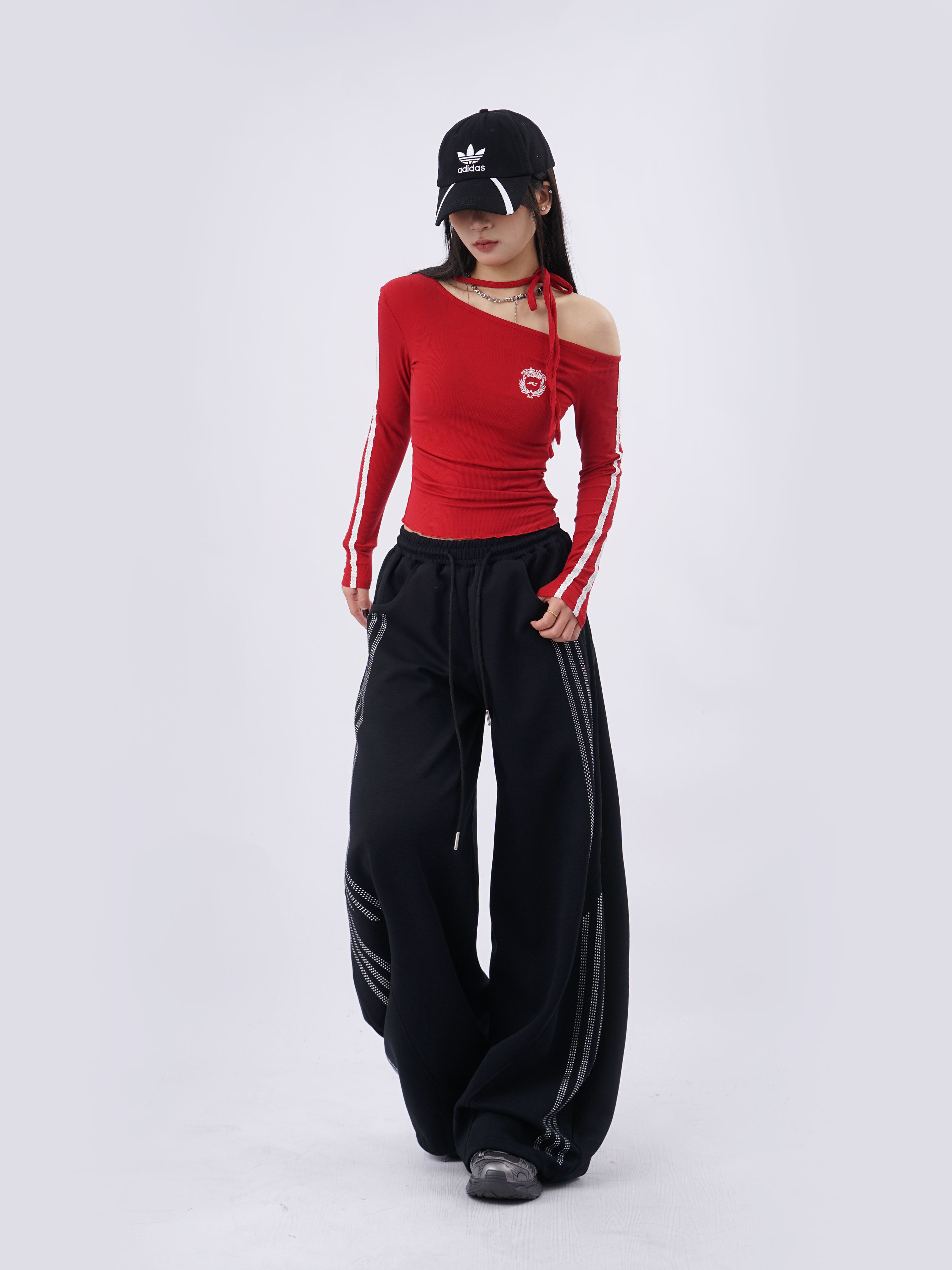 SAMUSAN Slanted Shoulder Striped Strap Long Sleeve
