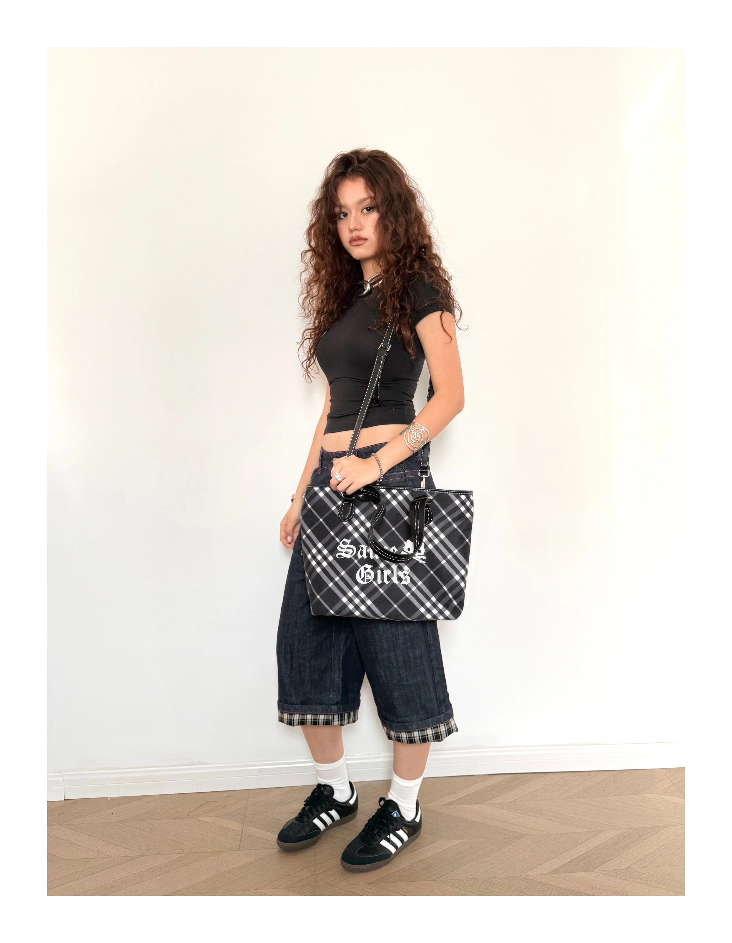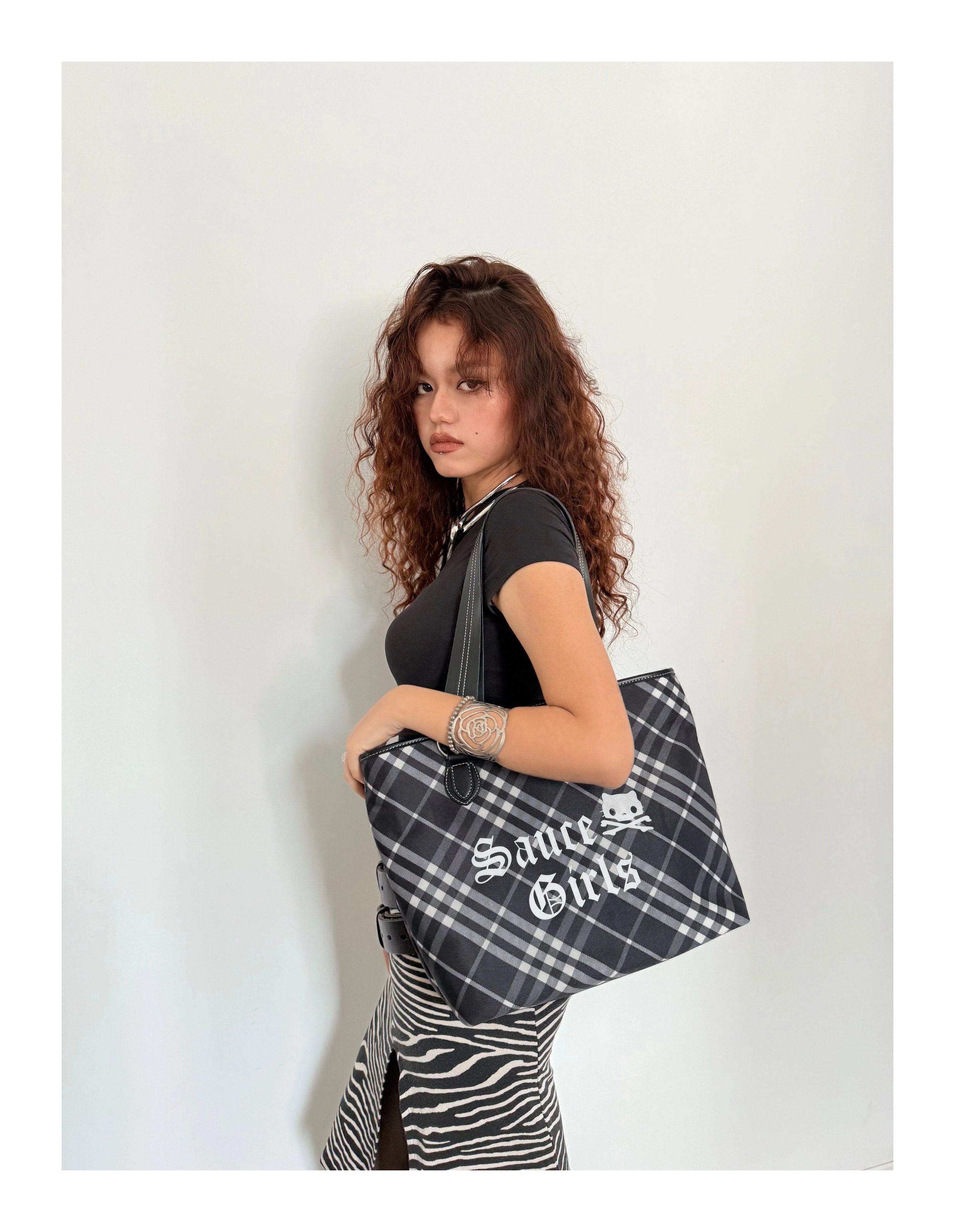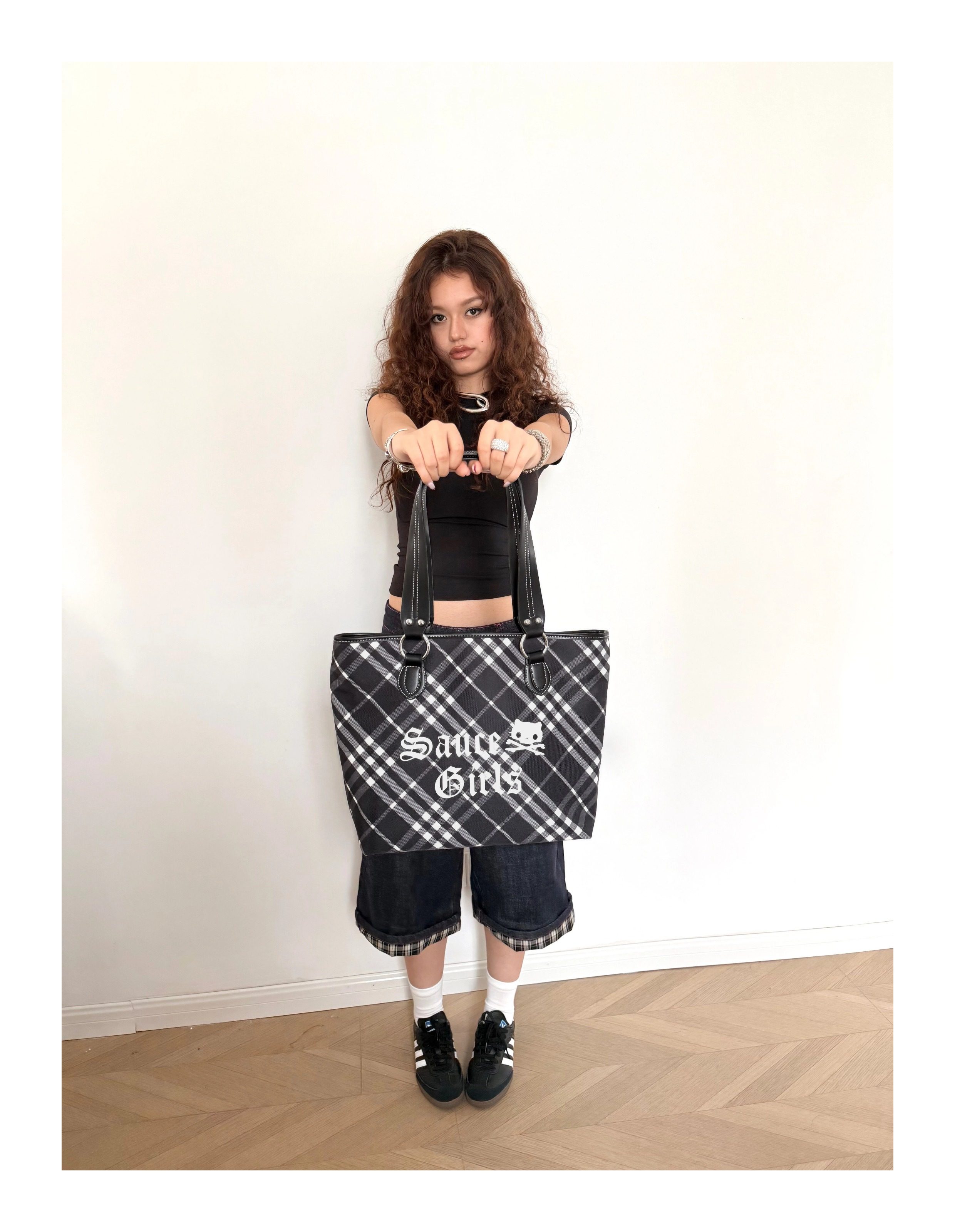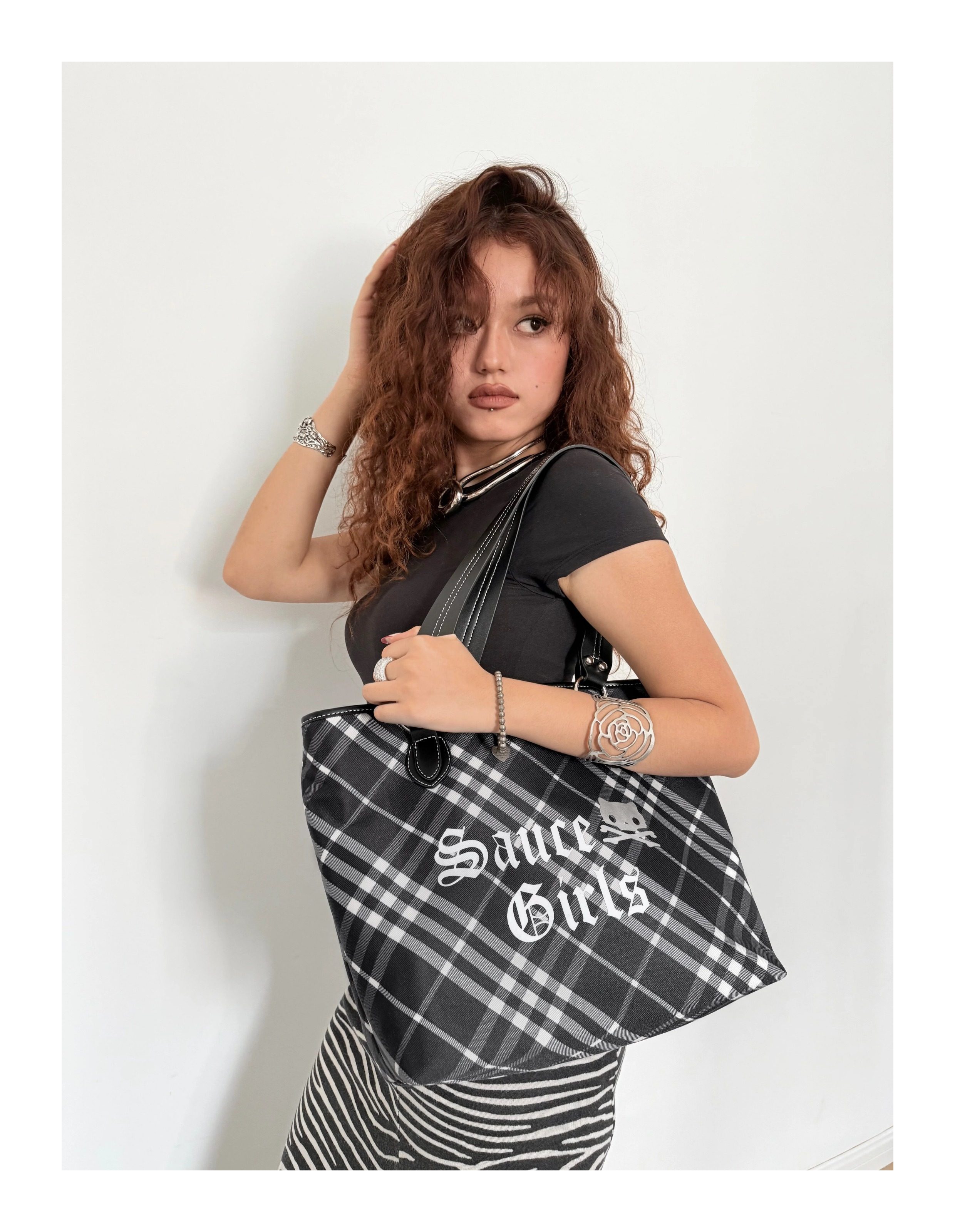 SAUCE Letter-printed Plaid Shoulder Commuter Tote Bag